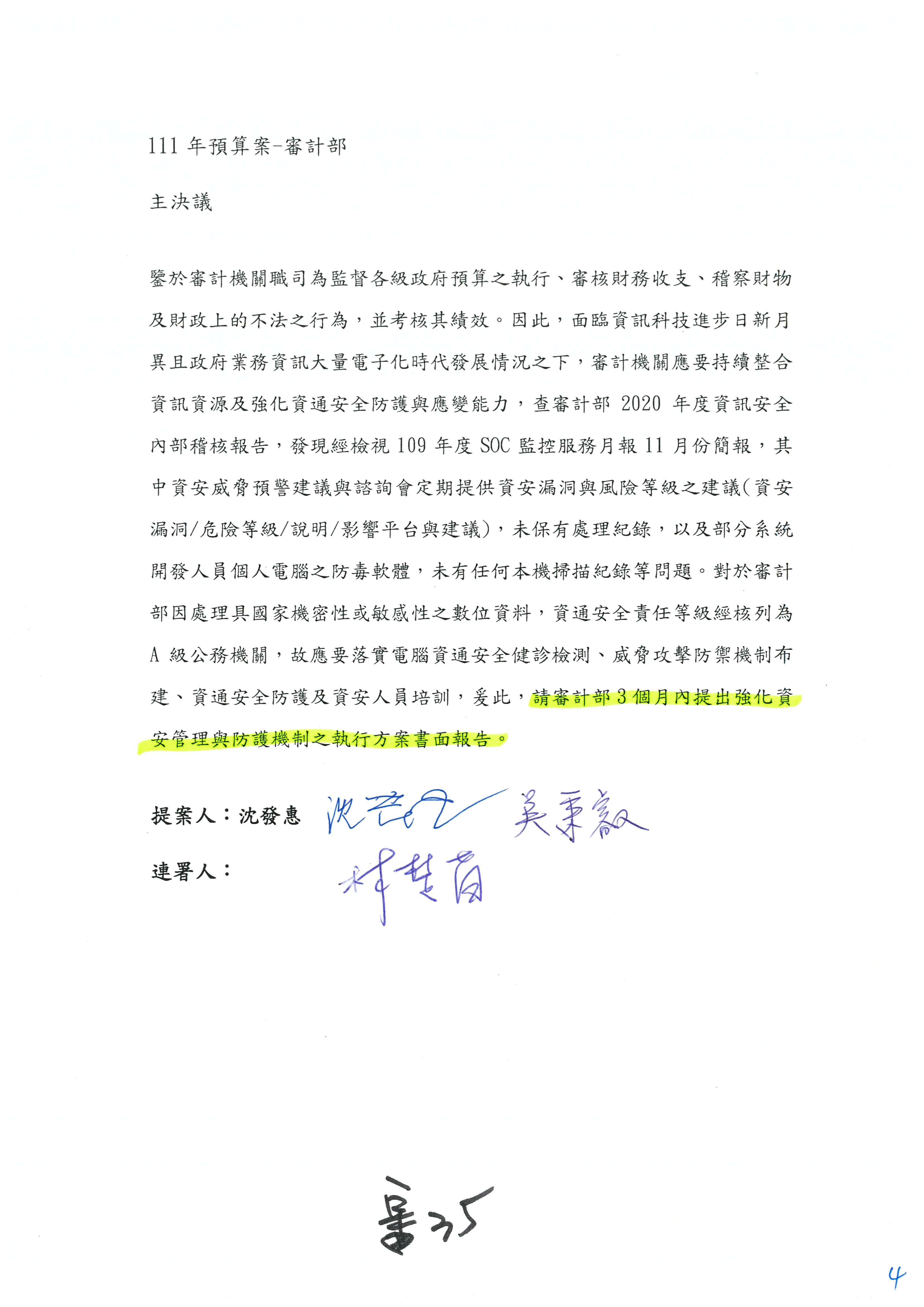主席:好,倒數第三行「請審計部就109年度中央機關採購案件採行……」,最後改成「書面」報告。