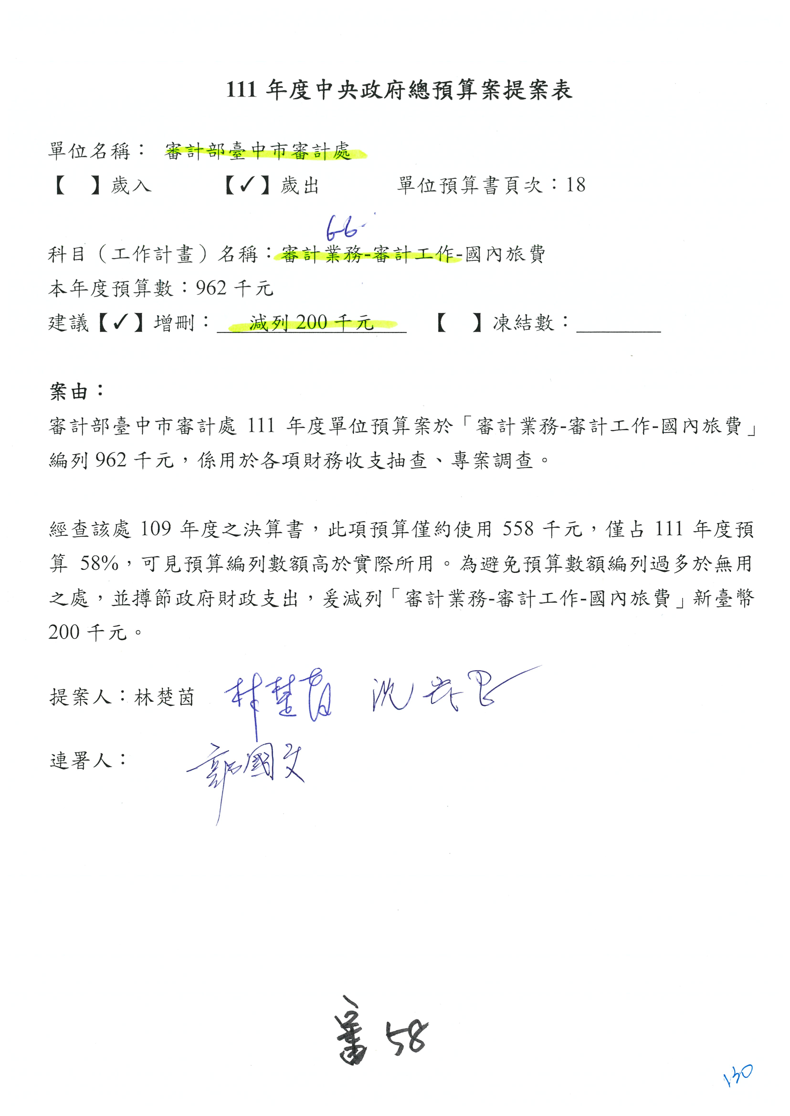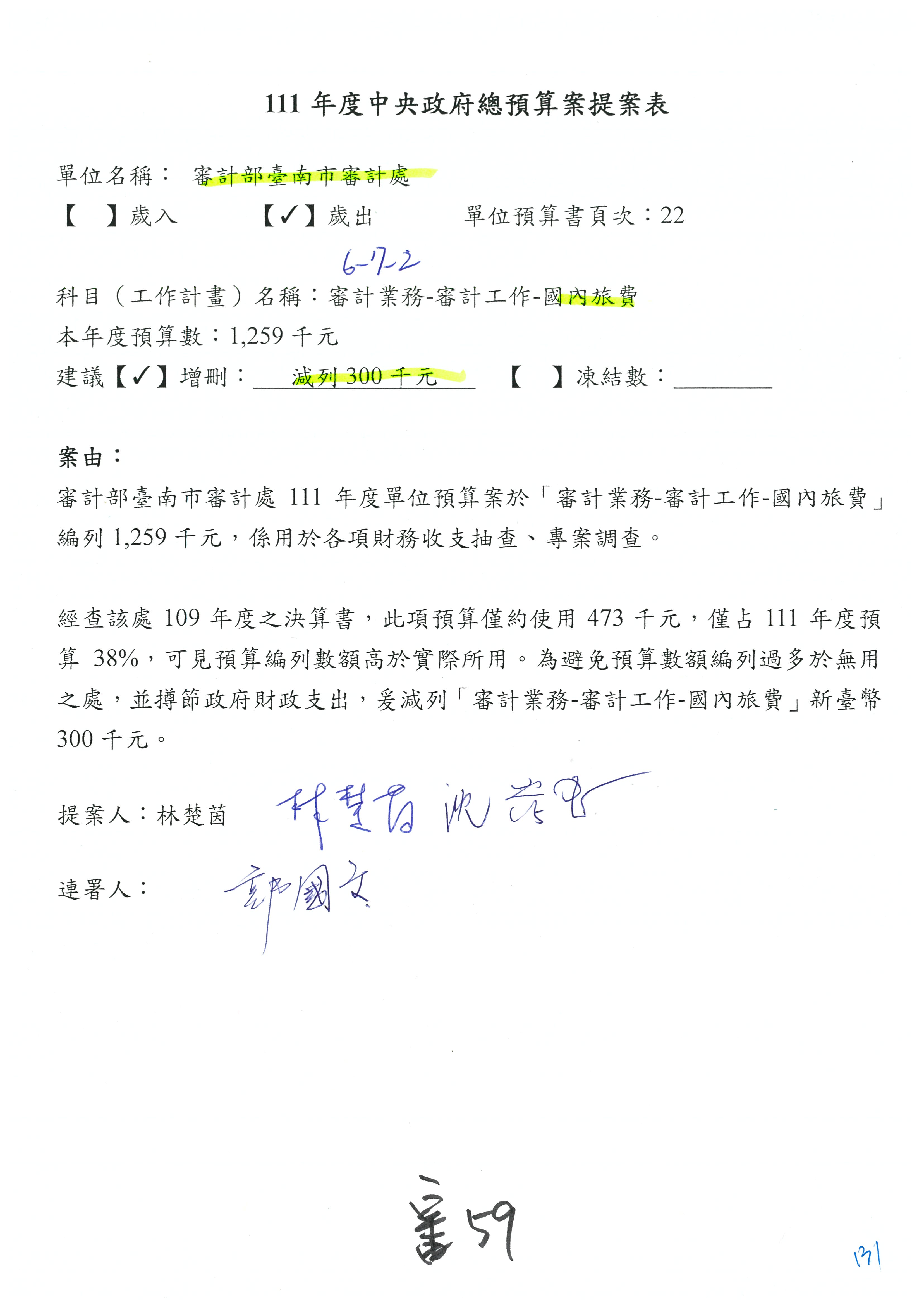 郭委員國文:他的第55案、第56案、第58案、第59案其實都是國內旅費的部分,是針對不同縣市的審計處所提出的,主要是因為執行率都偏低,不應該照列跟去年一樣的預算。