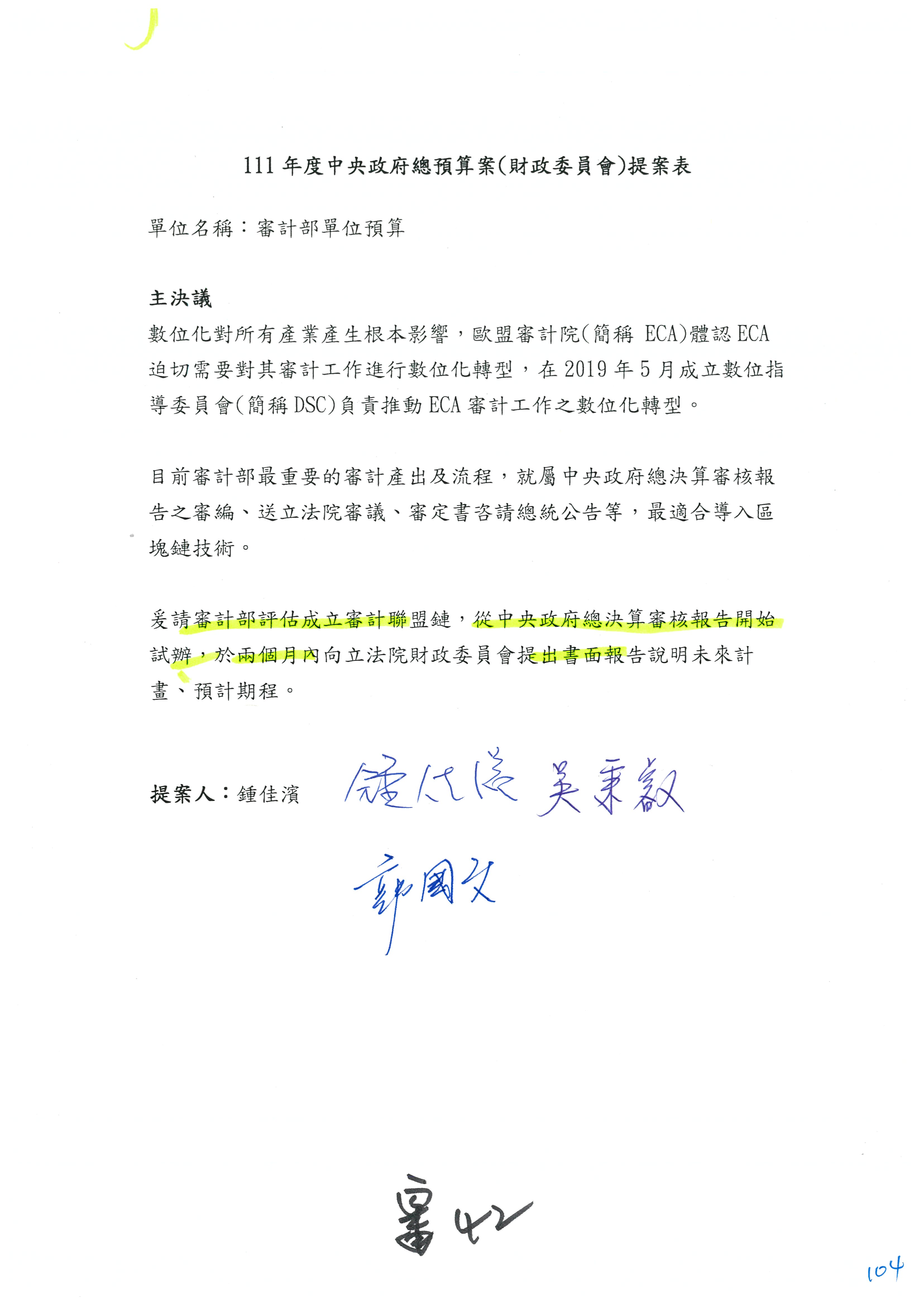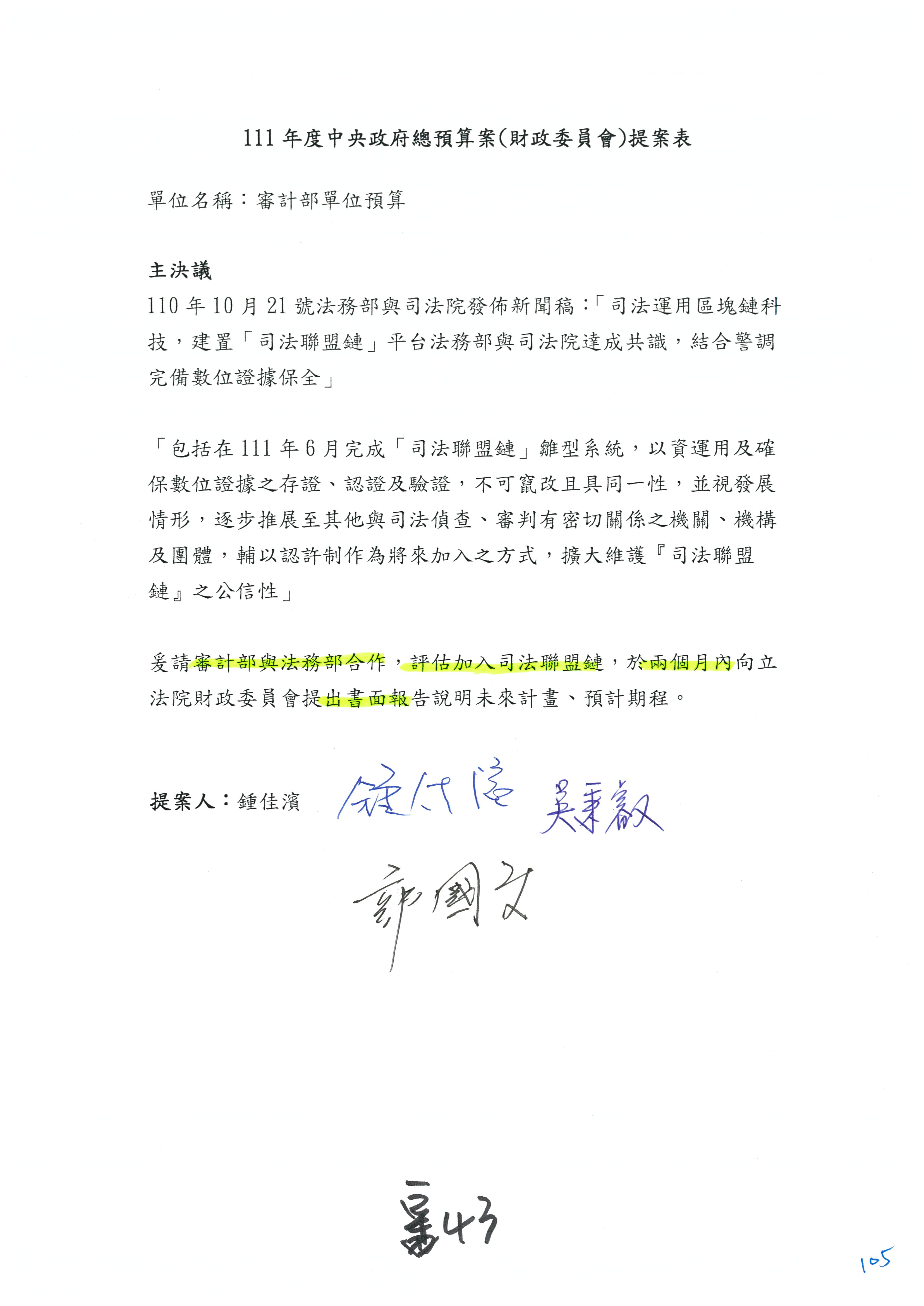 主席:「爰請審計部瞭解司法聯盟鏈推動情形」?