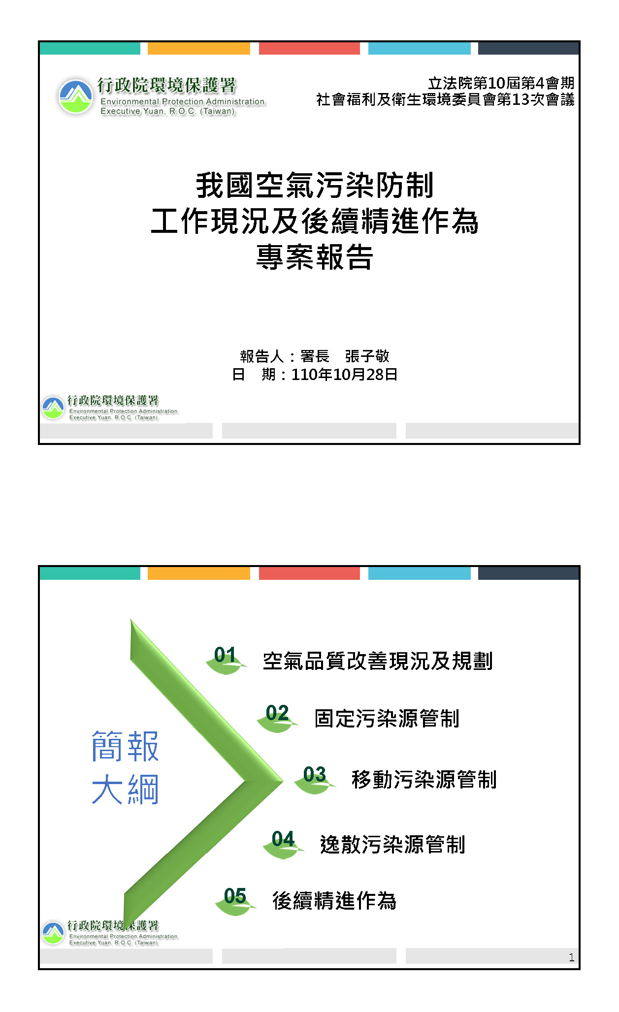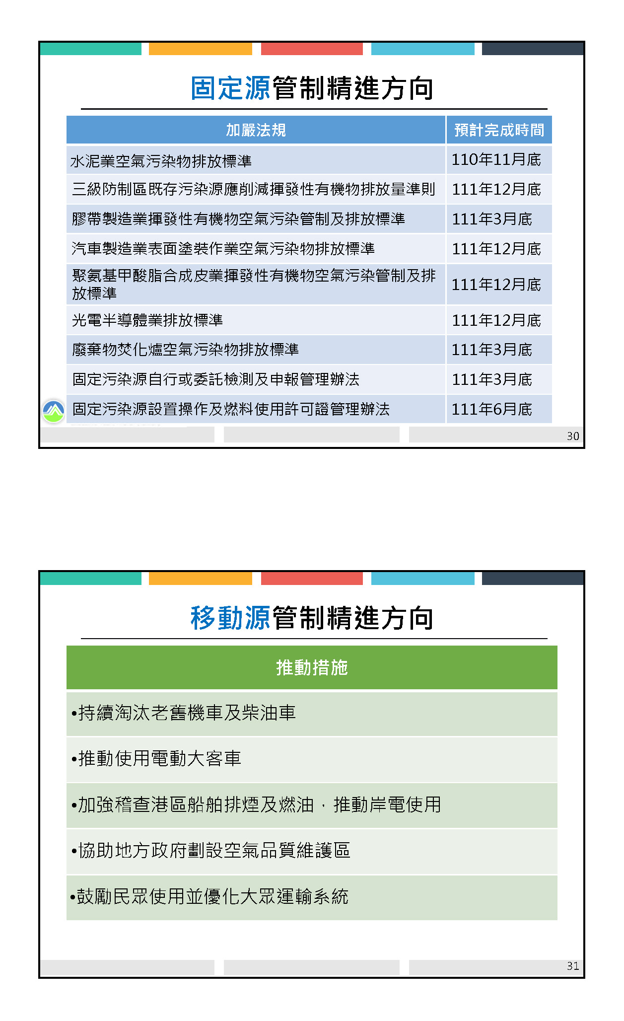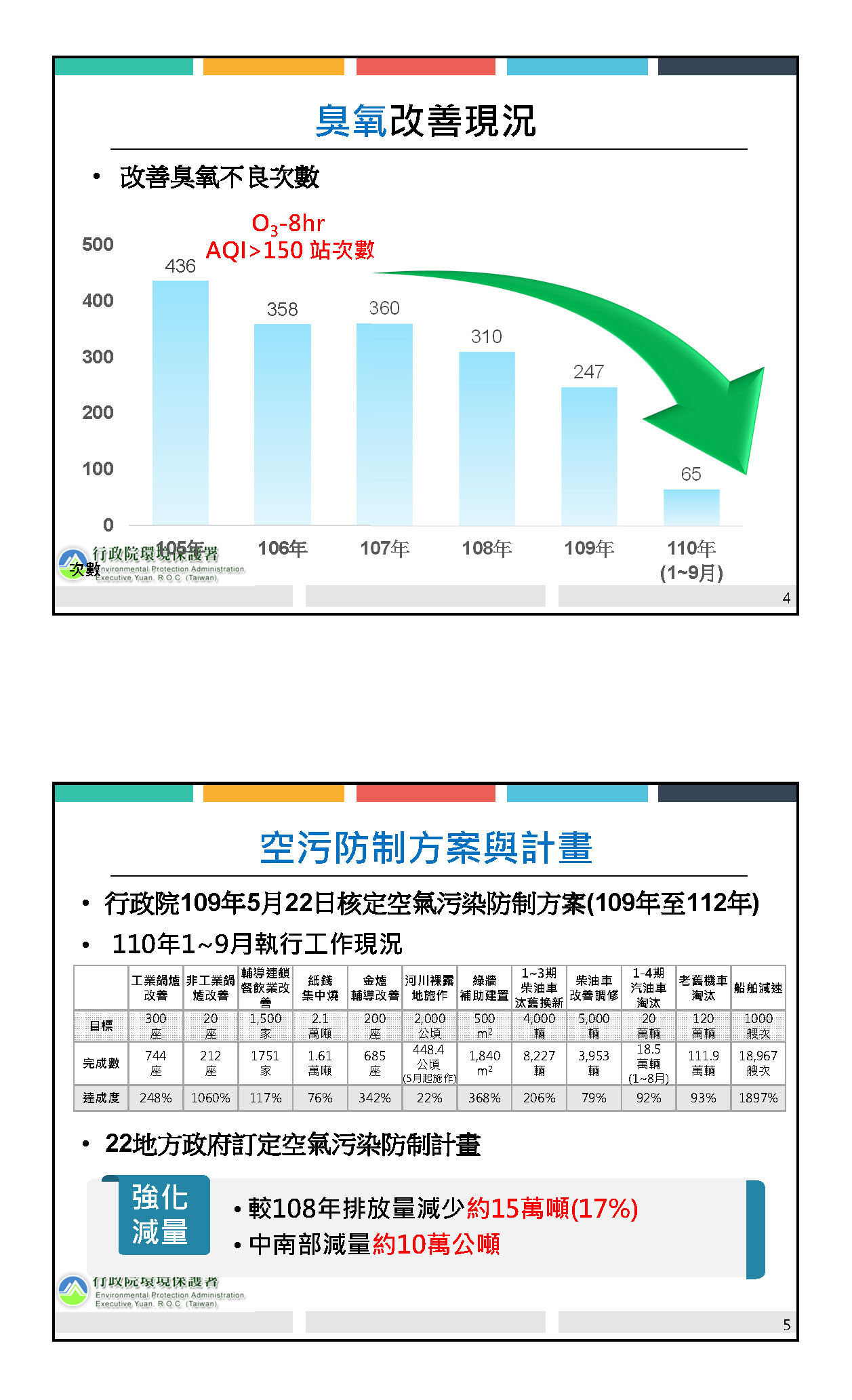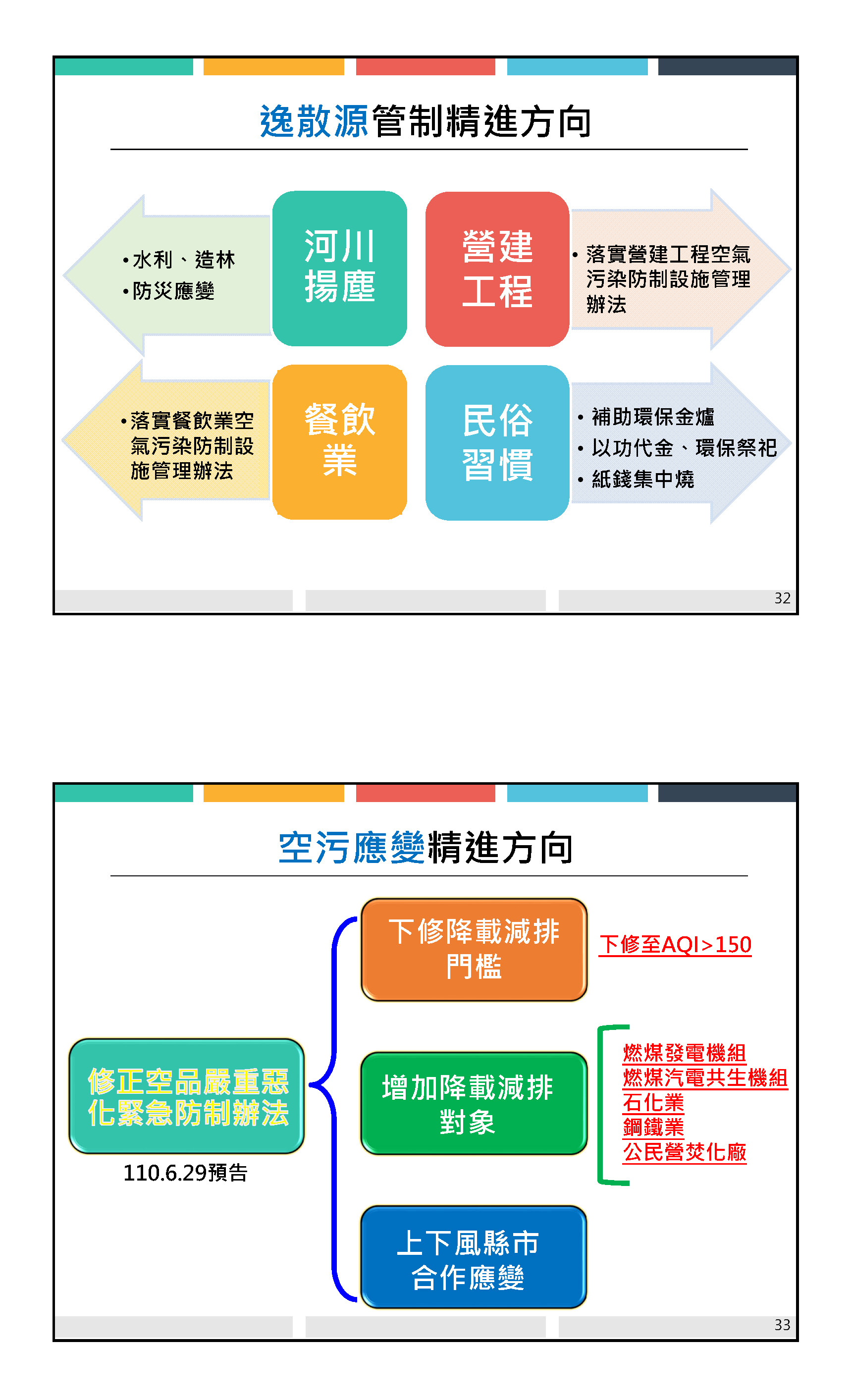 張署長子敬:另外有關空氣品質的部分,就是針對PM2.5的標準,就像我講健骨強身跟陣痛解熱兩個是不一樣的,所以我們的作法不同,前面應變的部分,我們確實像委員所提的有分區域,所以我們北中南有三個應變的平臺,在空污季的時候,我們會定期開會,開會會預期下個禮拜空氣品質變化是怎麼樣,大家討論應該怎麼做。那現在我們已經整合區域,就是預期某個縣市……