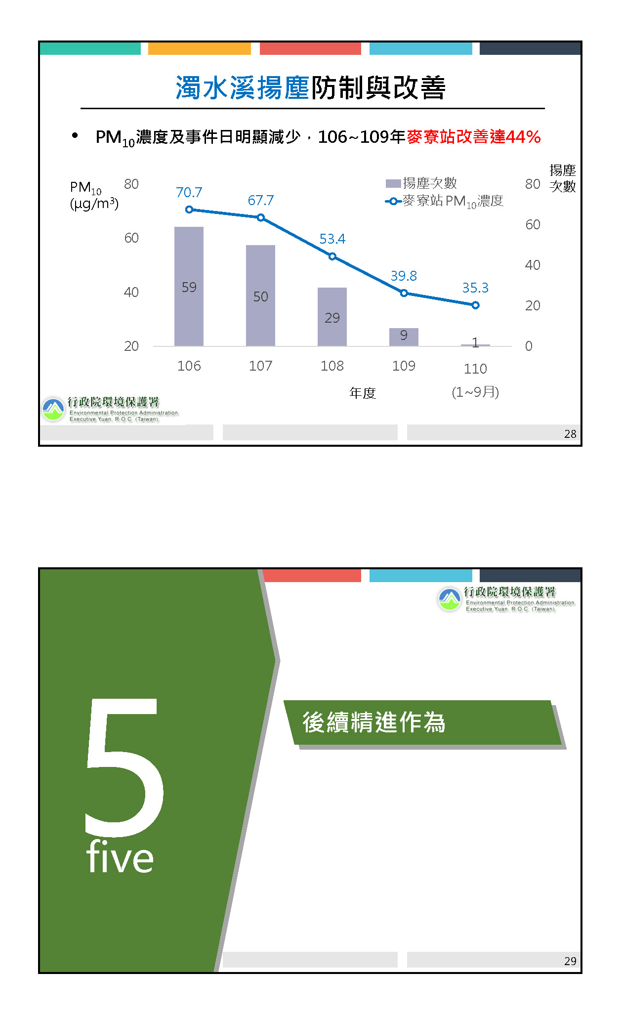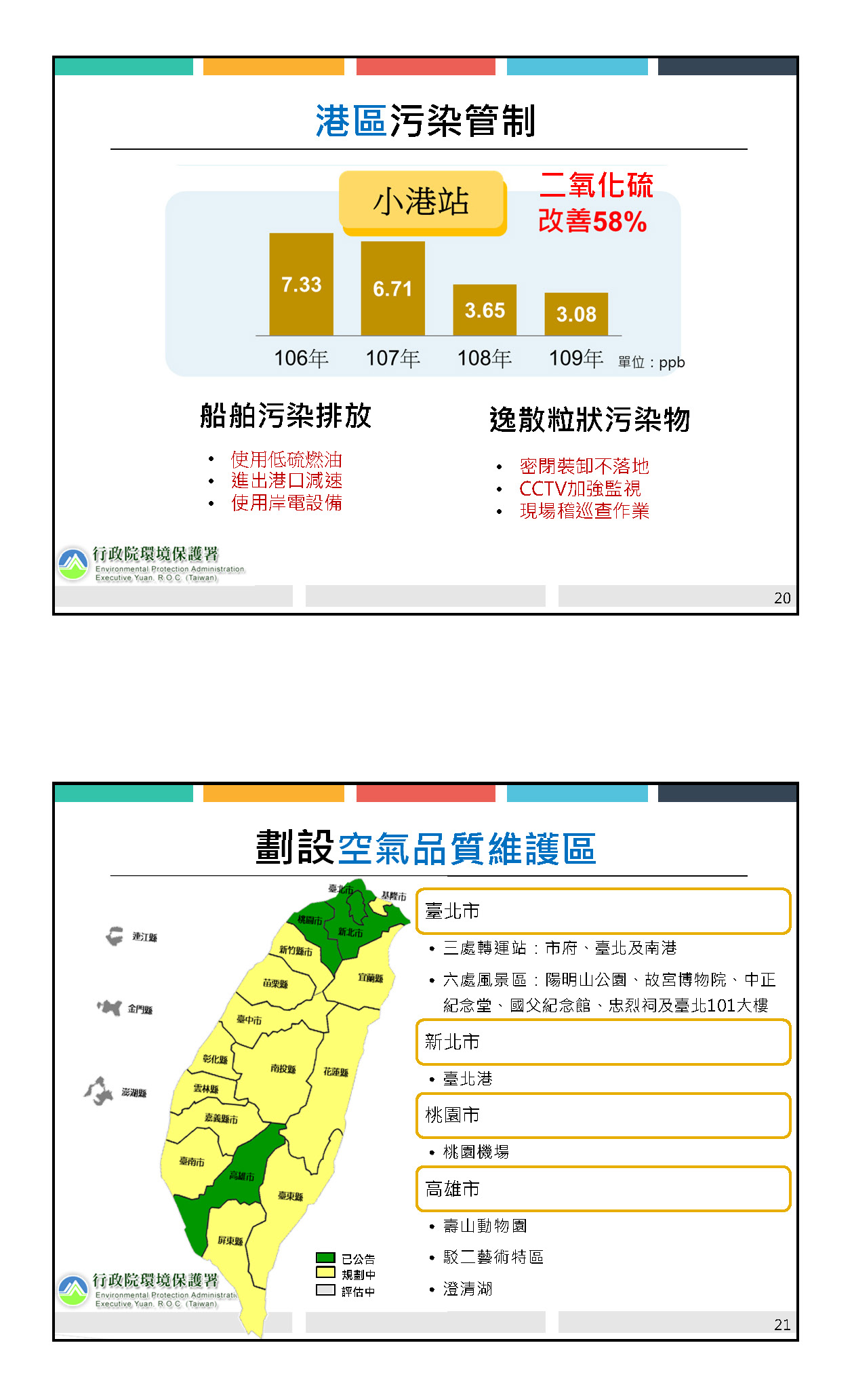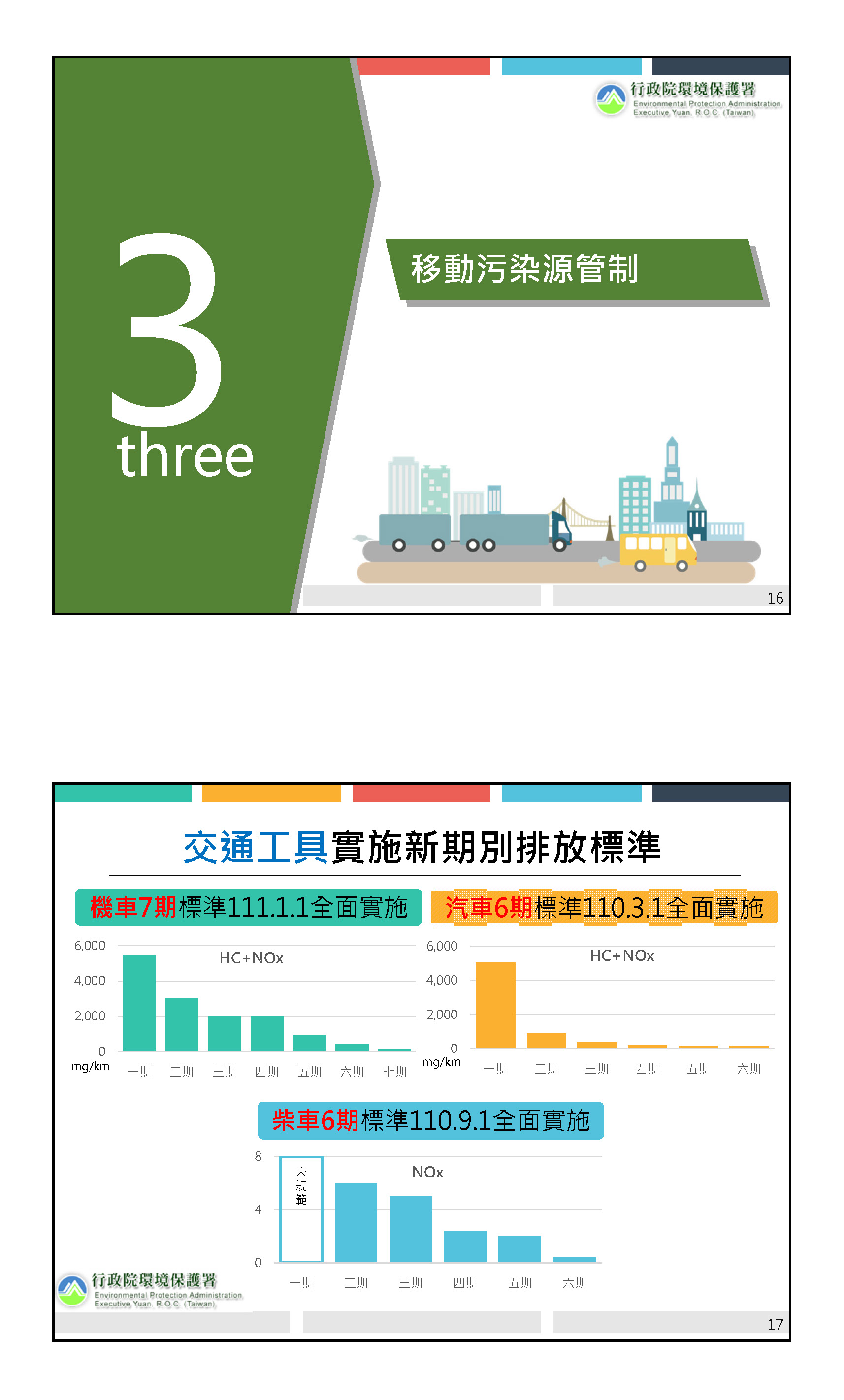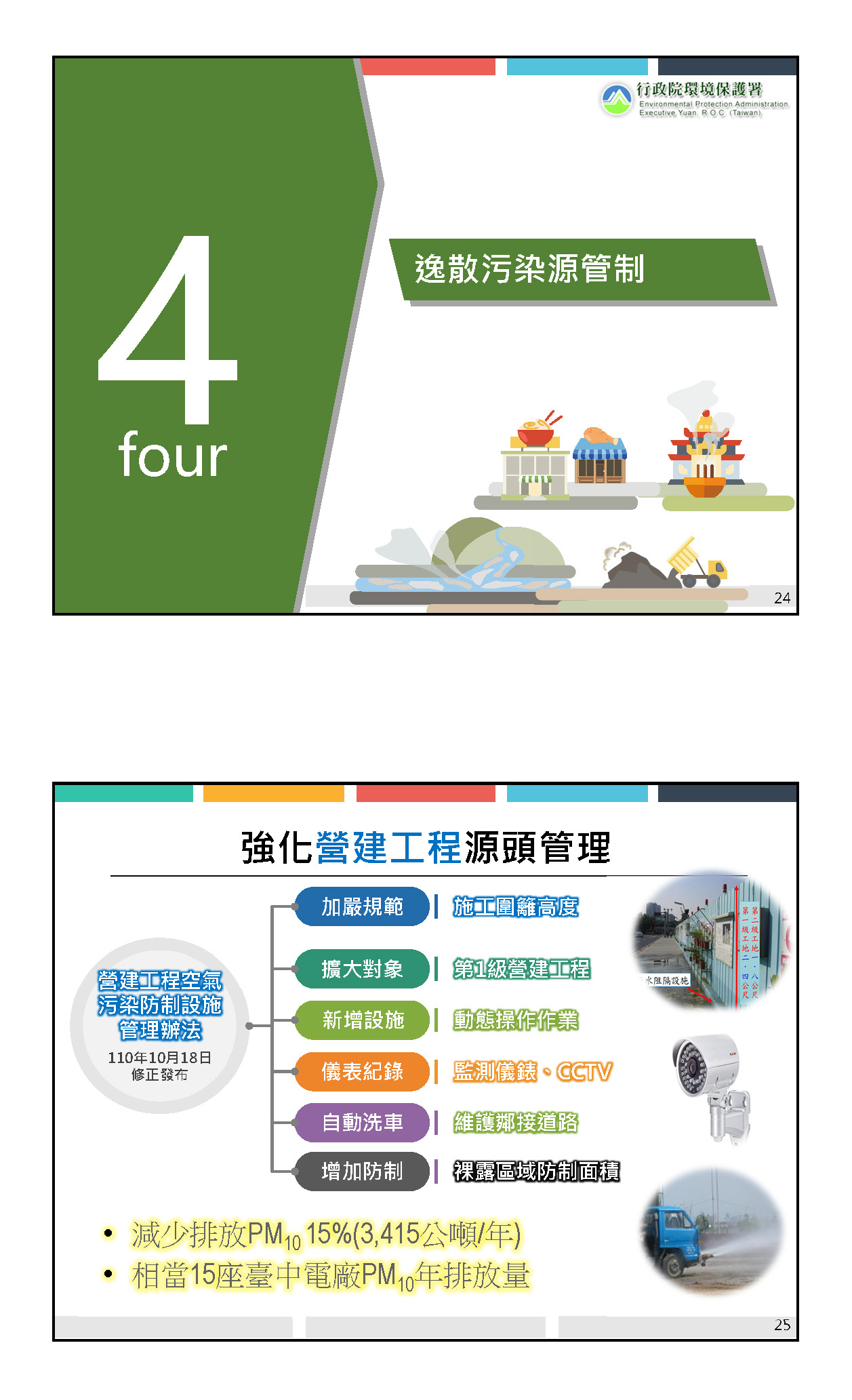張署長子敬:另外有關空氣品質的部分,就是針對PM2.5的標準,就像我講健骨強身跟陣痛解熱兩個是不一樣的,所以我們的作法不同,前面應變的部分,我們確實像委員所提的有分區域,所以我們北中南有三個應變的平臺,在空污季的時候,我們會定期開會,開會會預期下個禮拜空氣品質變化是怎麼樣,大家討論應該怎麼做。那現在我們已經整合區域,就是預期某個縣市……