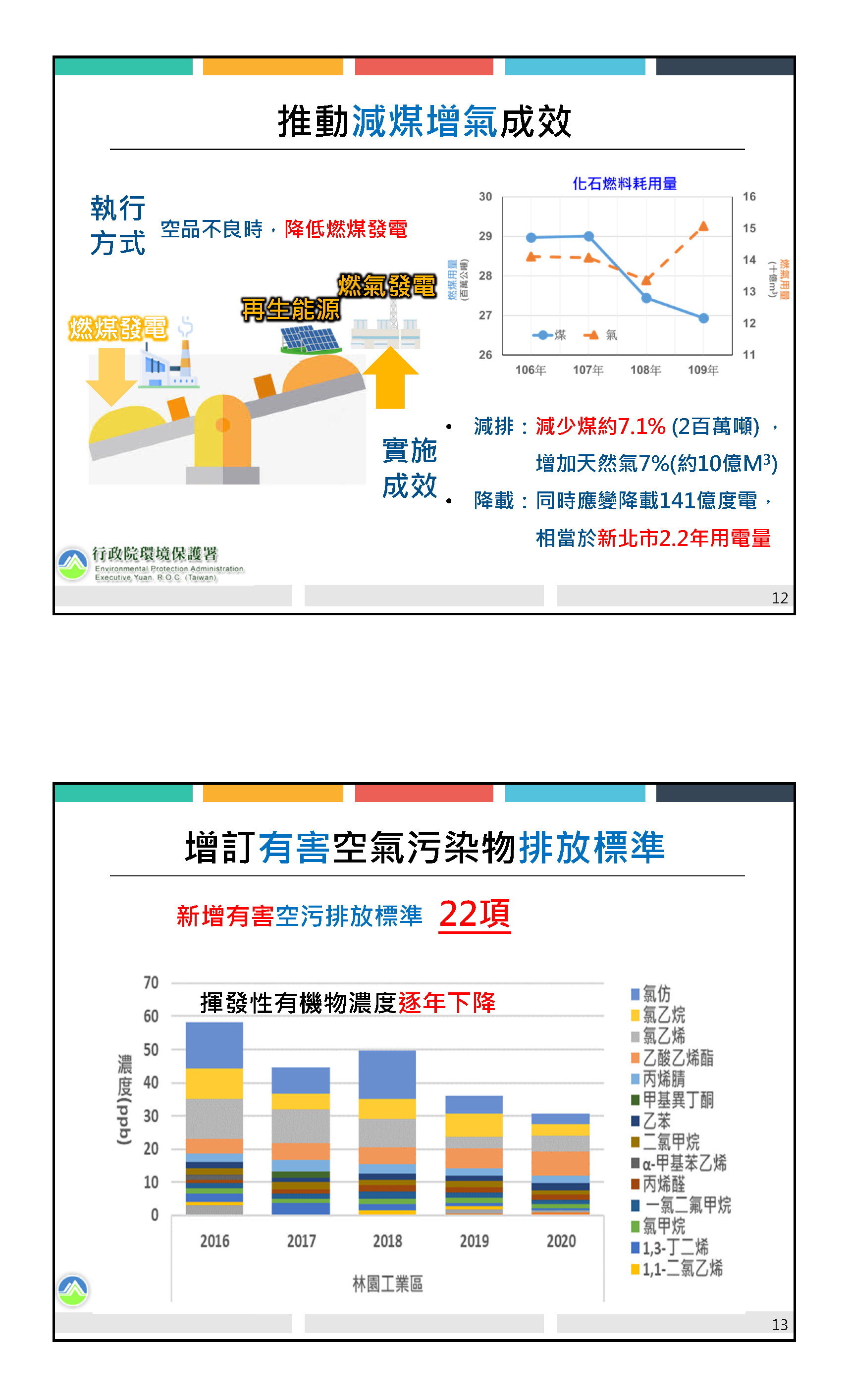 張委員其祿:對,這當然很重要,其實說實話,我們現在也有我們的作法,尤其我們已經針對一些重點產業包括電力、石化、鋼鐵、焚化等等,我們會按照新的空氣品質嚴重惡化緊急防制辦法,我們說要降到40%,在有可能的情況下。其實當碰到緊急狀況時,是燃煤發電機組或是汽電共生機組降下的比較多,其實其他產業的降幅沒有想象的那麼高,比如到了輕度惡化的時候,這些機組要降20%,而石化工業只降到15%,要到中度惡化的時候才降到20%,包括石化、鋼鐵、冶煉,反而發電的這些降的比較多。我剛剛問會不會發生能耗雙降,擔心會不會變成老共那種情況,因為到時候我們先降的都是這些發電機組,發電機組一降,優先限電的一定是老百姓,不一定是產業,所以這個是不是有矛盾?為什麼產業不要跟上?