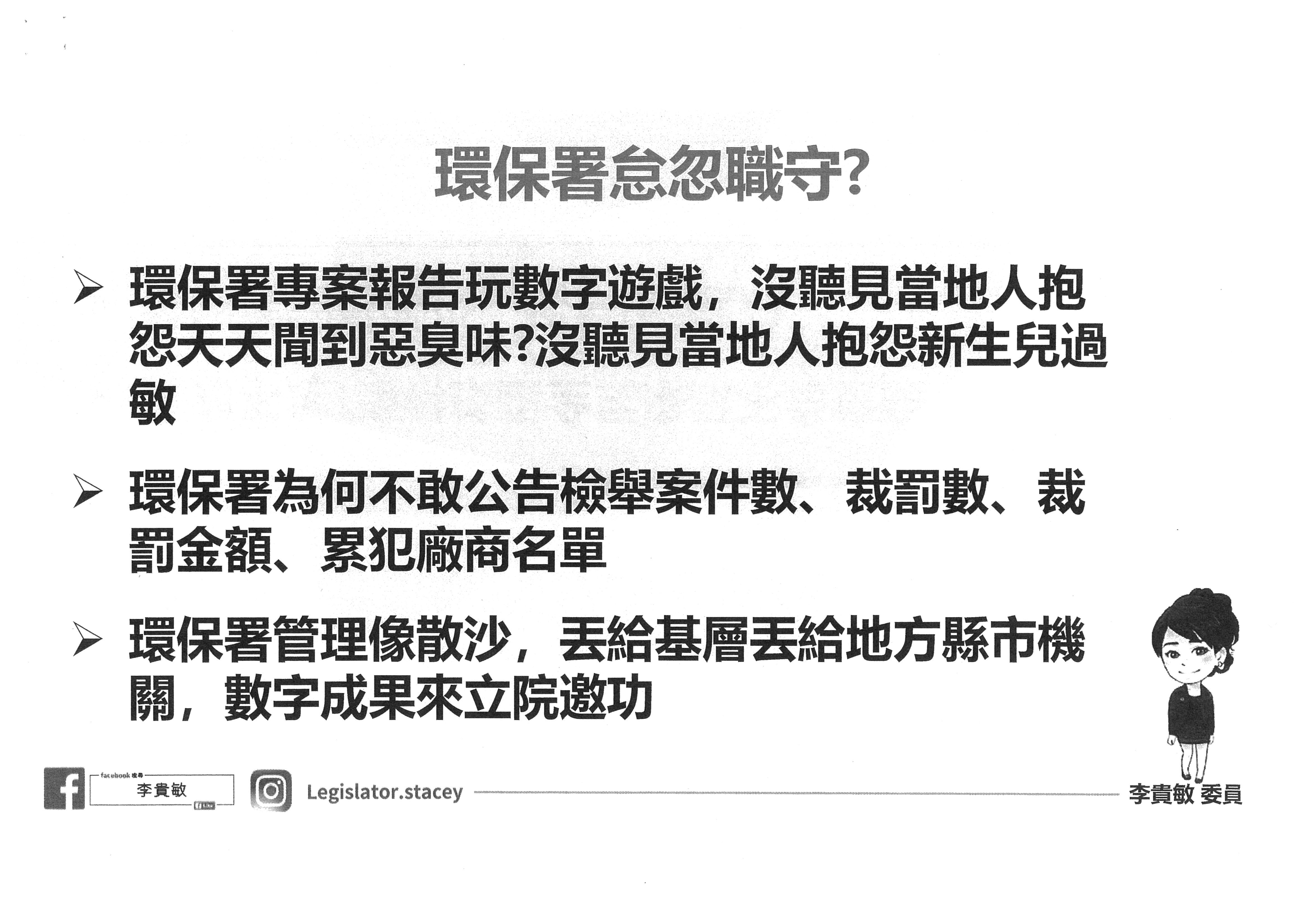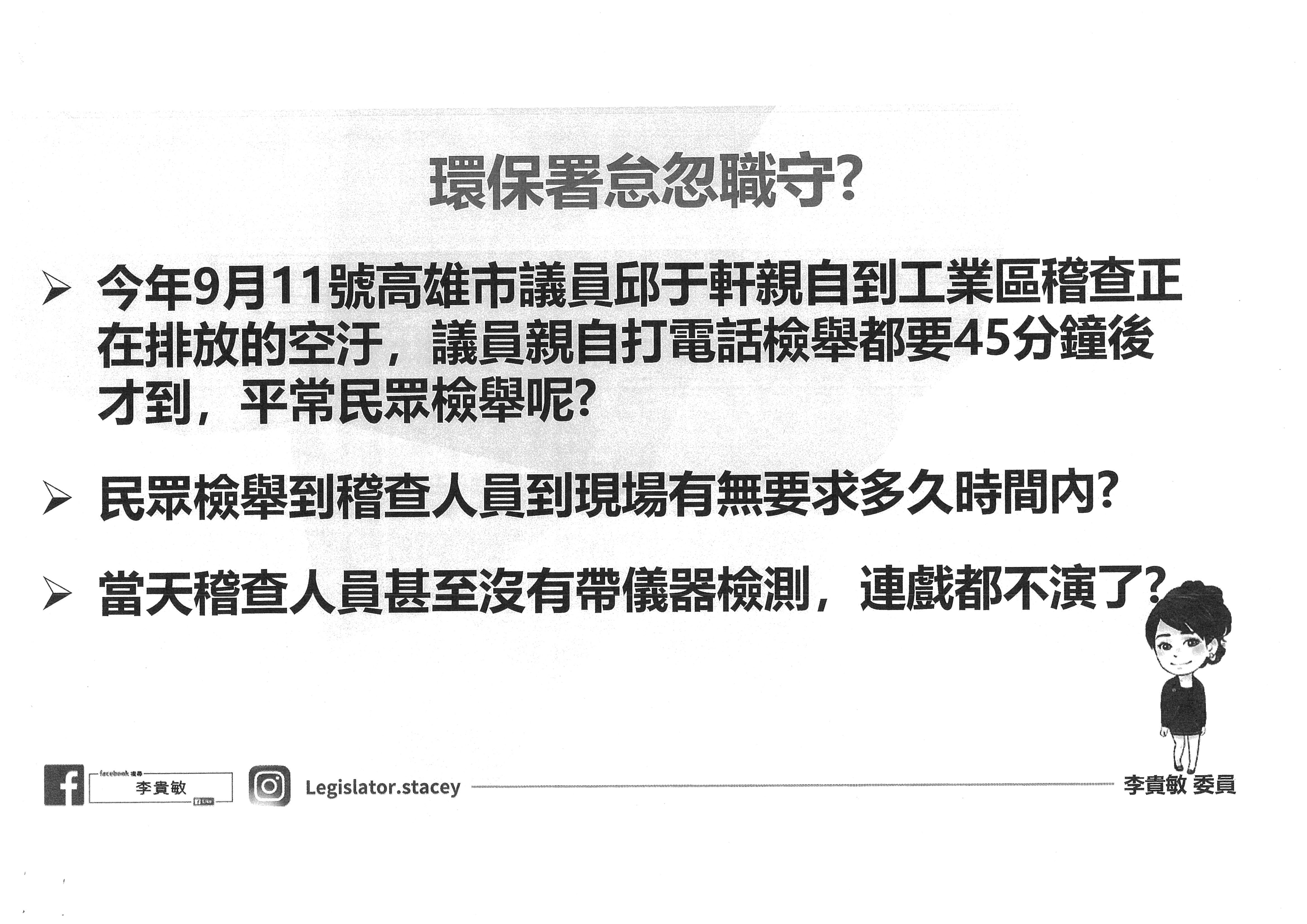 陳委員瑩:我們再往上一層思考,剛剛署長一開始講到有效的方法,有效的方法就牽扯到有沒有合適的法令規定,所以會不會是有些法令規定其實對空污防制沒有太大的助益?可是卻又讓環保署或是地方相關人員變得非常的忙碌,也消耗了很多的人力、物力,甚至是財力,去處理這些法規相關的業務,然後你們又不想、也不敢提出來做檢討,因為怕會得罪相關的團體,怕被圍剿,所以大家變得非常忙碌,然後企業單位也哀號遍野。可是到底空氣品質該改善的地方有沒有變得更好?這個又打問號。不曉得署長的看法如何?