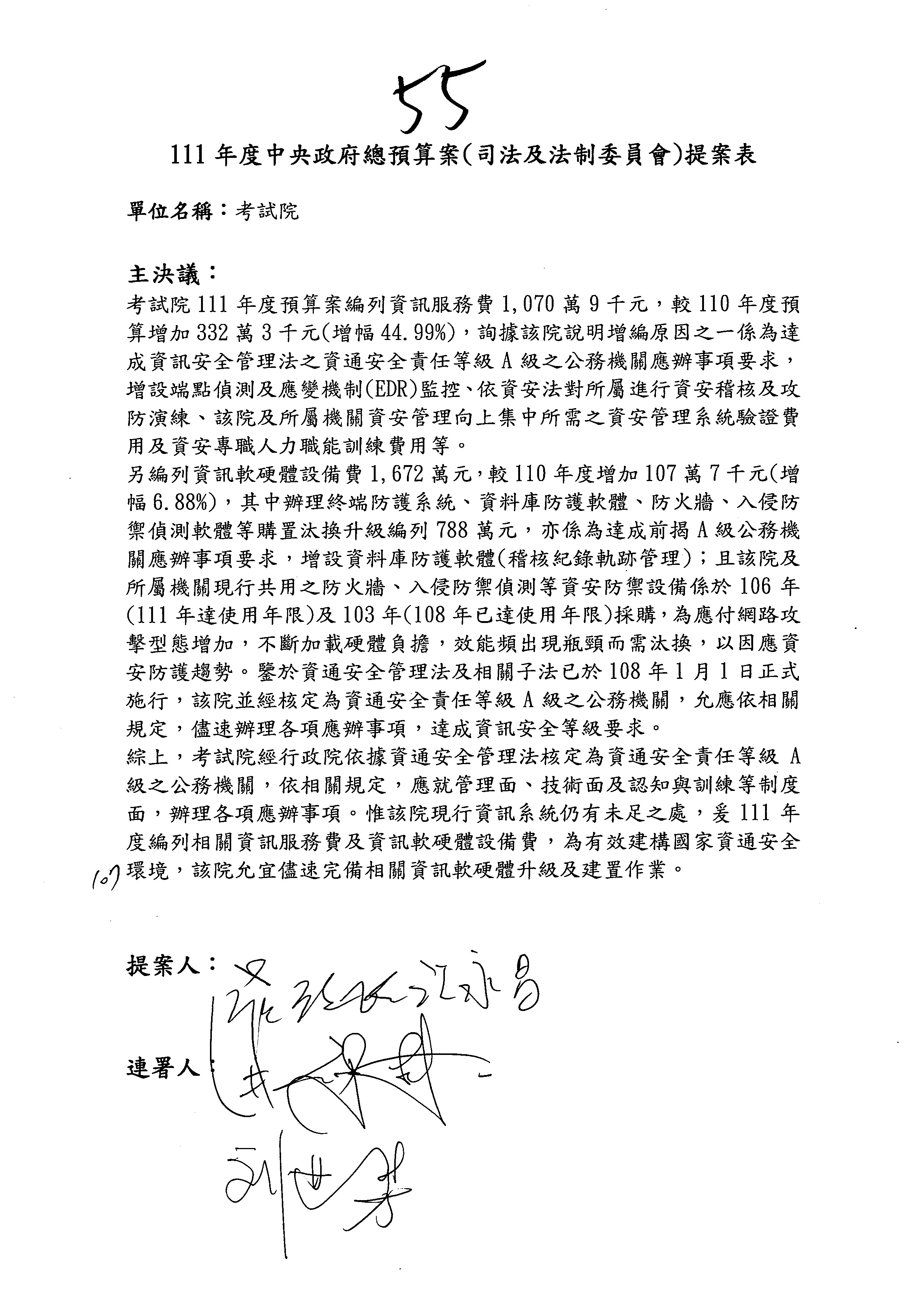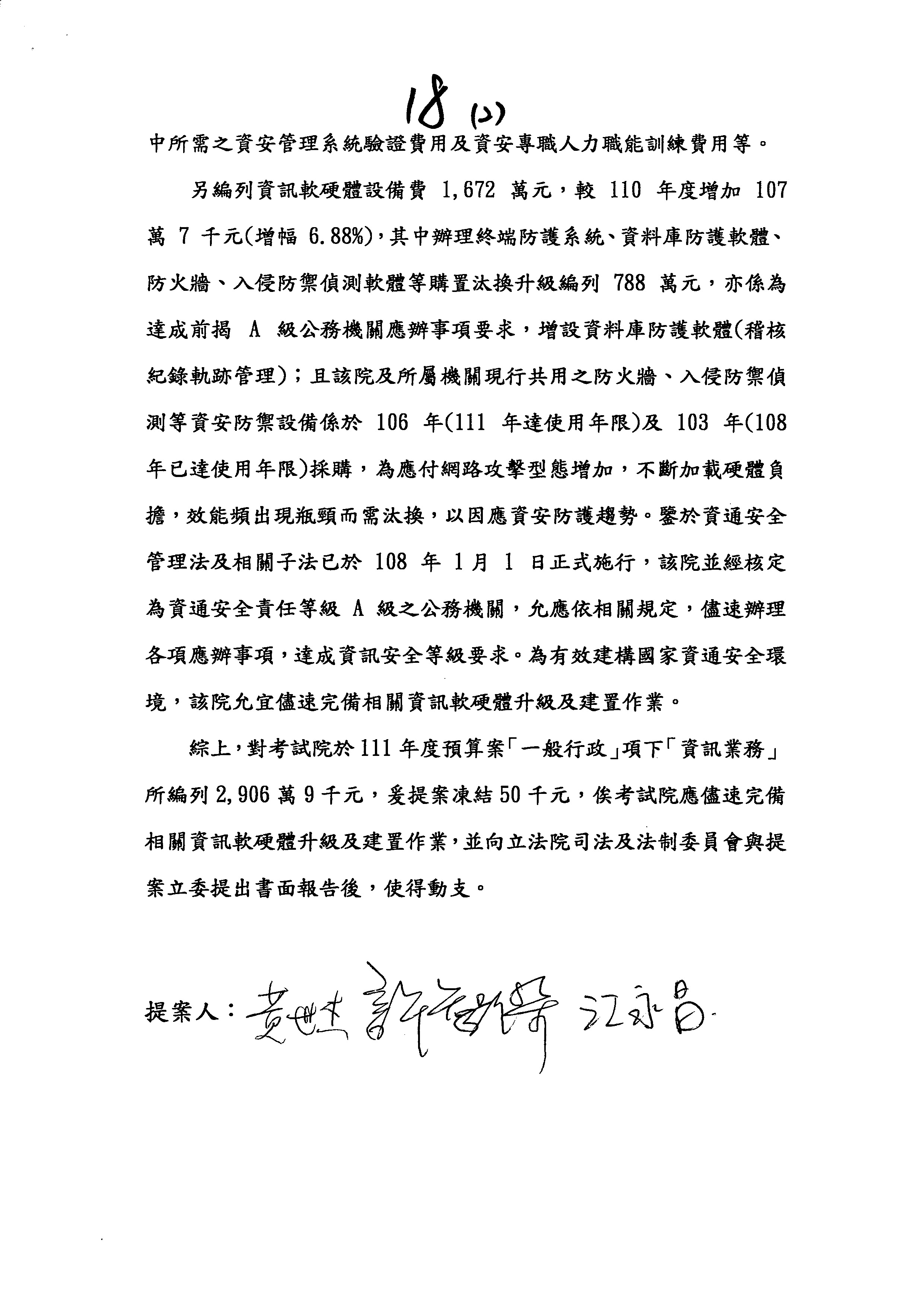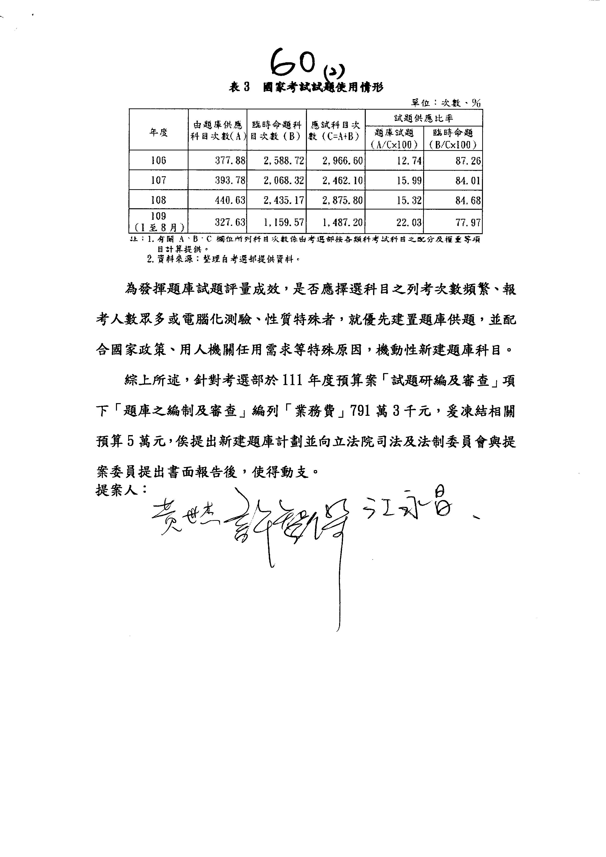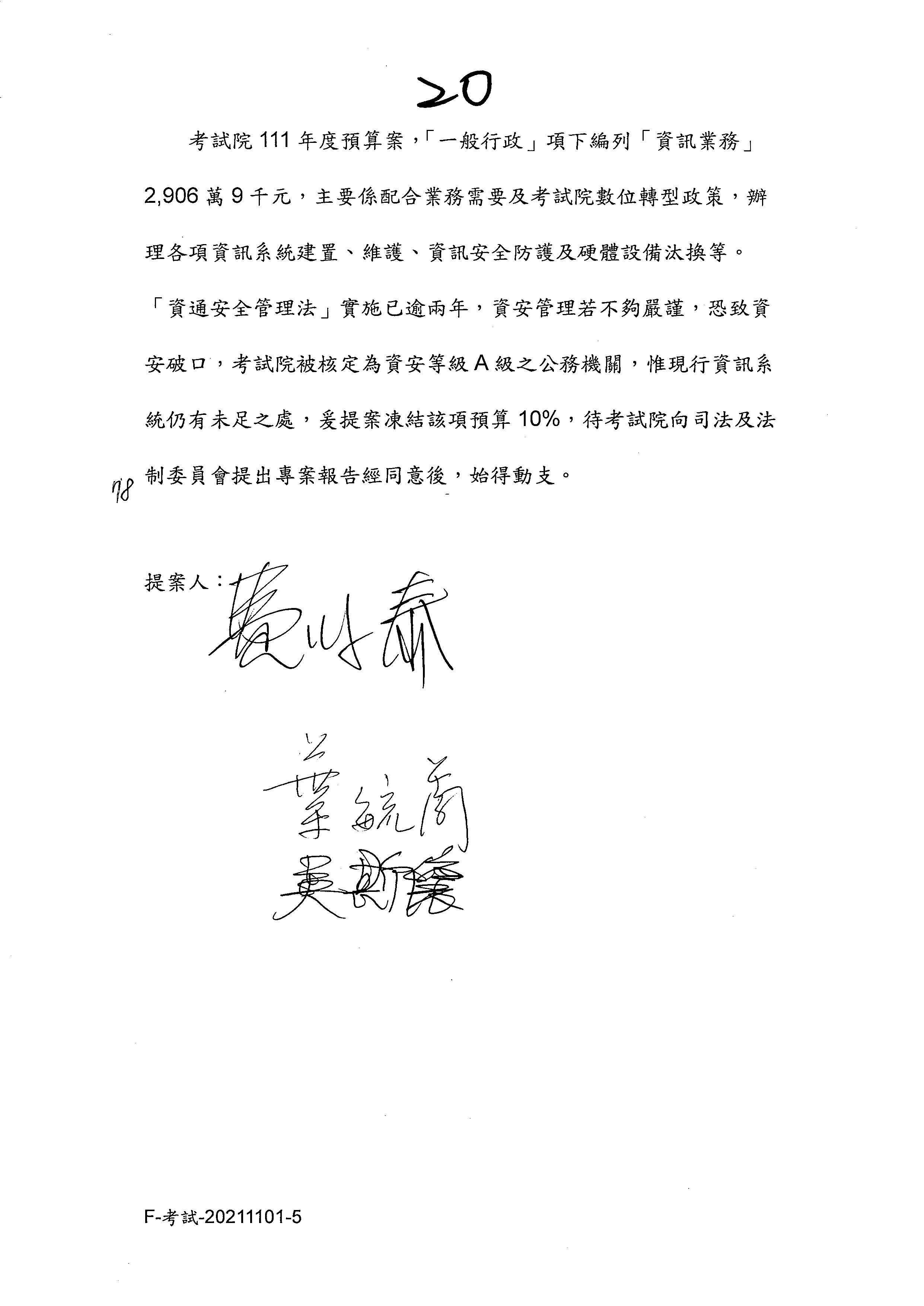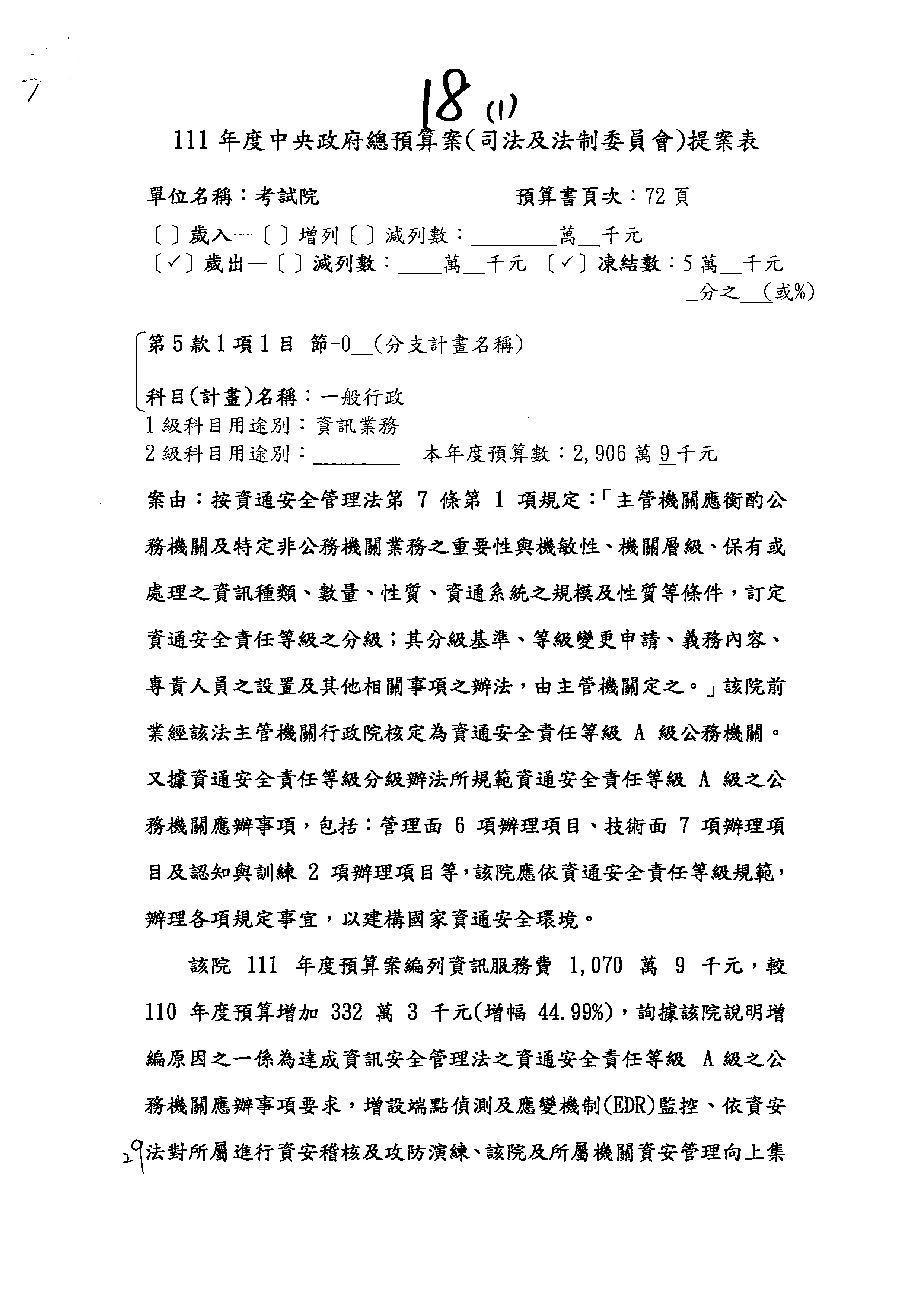 至於考試院111年度的預算方面,我們歲入編列了2,556萬元,跟今年大致相當;歲出的部分,3億4,164萬元,比今年度減列451萬4,000元,主要差別就是現任人員的年終獎金跟部分員額出缺不補的人事費減列,合計有1,035萬元。此外,為了強化資訊安全維護跟推動電子化證書的發放,我們增列了資訊業務440萬元,這邊要特別說明的是,之所以在預算規模縮減之下能夠持續增列資訊預算,主要是因為考試院過去多年來的歲出規模有限,但在近兩年來因為受惠於組織法的修正,才能夠降低人事費的支出,轉而將這些資源投資在數位轉型跟提升資通安全的業務上,這個部分有得到立法院預算中心的支持,也懇請各位委員支持。以上說明,也請參考書面報告跟預算書,謝謝。