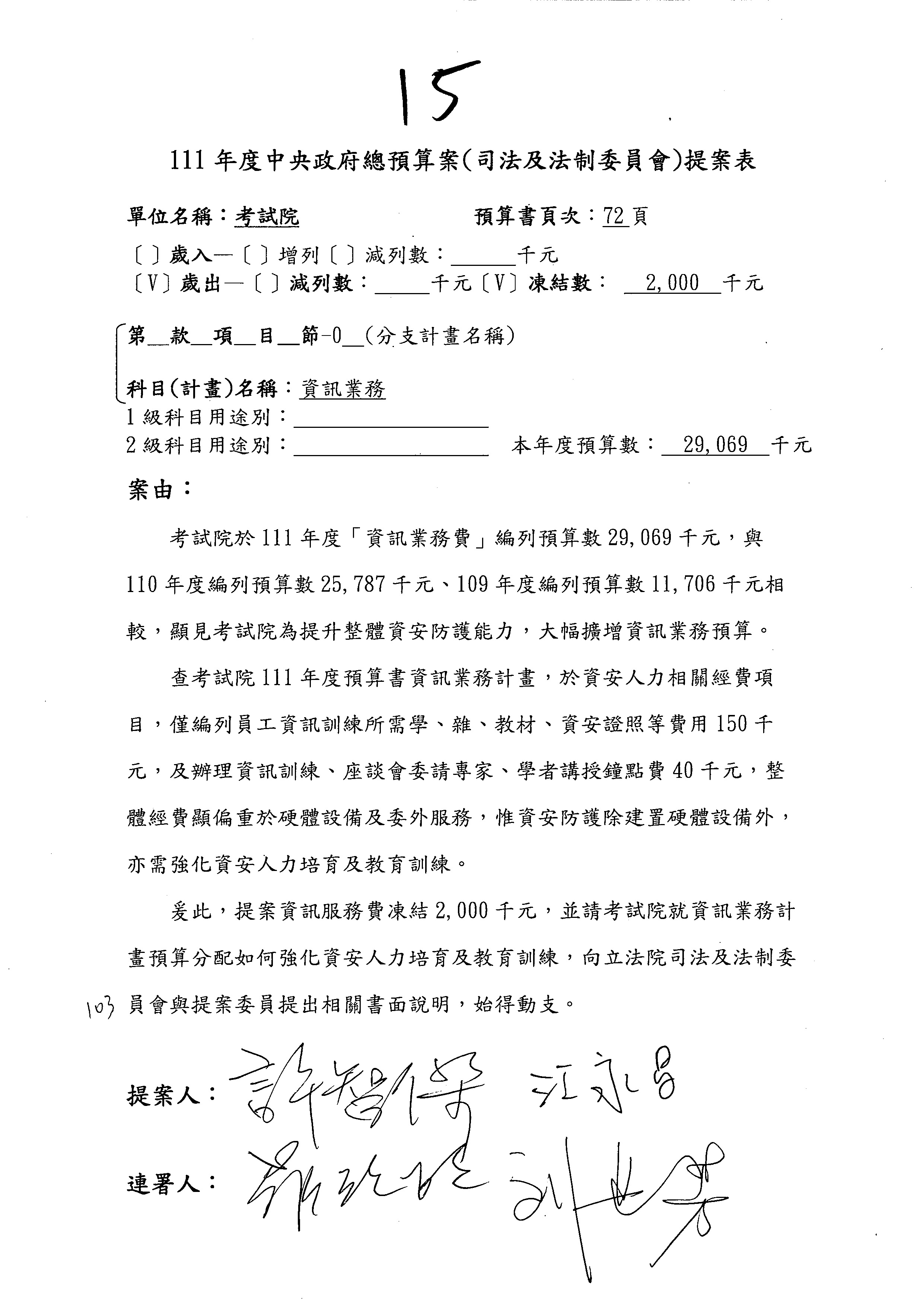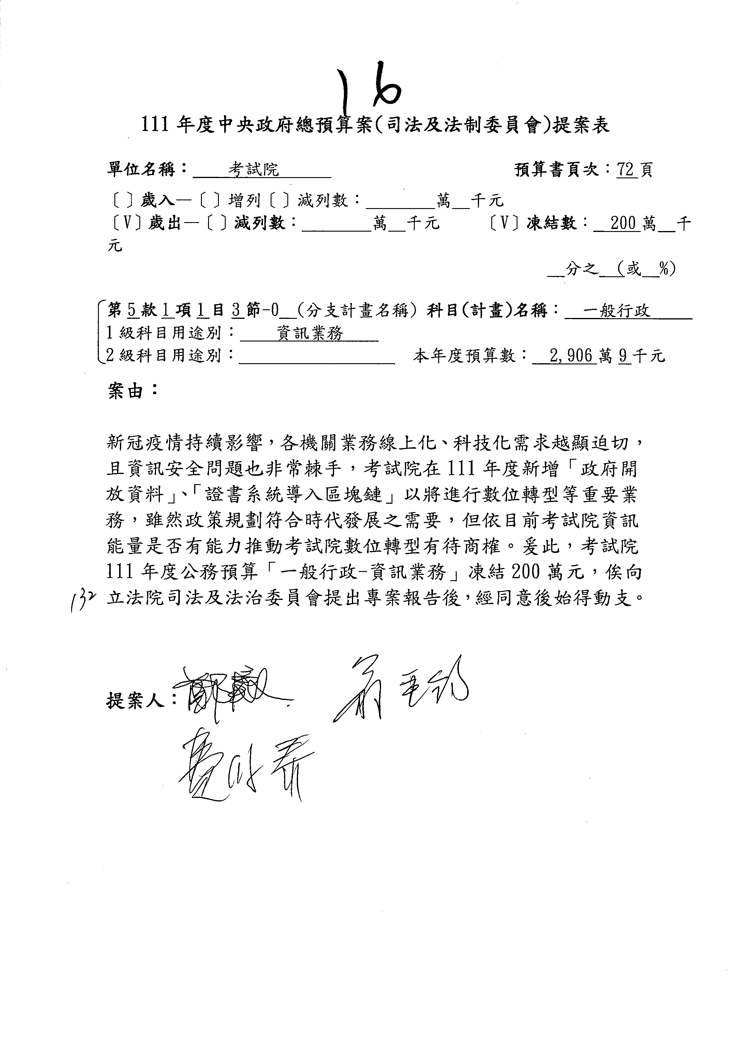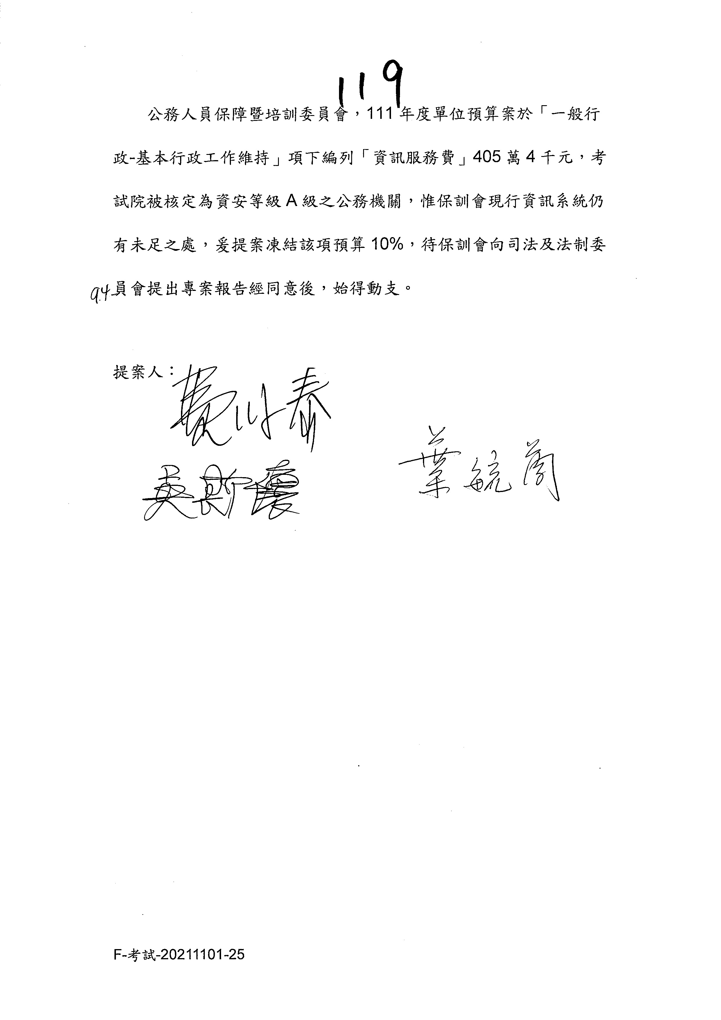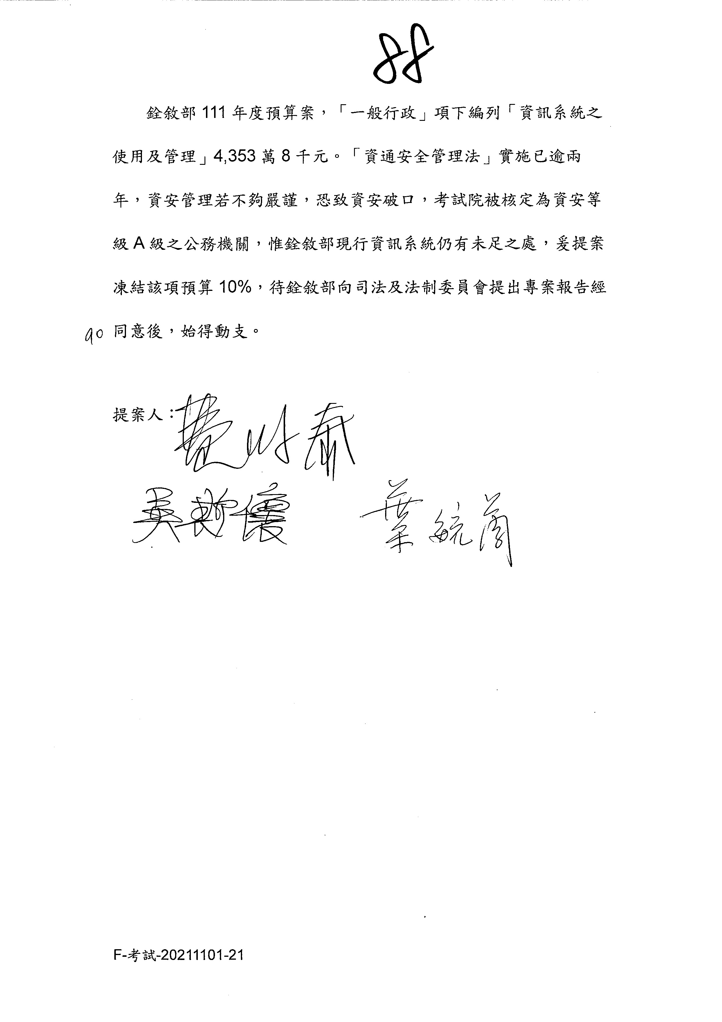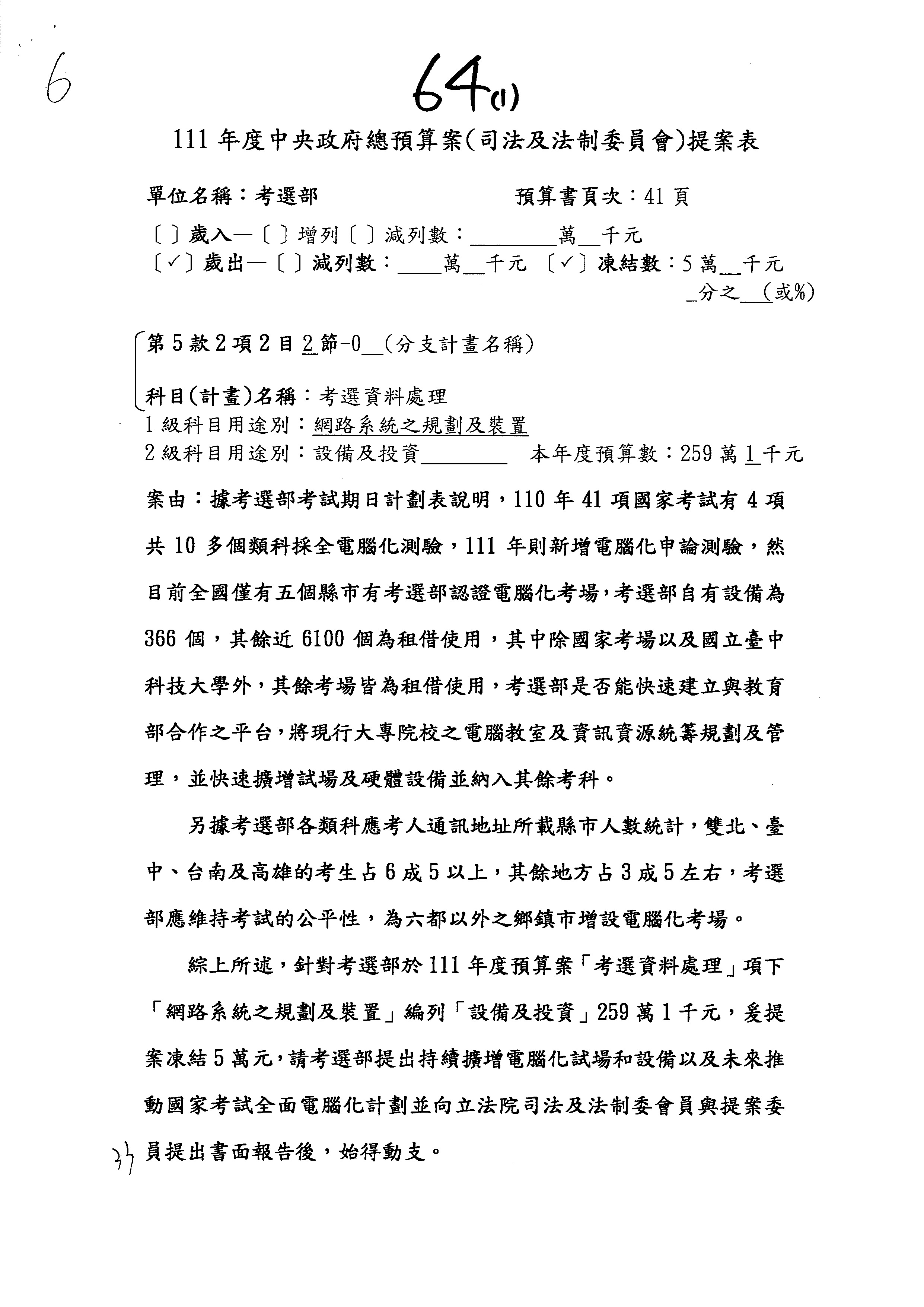 至於考試院111年度的預算方面,我們歲入編列了2,556萬元,跟今年大致相當;歲出的部分,3億4,164萬元,比今年度減列451萬4,000元,主要差別就是現任人員的年終獎金跟部分員額出缺不補的人事費減列,合計有1,035萬元。此外,為了強化資訊安全維護跟推動電子化證書的發放,我們增列了資訊業務440萬元,這邊要特別說明的是,之所以在預算規模縮減之下能夠持續增列資訊預算,主要是因為考試院過去多年來的歲出規模有限,但在近兩年來因為受惠於組織法的修正,才能夠降低人事費的支出,轉而將這些資源投資在數位轉型跟提升資通安全的業務上,這個部分有得到立法院預算中心的支持,也懇請各位委員支持。以上說明,也請參考書面報告跟預算書,謝謝。