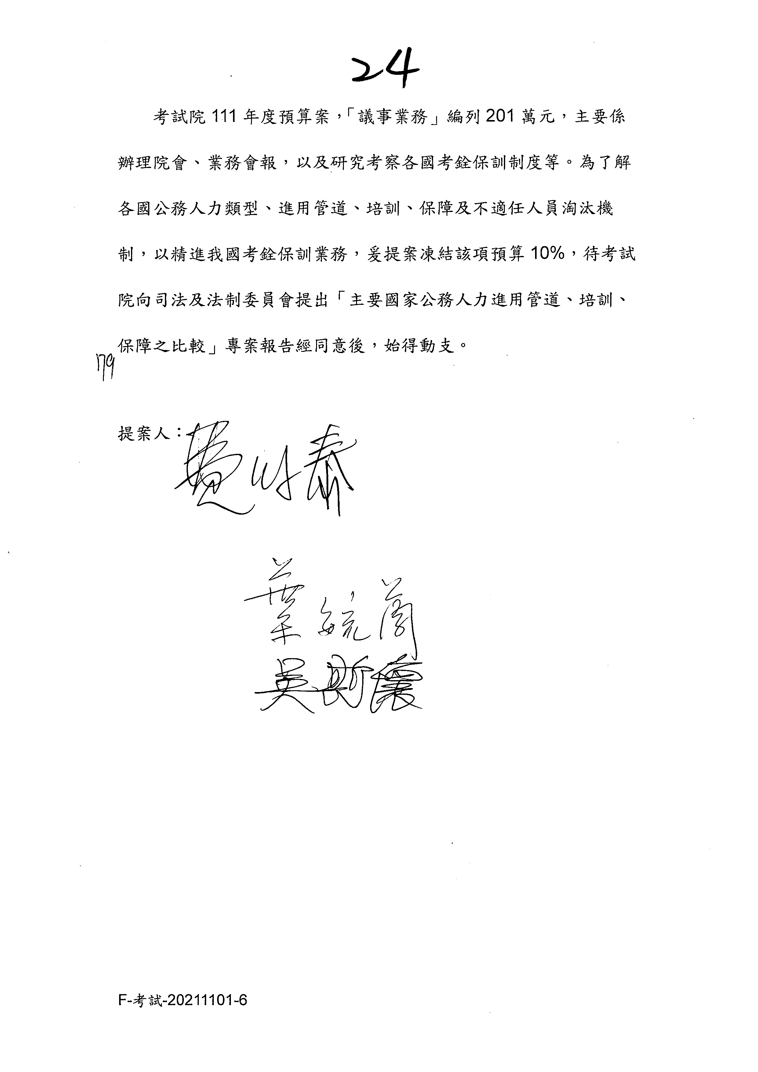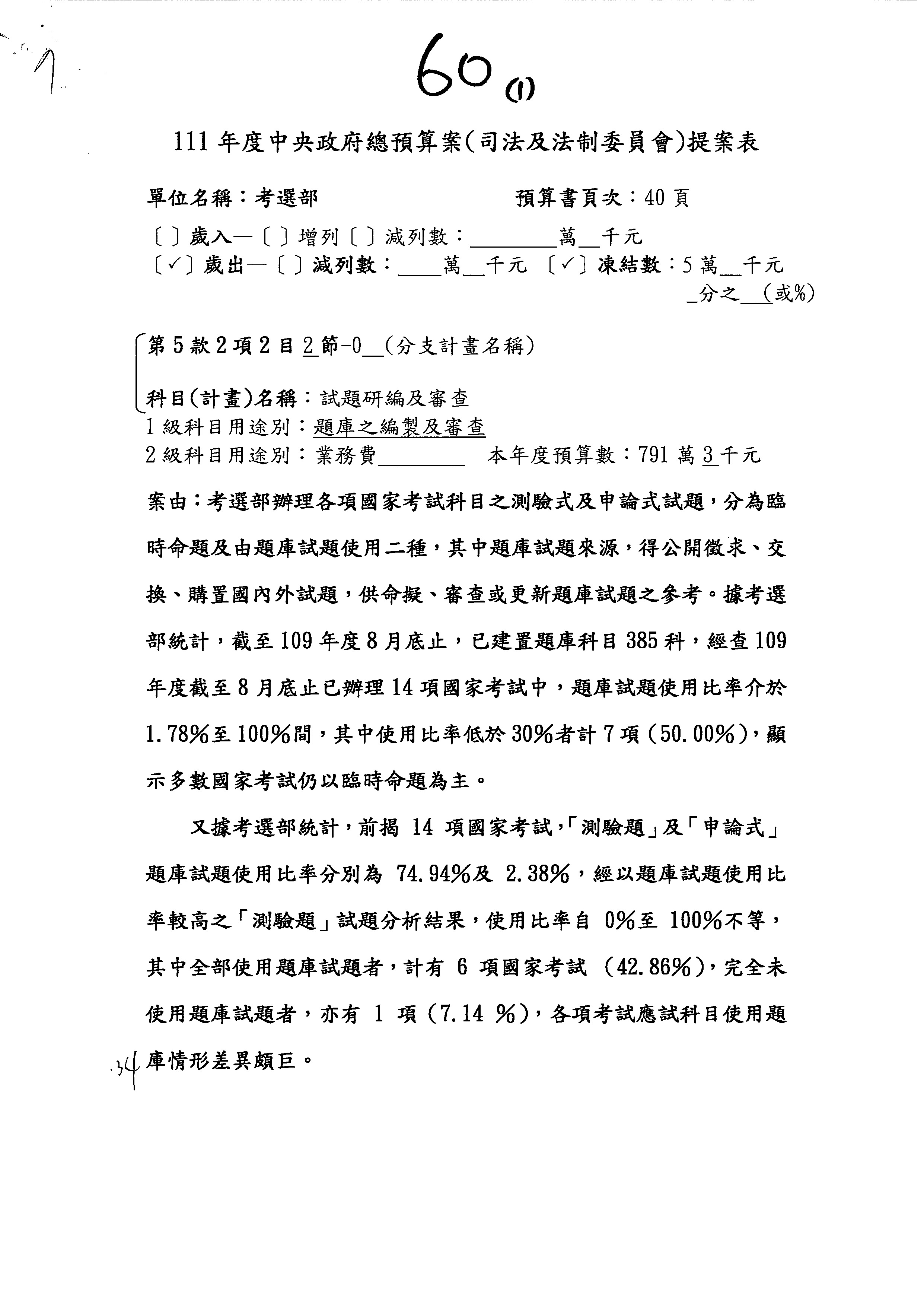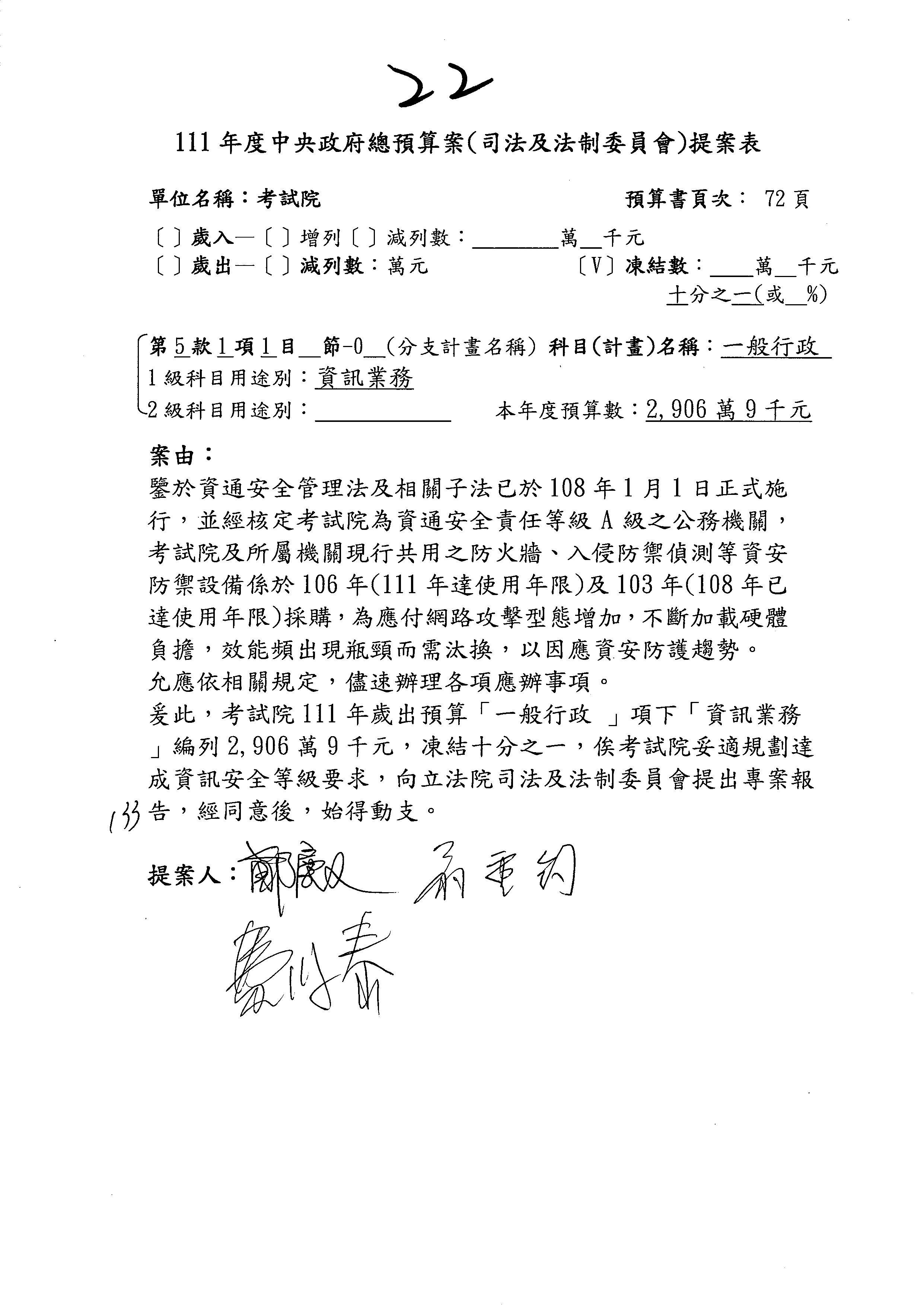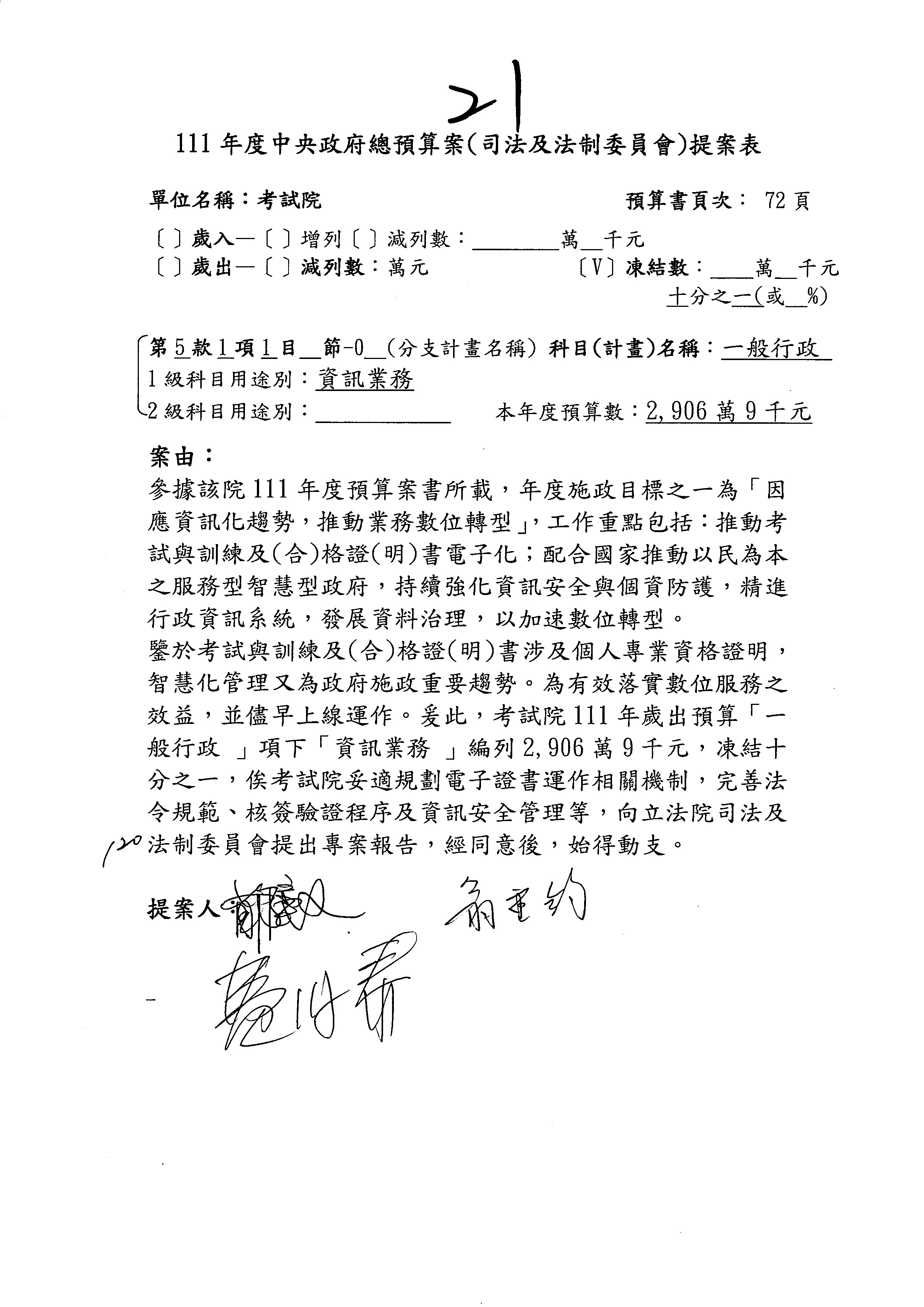 至於考試院111年度的預算方面,我們歲入編列了2,556萬元,跟今年大致相當;歲出的部分,3億4,164萬元,比今年度減列451萬4,000元,主要差別就是現任人員的年終獎金跟部分員額出缺不補的人事費減列,合計有1,035萬元。此外,為了強化資訊安全維護跟推動電子化證書的發放,我們增列了資訊業務440萬元,這邊要特別說明的是,之所以在預算規模縮減之下能夠持續增列資訊預算,主要是因為考試院過去多年來的歲出規模有限,但在近兩年來因為受惠於組織法的修正,才能夠降低人事費的支出,轉而將這些資源投資在數位轉型跟提升資通安全的業務上,這個部分有得到立法院預算中心的支持,也懇請各位委員支持。以上說明,也請參考書面報告跟預算書,謝謝。