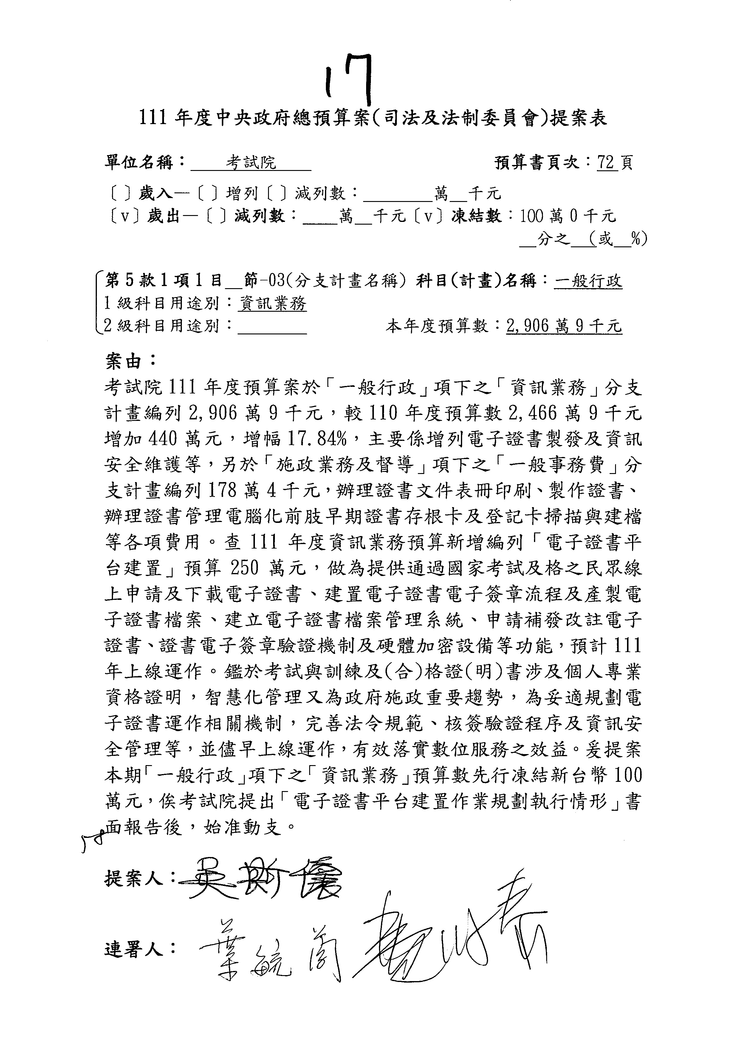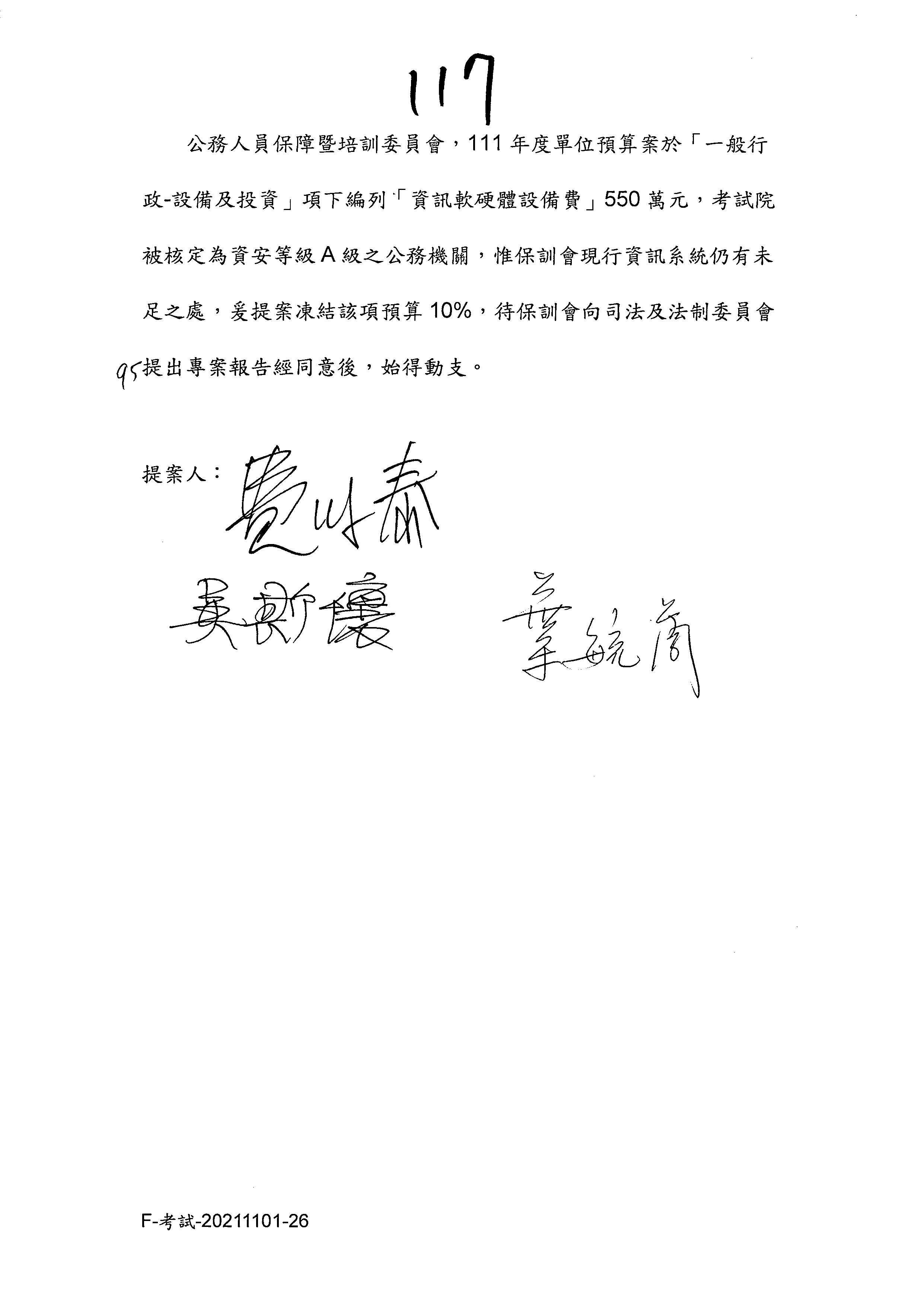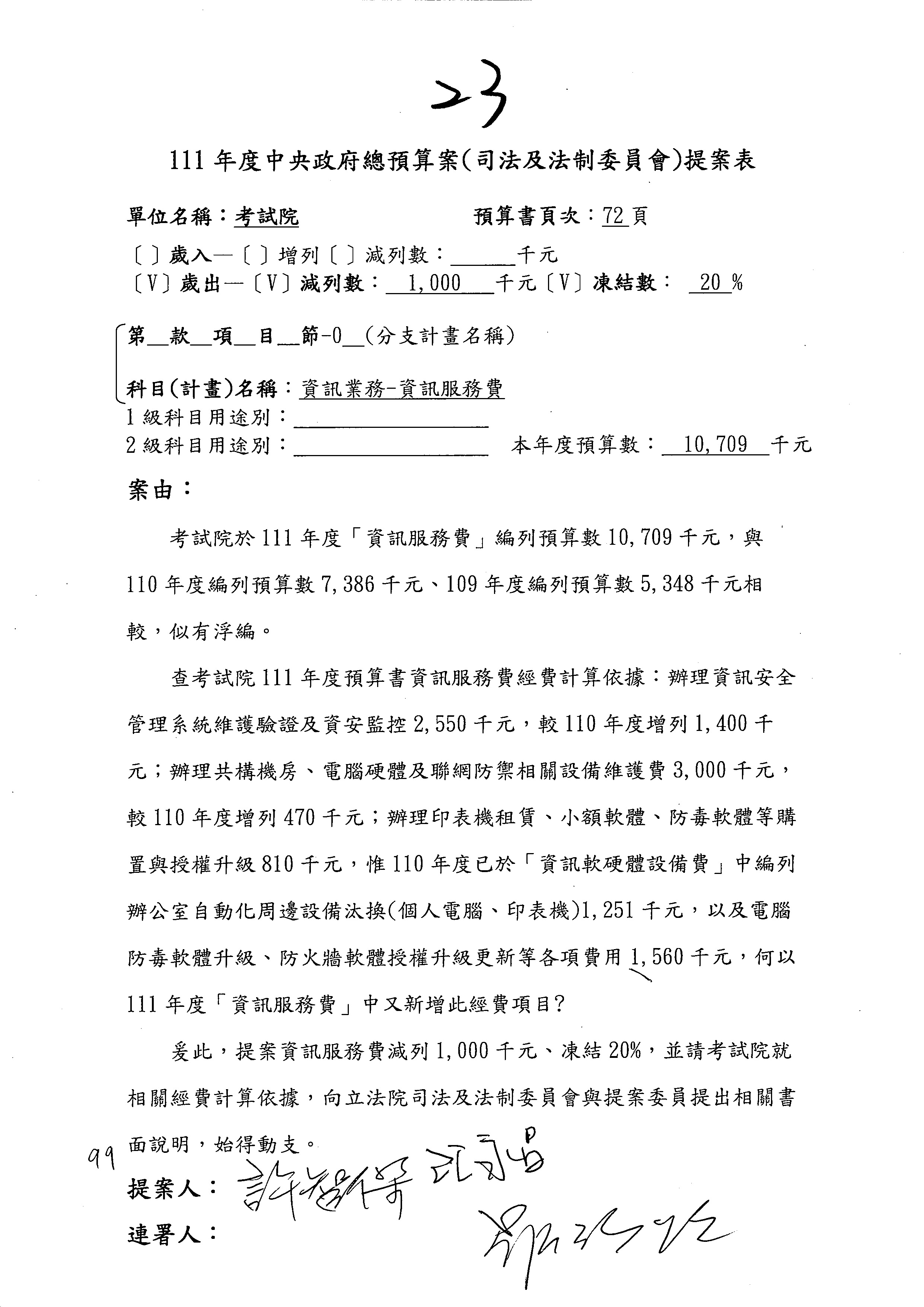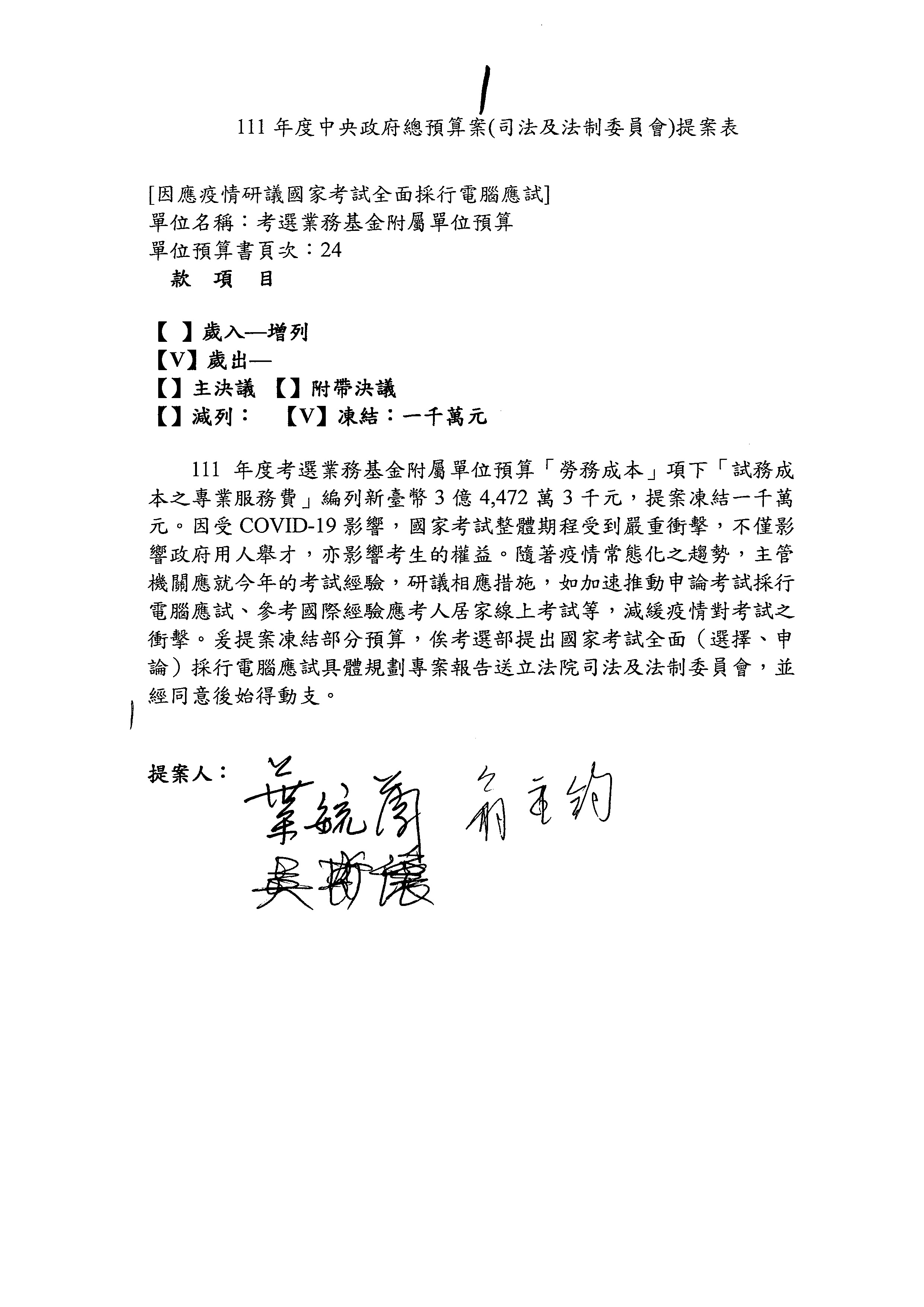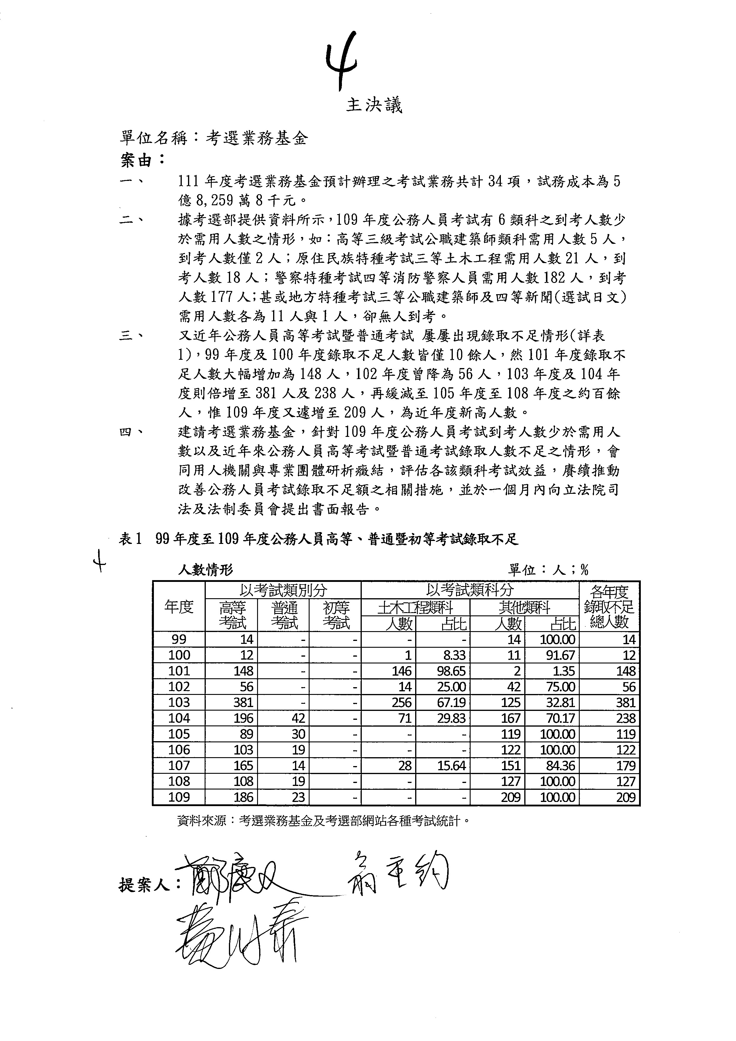 至於考試院111年度的預算方面,我們歲入編列了2,556萬元,跟今年大致相當;歲出的部分,3億4,164萬元,比今年度減列451萬4,000元,主要差別就是現任人員的年終獎金跟部分員額出缺不補的人事費減列,合計有1,035萬元。此外,為了強化資訊安全維護跟推動電子化證書的發放,我們增列了資訊業務440萬元,這邊要特別說明的是,之所以在預算規模縮減之下能夠持續增列資訊預算,主要是因為考試院過去多年來的歲出規模有限,但在近兩年來因為受惠於組織法的修正,才能夠降低人事費的支出,轉而將這些資源投資在數位轉型跟提升資通安全的業務上,這個部分有得到立法院預算中心的支持,也懇請各位委員支持。以上說明,也請參考書面報告跟預算書,謝謝。