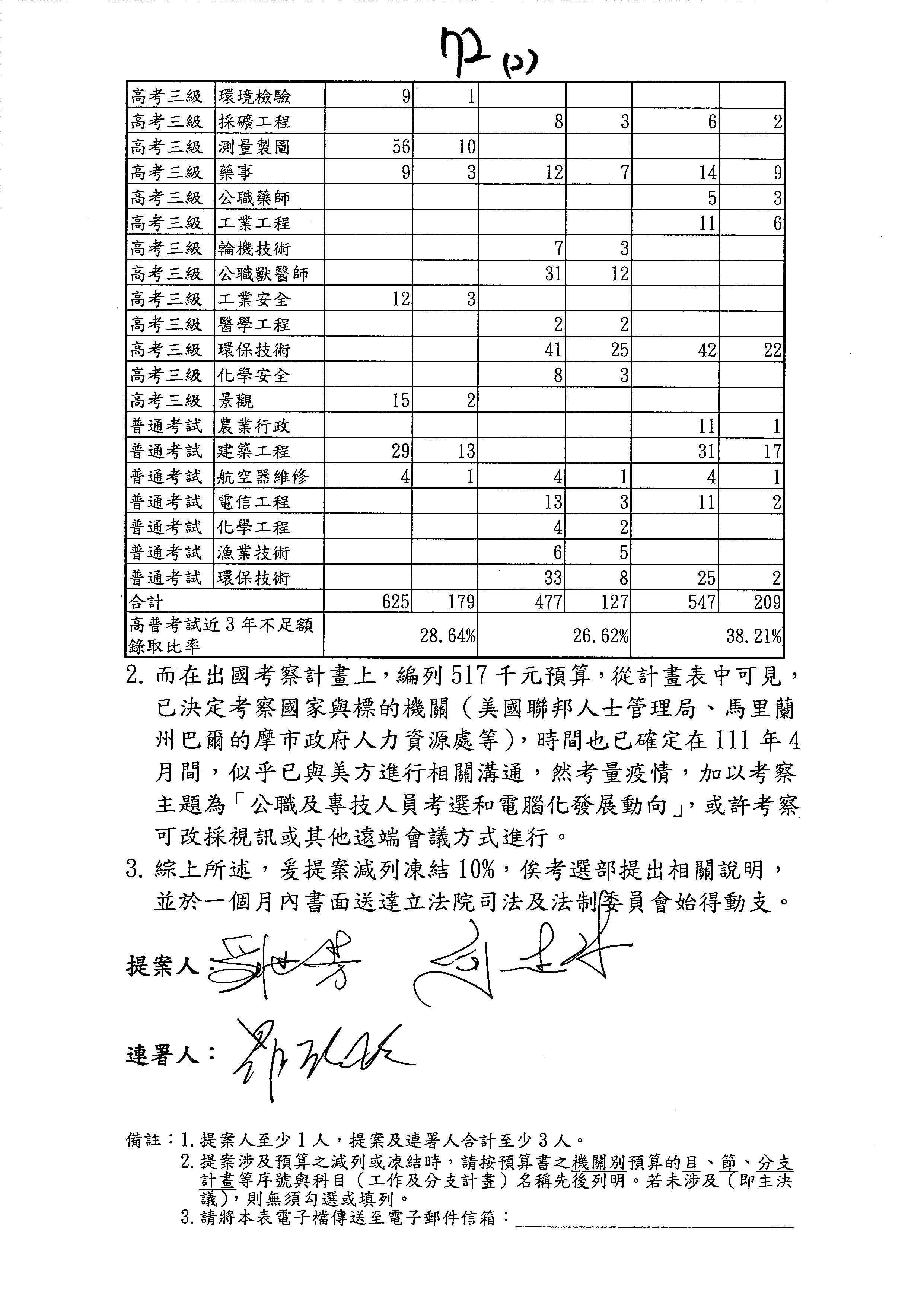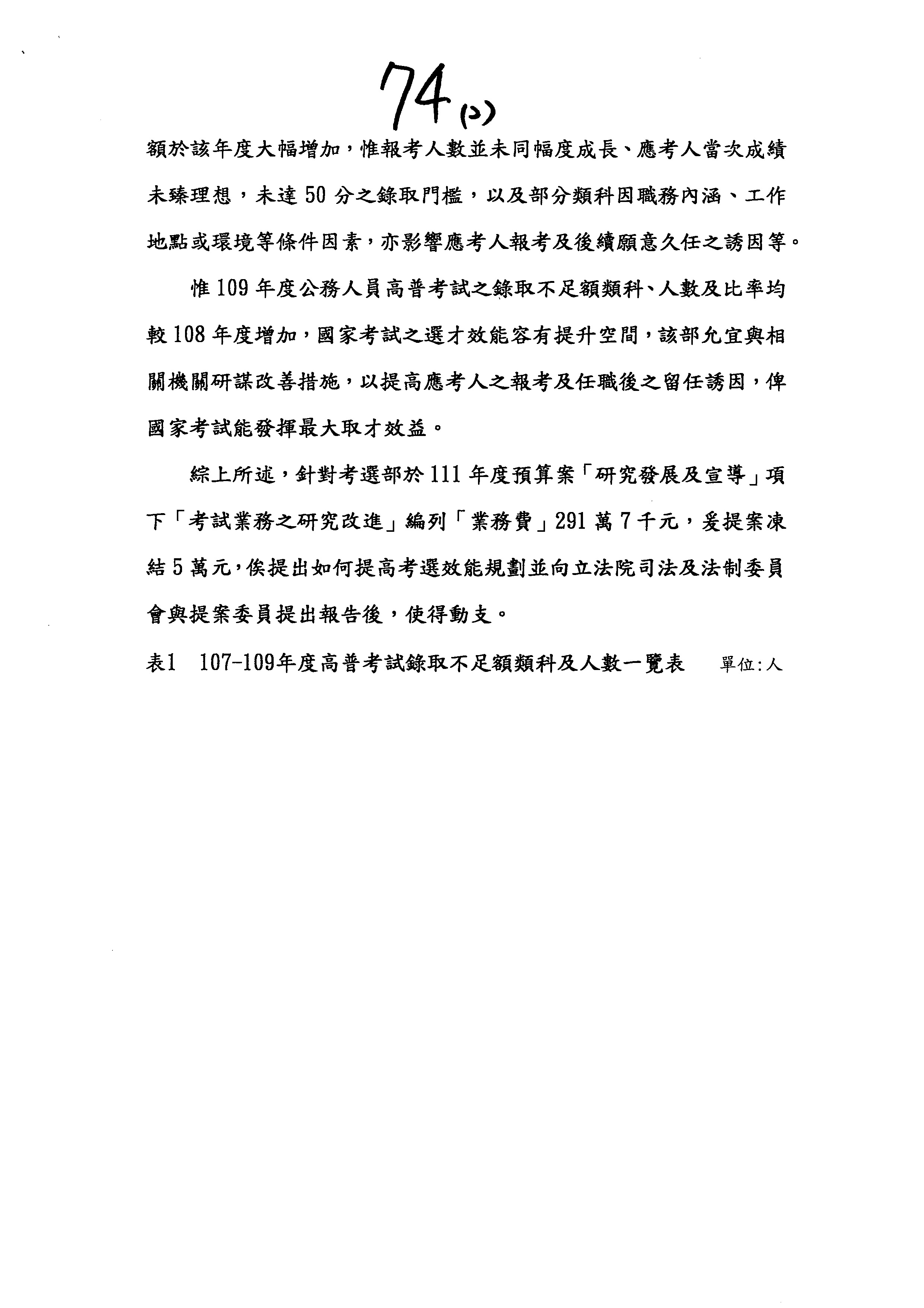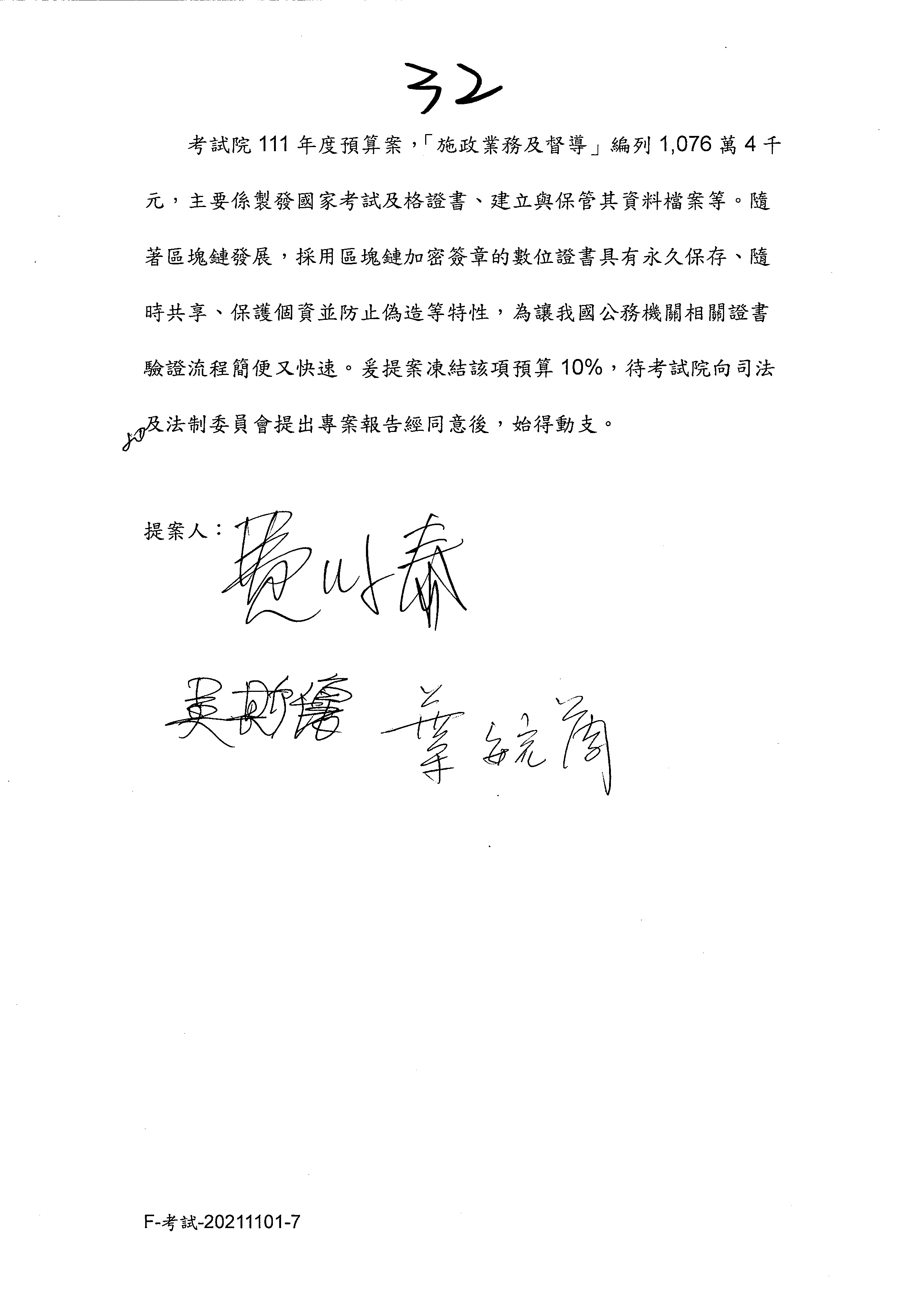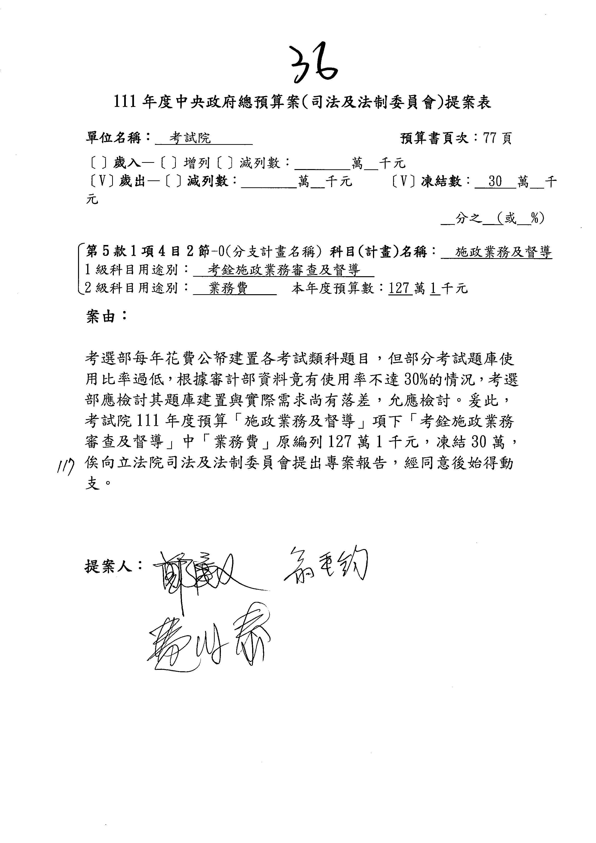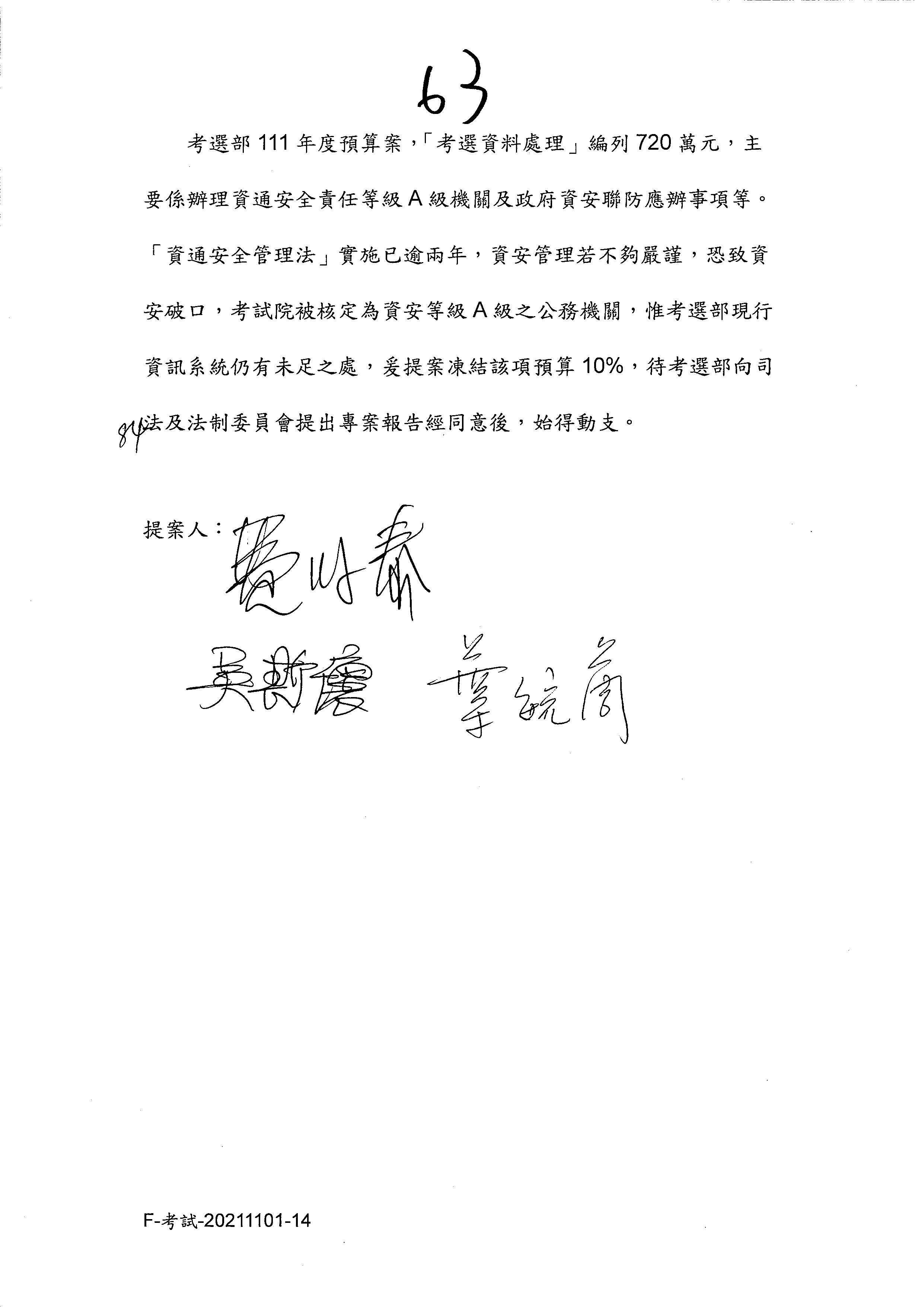 至於考試院111年度的預算方面,我們歲入編列了2,556萬元,跟今年大致相當;歲出的部分,3億4,164萬元,比今年度減列451萬4,000元,主要差別就是現任人員的年終獎金跟部分員額出缺不補的人事費減列,合計有1,035萬元。此外,為了強化資訊安全維護跟推動電子化證書的發放,我們增列了資訊業務440萬元,這邊要特別說明的是,之所以在預算規模縮減之下能夠持續增列資訊預算,主要是因為考試院過去多年來的歲出規模有限,但在近兩年來因為受惠於組織法的修正,才能夠降低人事費的支出,轉而將這些資源投資在數位轉型跟提升資通安全的業務上,這個部分有得到立法院預算中心的支持,也懇請各位委員支持。以上說明,也請參考書面報告跟預算書,謝謝。