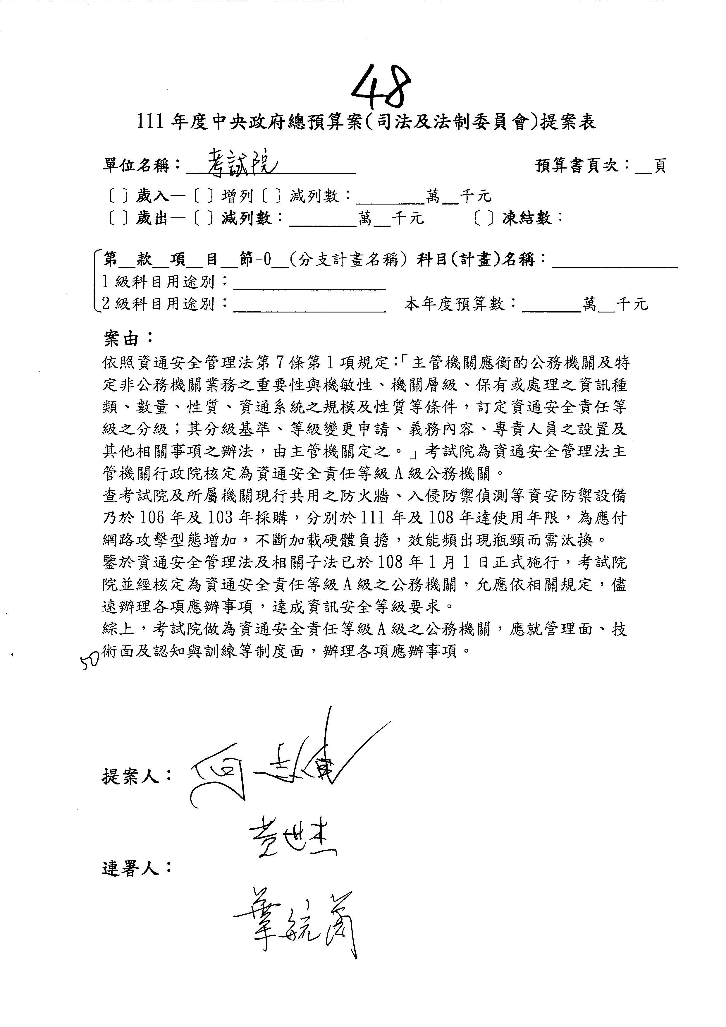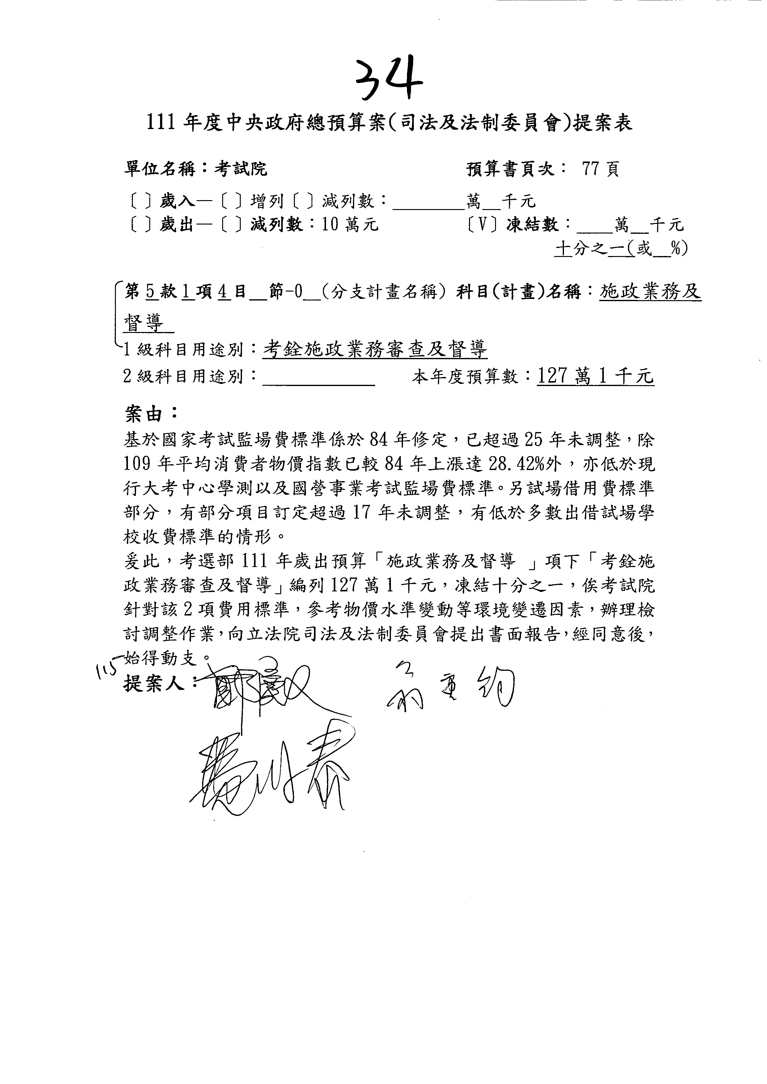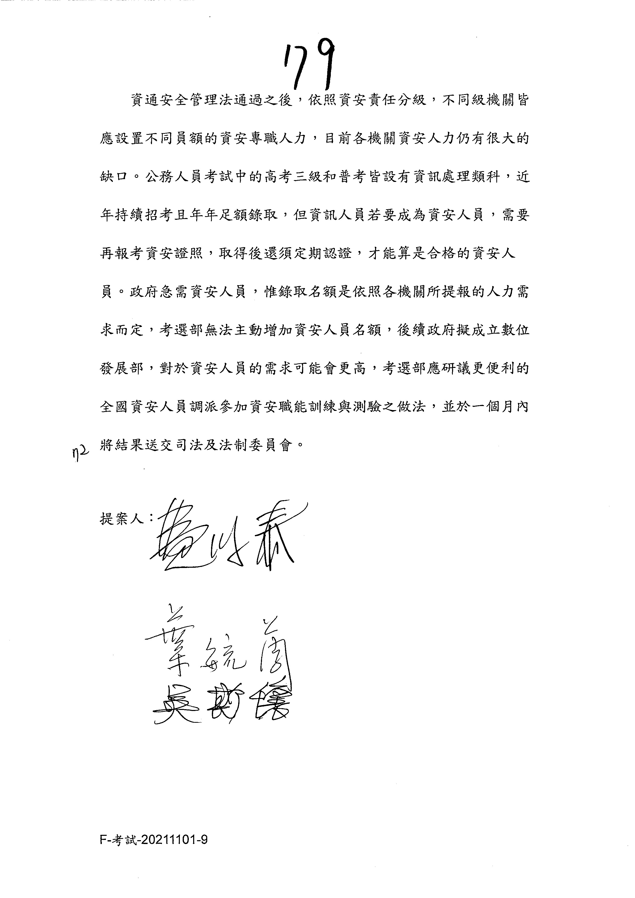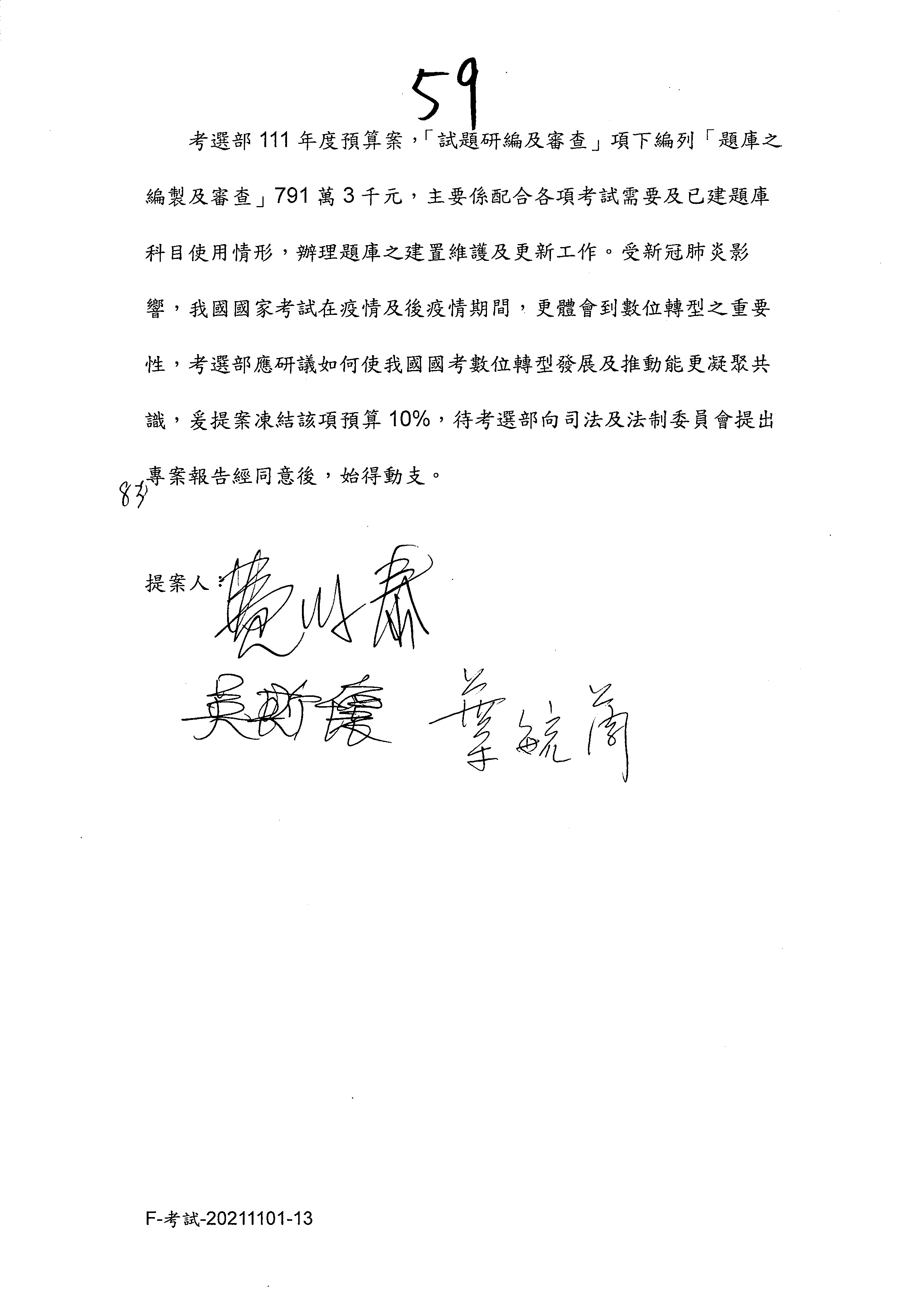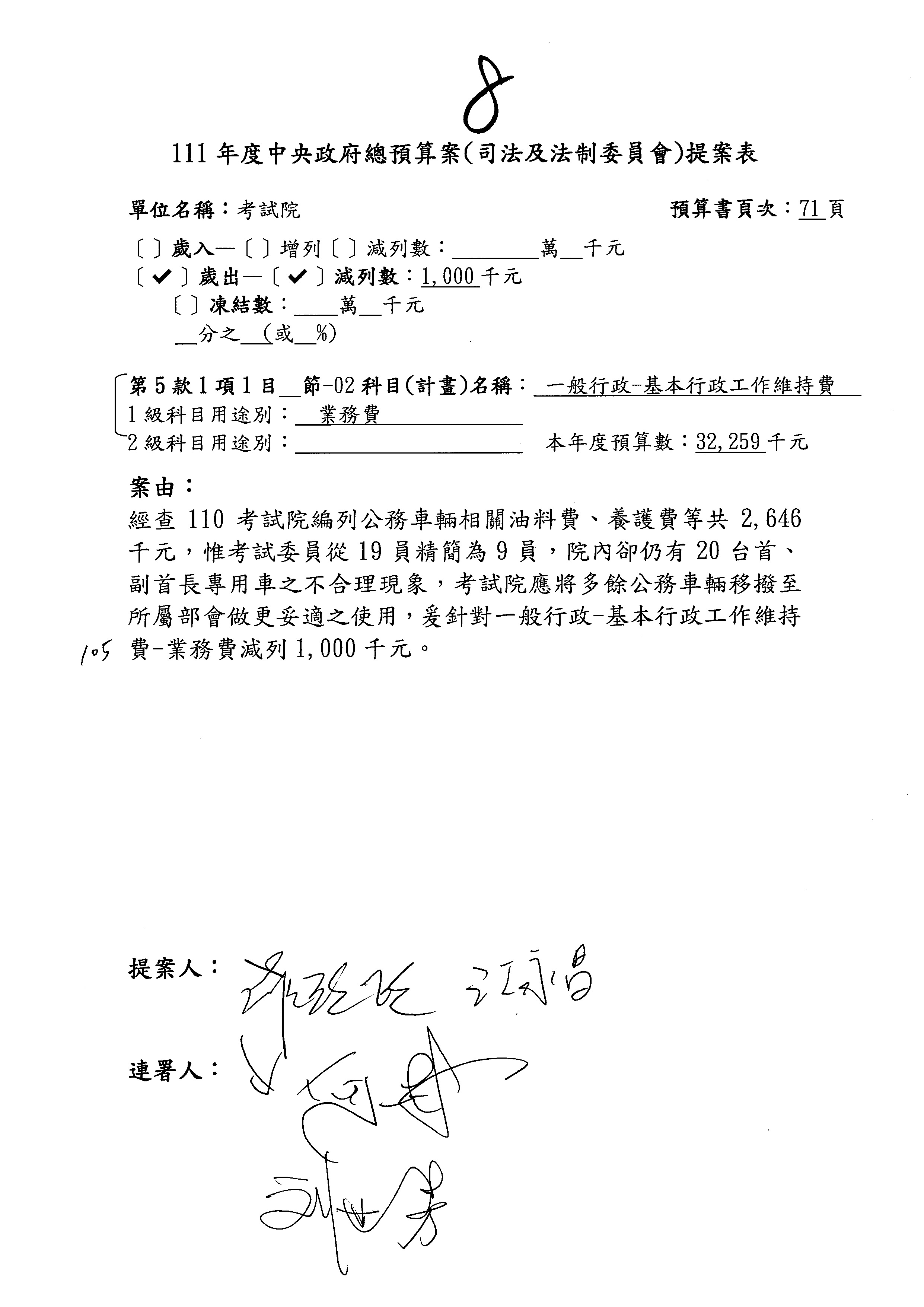 至於考試院111年度的預算方面,我們歲入編列了2,556萬元,跟今年大致相當;歲出的部分,3億4,164萬元,比今年度減列451萬4,000元,主要差別就是現任人員的年終獎金跟部分員額出缺不補的人事費減列,合計有1,035萬元。此外,為了強化資訊安全維護跟推動電子化證書的發放,我們增列了資訊業務440萬元,這邊要特別說明的是,之所以在預算規模縮減之下能夠持續增列資訊預算,主要是因為考試院過去多年來的歲出規模有限,但在近兩年來因為受惠於組織法的修正,才能夠降低人事費的支出,轉而將這些資源投資在數位轉型跟提升資通安全的業務上,這個部分有得到立法院預算中心的支持,也懇請各位委員支持。以上說明,也請參考書面報告跟預算書,謝謝。