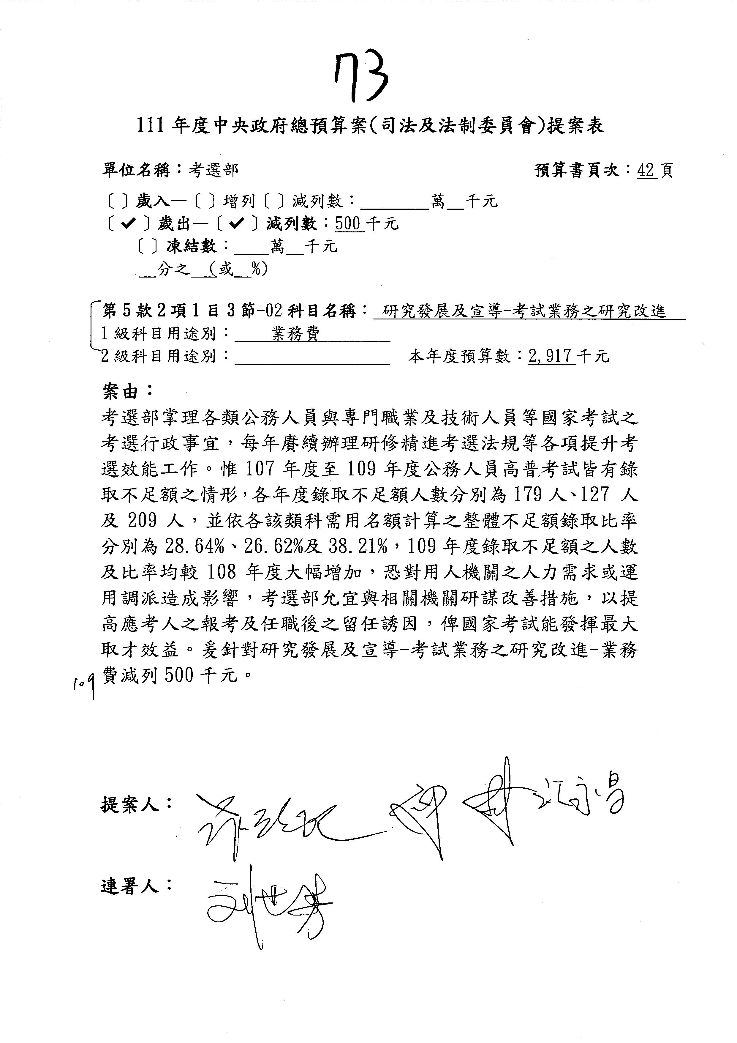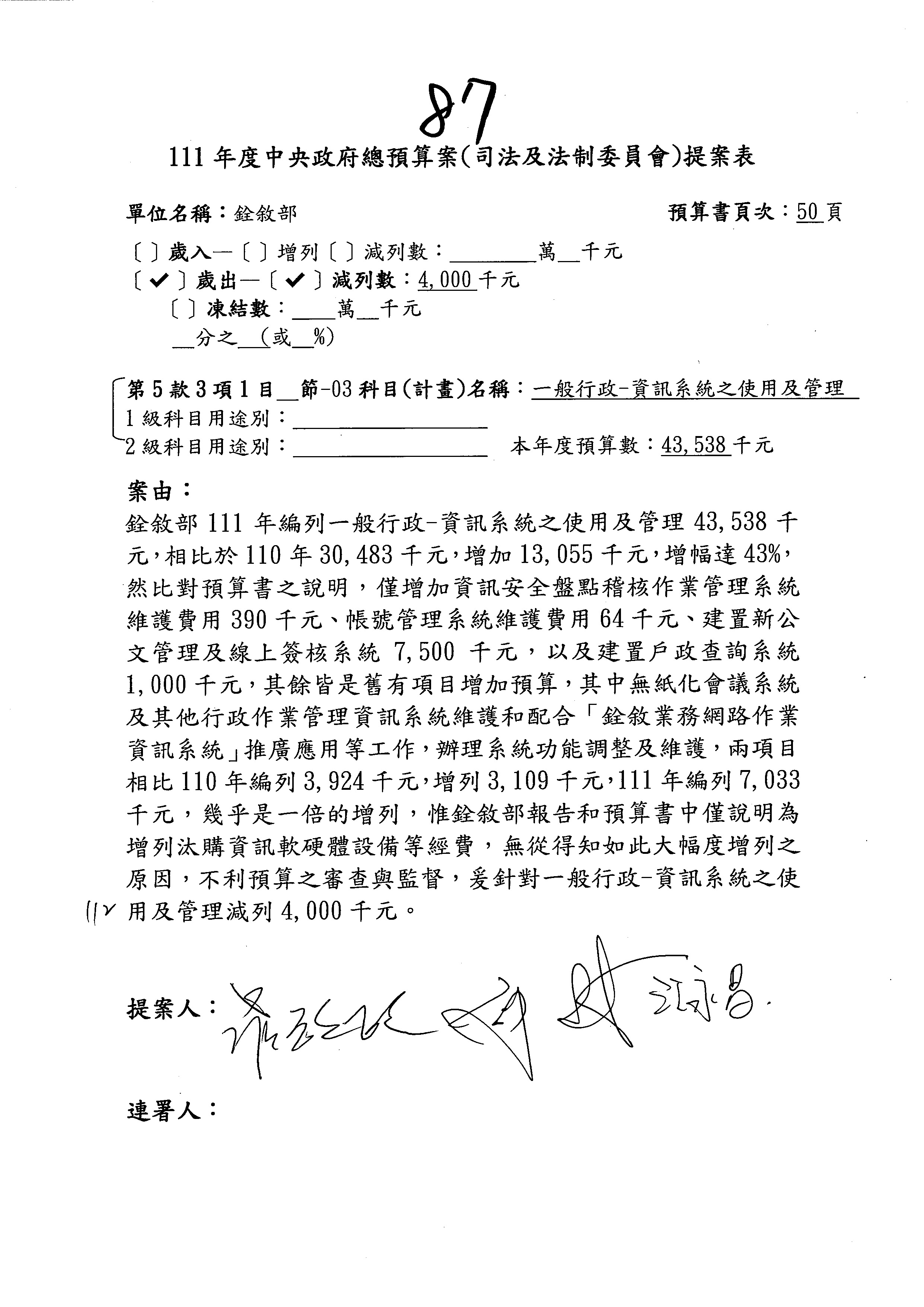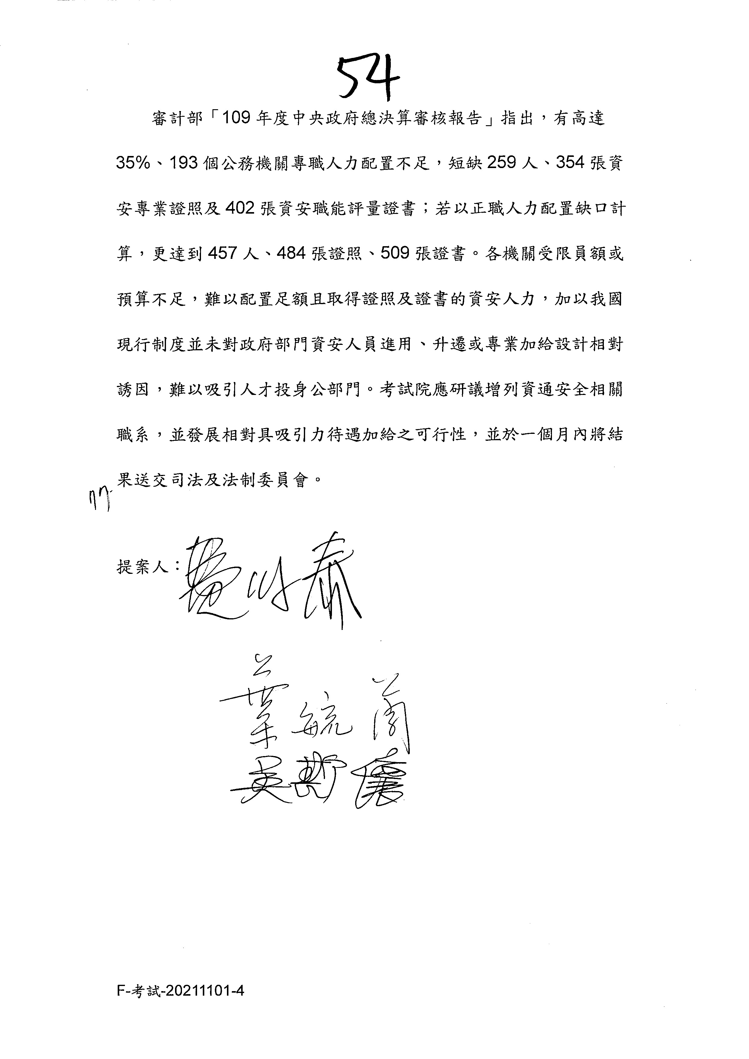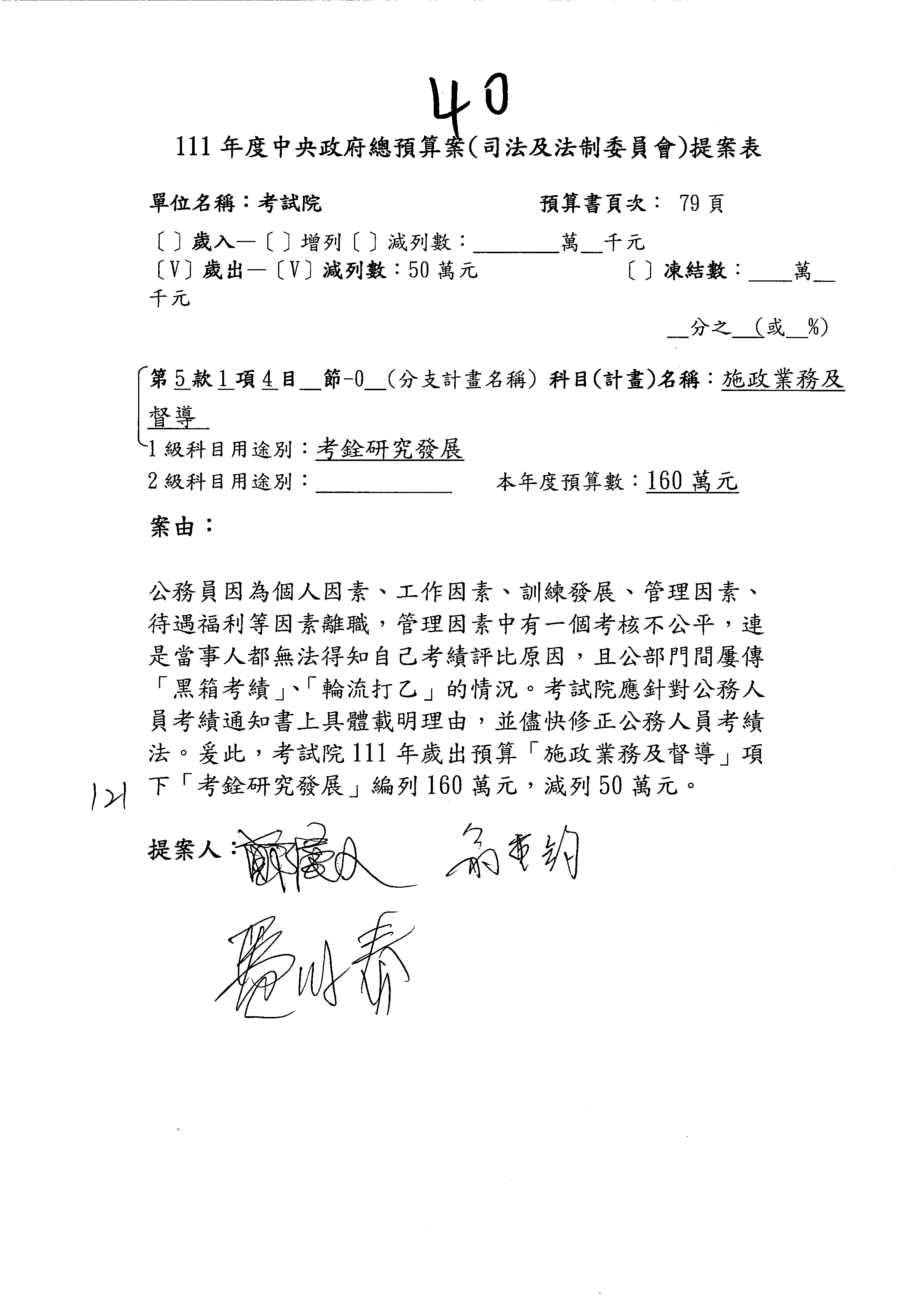 至於考試院111年度的預算方面,我們歲入編列了2,556萬元,跟今年大致相當;歲出的部分,3億4,164萬元,比今年度減列451萬4,000元,主要差別就是現任人員的年終獎金跟部分員額出缺不補的人事費減列,合計有1,035萬元。此外,為了強化資訊安全維護跟推動電子化證書的發放,我們增列了資訊業務440萬元,這邊要特別說明的是,之所以在預算規模縮減之下能夠持續增列資訊預算,主要是因為考試院過去多年來的歲出規模有限,但在近兩年來因為受惠於組織法的修正,才能夠降低人事費的支出,轉而將這些資源投資在數位轉型跟提升資通安全的業務上,這個部分有得到立法院預算中心的支持,也懇請各位委員支持。以上說明,也請參考書面報告跟預算書,謝謝。
