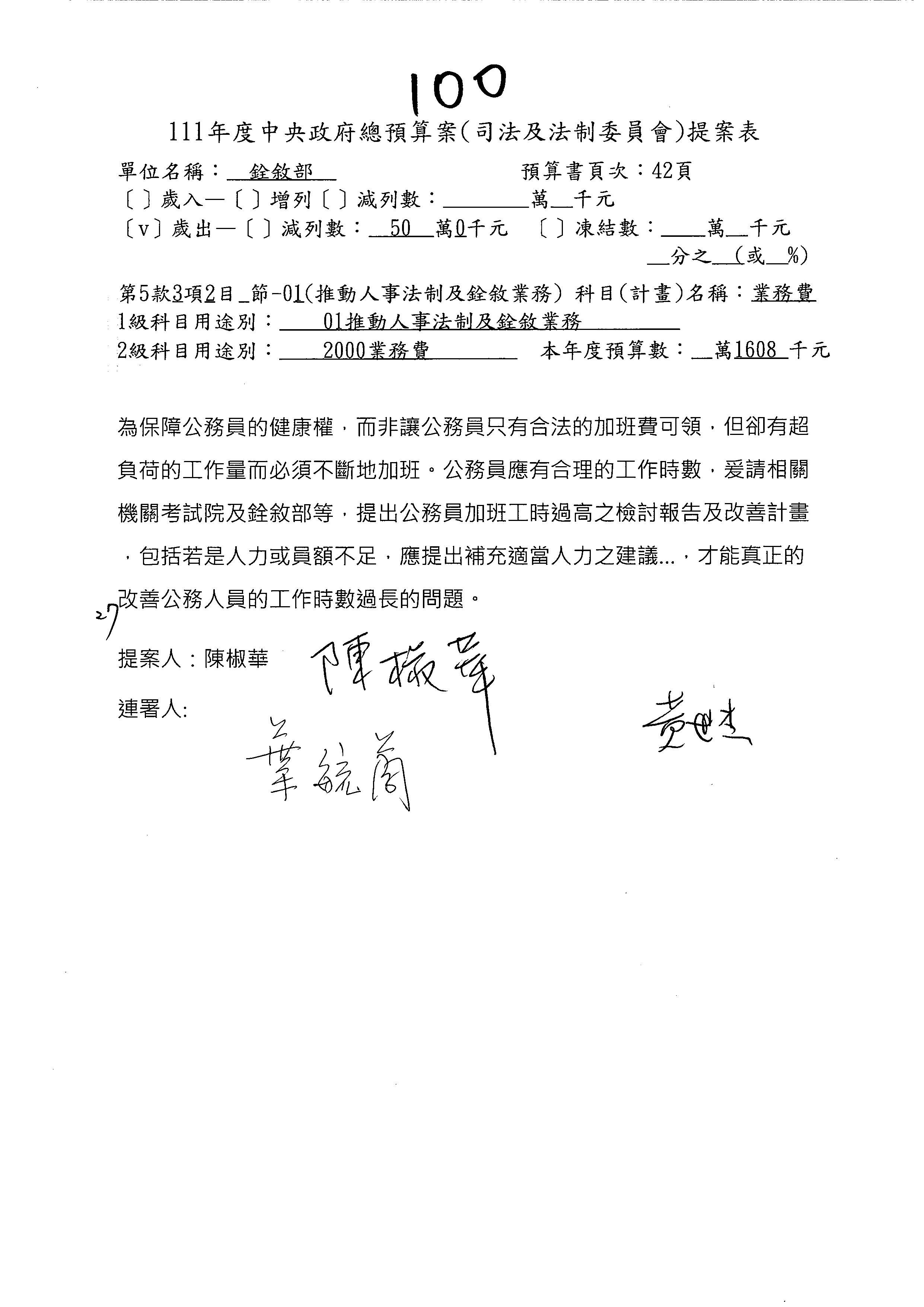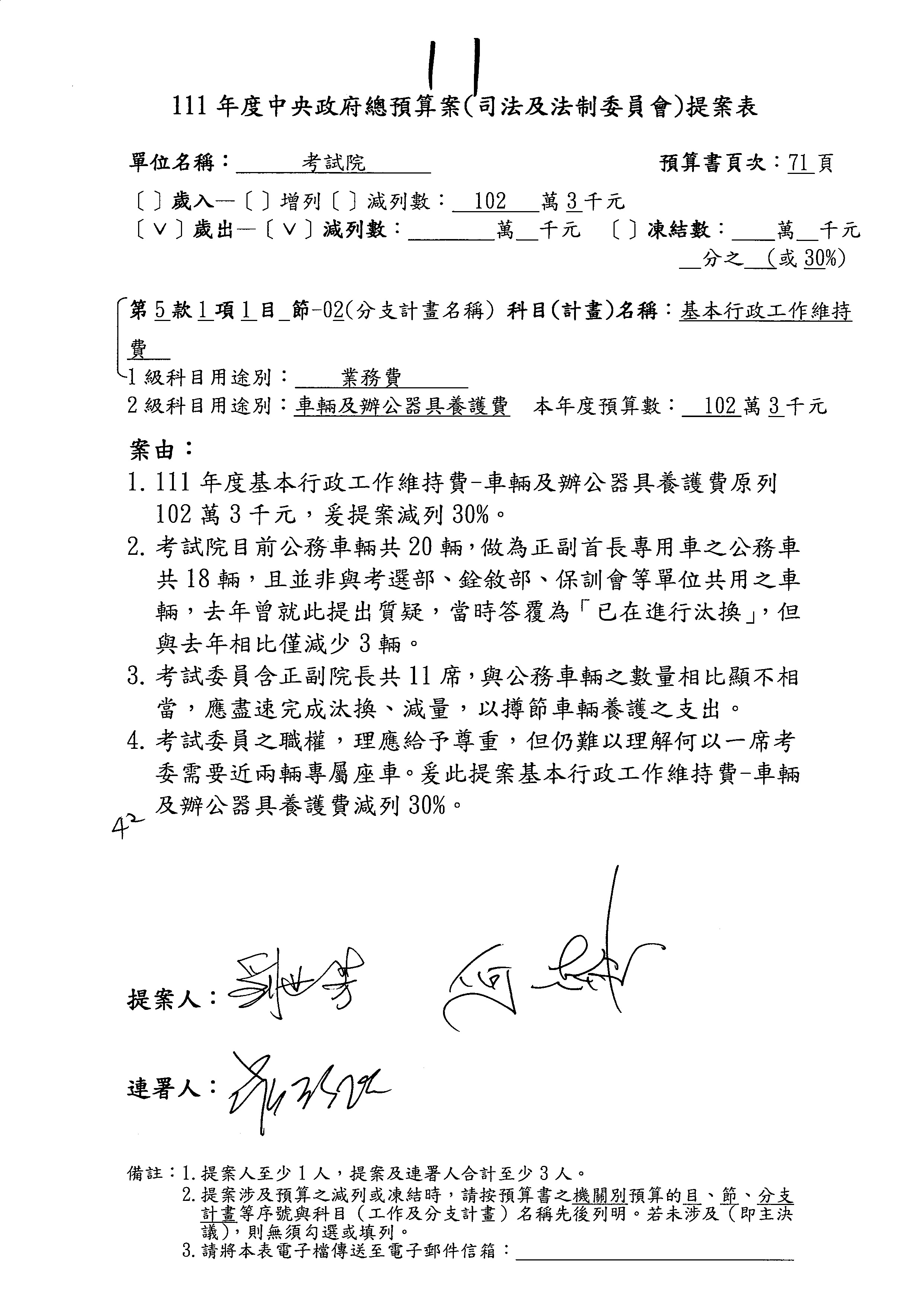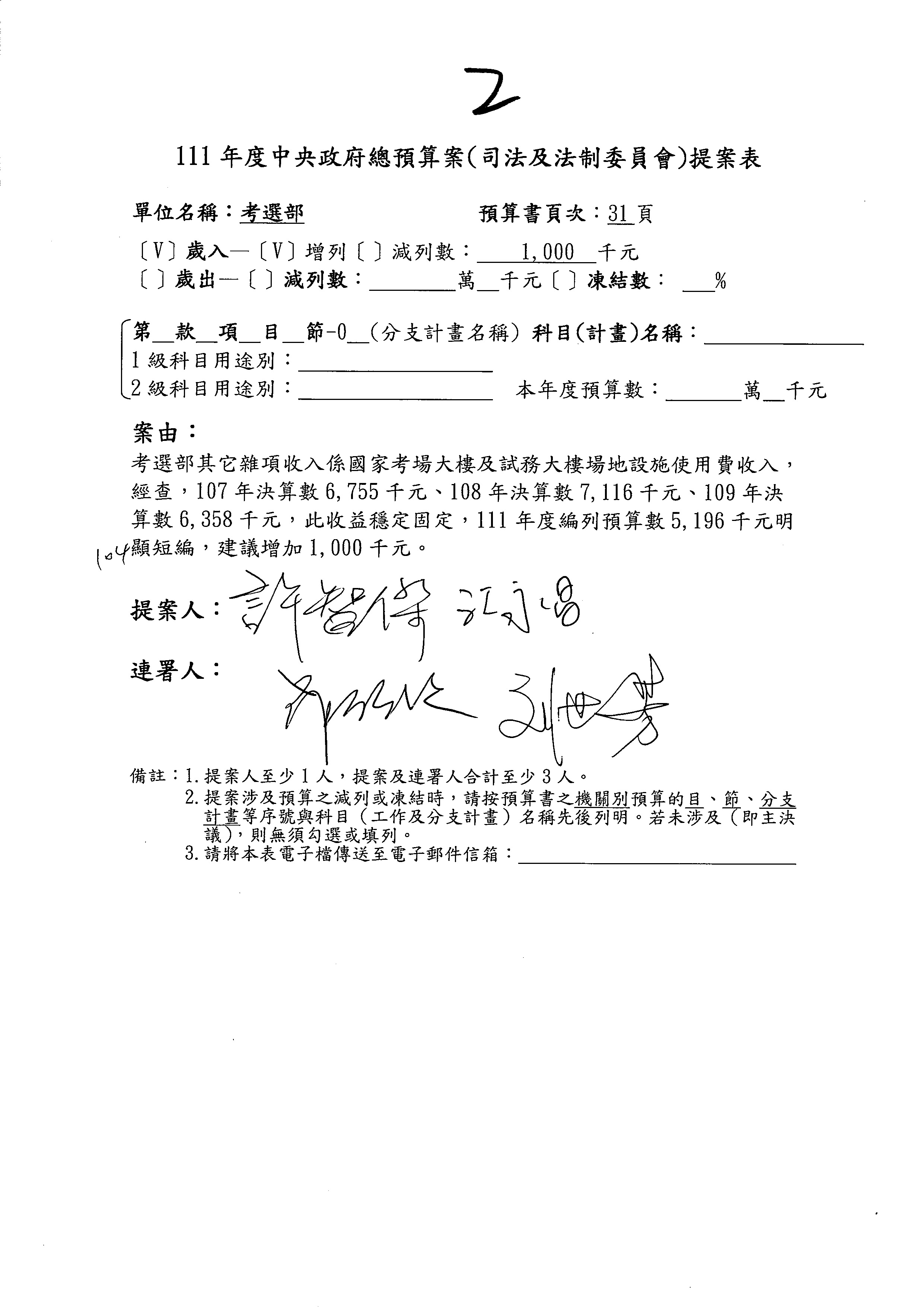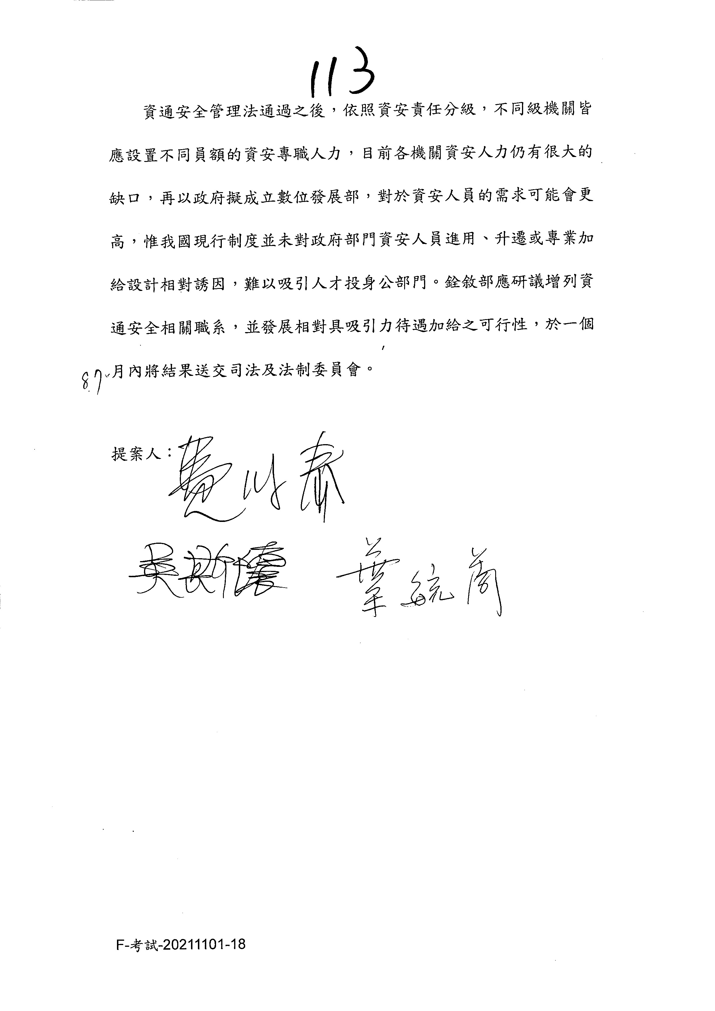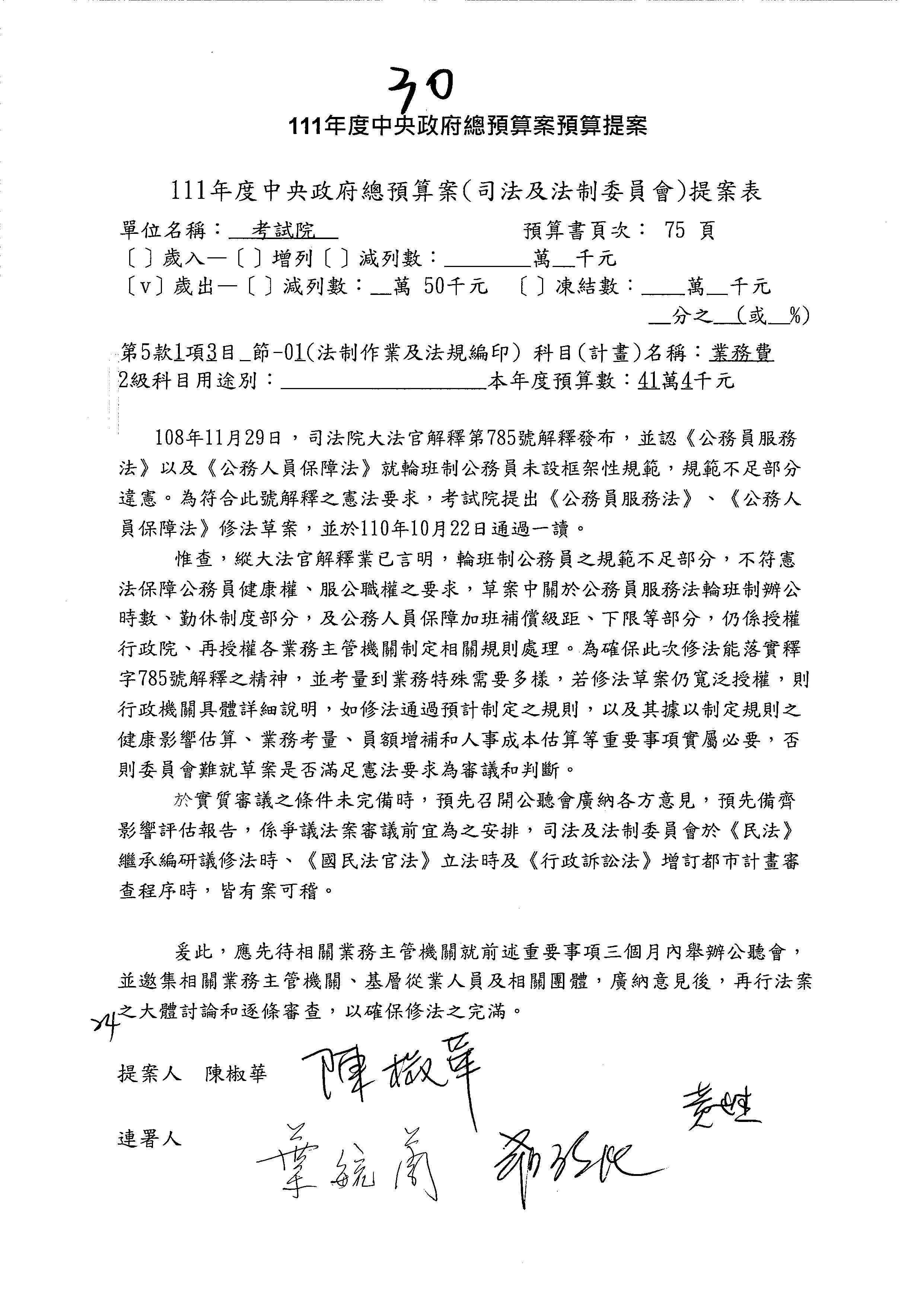 至於考試院111年度的預算方面,我們歲入編列了2,556萬元,跟今年大致相當;歲出的部分,3億4,164萬元,比今年度減列451萬4,000元,主要差別就是現任人員的年終獎金跟部分員額出缺不補的人事費減列,合計有1,035萬元。此外,為了強化資訊安全維護跟推動電子化證書的發放,我們增列了資訊業務440萬元,這邊要特別說明的是,之所以在預算規模縮減之下能夠持續增列資訊預算,主要是因為考試院過去多年來的歲出規模有限,但在近兩年來因為受惠於組織法的修正,才能夠降低人事費的支出,轉而將這些資源投資在數位轉型跟提升資通安全的業務上,這個部分有得到立法院預算中心的支持,也懇請各位委員支持。以上說明,也請參考書面報告跟預算書,謝謝。