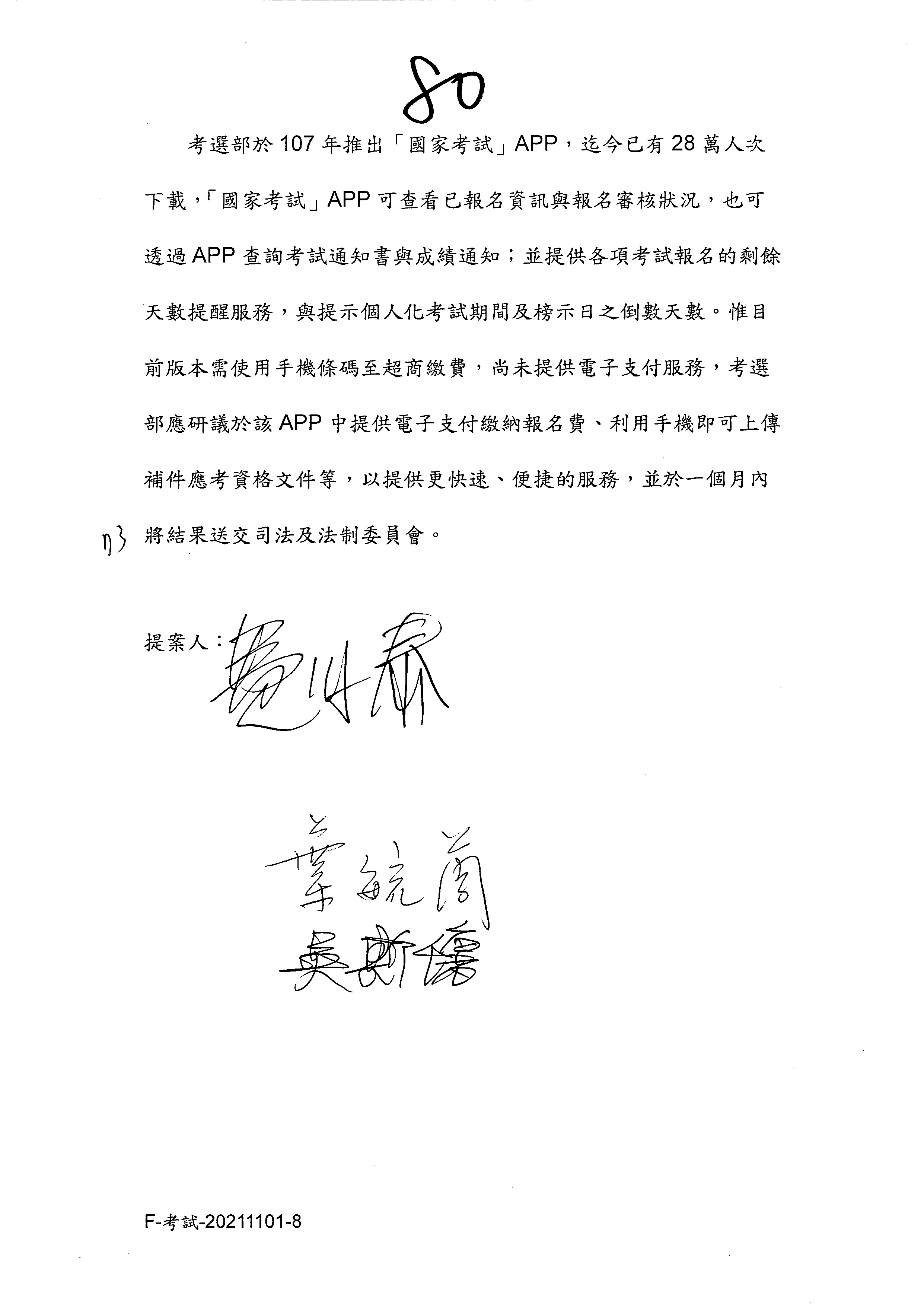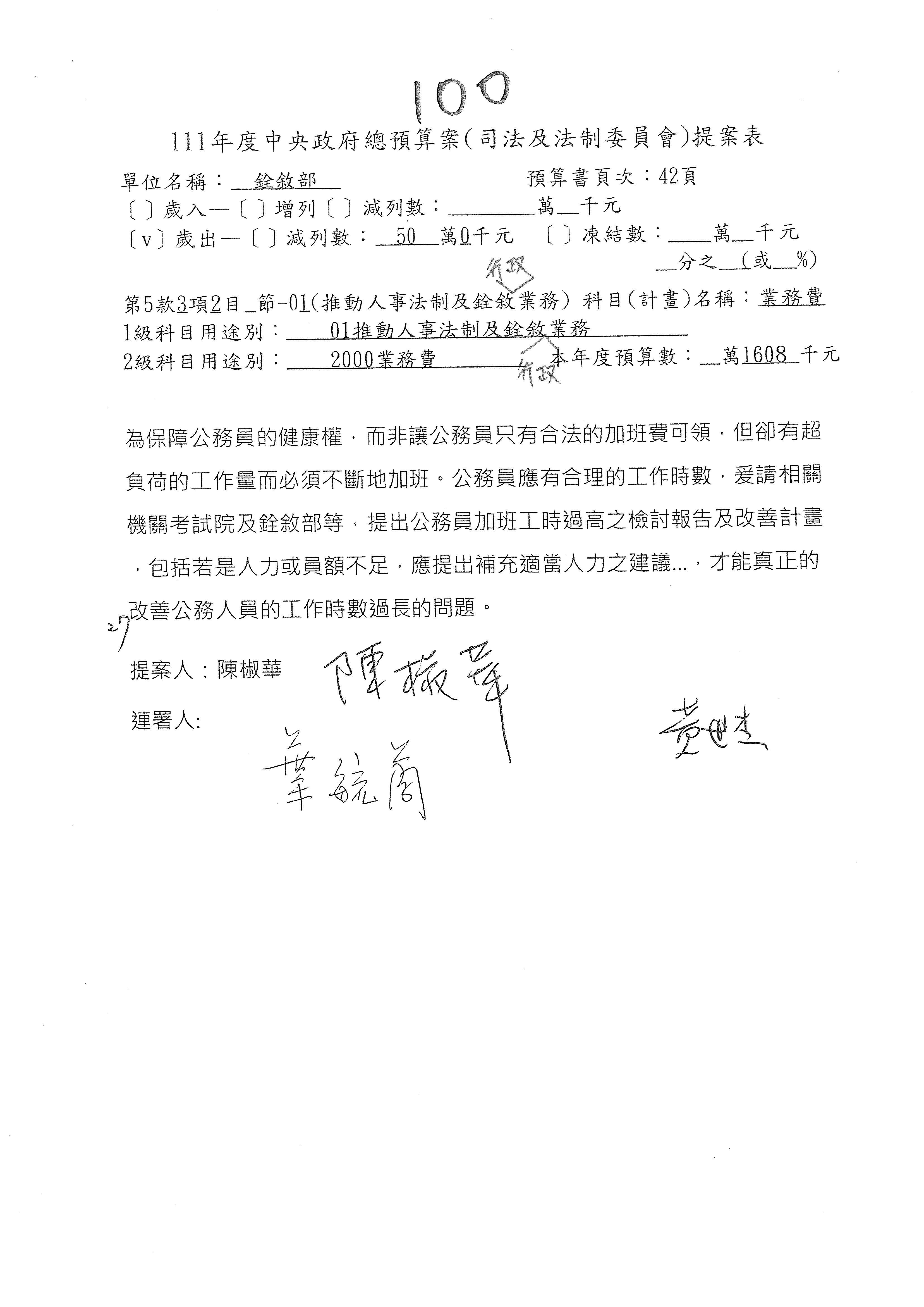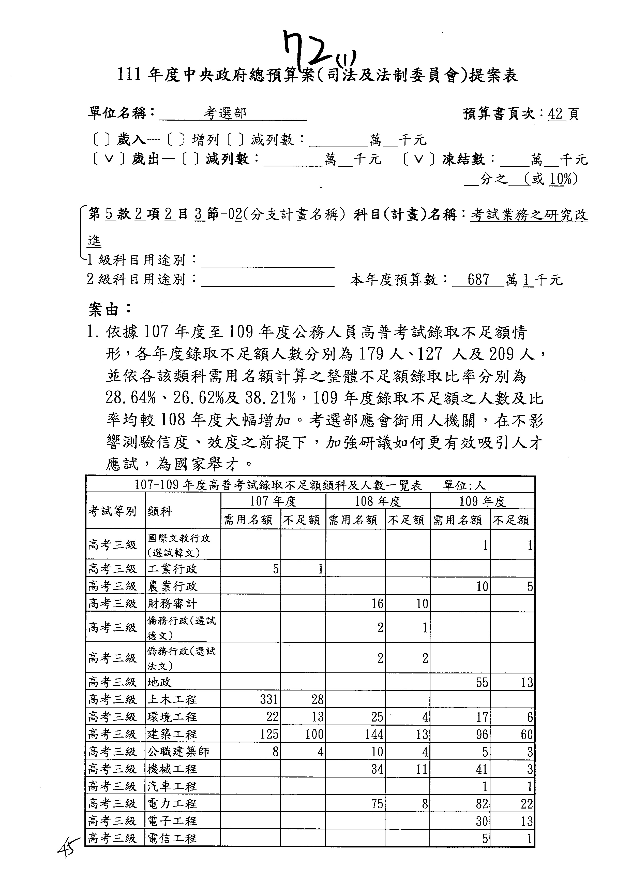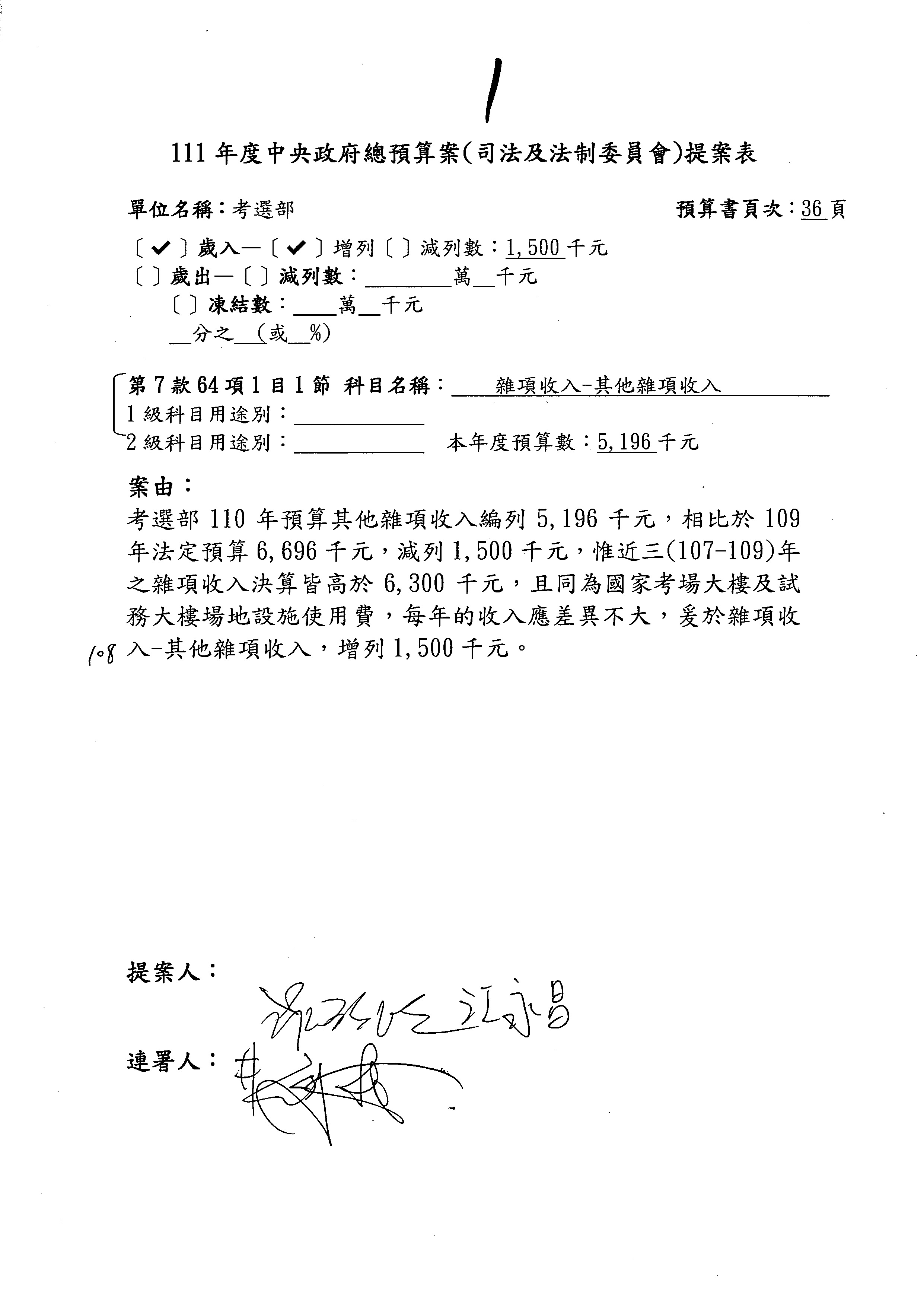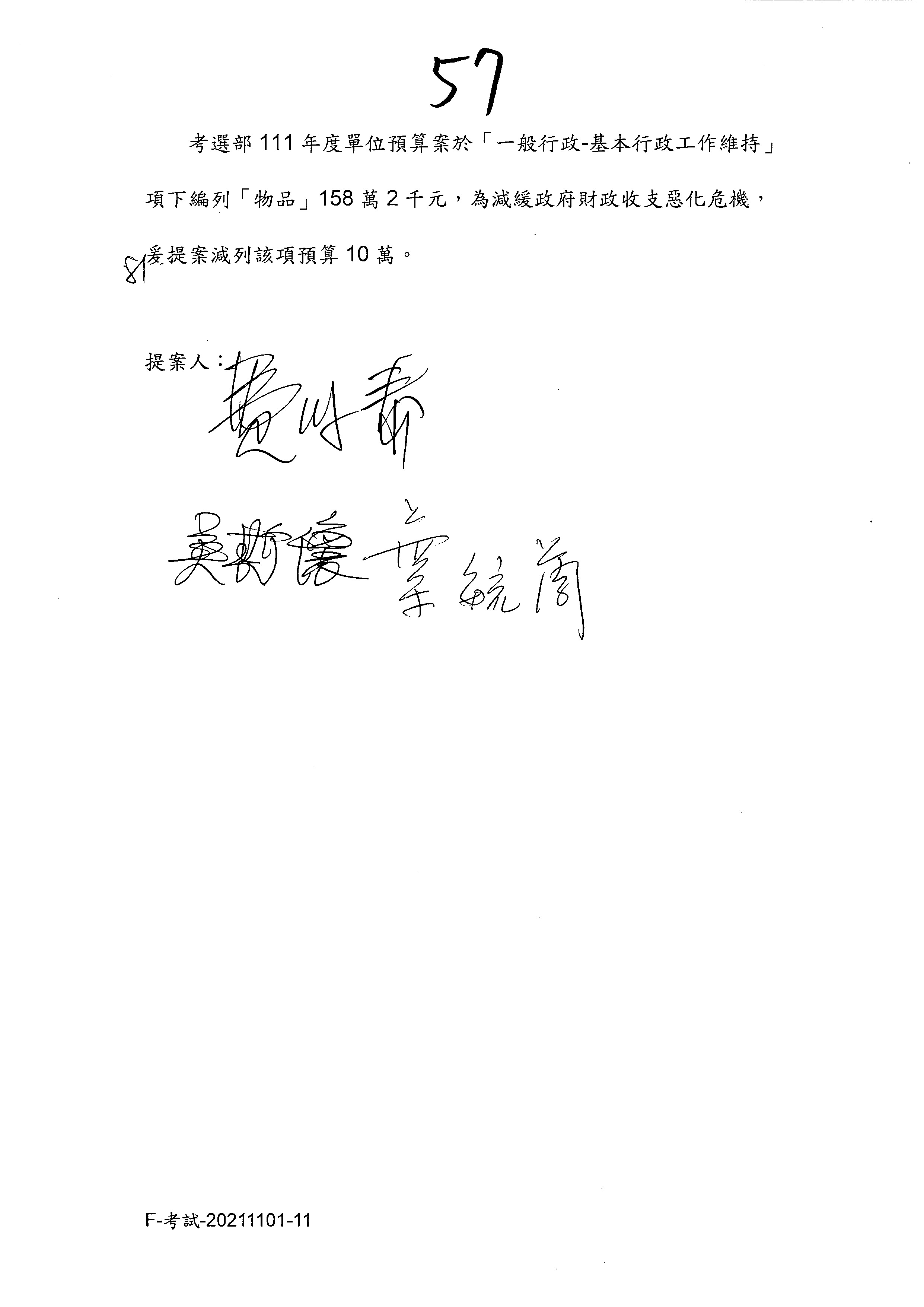 至於考試院111年度的預算方面,我們歲入編列了2,556萬元,跟今年大致相當;歲出的部分,3億4,164萬元,比今年度減列451萬4,000元,主要差別就是現任人員的年終獎金跟部分員額出缺不補的人事費減列,合計有1,035萬元。此外,為了強化資訊安全維護跟推動電子化證書的發放,我們增列了資訊業務440萬元,這邊要特別說明的是,之所以在預算規模縮減之下能夠持續增列資訊預算,主要是因為考試院過去多年來的歲出規模有限,但在近兩年來因為受惠於組織法的修正,才能夠降低人事費的支出,轉而將這些資源投資在數位轉型跟提升資通安全的業務上,這個部分有得到立法院預算中心的支持,也懇請各位委員支持。以上說明,也請參考書面報告跟預算書,謝謝。
