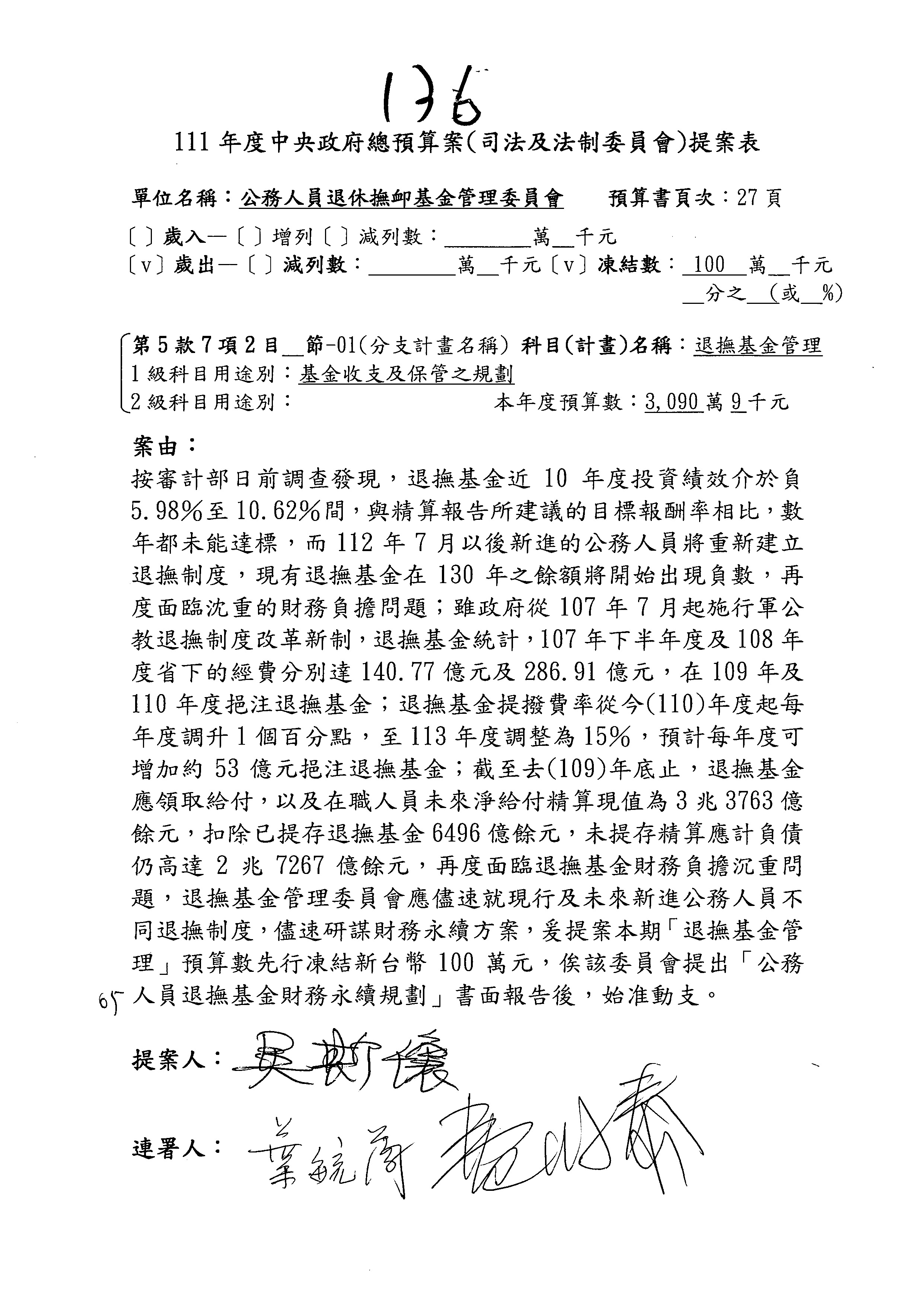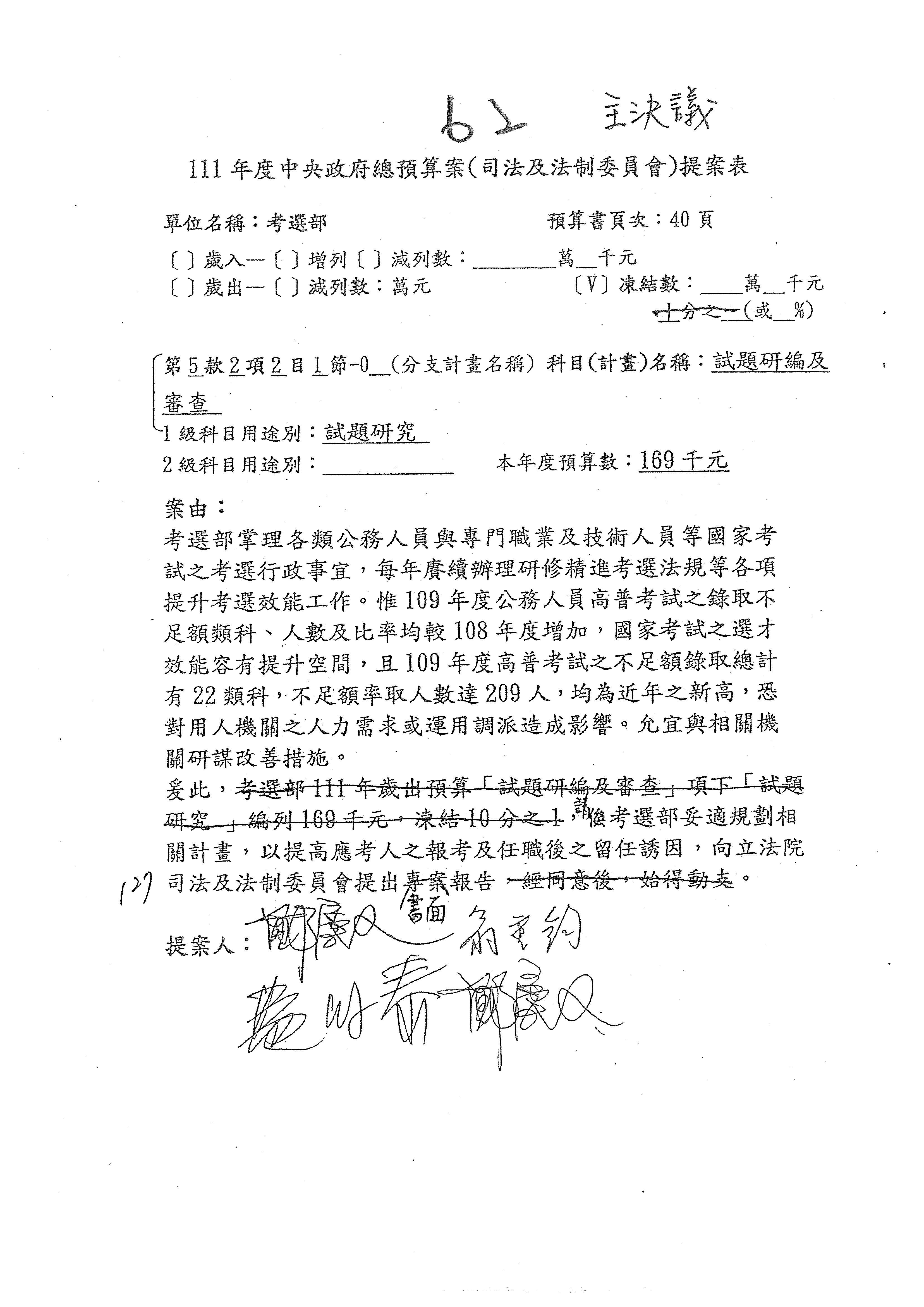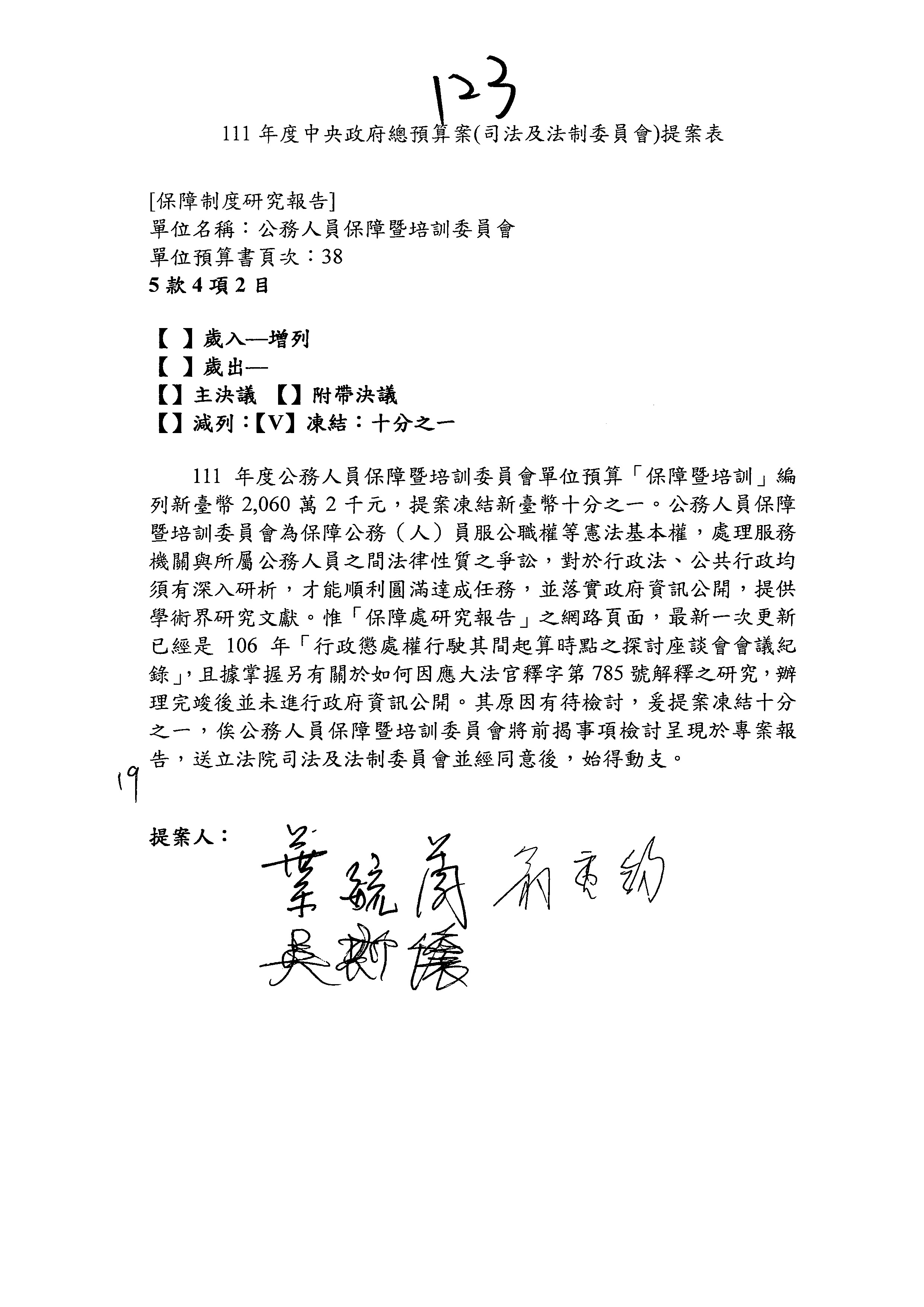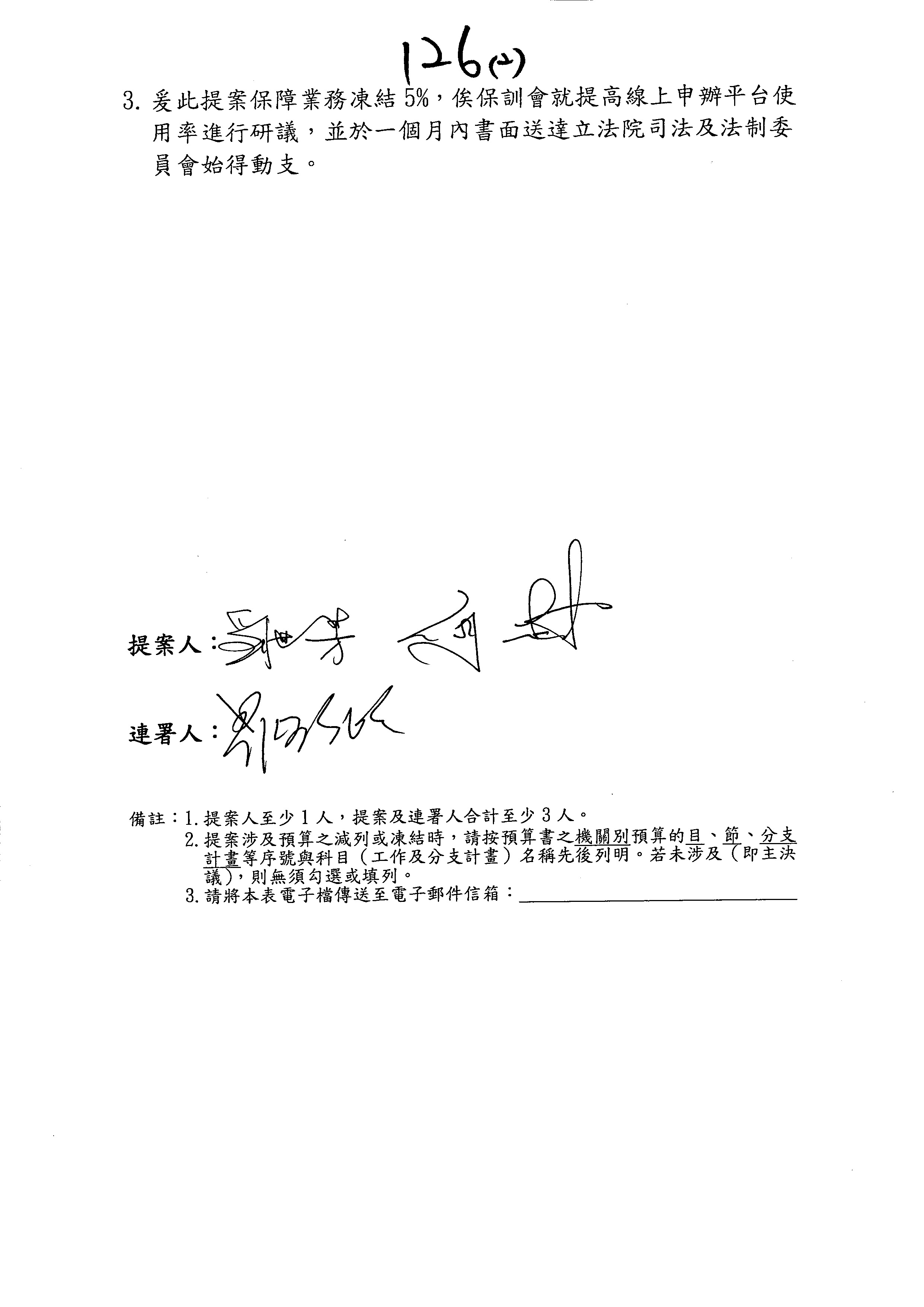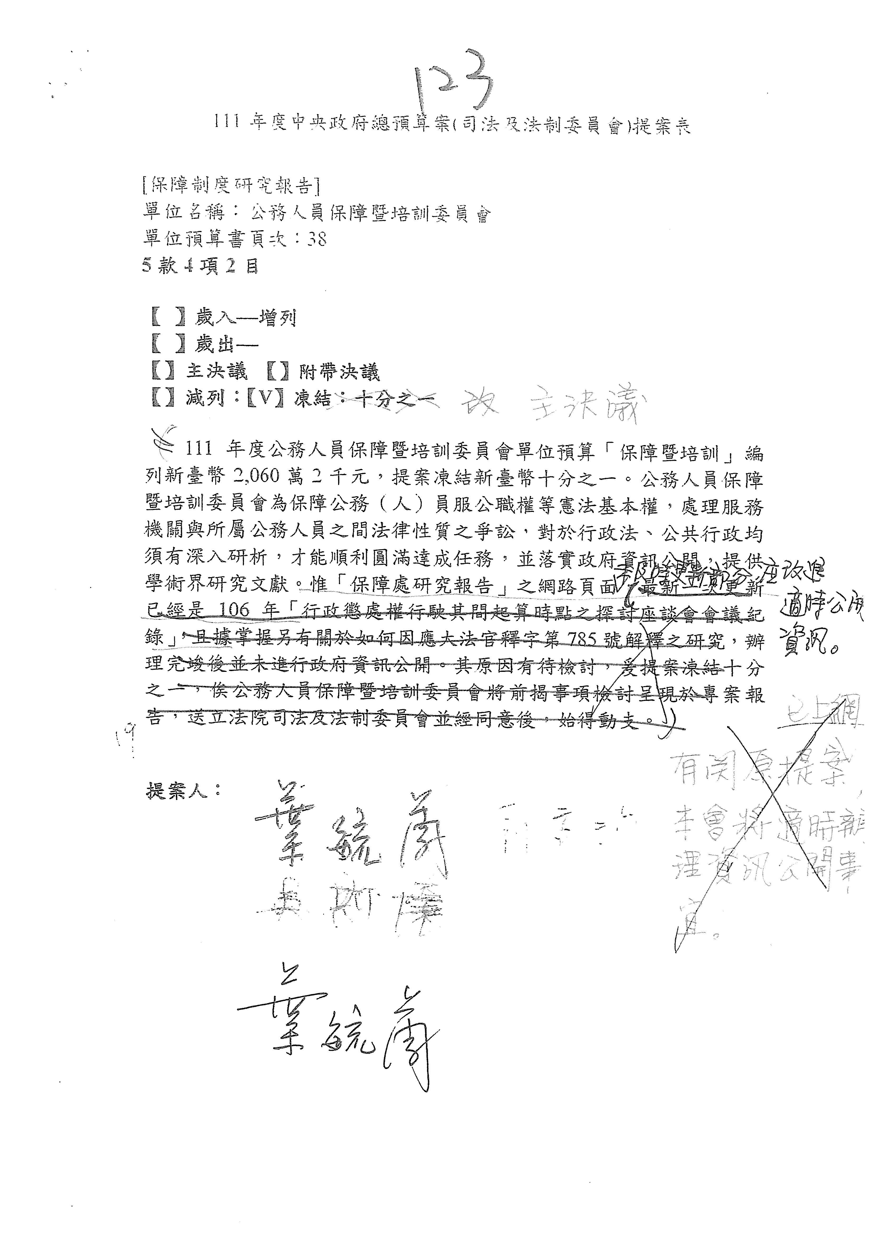 郝主任委員培芝:因為這個案子已經送到立法院審議,我們也非常期待委員在法案上給我們直接的指導,委員是不是能接受我們凍結20萬元、提書面報告?