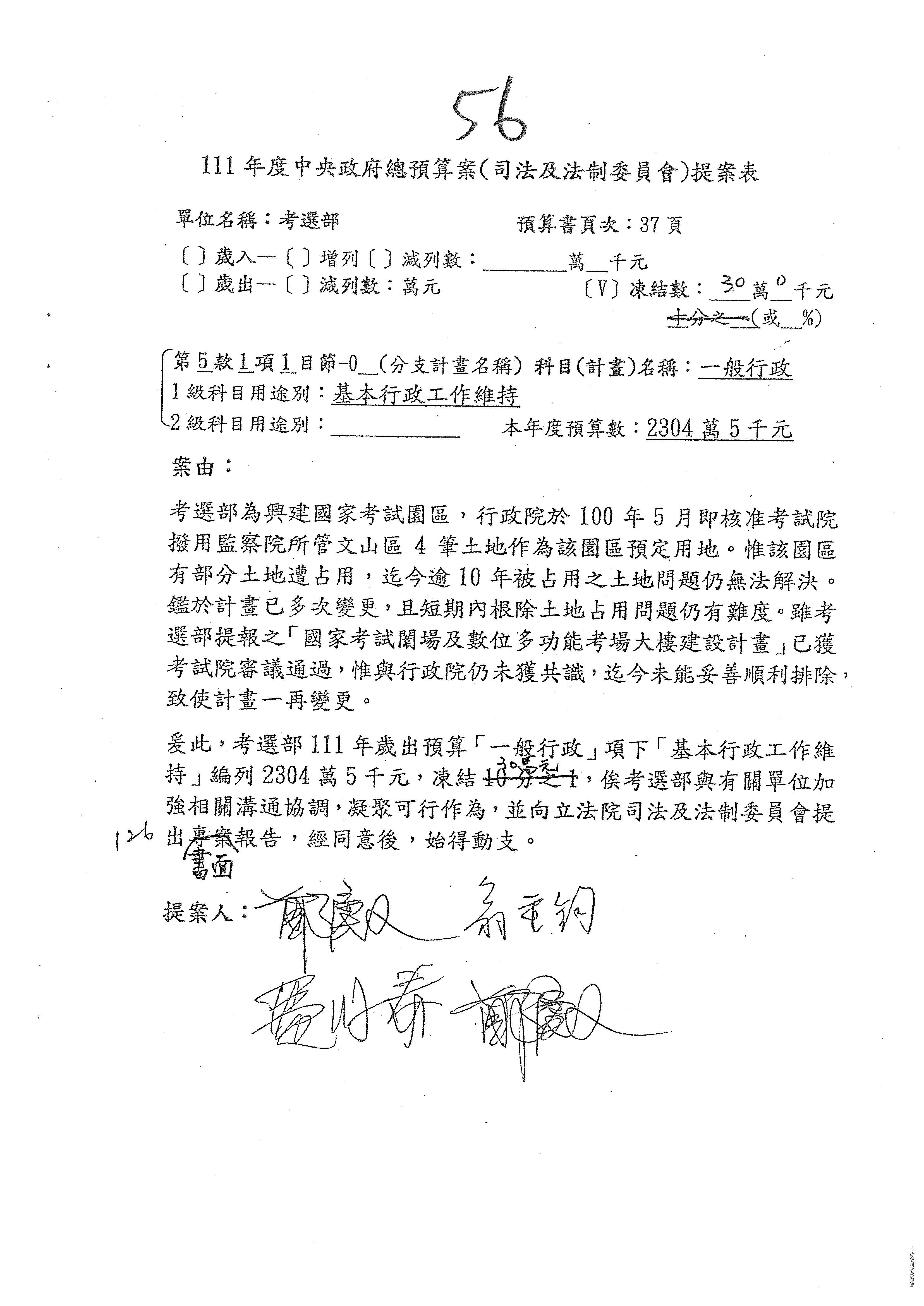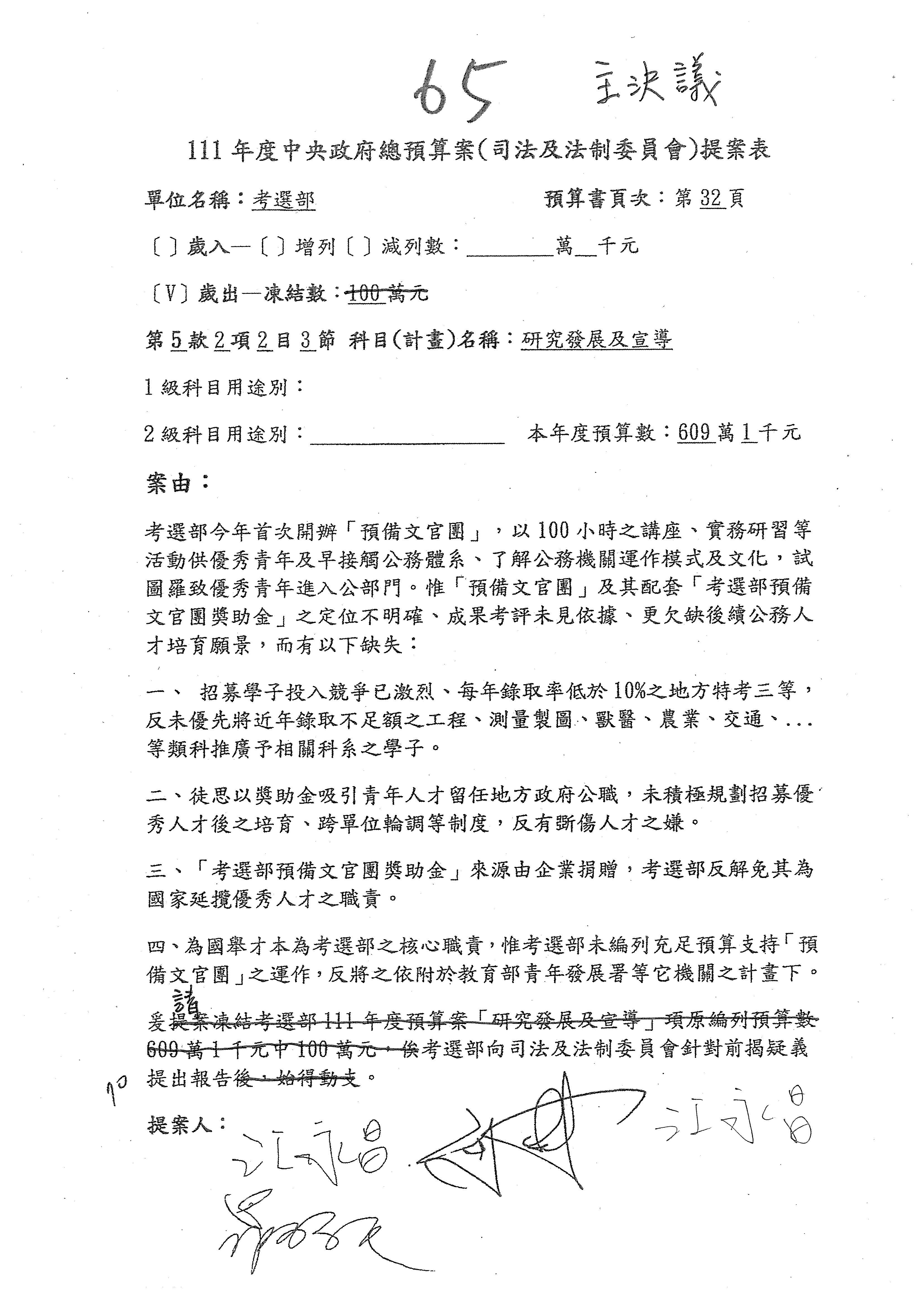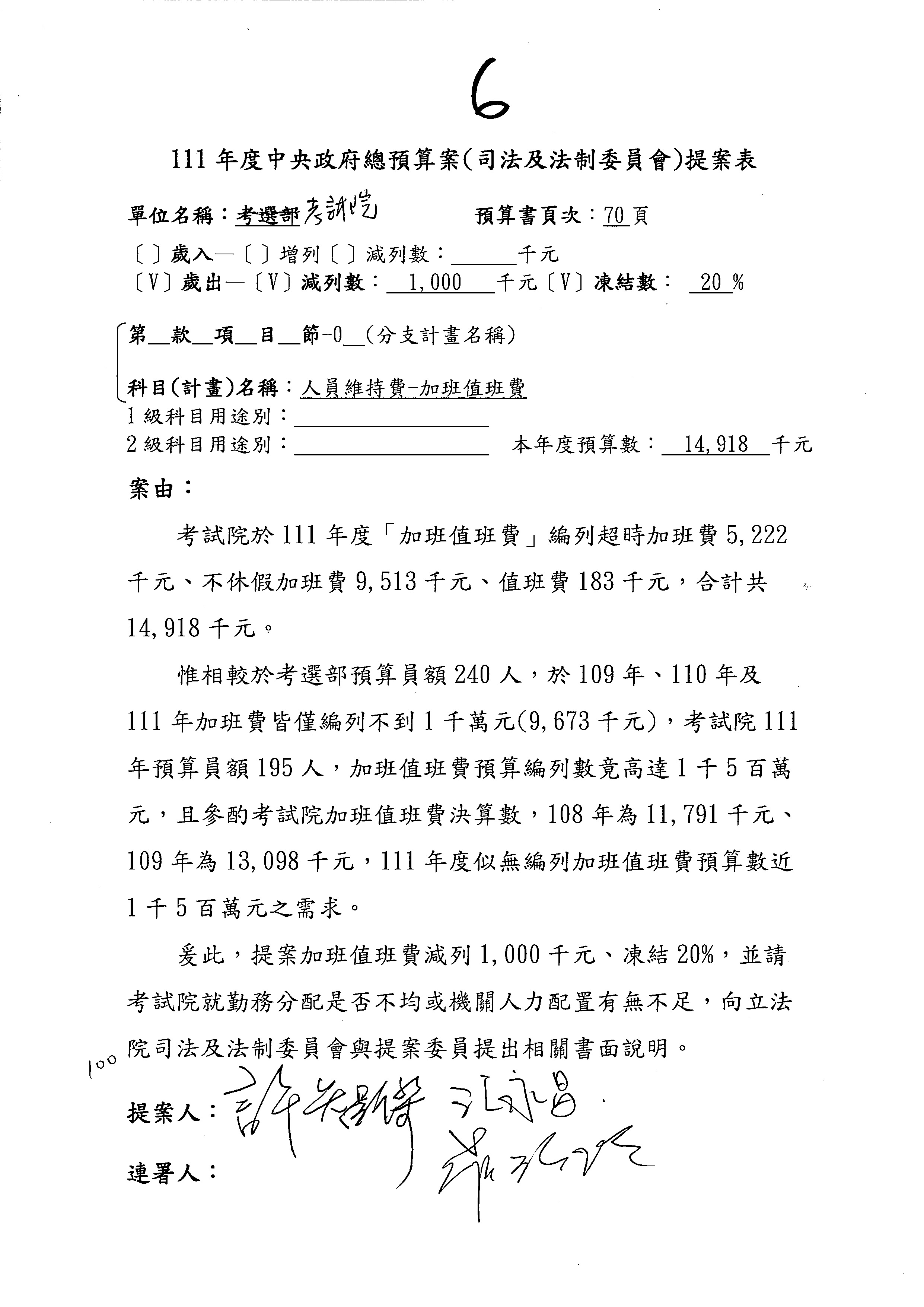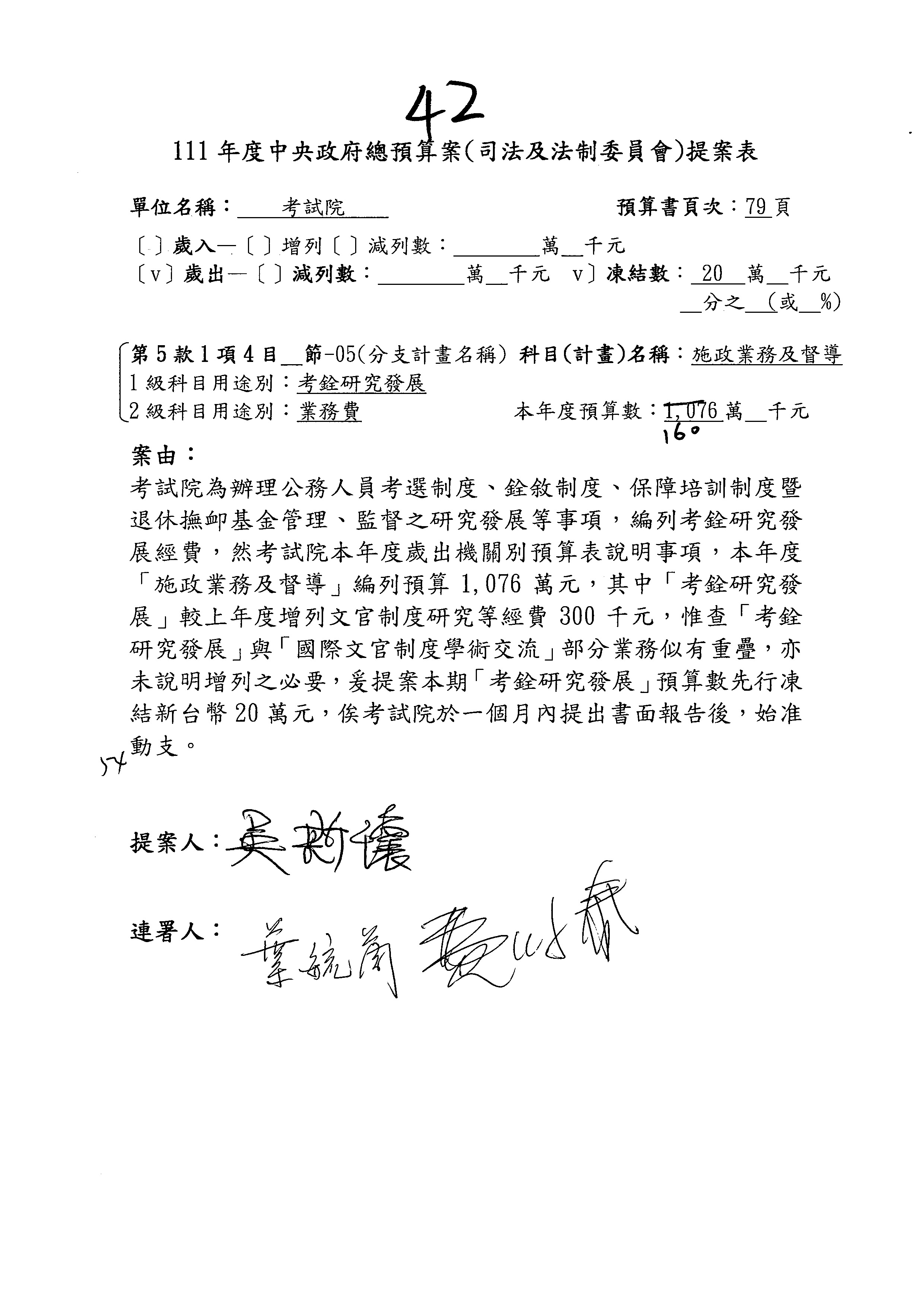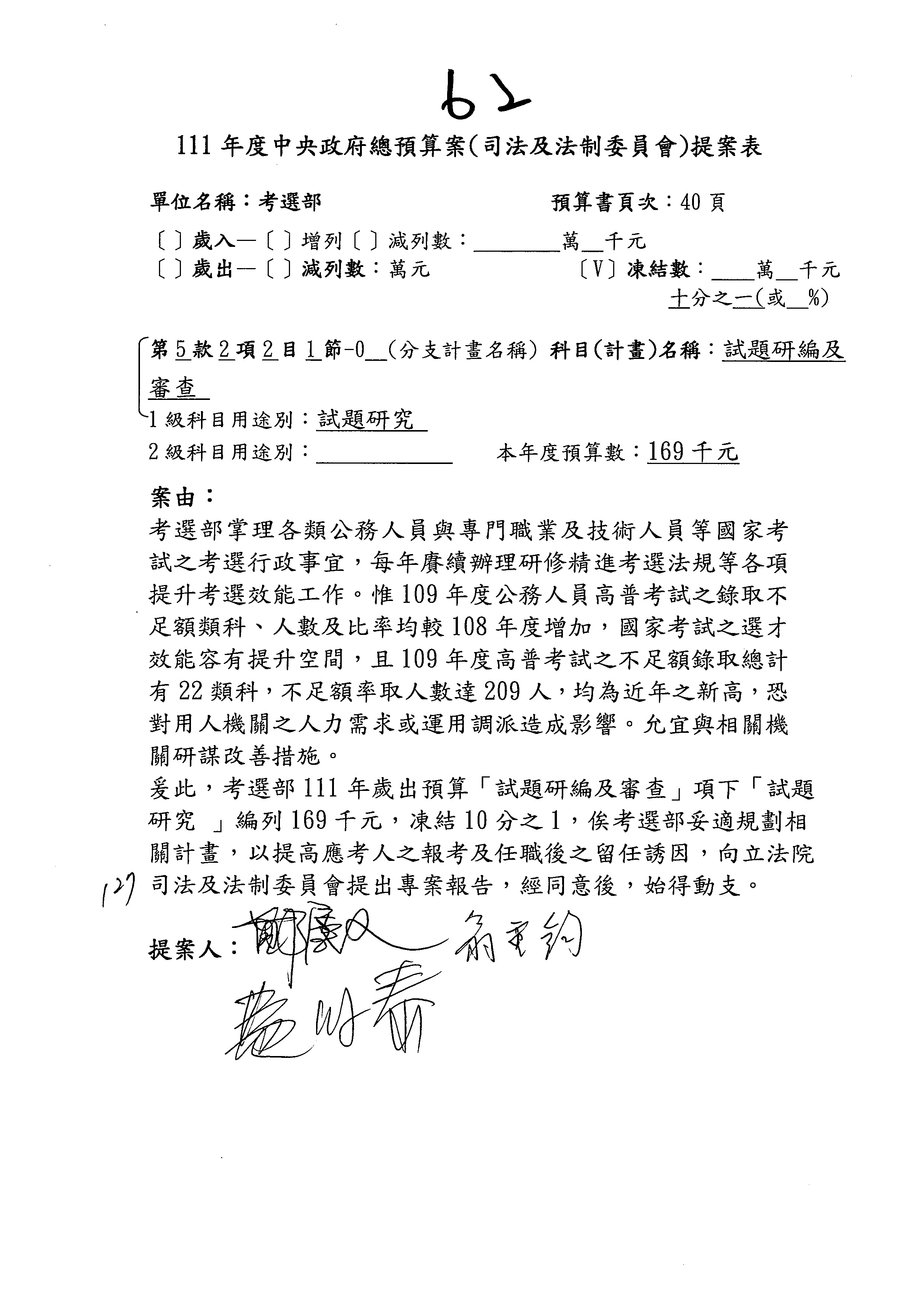 郝主任委員培芝:因為這個案子已經送到立法院審議,我們也非常期待委員在法案上給我們直接的指導,委員是不是能接受我們凍結20萬元、提書面報告?