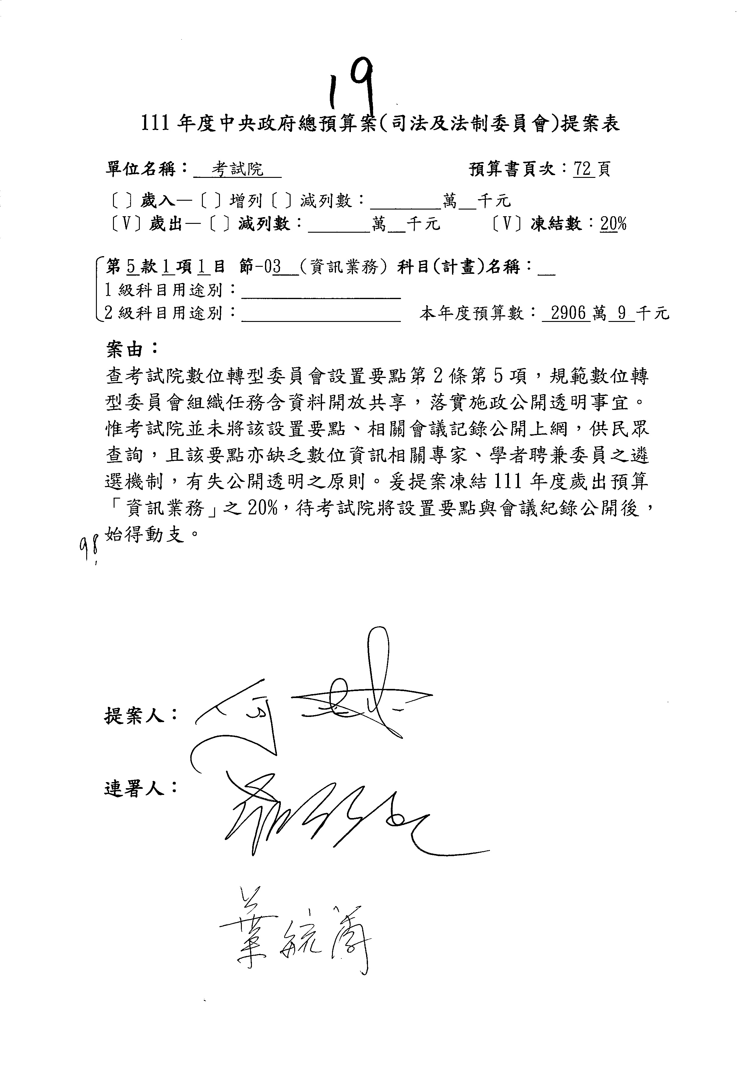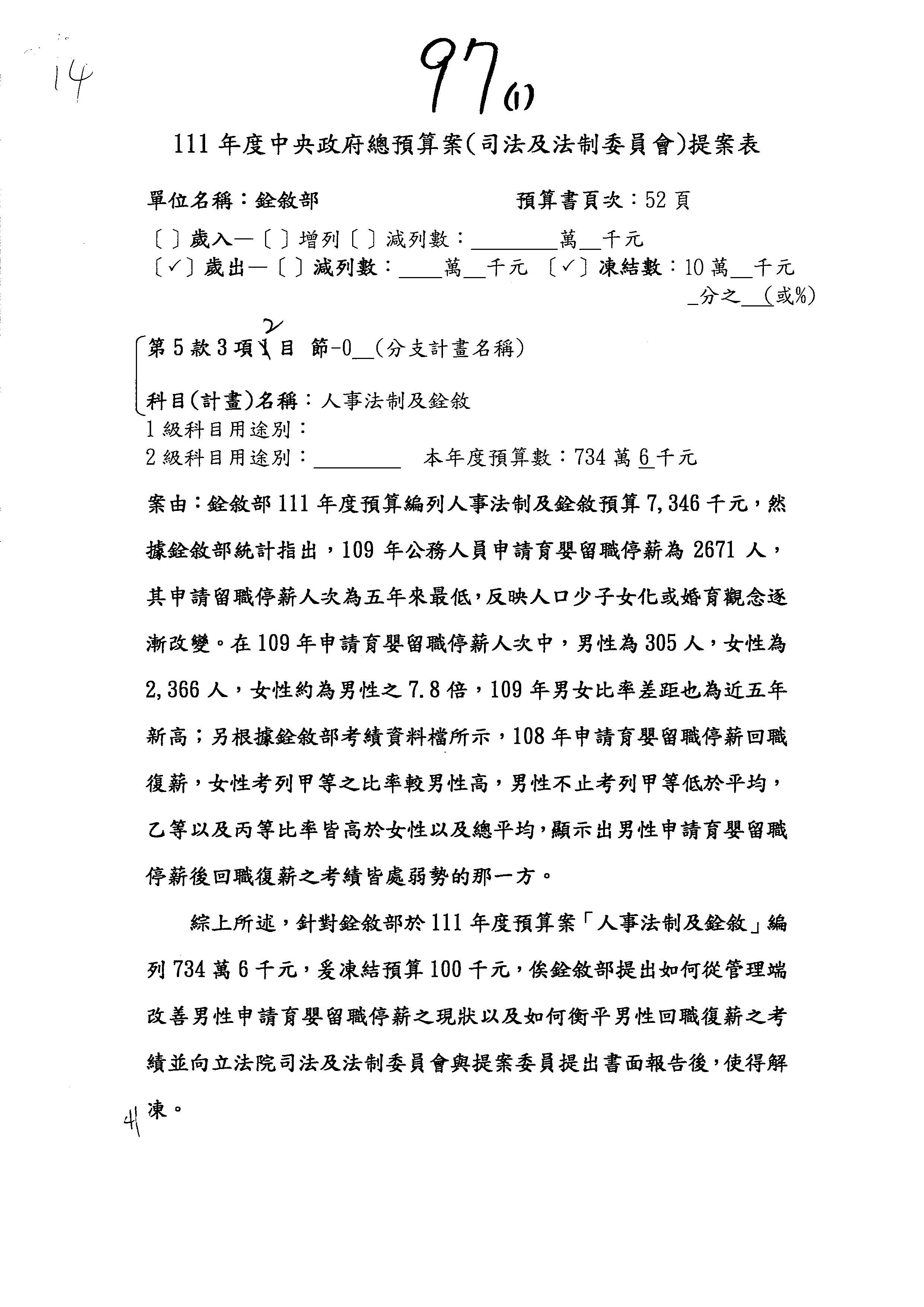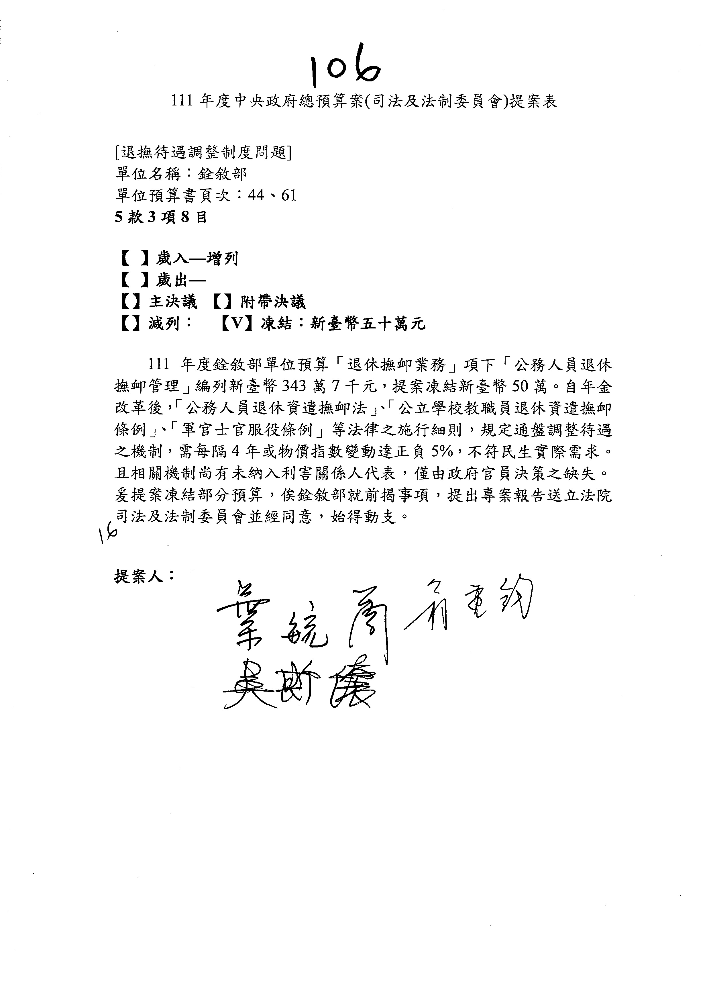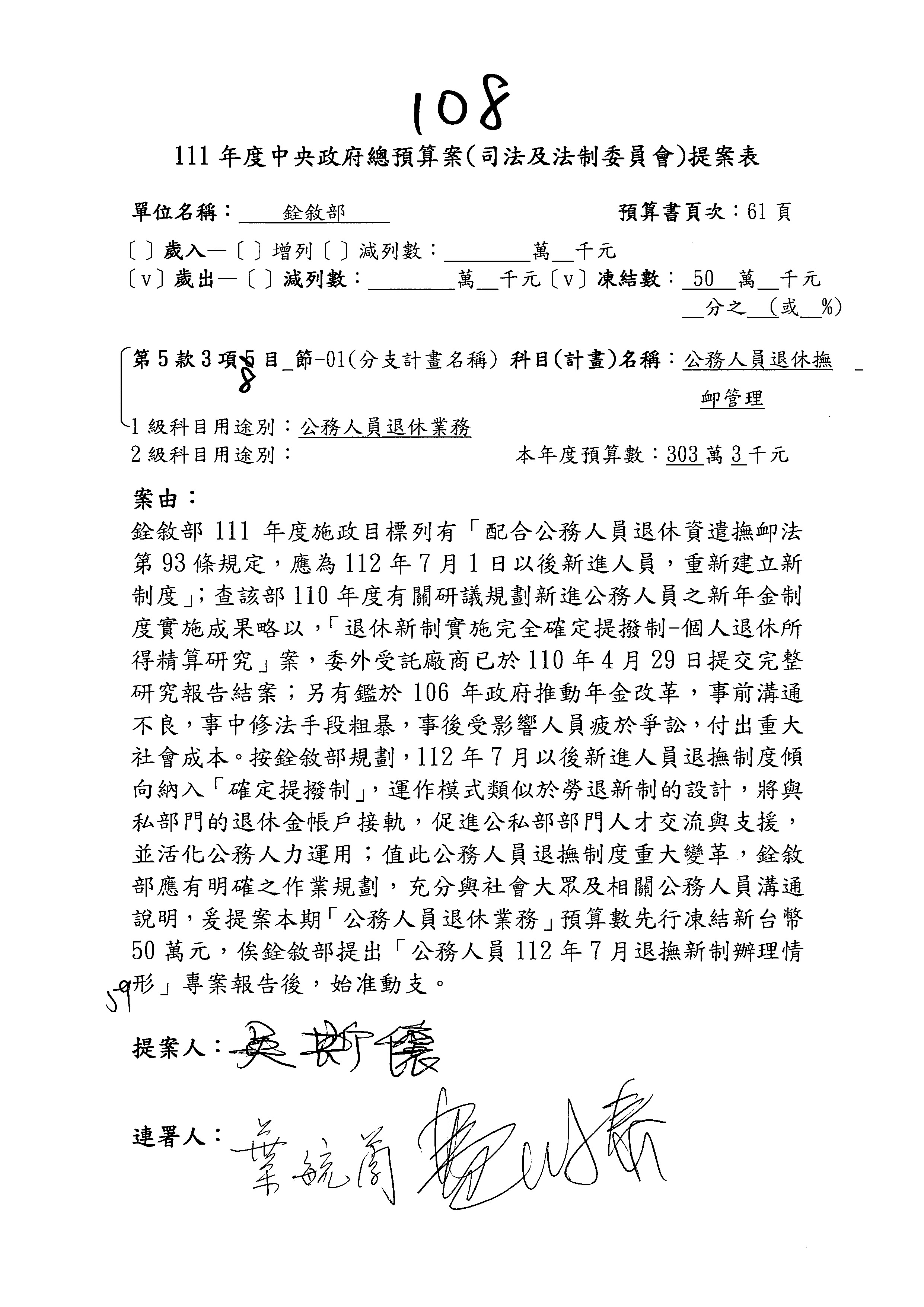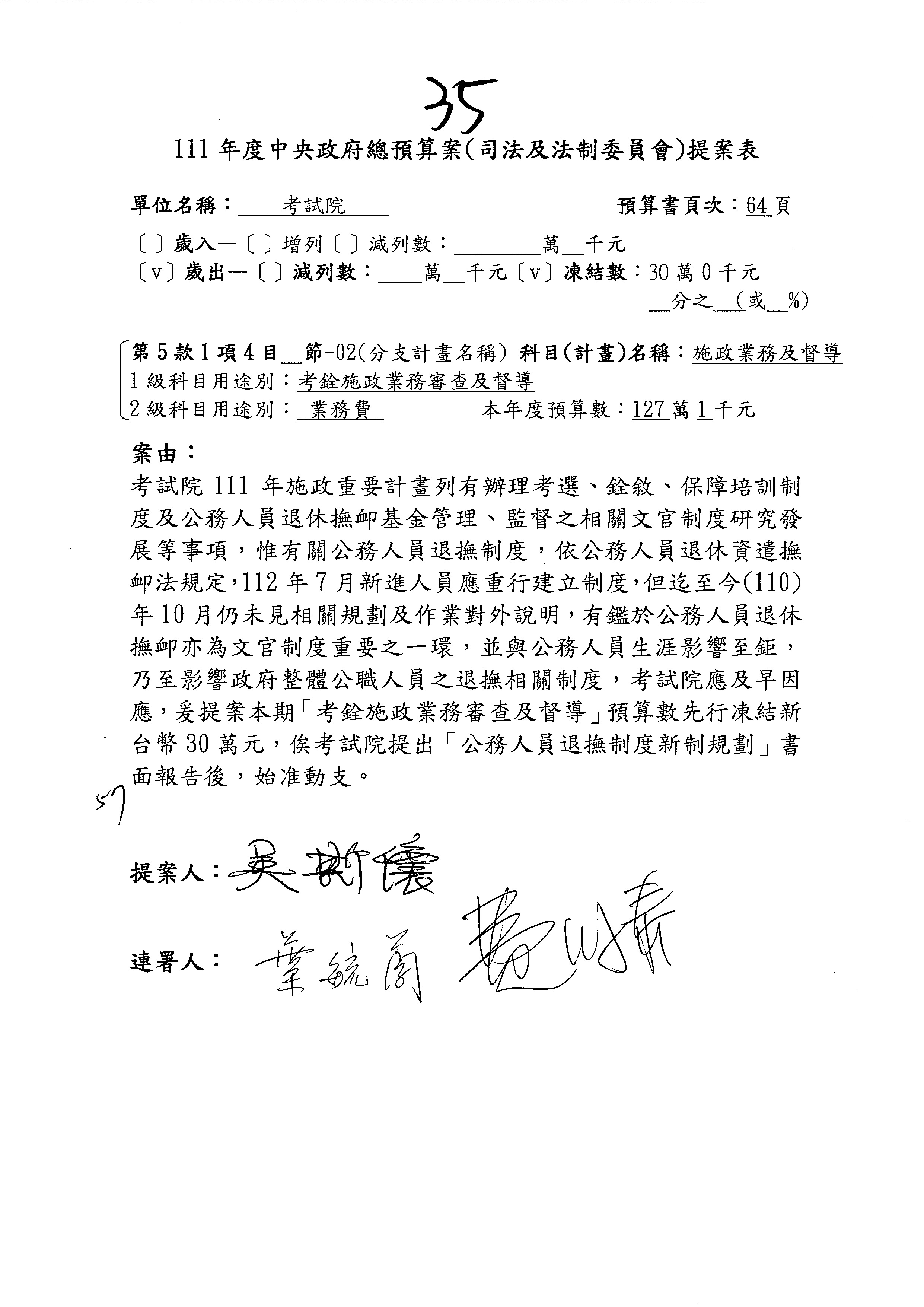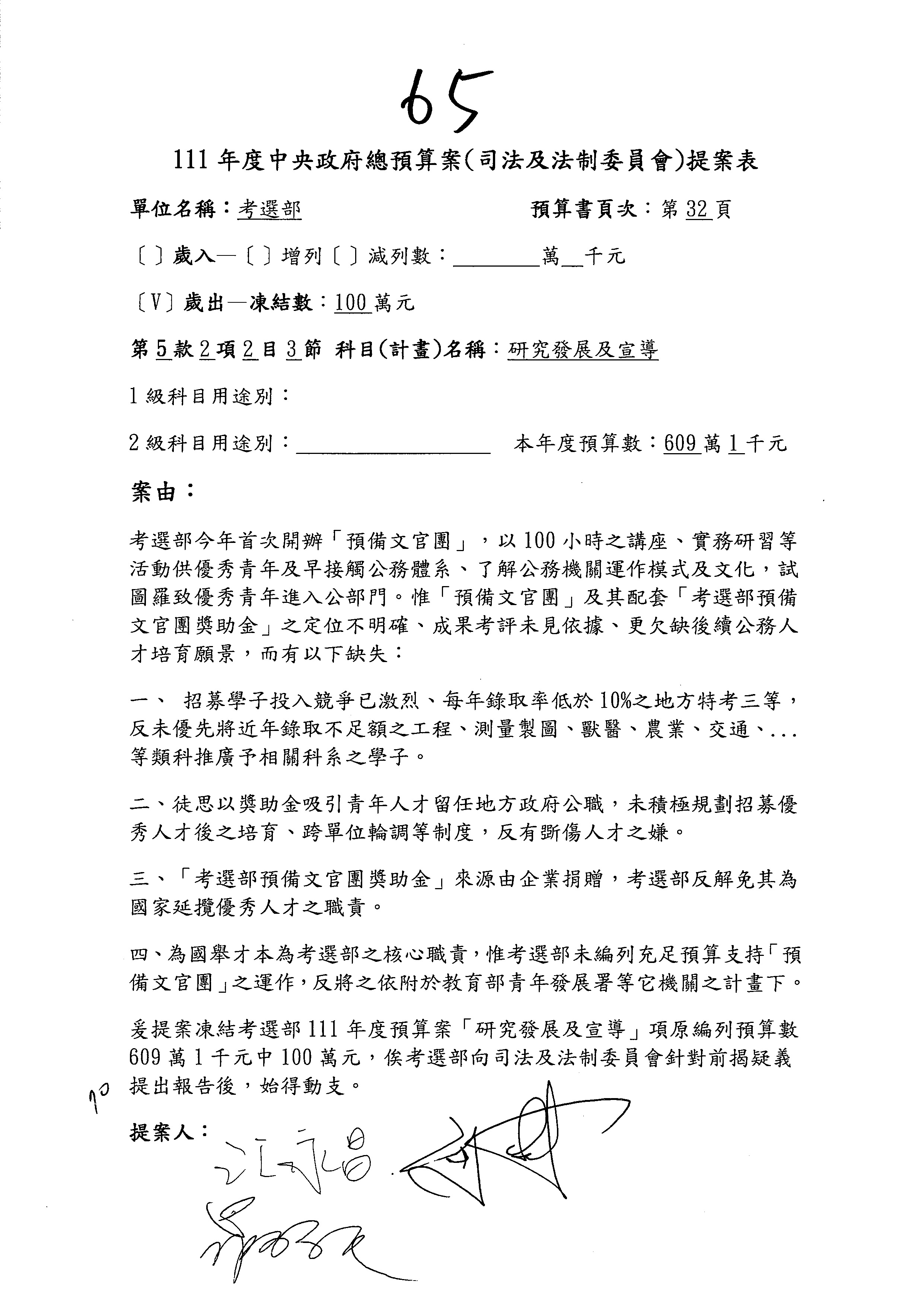 郝主任委員培芝:因為這個案子已經送到立法院審議,我們也非常期待委員在法案上給我們直接的指導,委員是不是能接受我們凍結20萬元、提書面報告?