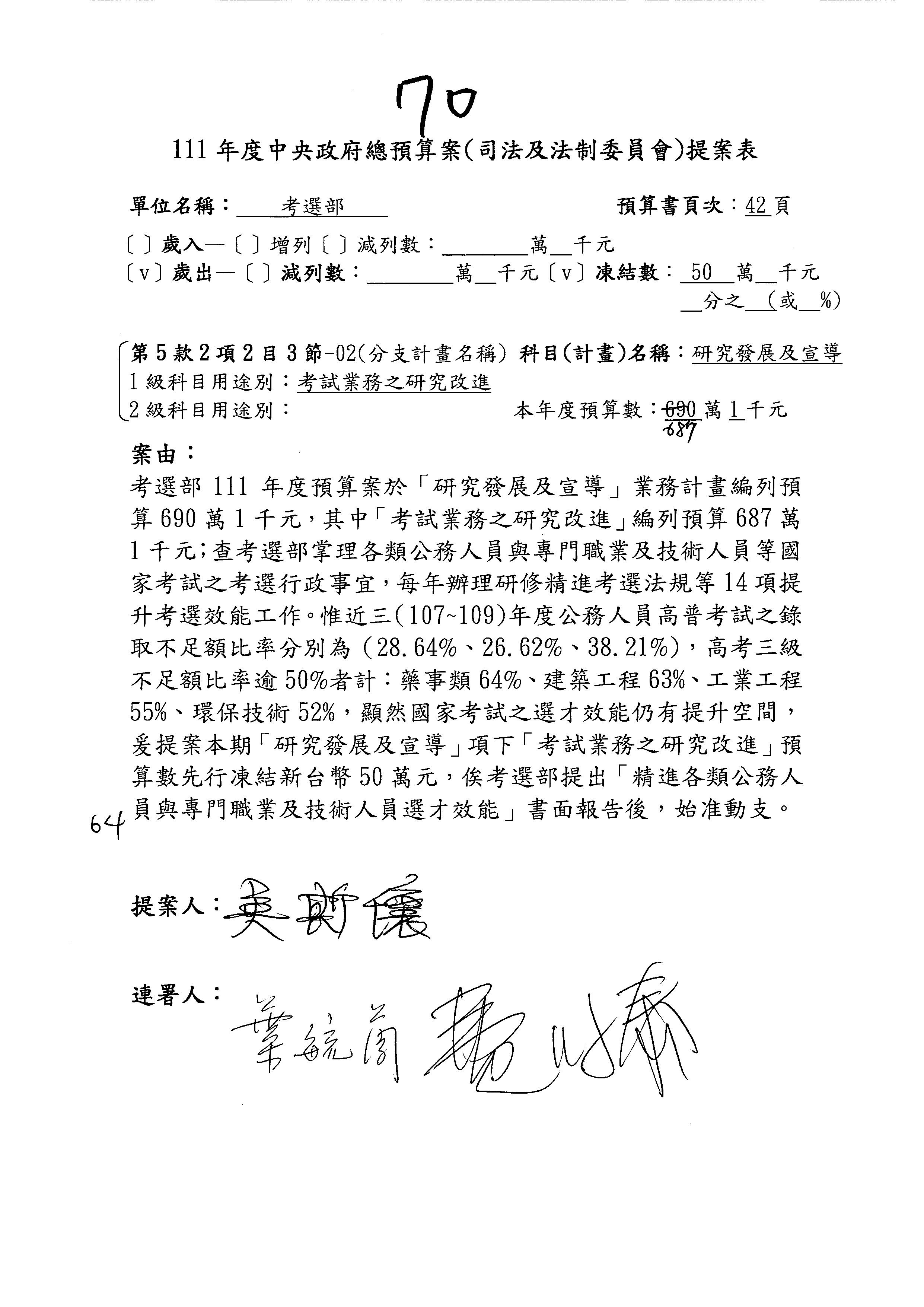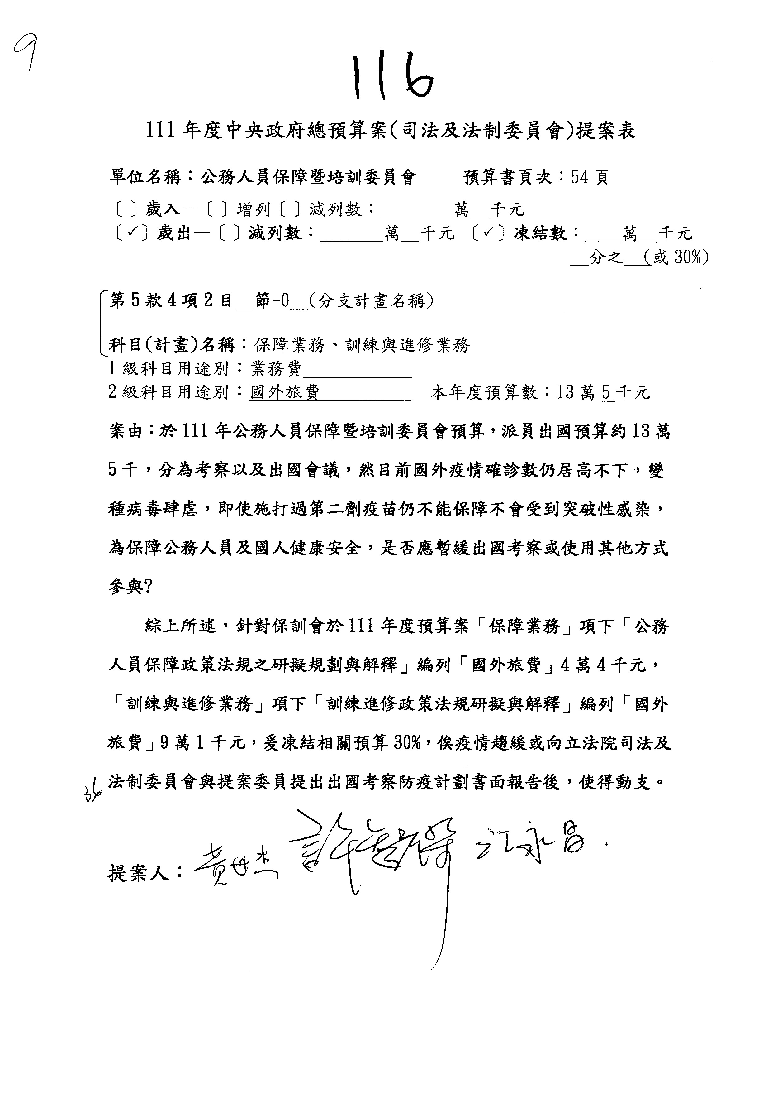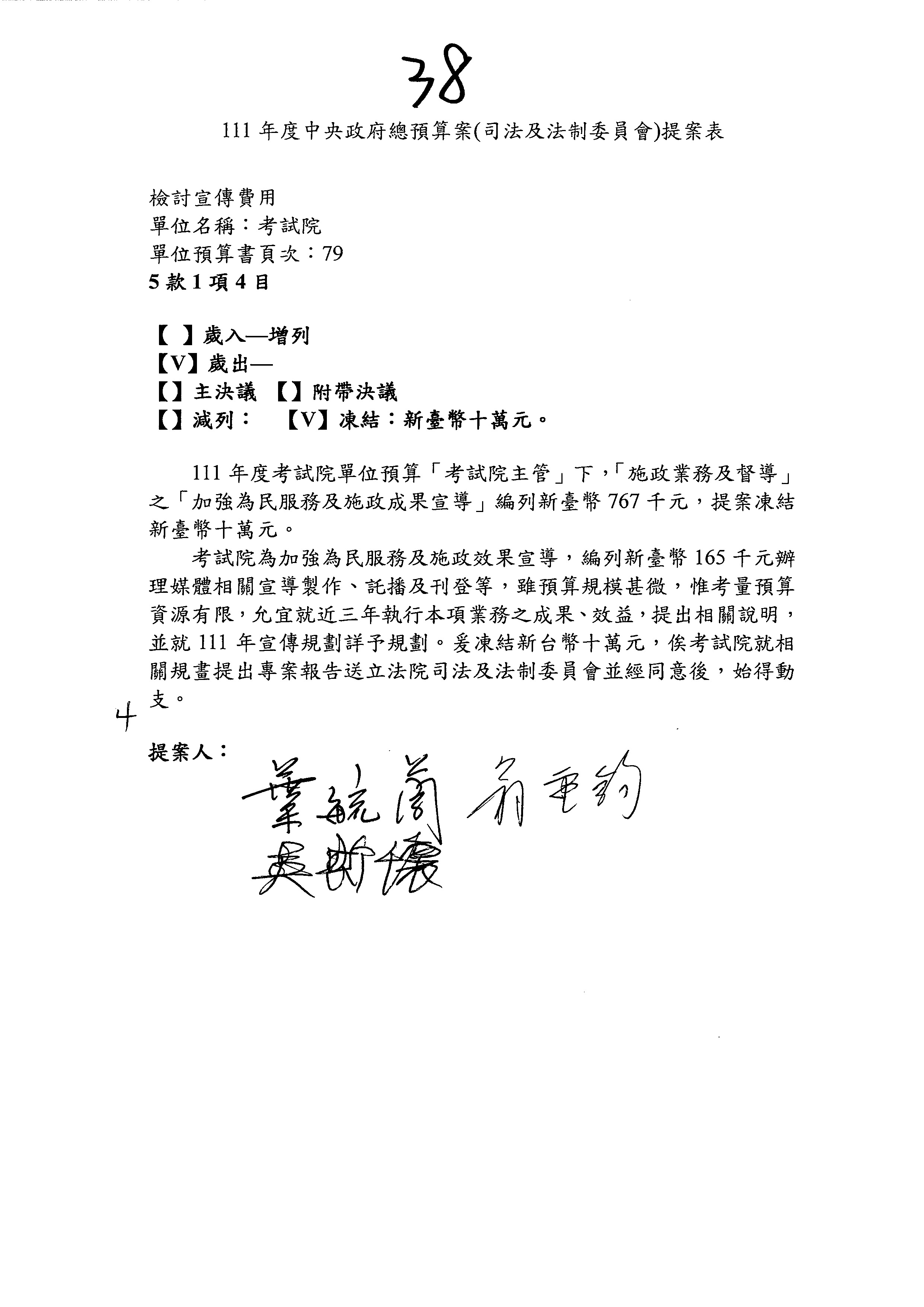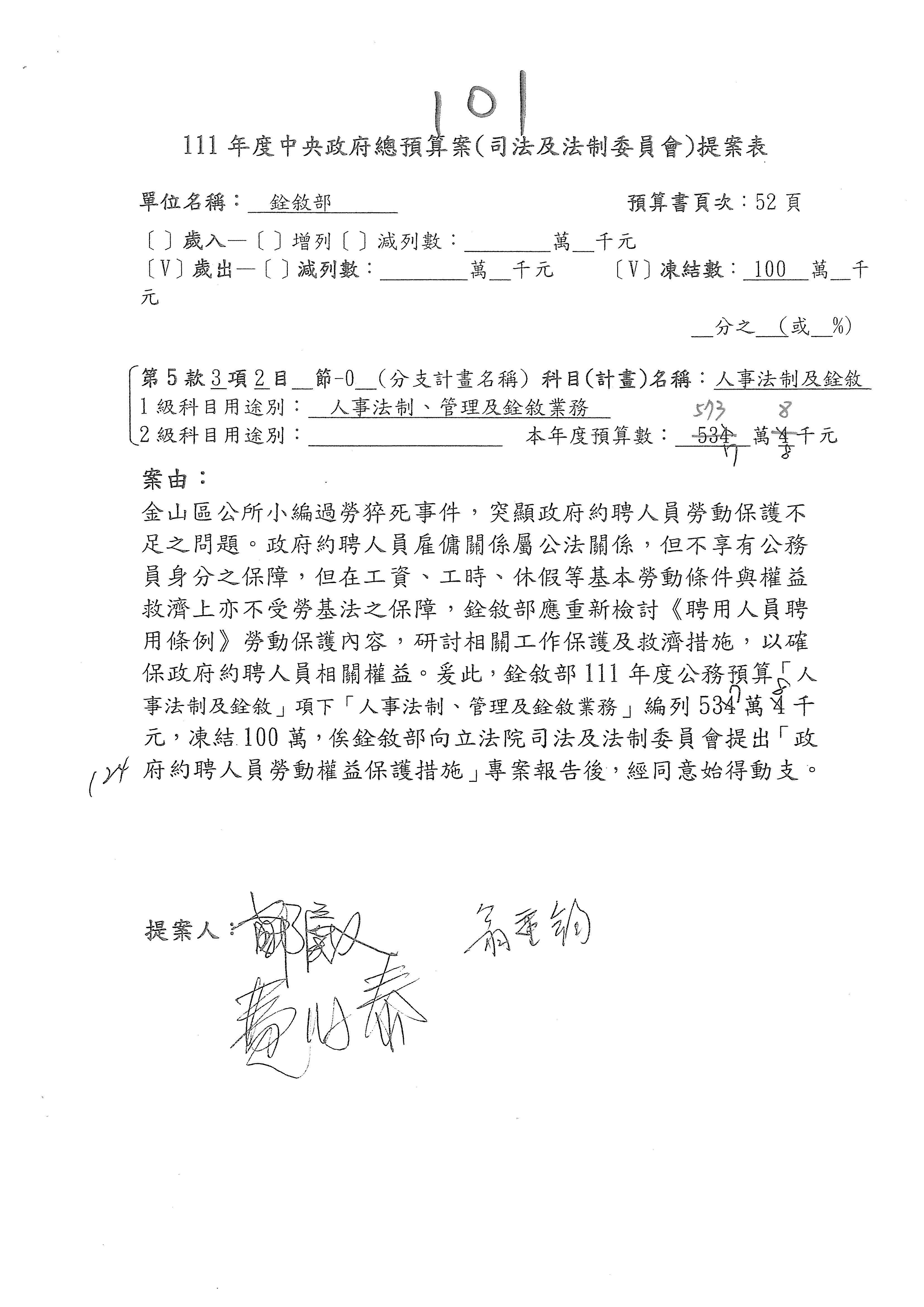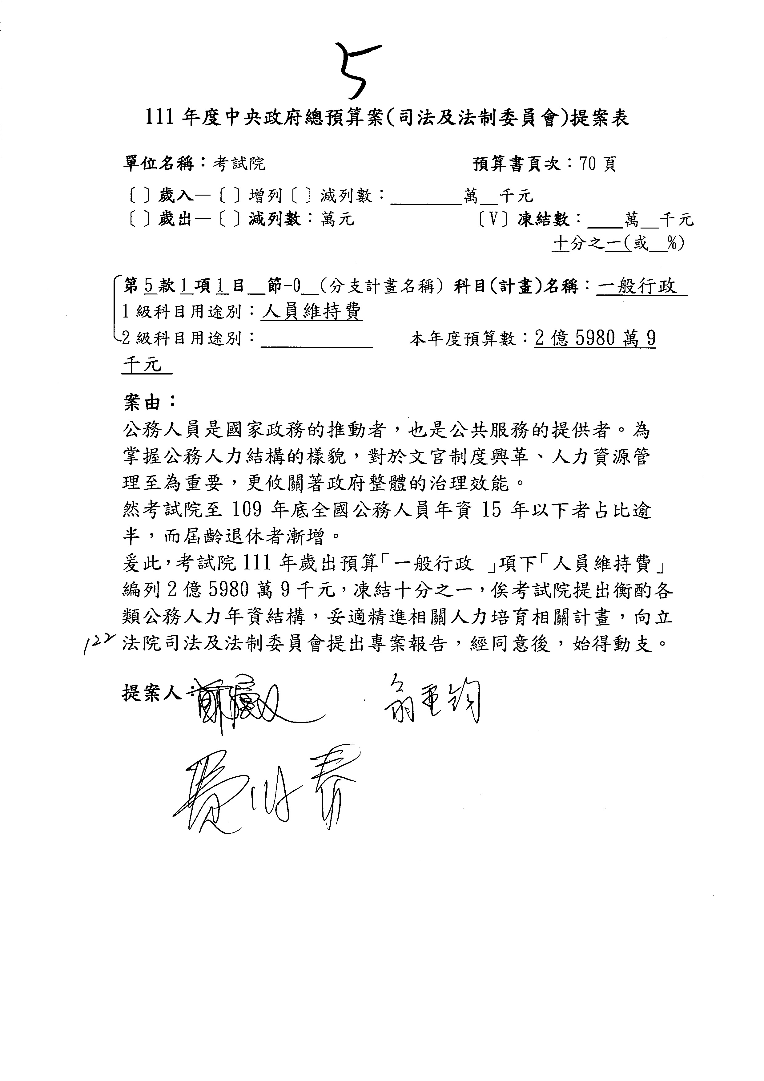 郝主任委員培芝:因為這個案子已經送到立法院審議,我們也非常期待委員在法案上給我們直接的指導,委員是不是能接受我們凍結20萬元、提書面報告?