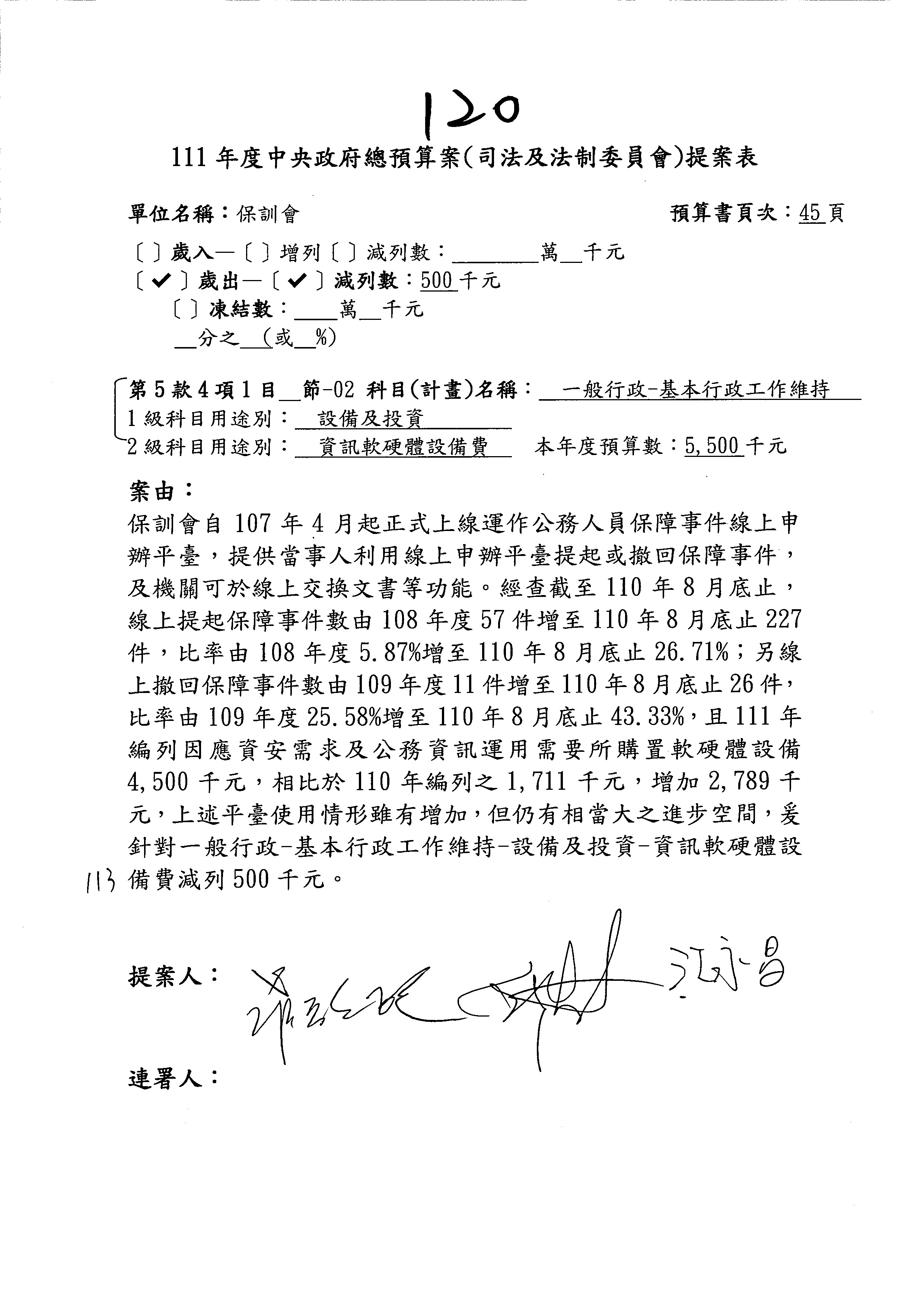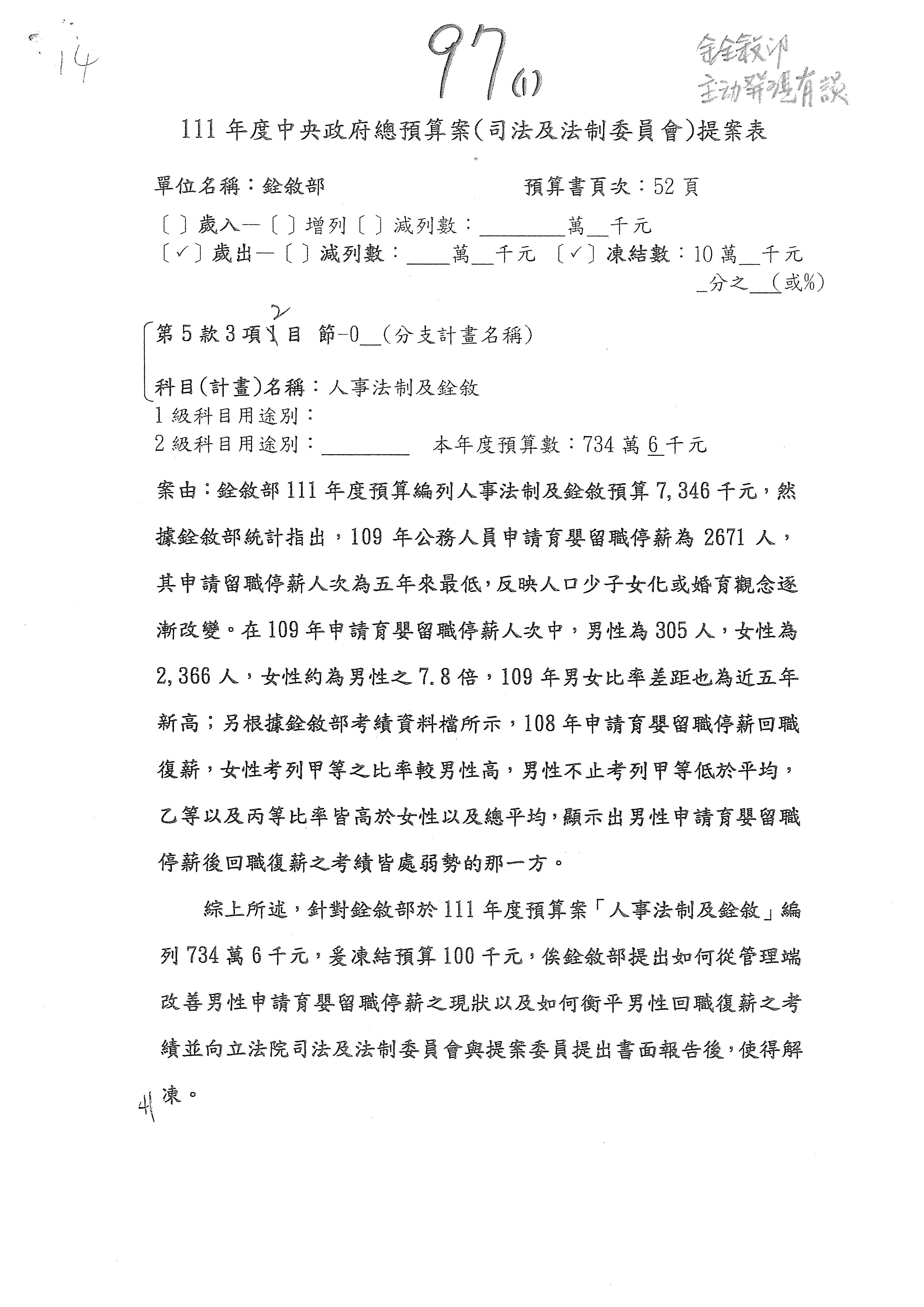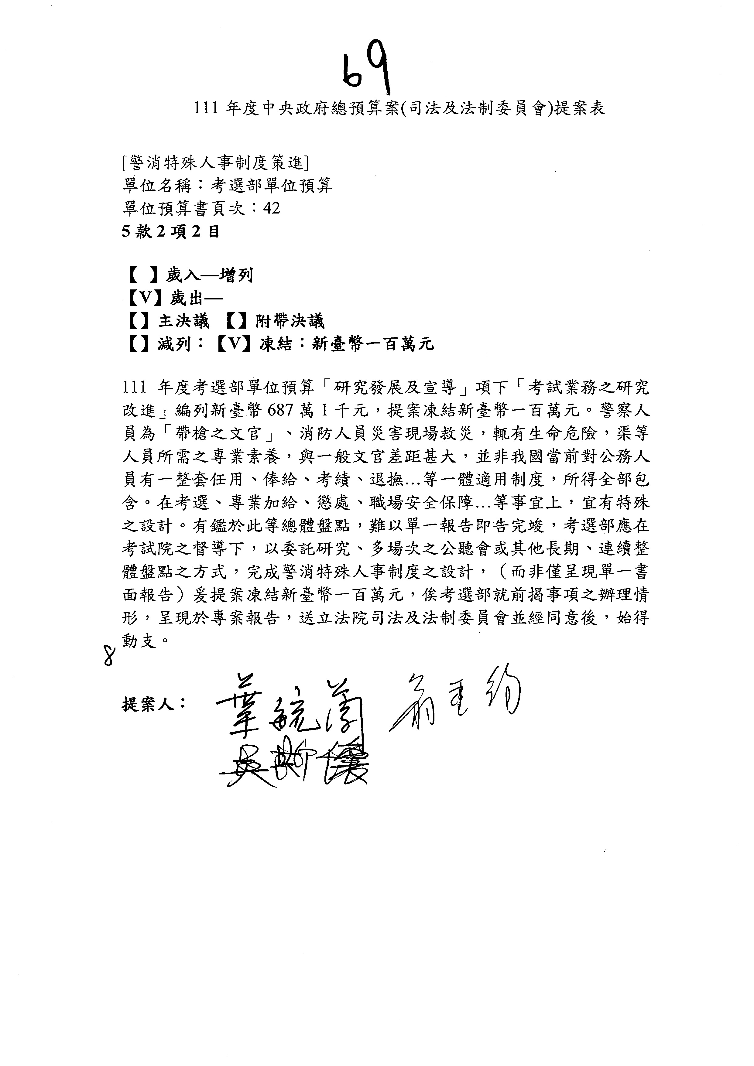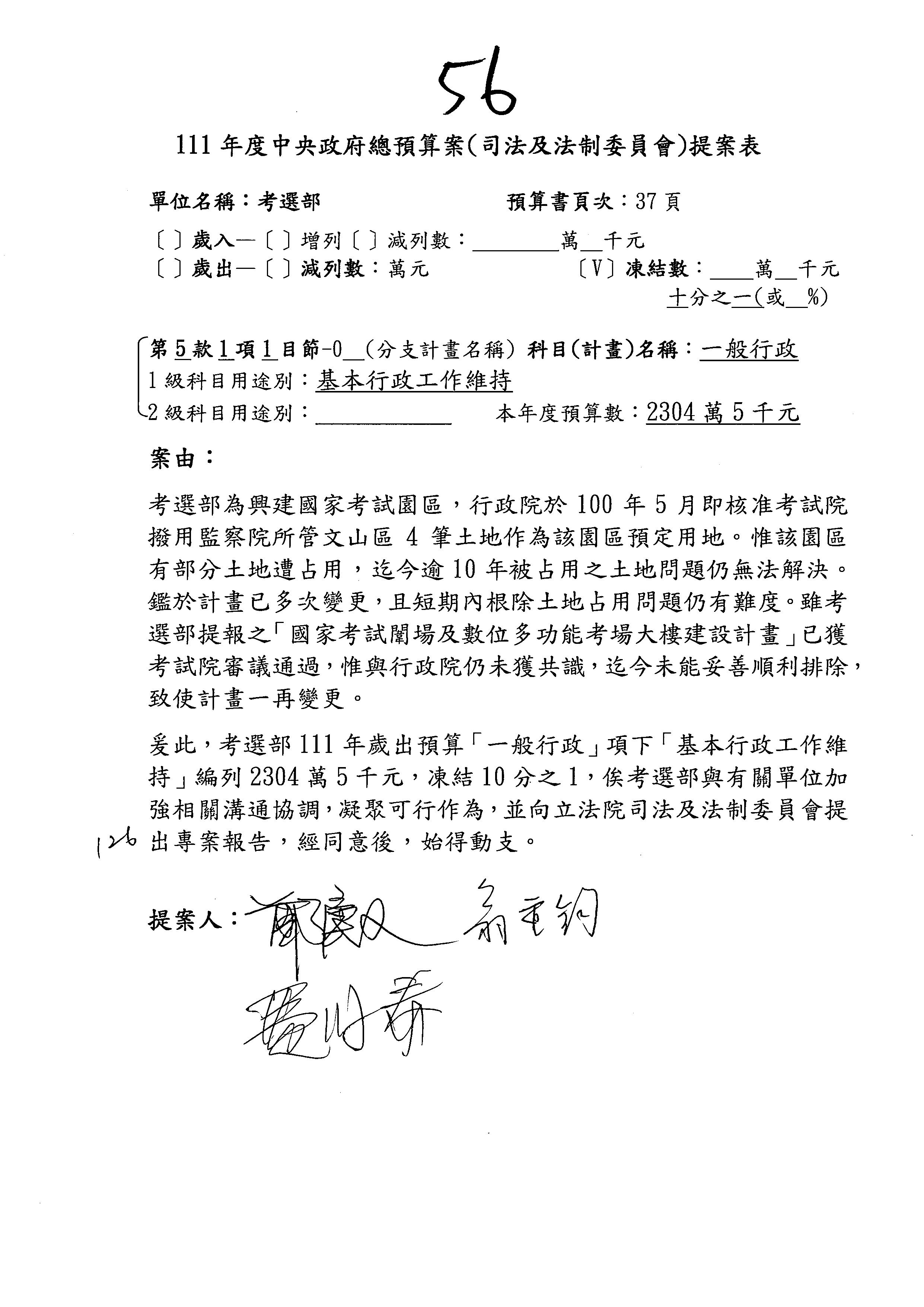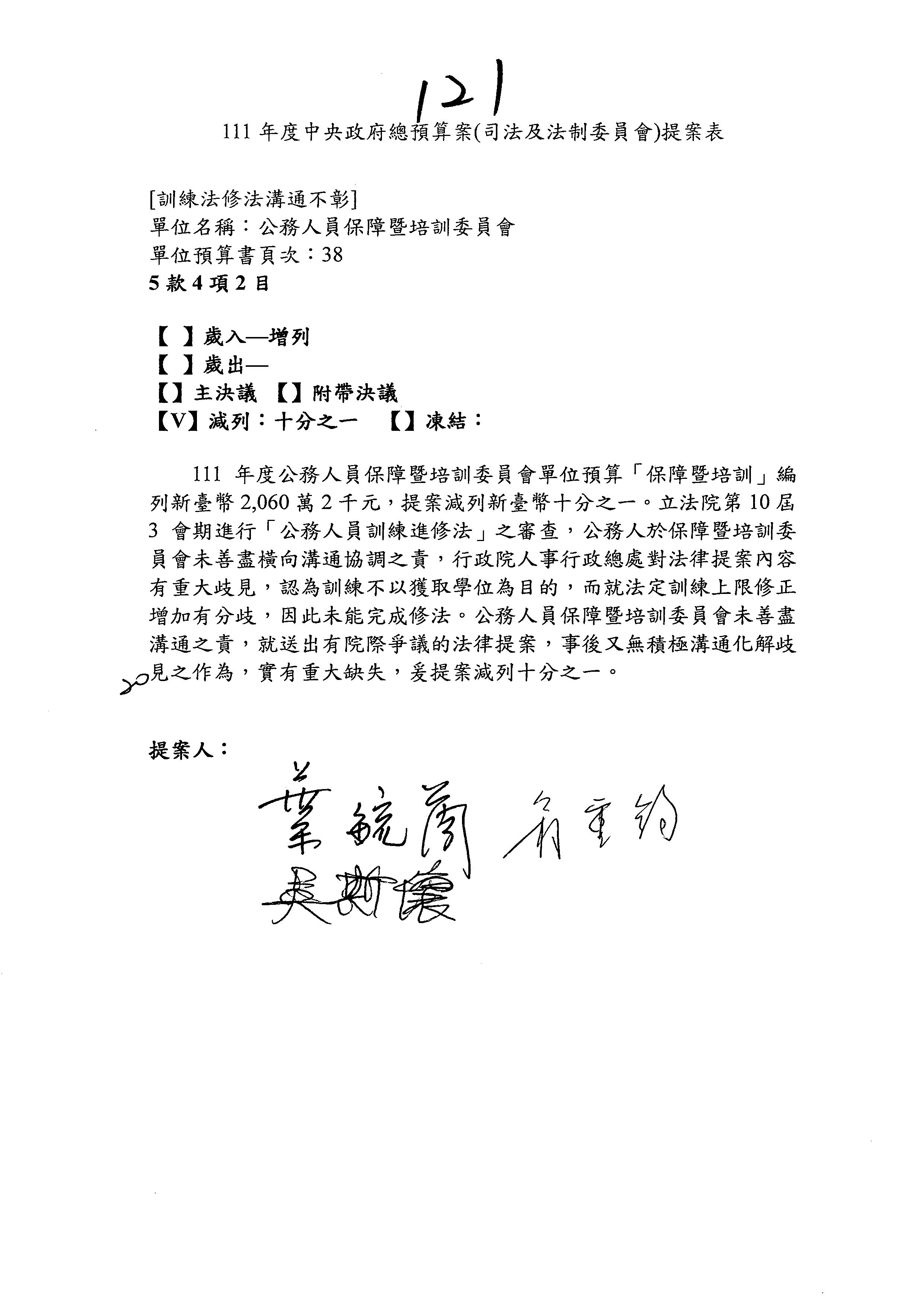 郝主任委員培芝:因為這個案子已經送到立法院審議,我們也非常期待委員在法案上給我們直接的指導,委員是不是能接受我們凍結20萬元、提書面報告?
