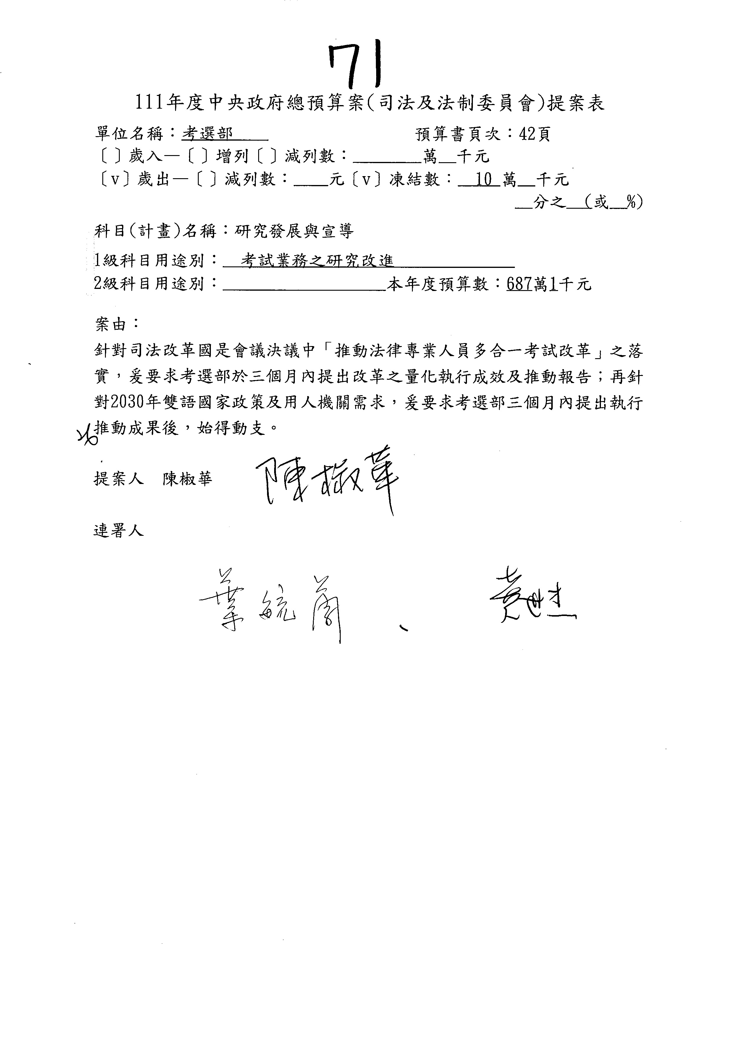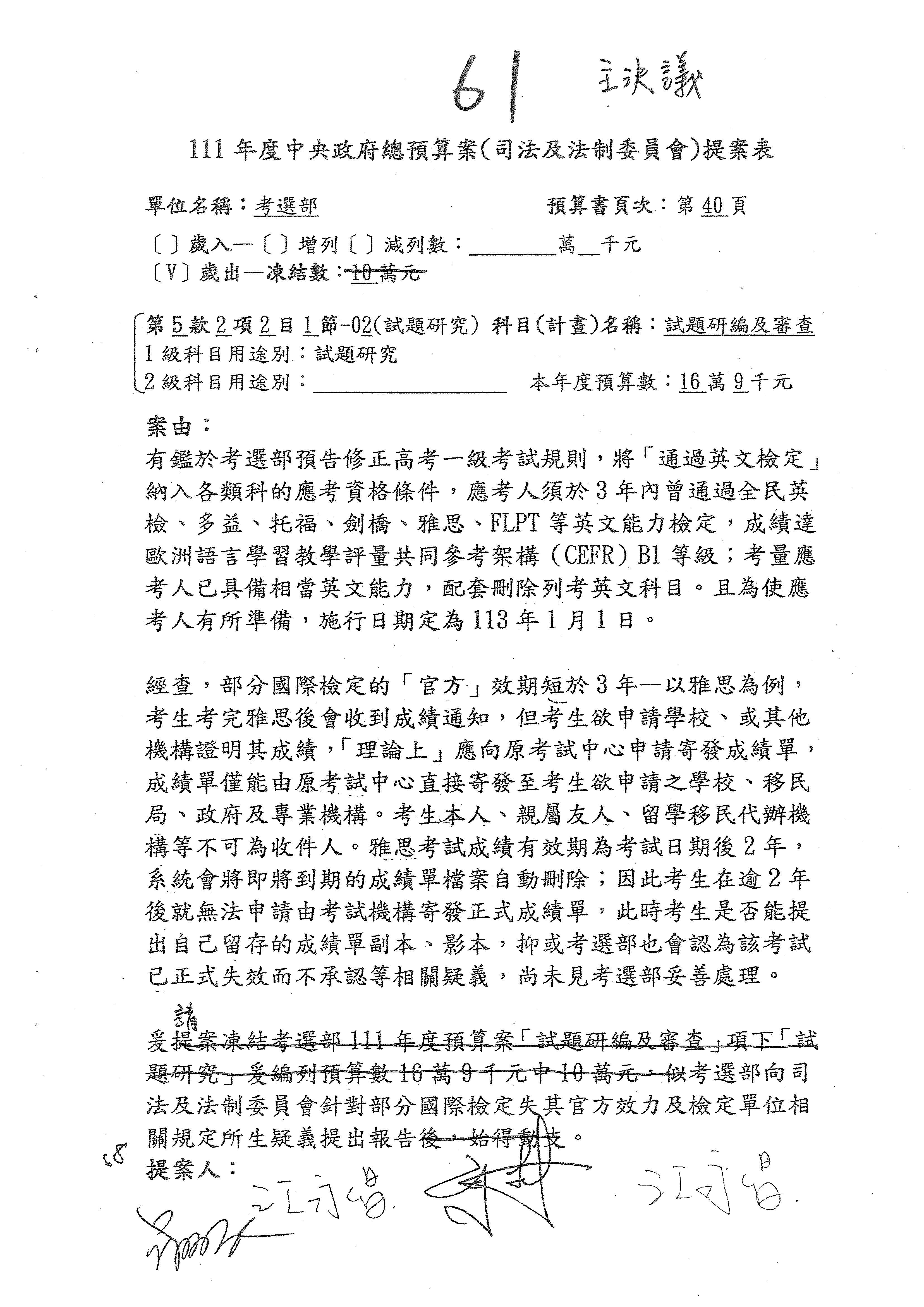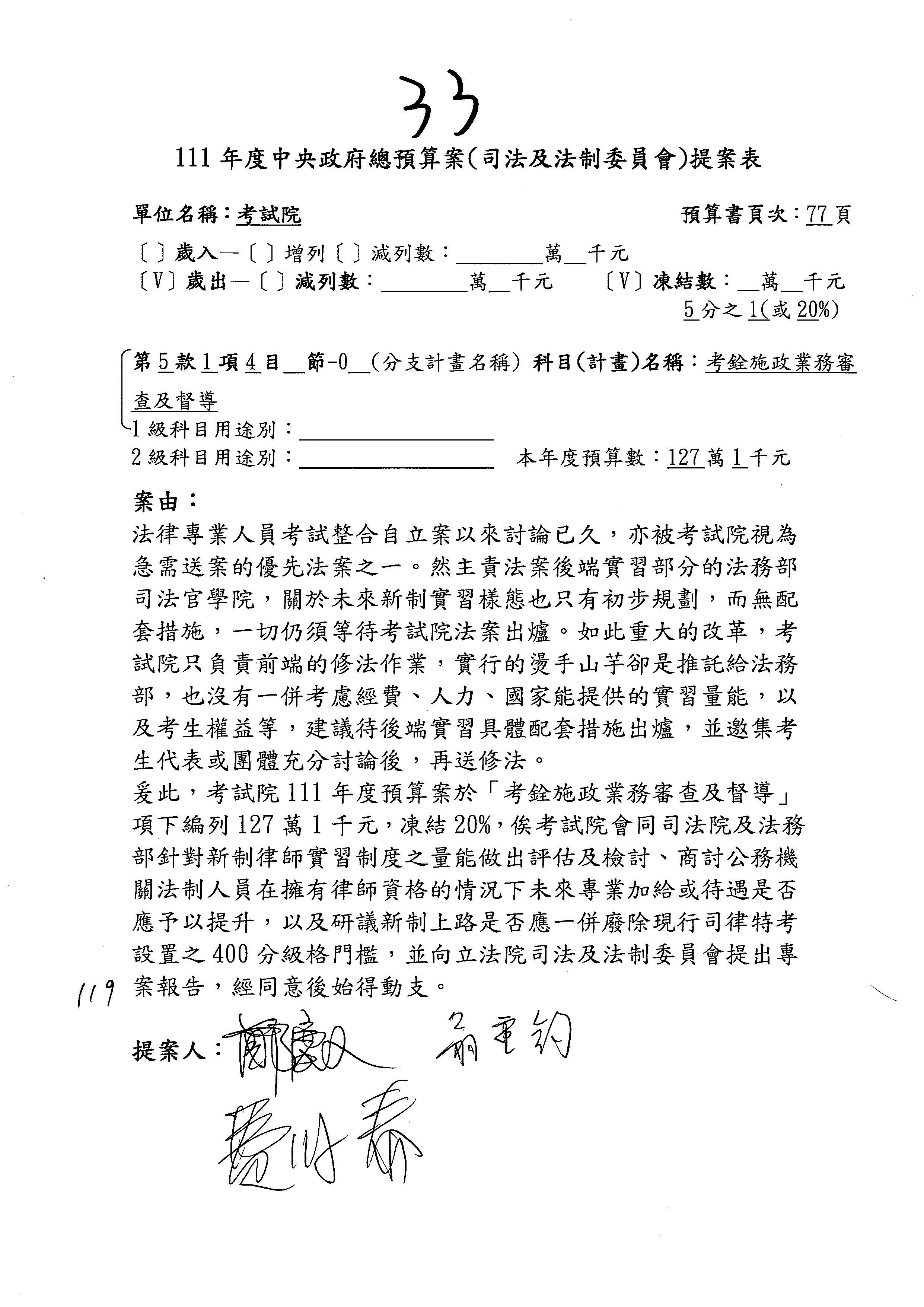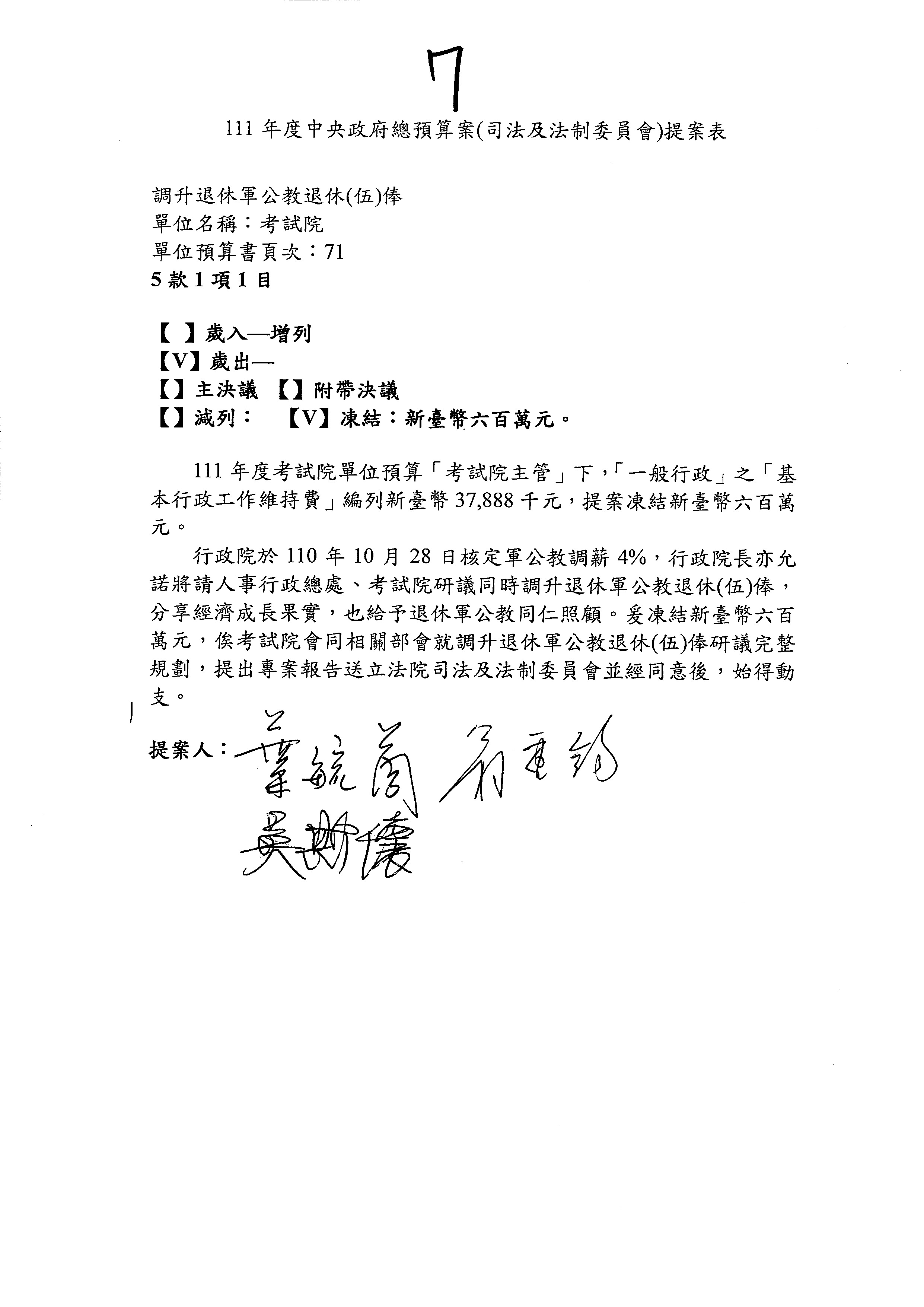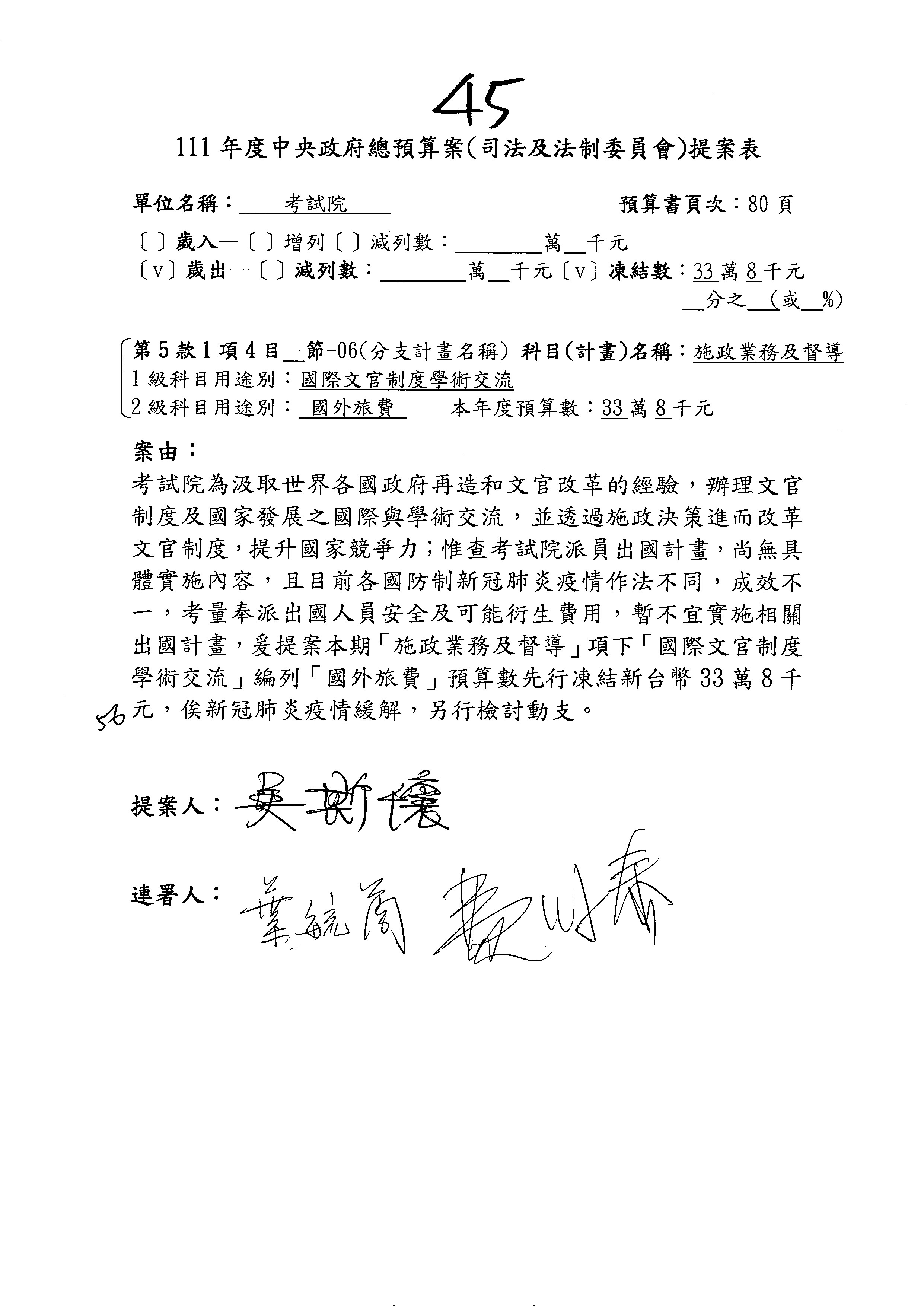 郝主任委員培芝:因為這個案子已經送到立法院審議,我們也非常期待委員在法案上給我們直接的指導,委員是不是能接受我們凍結20萬元、提書面報告?