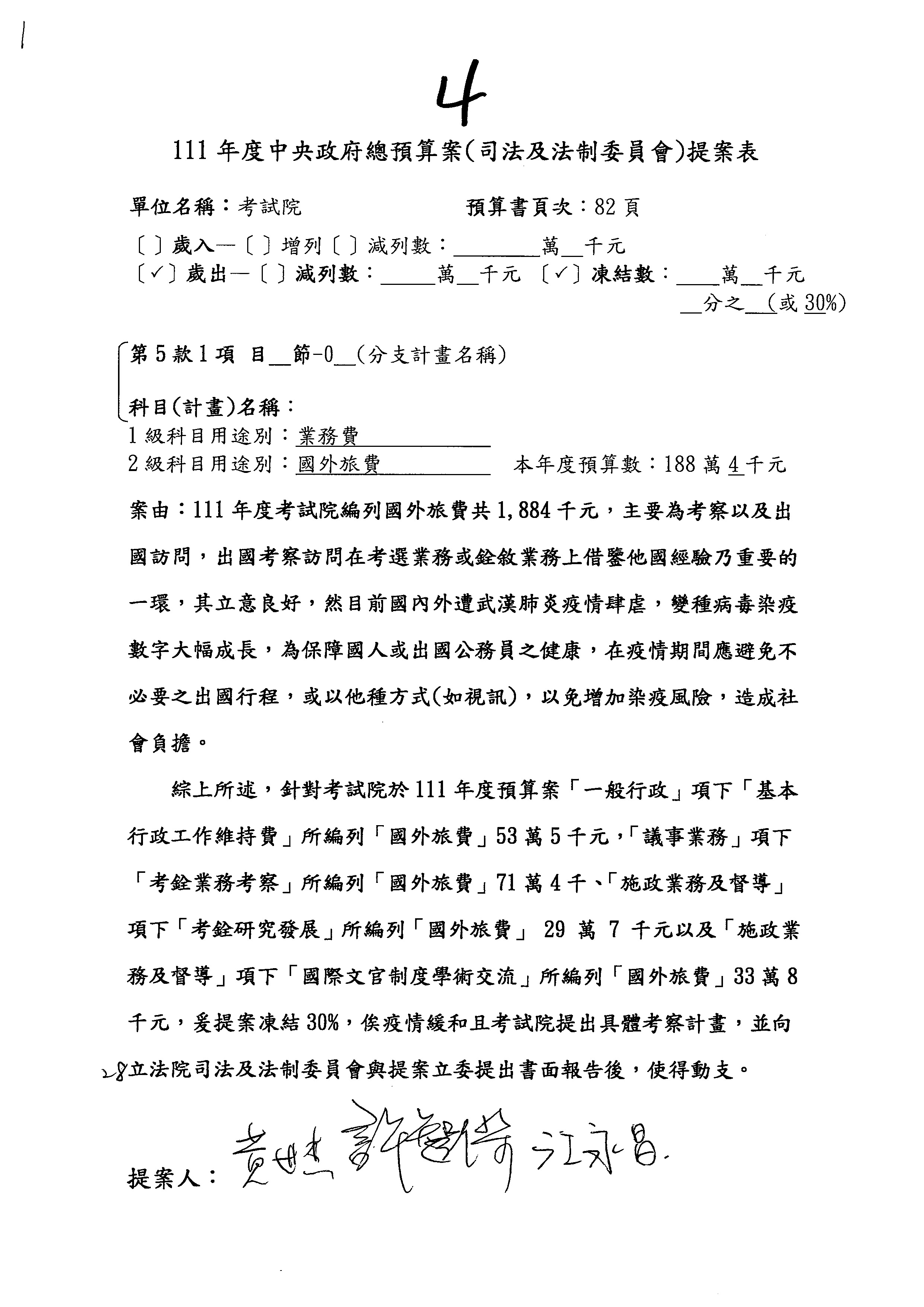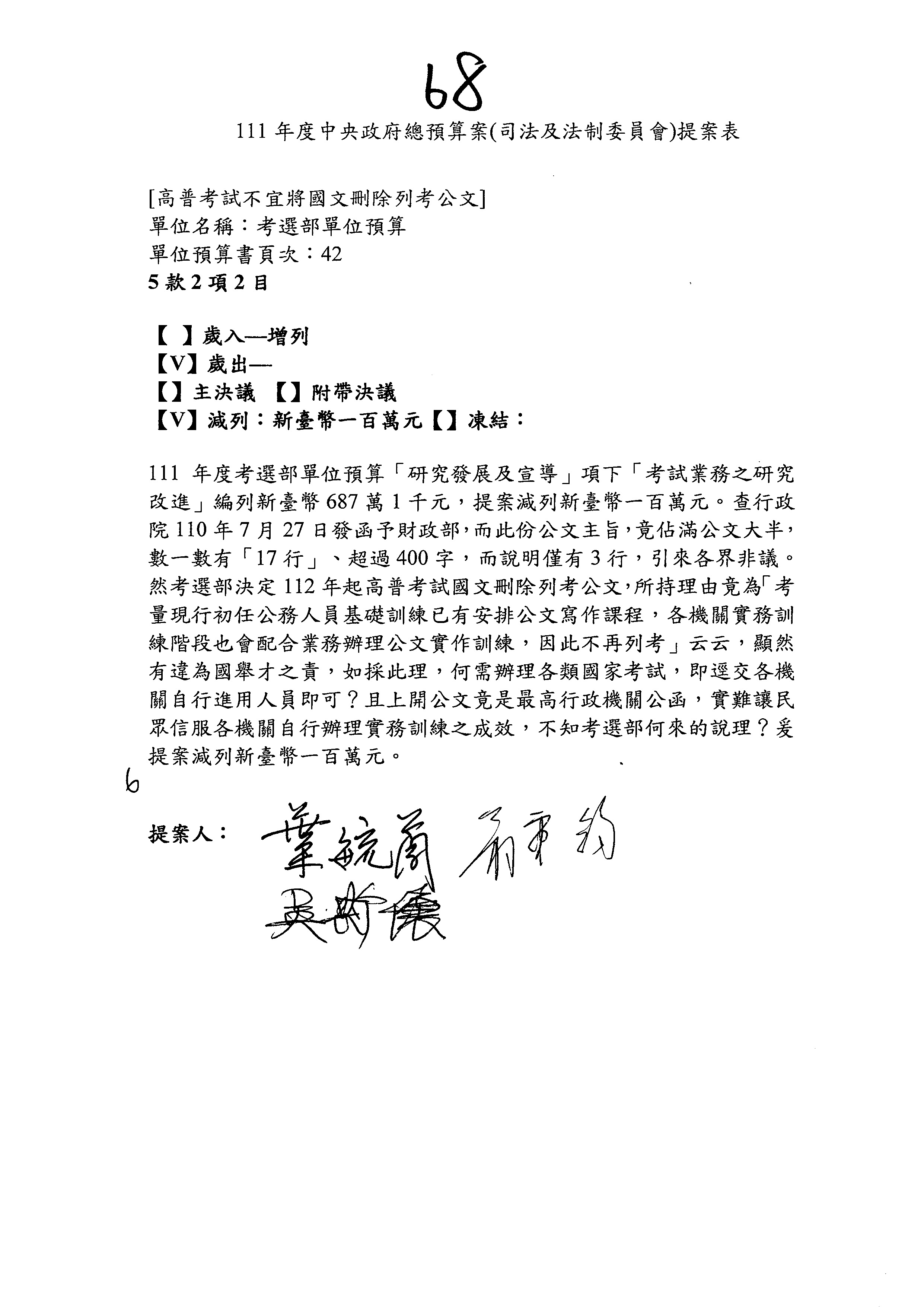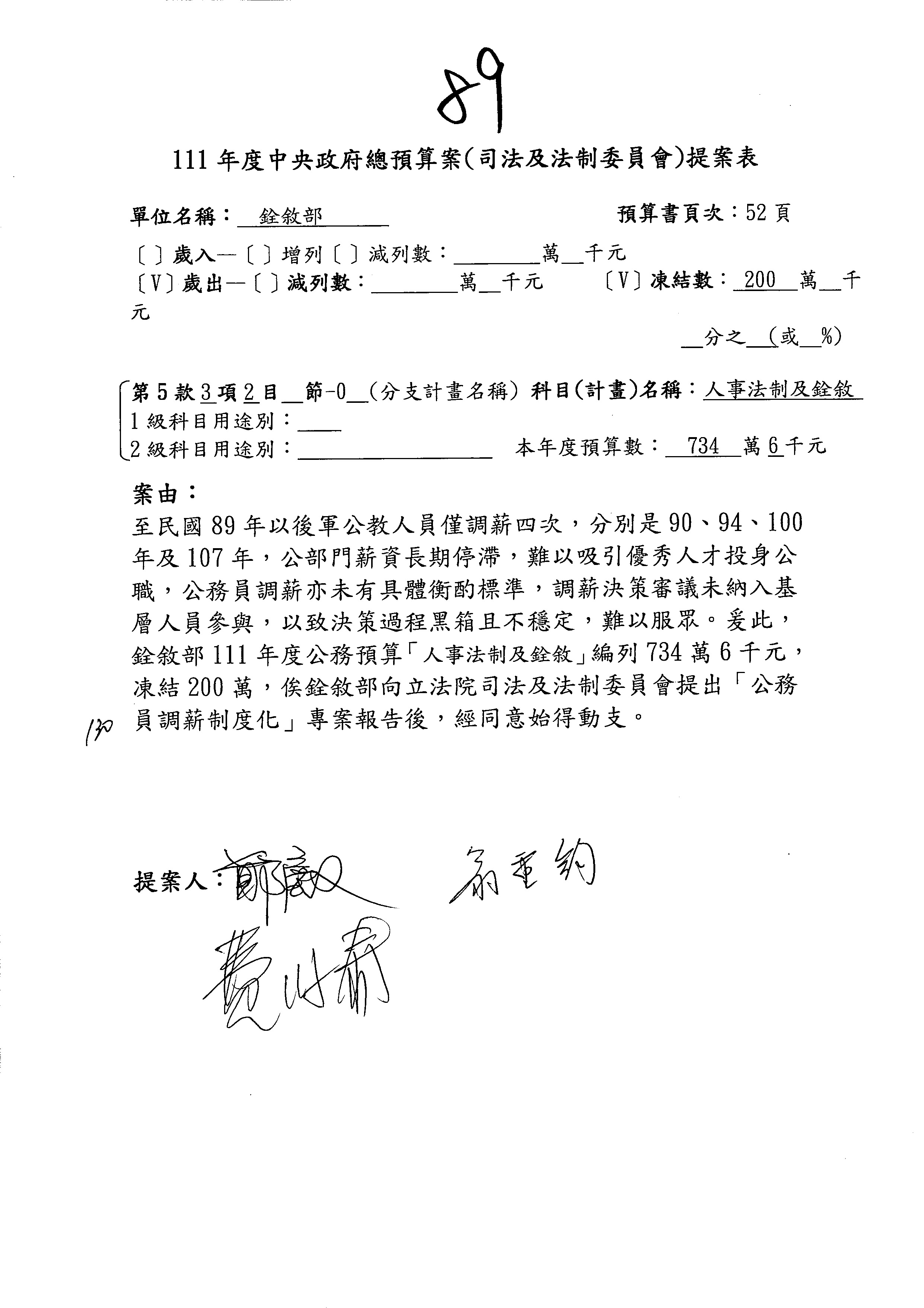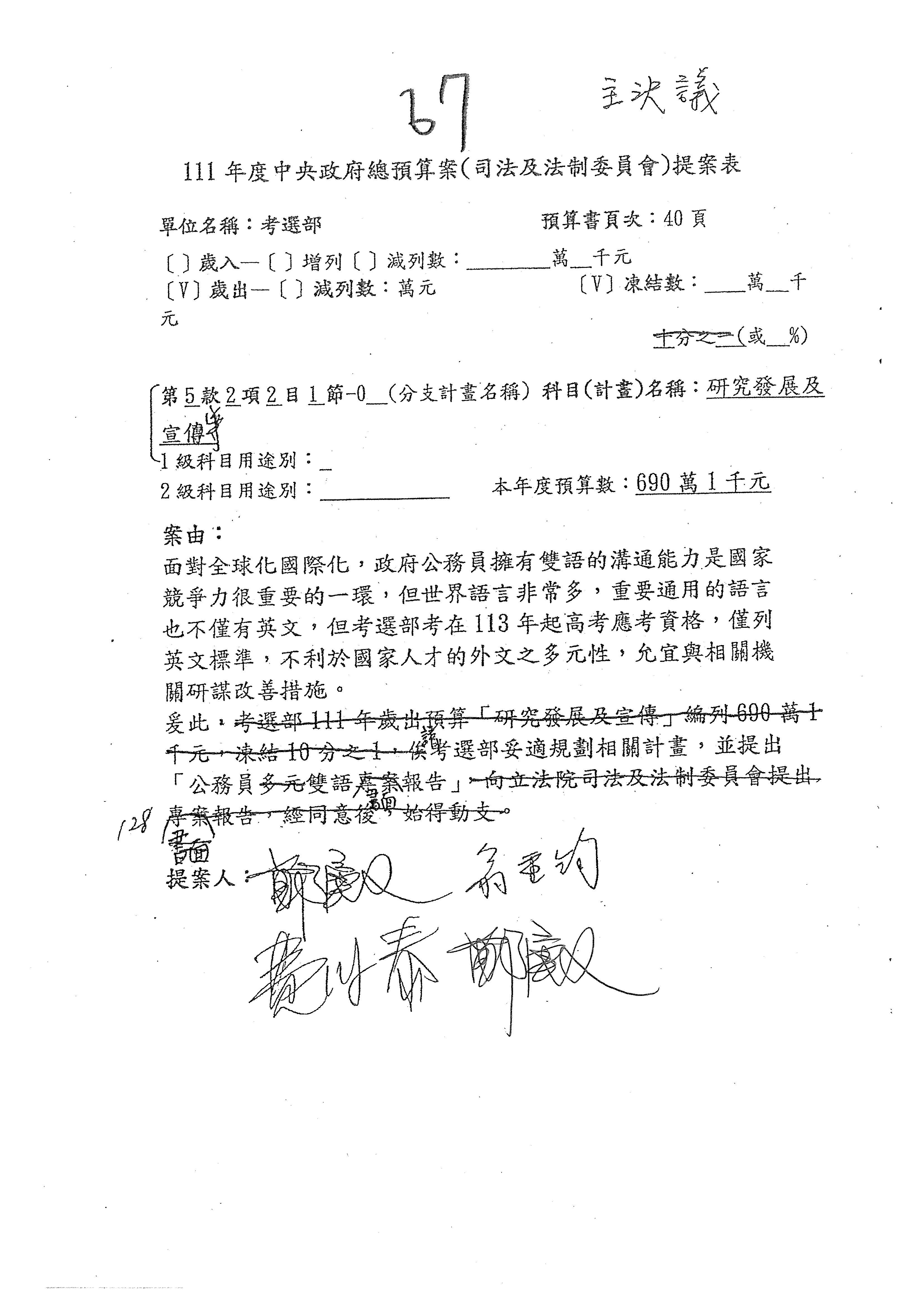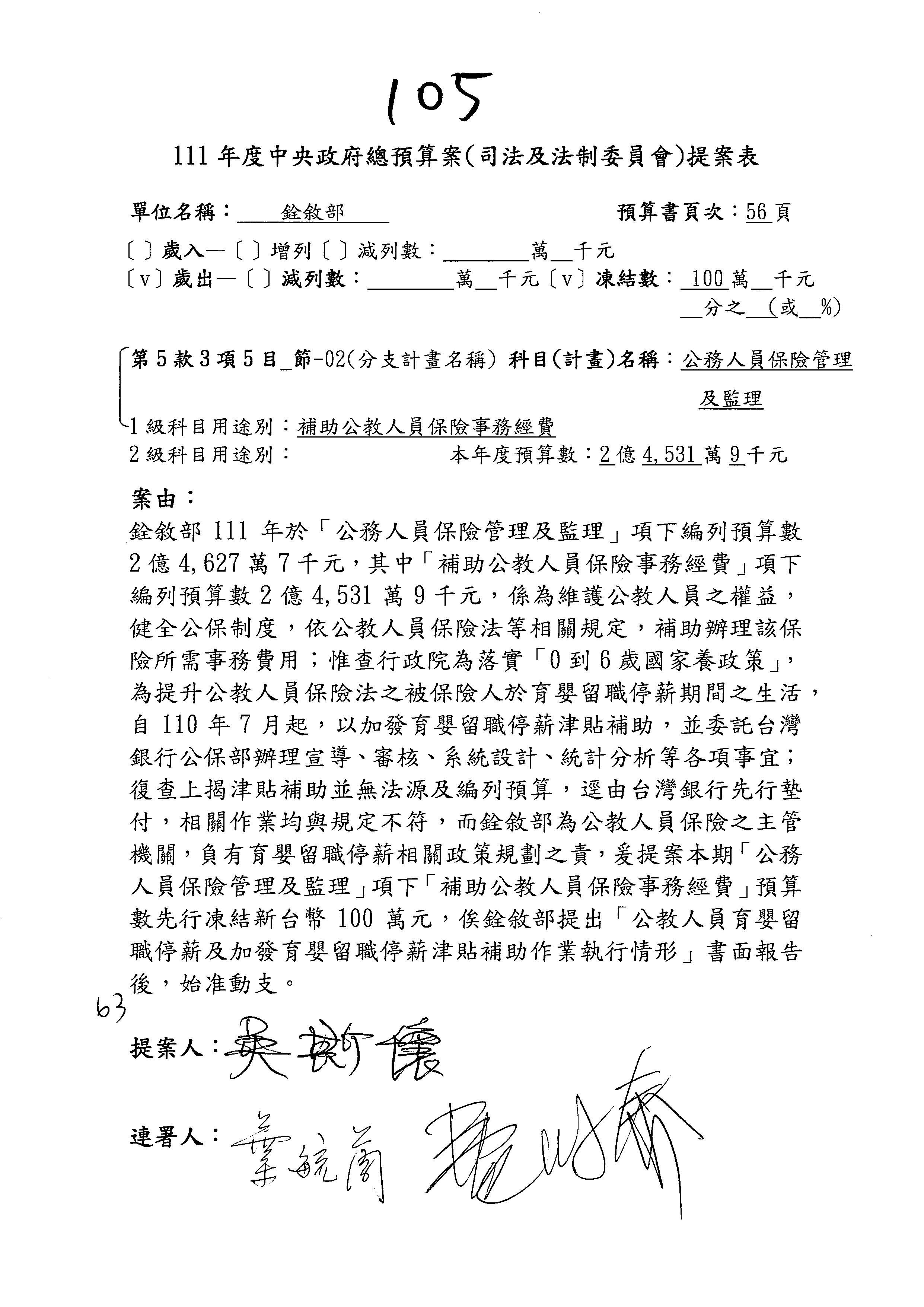郝主任委員培芝:因為這個案子已經送到立法院審議,我們也非常期待委員在法案上給我們直接的指導,委員是不是能接受我們凍結20萬元、提書面報告?