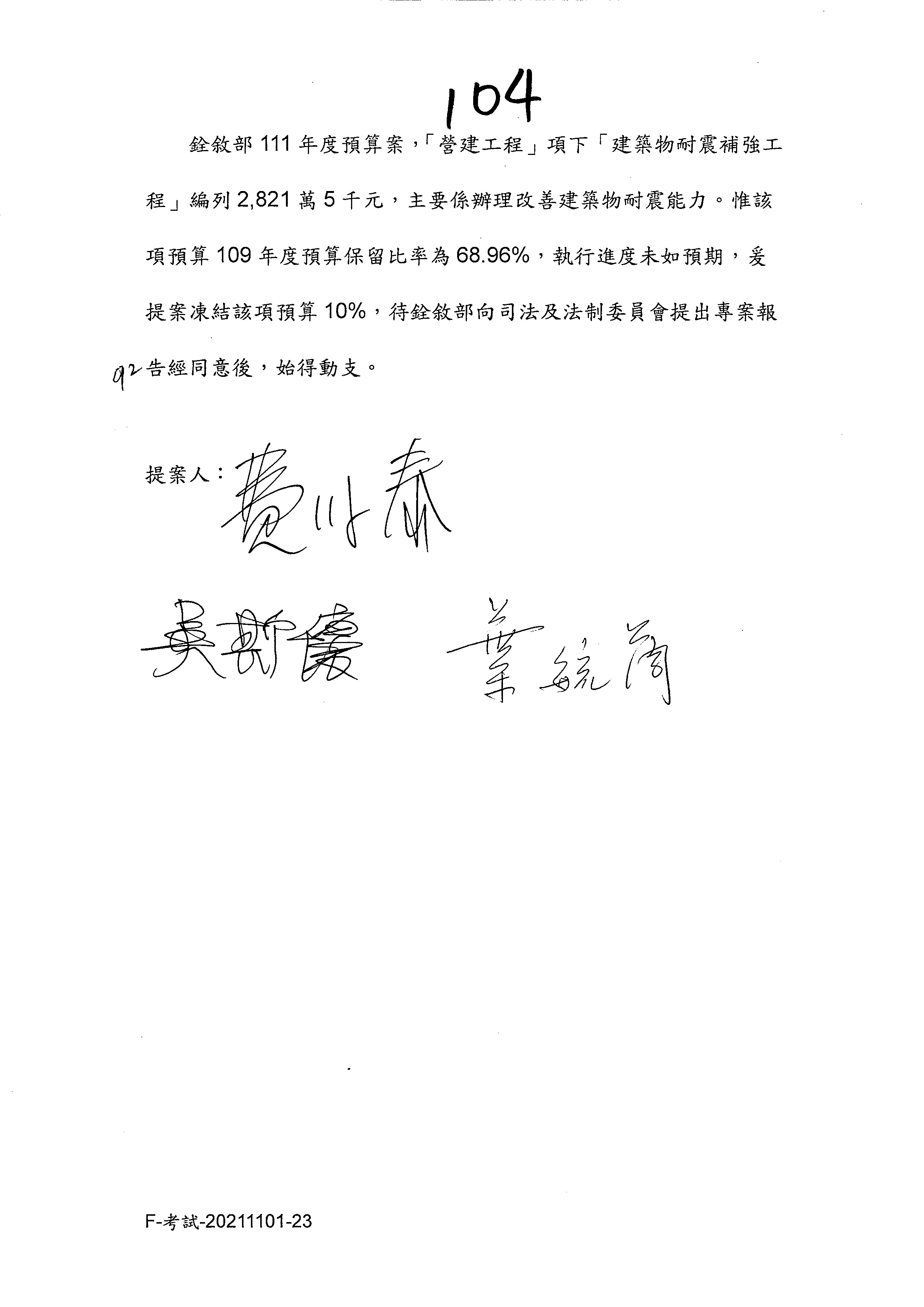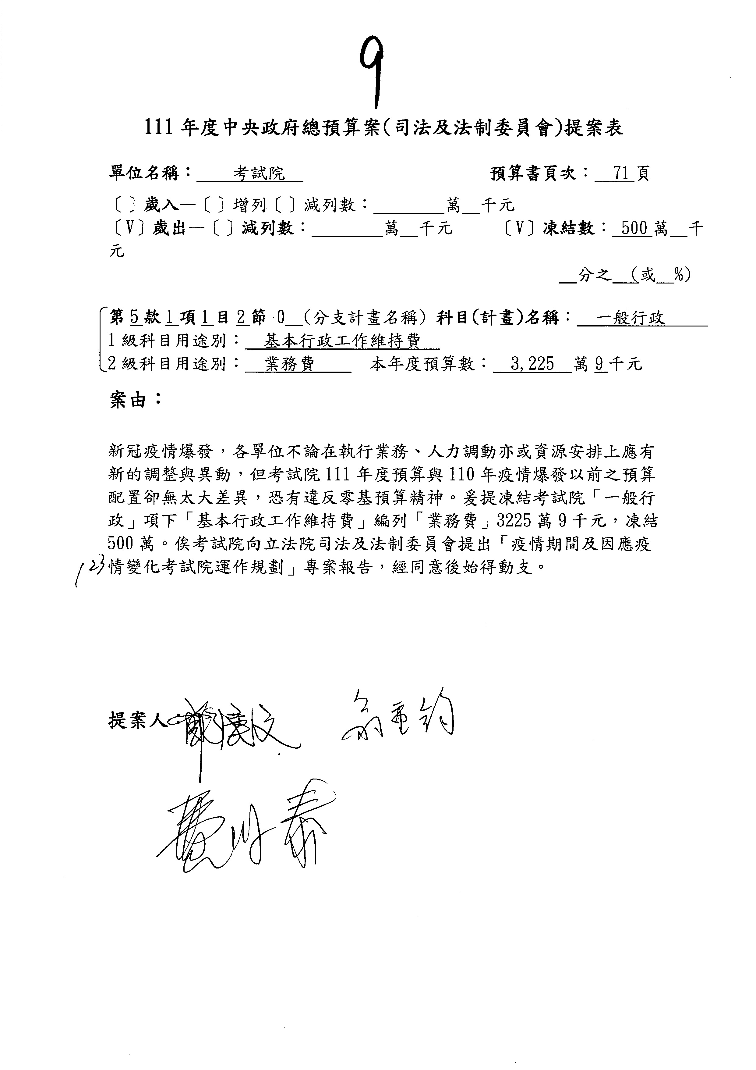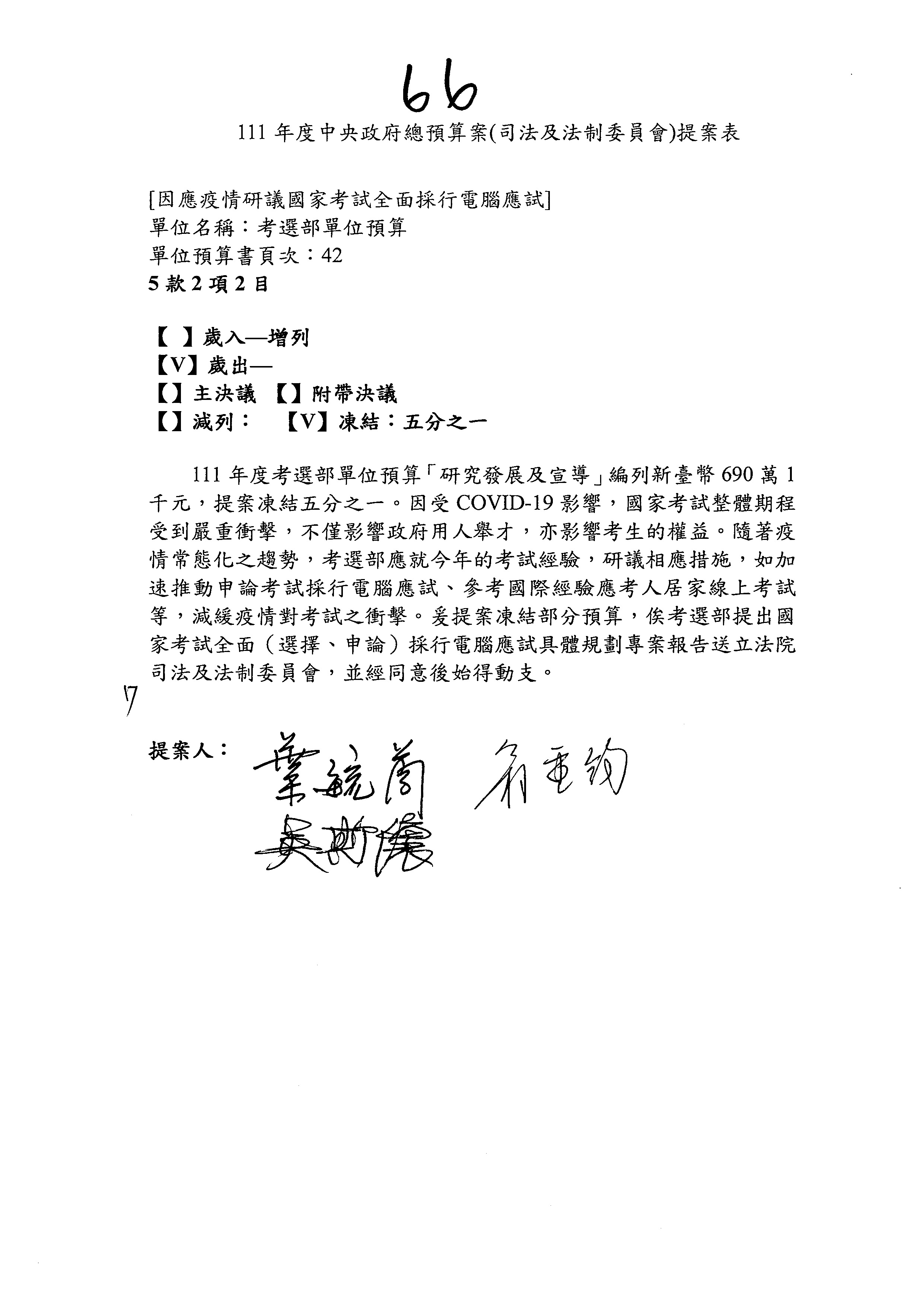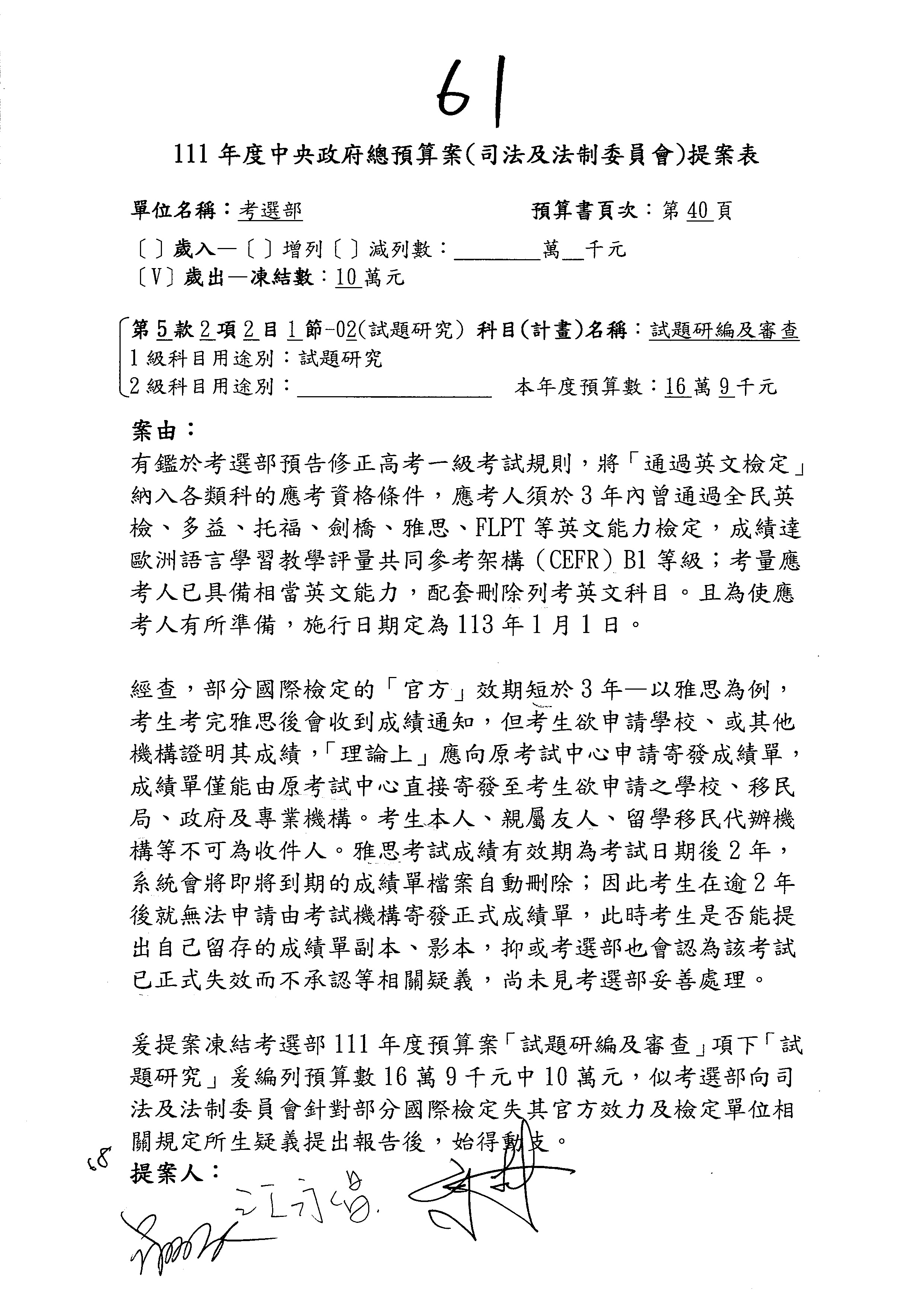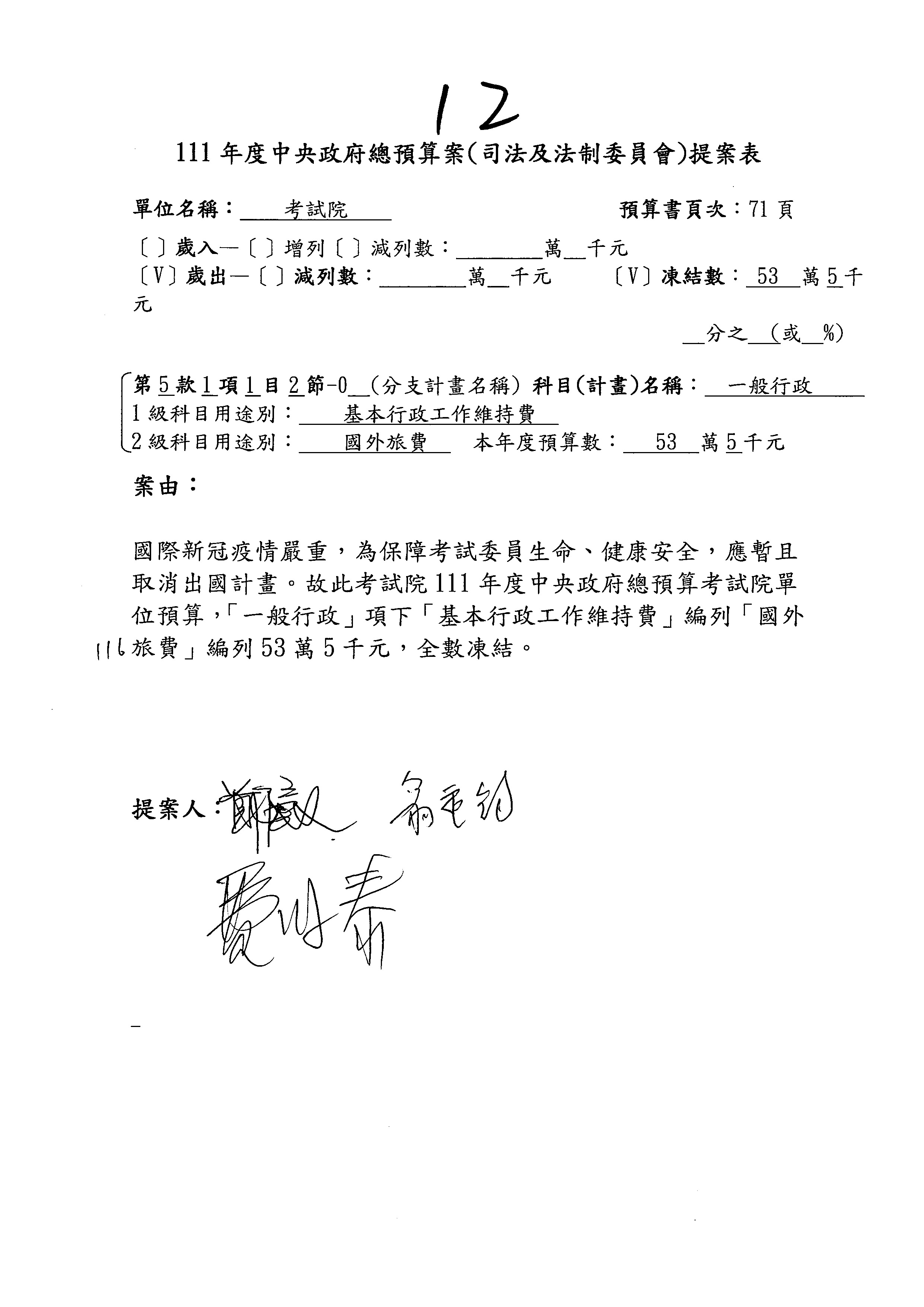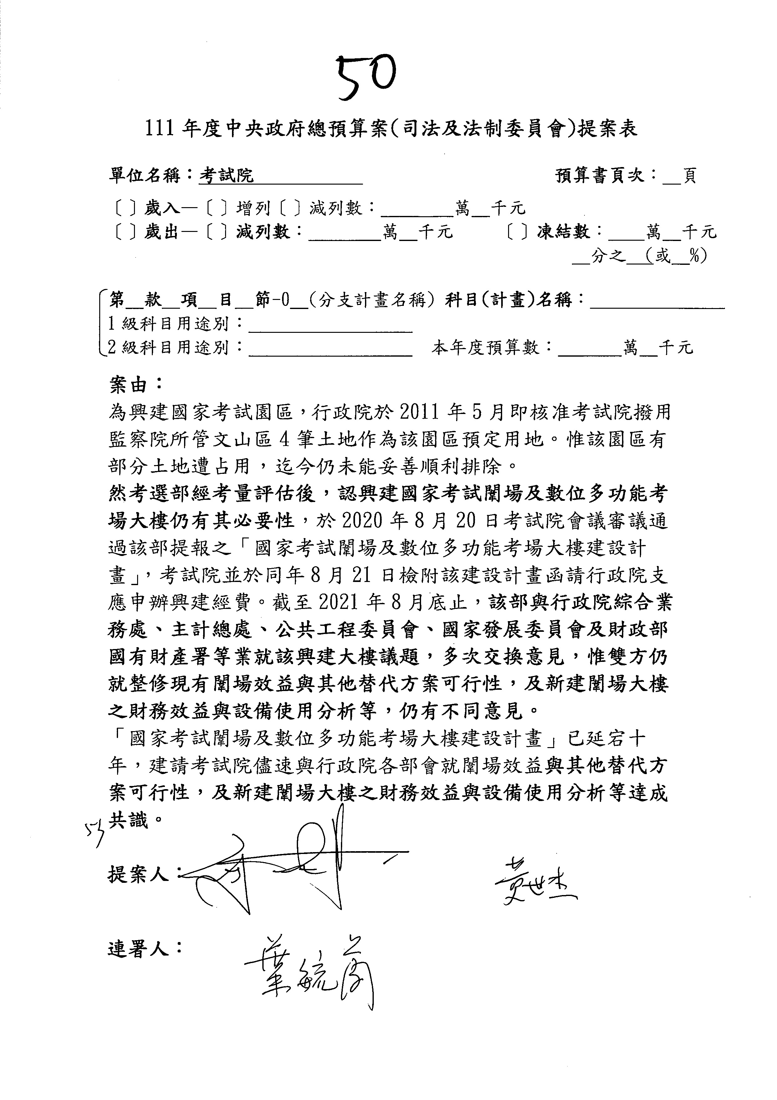 郝主任委員培芝:因為這個案子已經送到立法院審議,我們也非常期待委員在法案上給我們直接的指導,委員是不是能接受我們凍結20萬元、提書面報告?