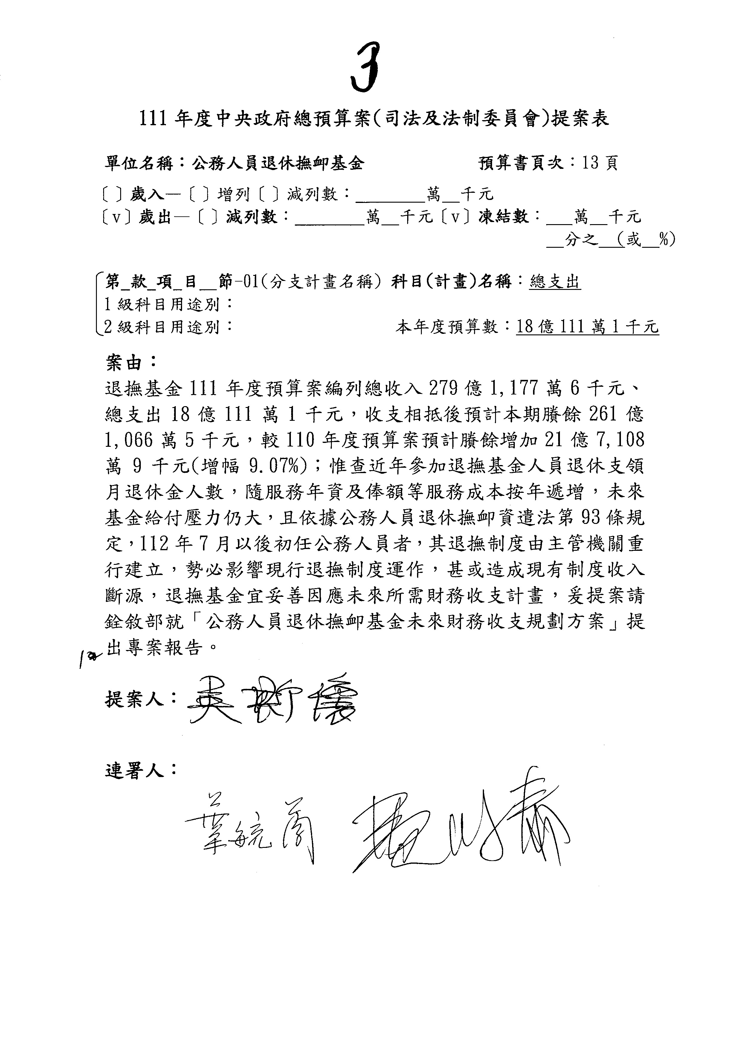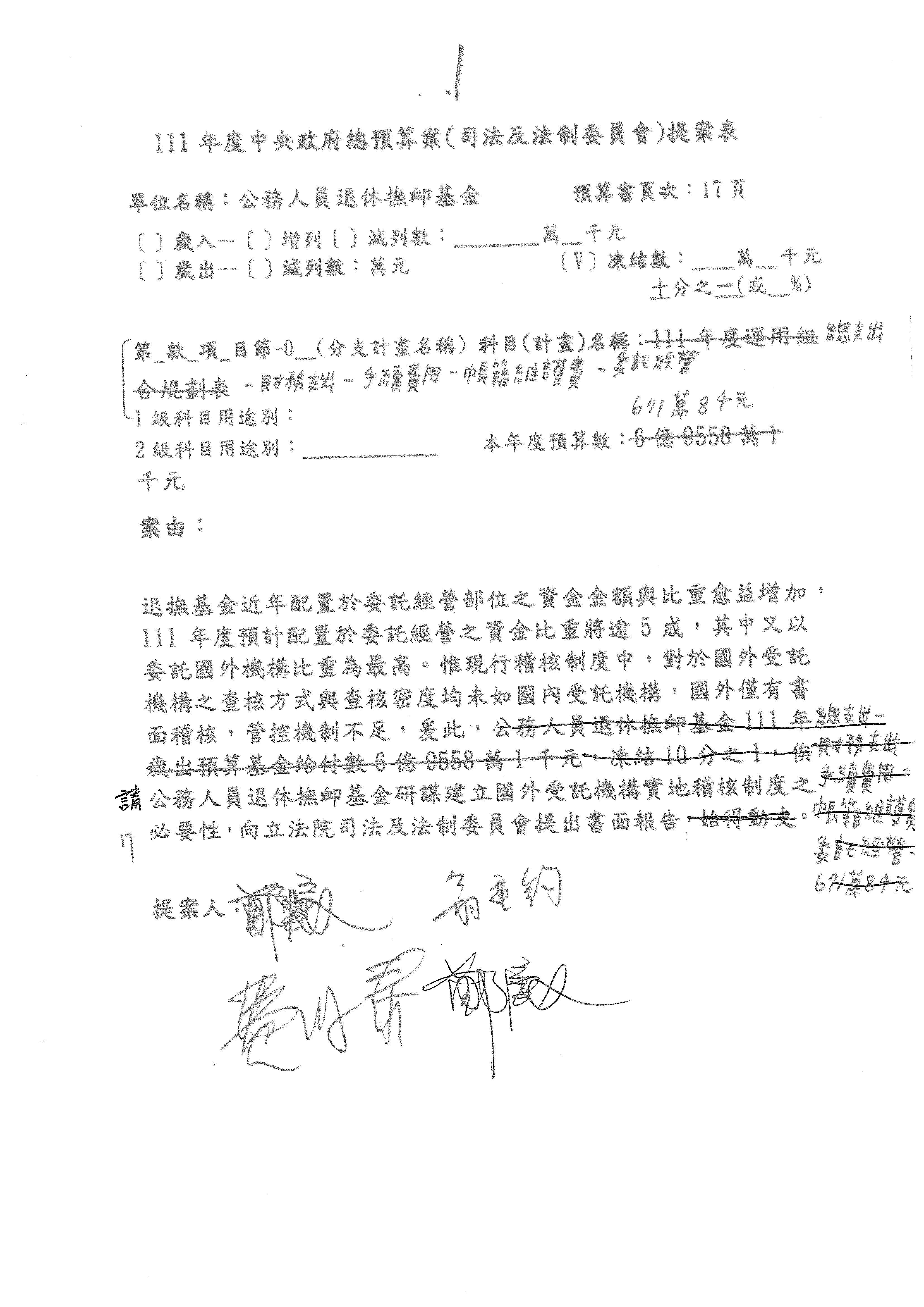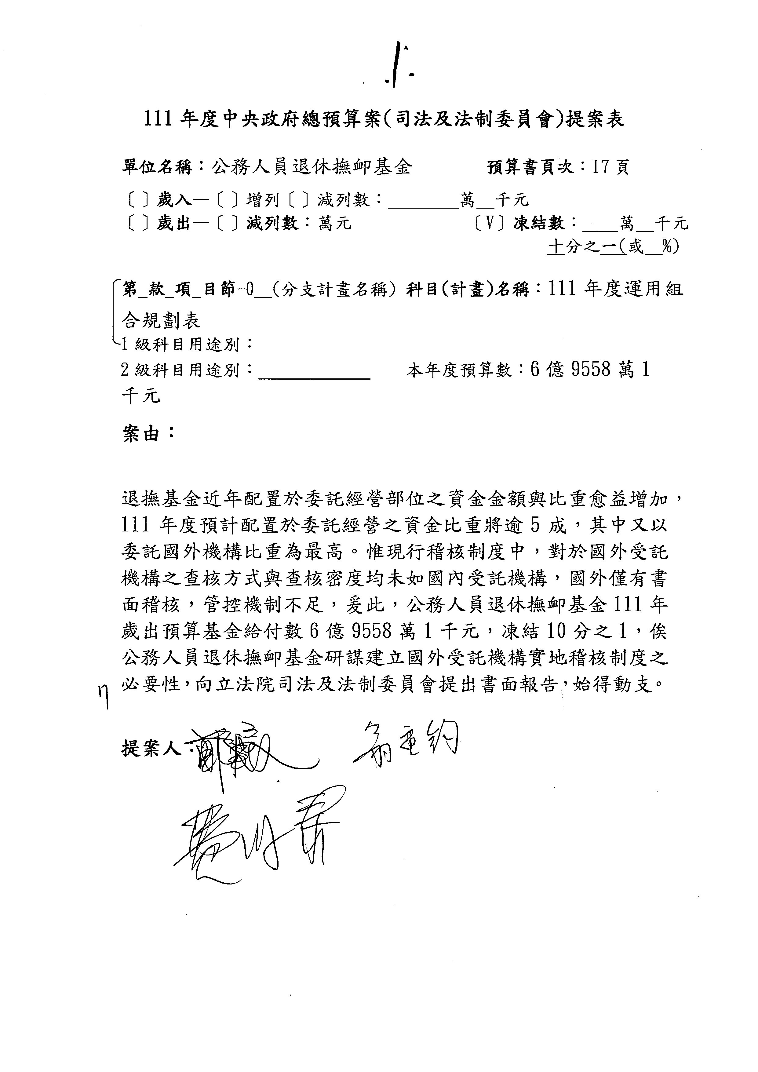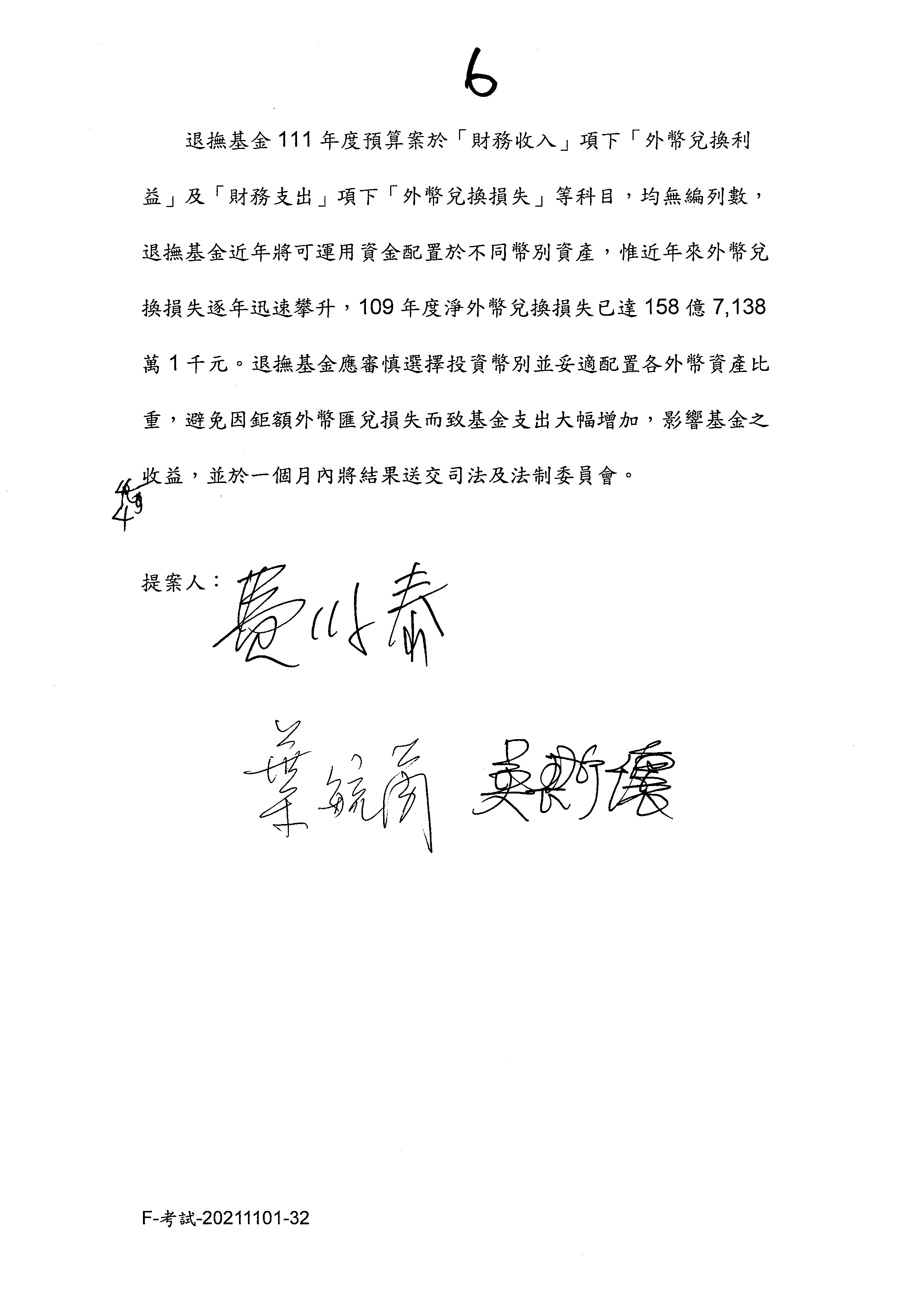 有關於本部111年度預算及基金管理委員會預算的部分,本部111年預算,歲入預算11萬1,000元,主要是減列了收回退休人員退職給與的部分;歲出預算編列249億9,631萬餘元,比110年度減少14億2,502萬元,主要是減列公務人員退休撫卹給付等經費。在基金管理委員會部分,歲入沒有列;歲出部分,歲出預算編列1億6,720萬1,000元,增幅大概4.42%,主要是增列員額6人的人事費用跟業務人員專業加給調整的經費。至於基金預算的部分,根據基金的收支預算,預算數是279億1,200萬元,比本年度增加26億9,400餘萬元,增幅大概是10.68%;總支出的部分,預算數是18億100萬元,主要就是經常性的手續費、代理費用跟匯費。報告到這裡,謝謝。