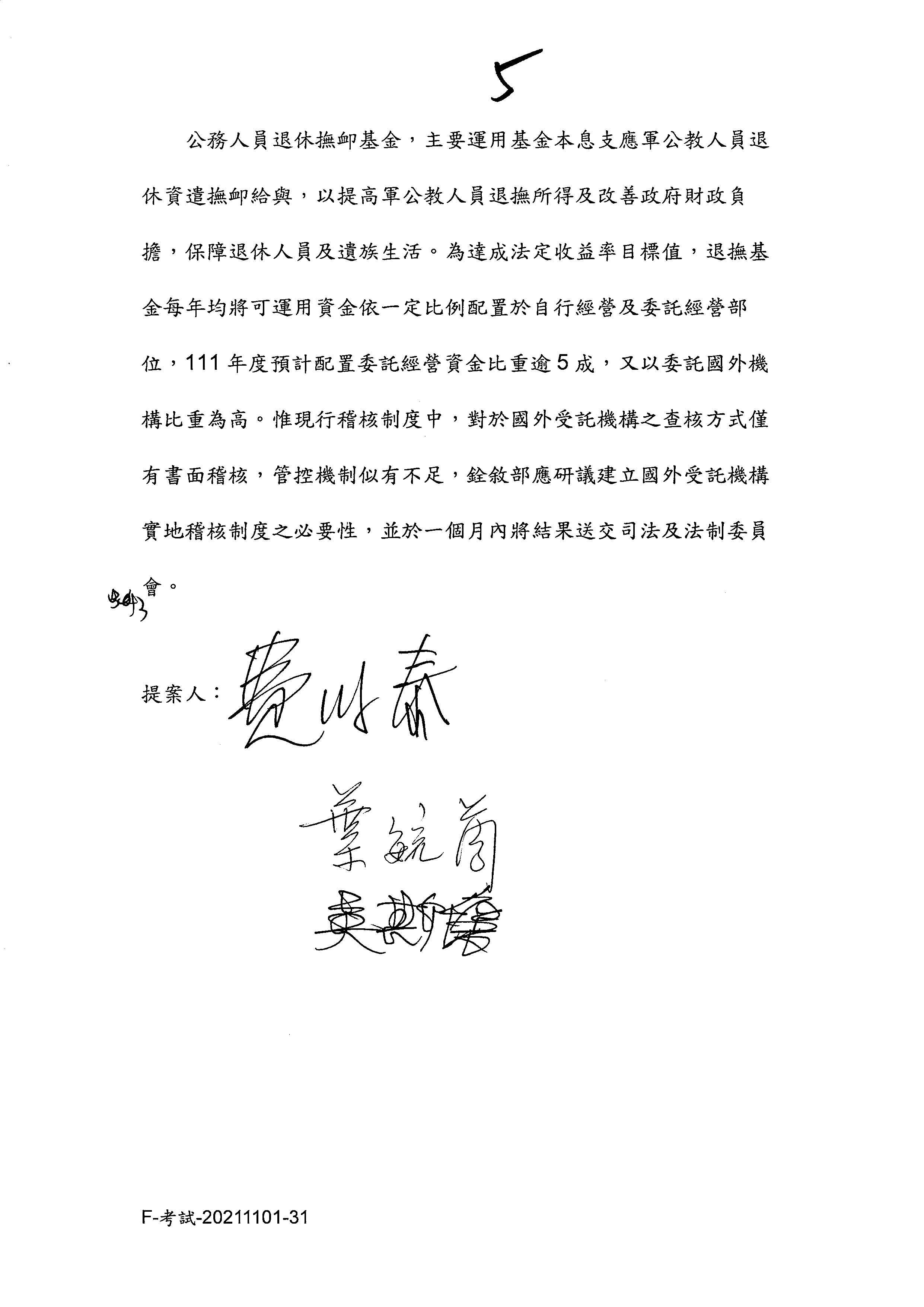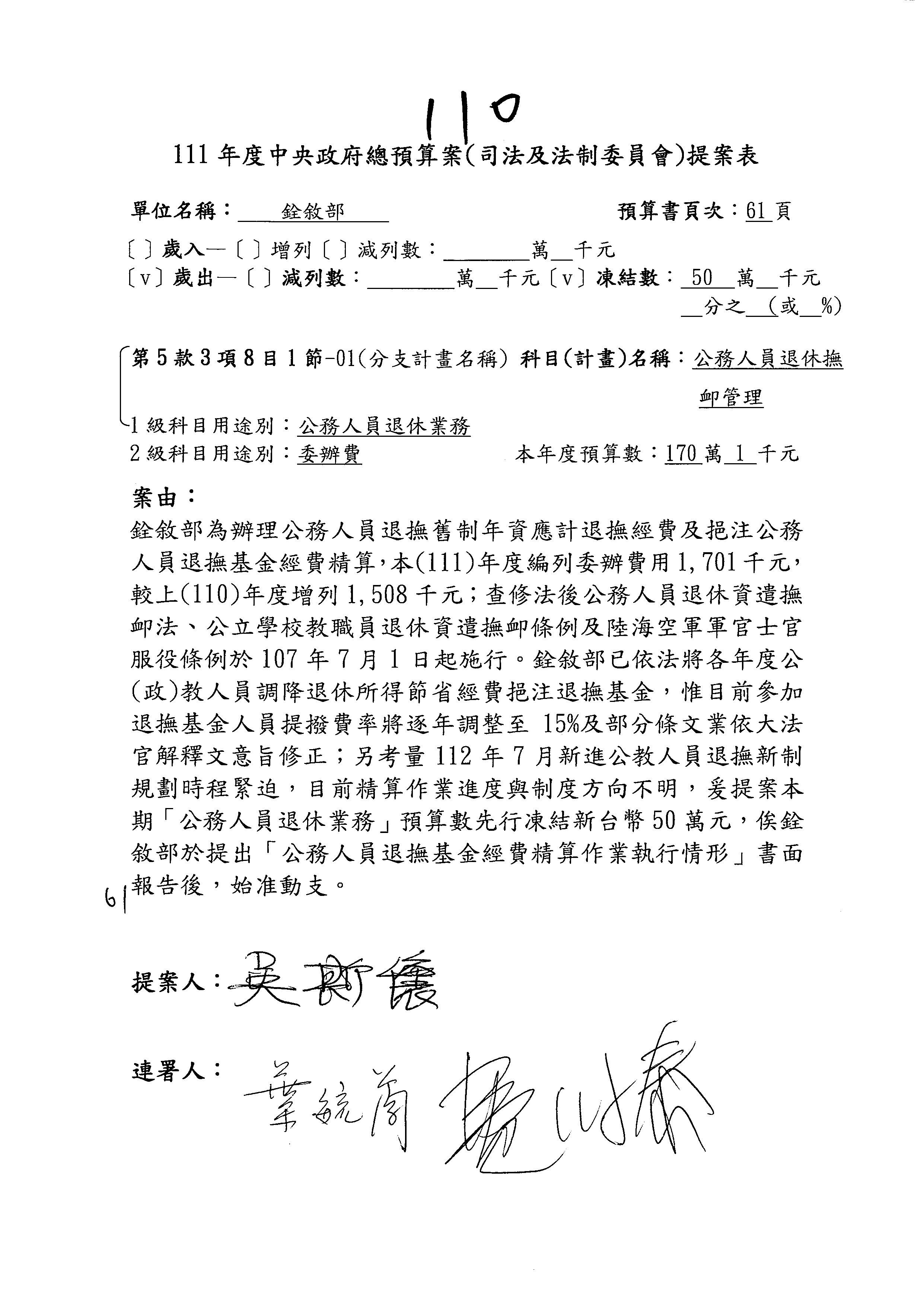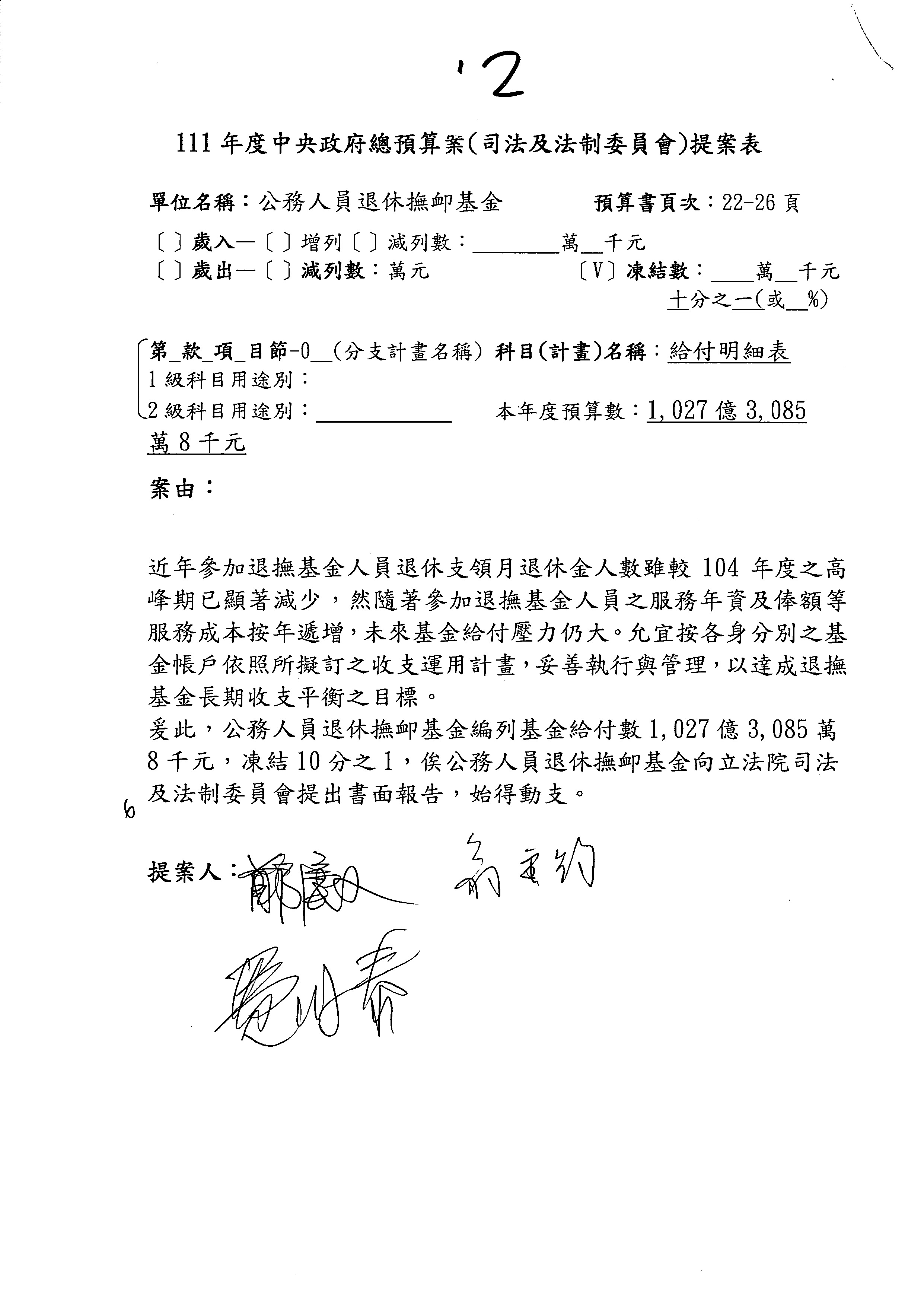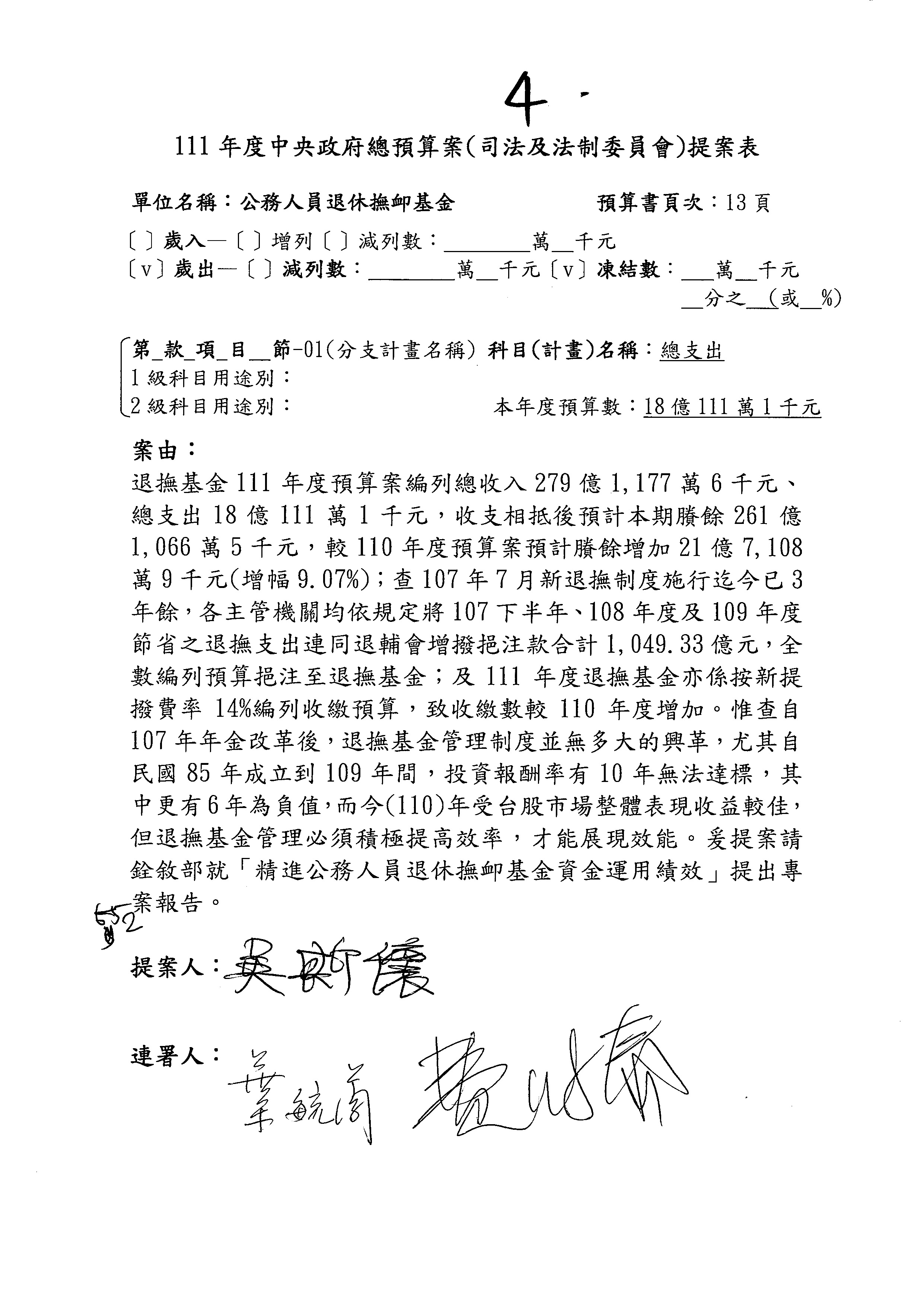 有關於本部111年度預算及基金管理委員會預算的部分,本部111年預算,歲入預算11萬1,000元,主要是減列了收回退休人員退職給與的部分;歲出預算編列249億9,631萬餘元,比110年度減少14億2,502萬元,主要是減列公務人員退休撫卹給付等經費。在基金管理委員會部分,歲入沒有列;歲出部分,歲出預算編列1億6,720萬1,000元,增幅大概4.42%,主要是增列員額6人的人事費用跟業務人員專業加給調整的經費。至於基金預算的部分,根據基金的收支預算,預算數是279億1,200萬元,比本年度增加26億9,400餘萬元,增幅大概是10.68%;總支出的部分,預算數是18億100萬元,主要就是經常性的手續費、代理費用跟匯費。報告到這裡,謝謝。