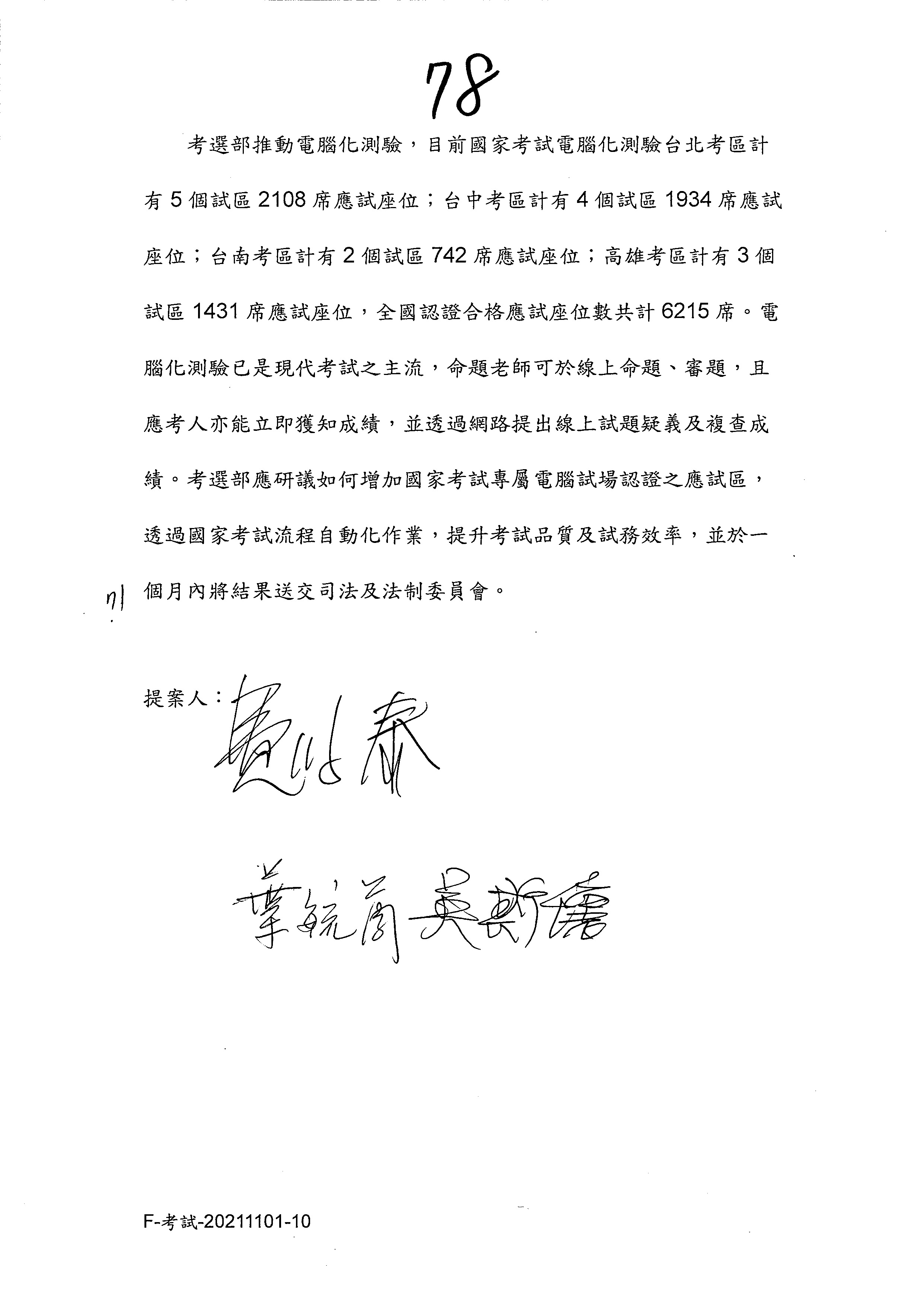 劉秘書長建忻:主席、各位委員、各位女士、先生,大家好。今天很榮幸能夠列席貴委員會做業務報告跟明年度預算收支的說明,也藉這個機會感謝各位委員這一年來對考試院團隊的指教跟支持。今年3月我們曾經在貴委員會報告報告考試院的工作重點,半年來其實也有很長足的進展。在本院的數位轉型方面,我們積極推動擴大國家考試電腦化、全院資安聯防以及國家考試及格證書數位化的規劃,另外還有資料開放跟人力資料庫的整合運用,以及加強公務人員數位能力的培訓等等業務,都積極在推動。在考訓政策的革新方面,我們配合國家雙語化跟新南向政策來調整相關考試的規則,也強化雙語培訓。另外也針對各用人機關的需求持續調整考試的類科跟內容,改善考用落差的問題。另外,我們司法改革國是會議決議的法律專業人員資格跟任用制度,也經過很多次的跨院工作會議,將儘速向貴院提出法案。