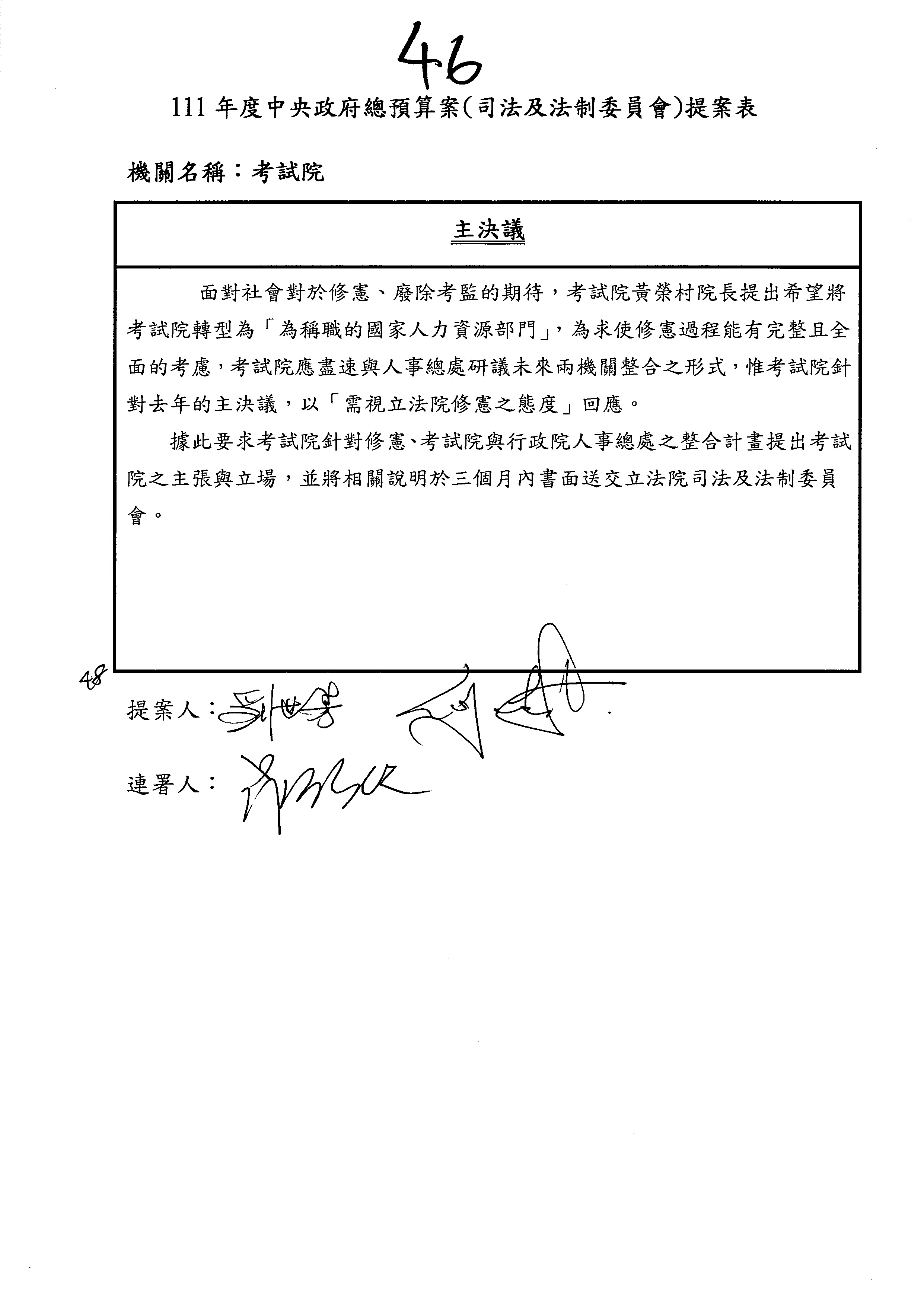 劉委員世芳:我跟考試院尤其是政務官的同仁講一下,我們到政黨協商之前,如果個別的提案委員可以撤案或改主決議、改其他方式,其實你們還是有努力的空間,就是我剛剛跟各位提到的,因為短暫的溝通時間不夠的話,會造成委員跟官員溝通上的困擾,如果你們可以越快處理好,在政黨協商時,到最後就只剩幾個案子處理,要麻煩你們在這些時間趕快去協商。