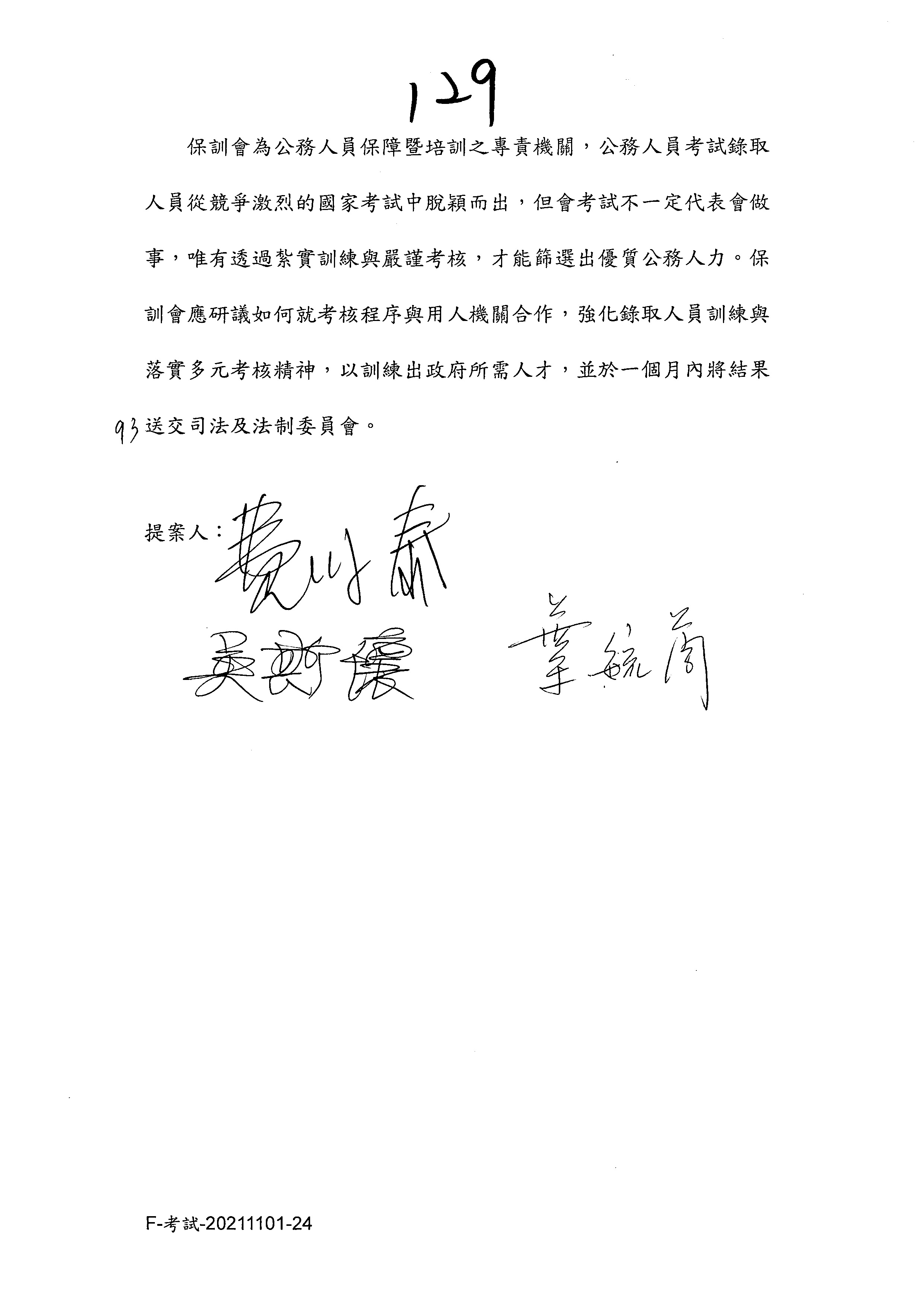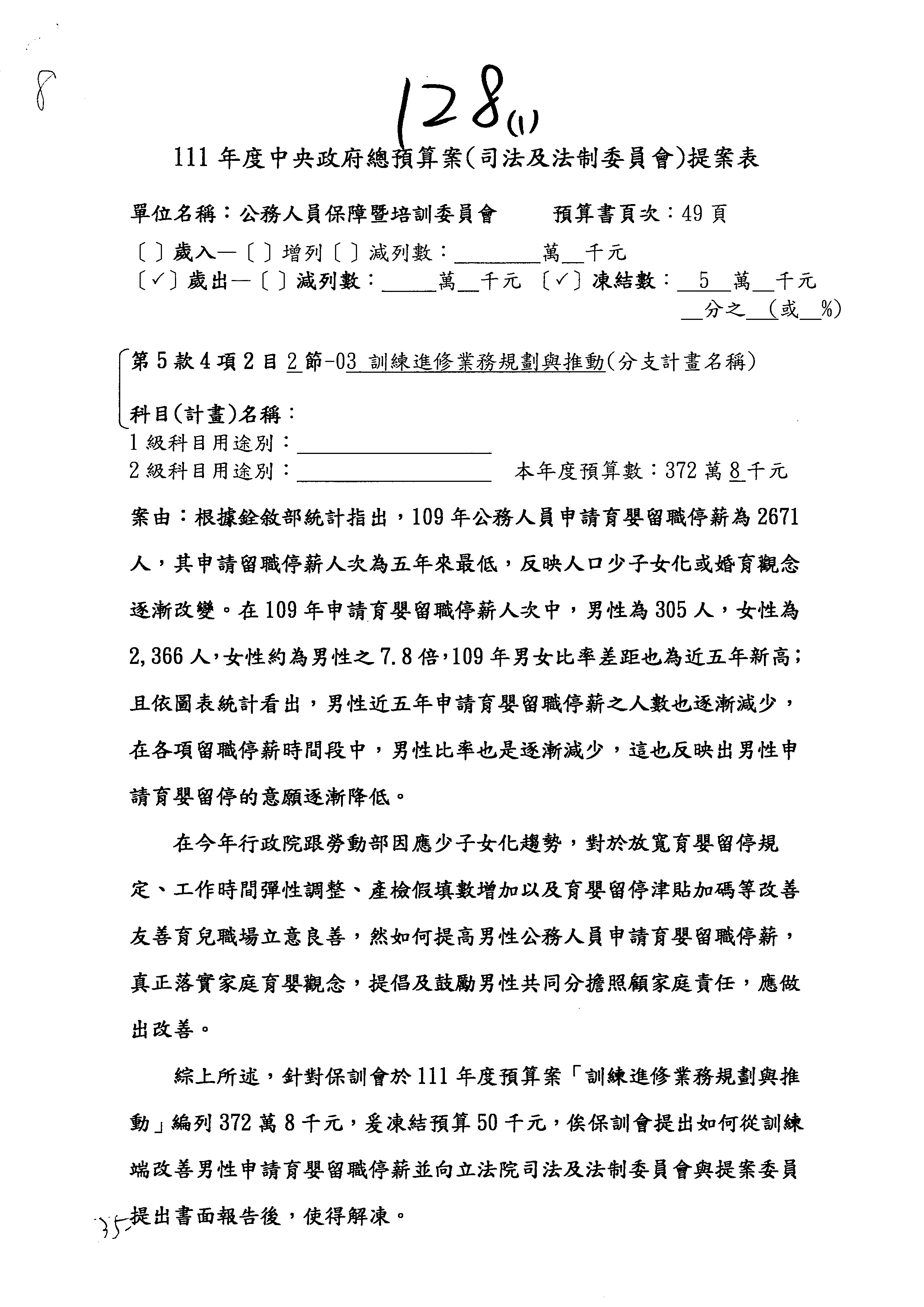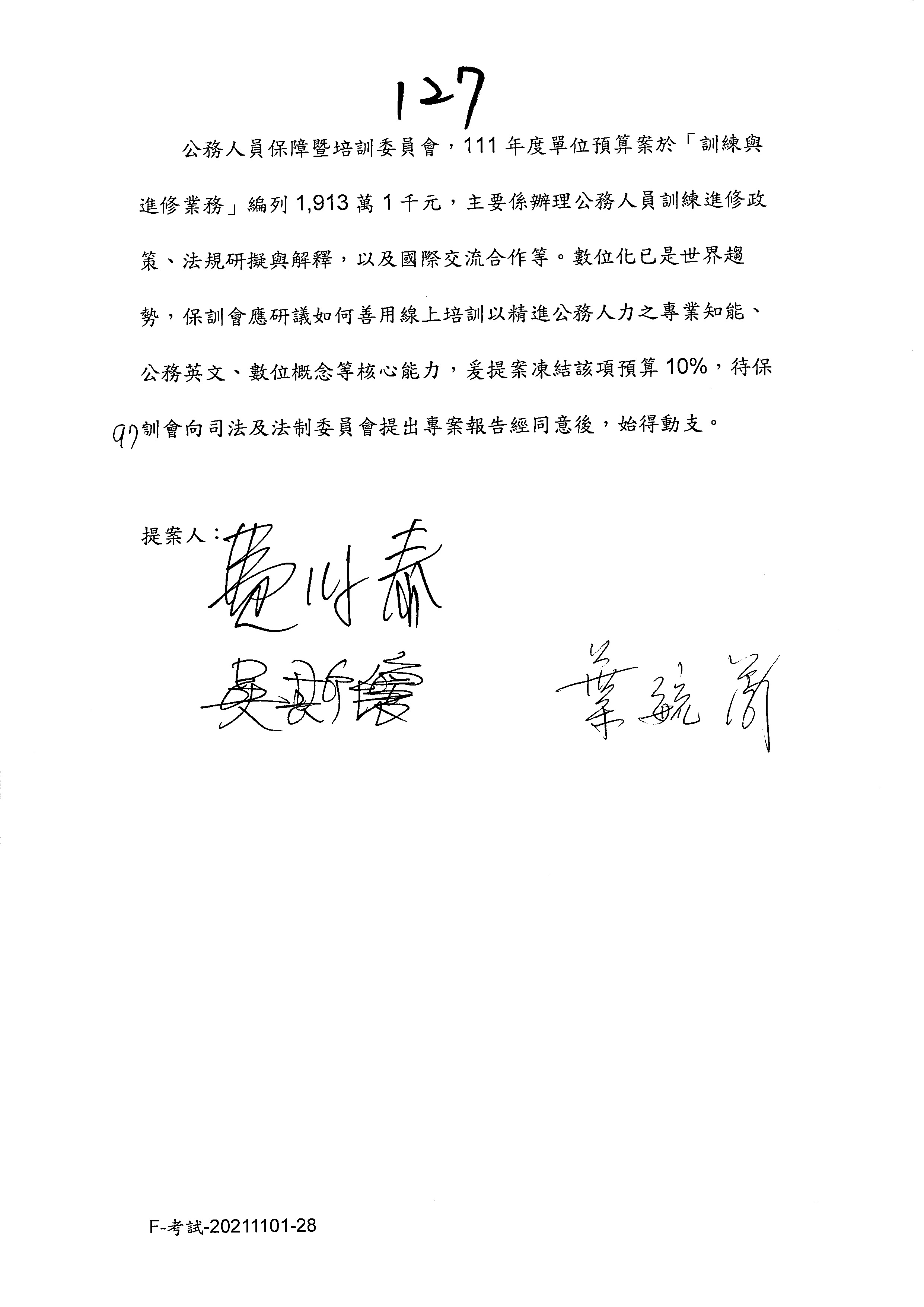 郝主任委員培芝:第121案是葉委員關心訓練進修法的修法進程,這部分也建議凍5萬元,改書面報告。第122案也是葉委員關心如何精進公務人員安衛辦法,這部分我們也是建議除了文字修改之外,能夠凍5萬元,提書面報告。第123案也是葉委員的案子,這部分希望適時辦理本會的一些資訊公開,已經同意改為主決議。第124案是葉委員關心保障法第二十三條相關的修法內容,我們建議凍20萬元,提書面報告。第127案是費委員關心如何精進線上培訓的部分,我們也已經跟費委員辦公室溝通,他也同意改凍結5萬元,提書面報告後解凍。第128案黃委員的提案,關於如何在培訓端精進男性育嬰留停的做法,我們也同意凍結5萬元。第129案主決議也跟費委員辦公室溝通過,我們是同意的,但是在期限的部分從1個月改3個月。