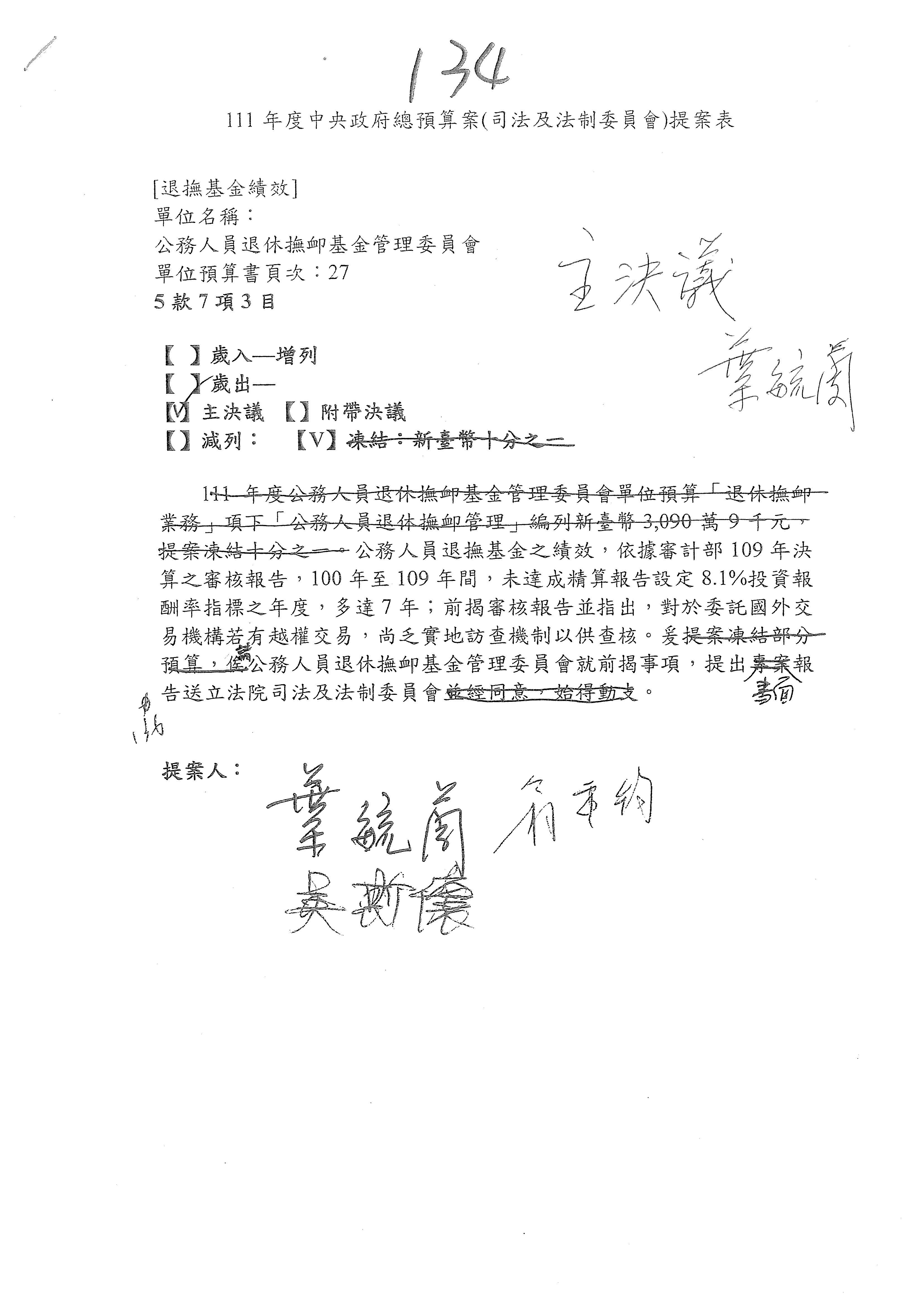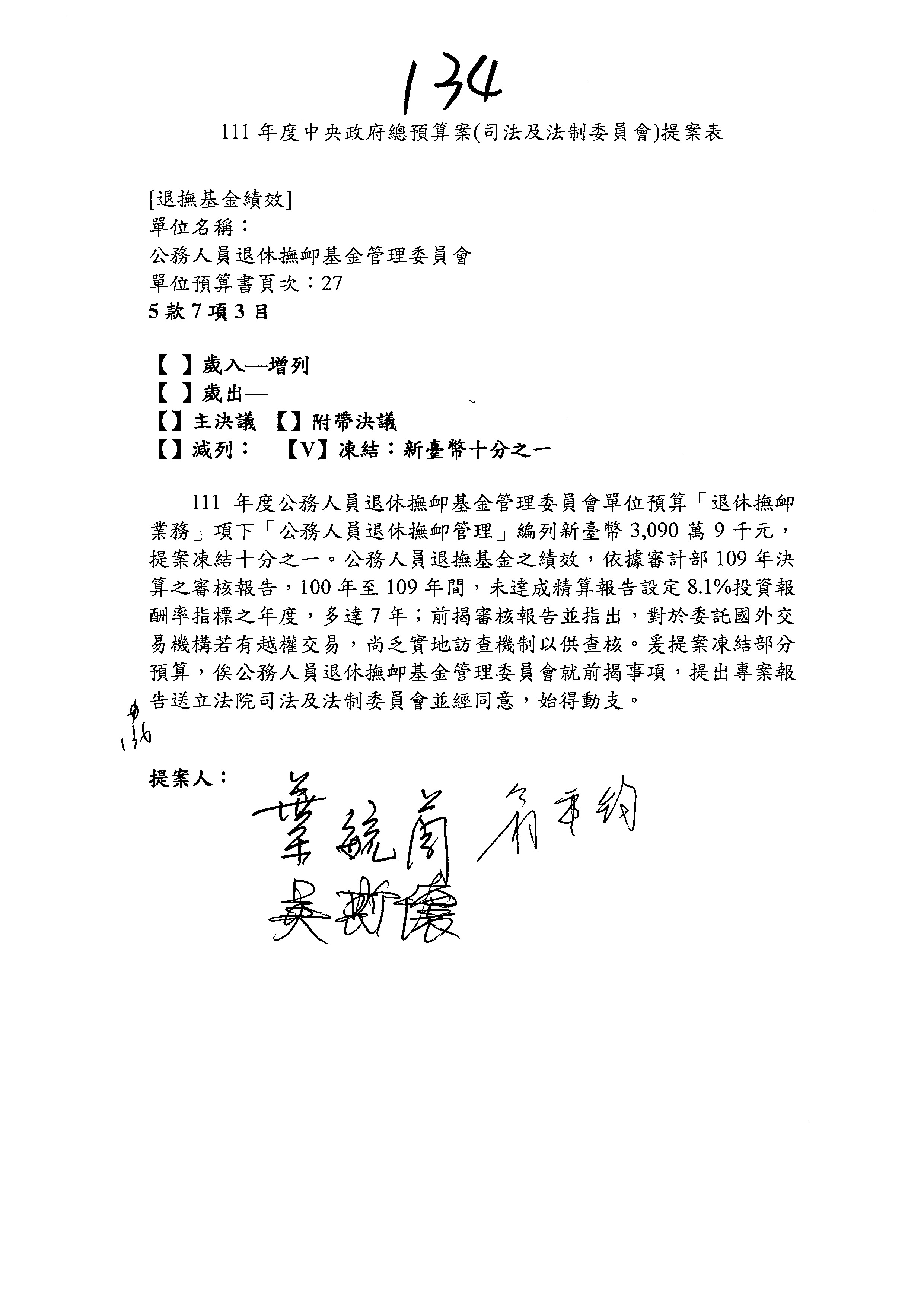 周部長志宏:第134案剛剛我們跟葉委員溝通,改主決議,另外有一個凍結。