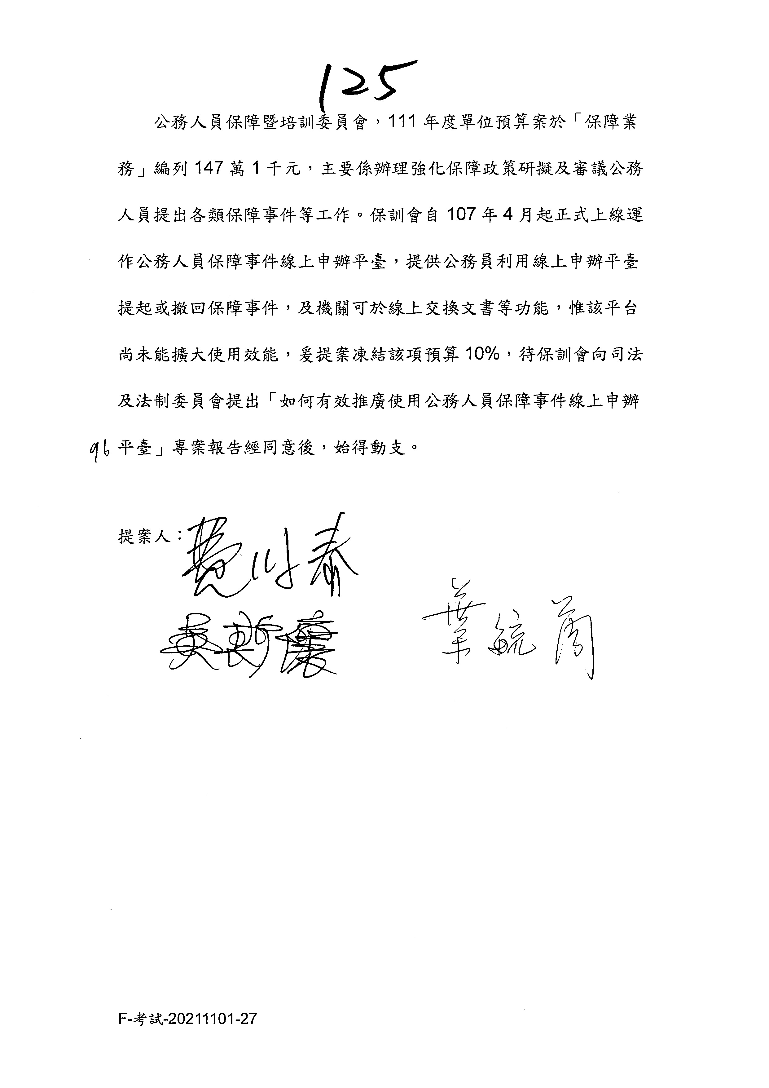 主席:但是他們有的減列、有的凍結,而且第125案你有跟費委員溝通過了嗎?