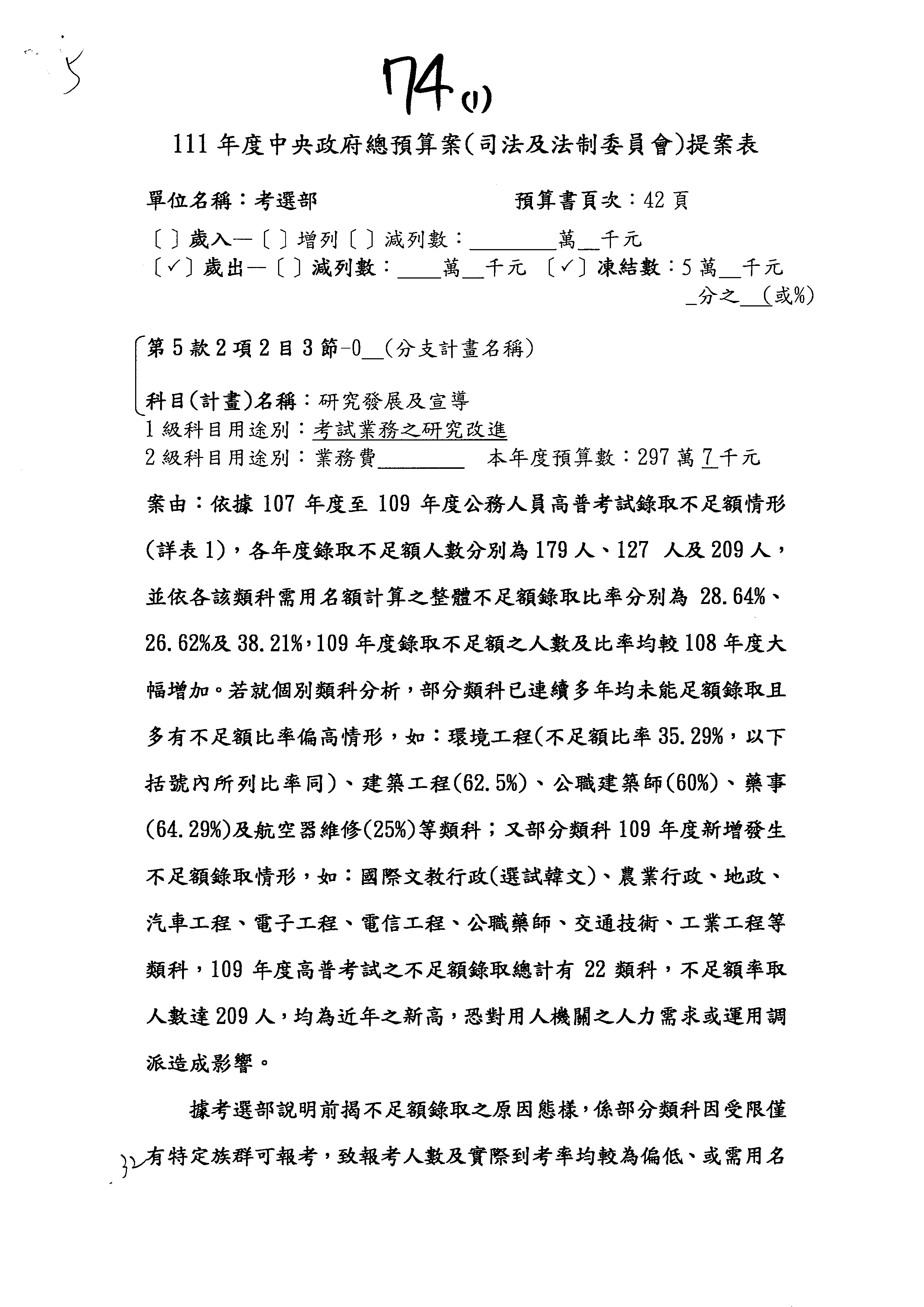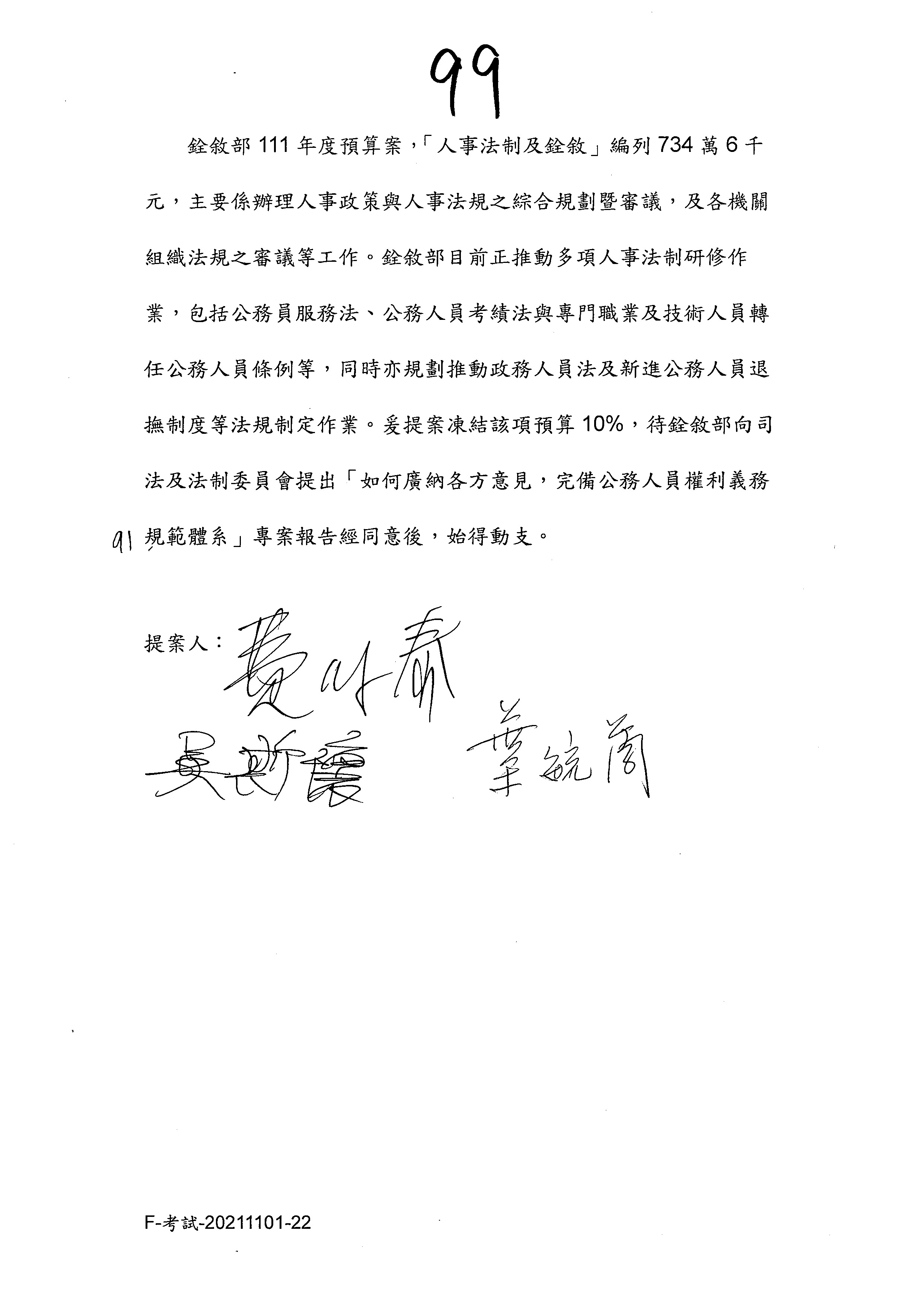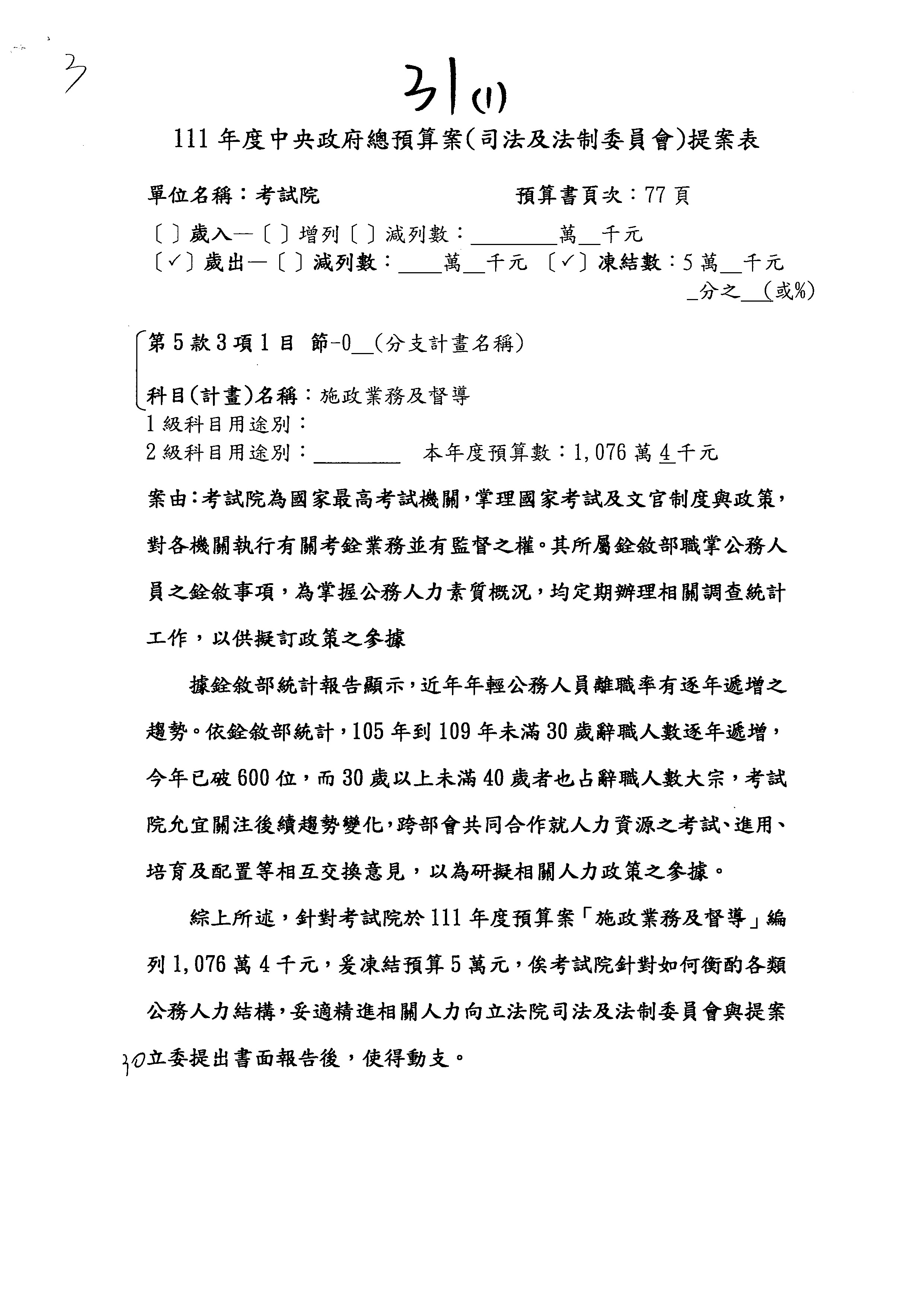 一、審查111年度中央政府總預算案關於考試院及所屬主管收支部分。
