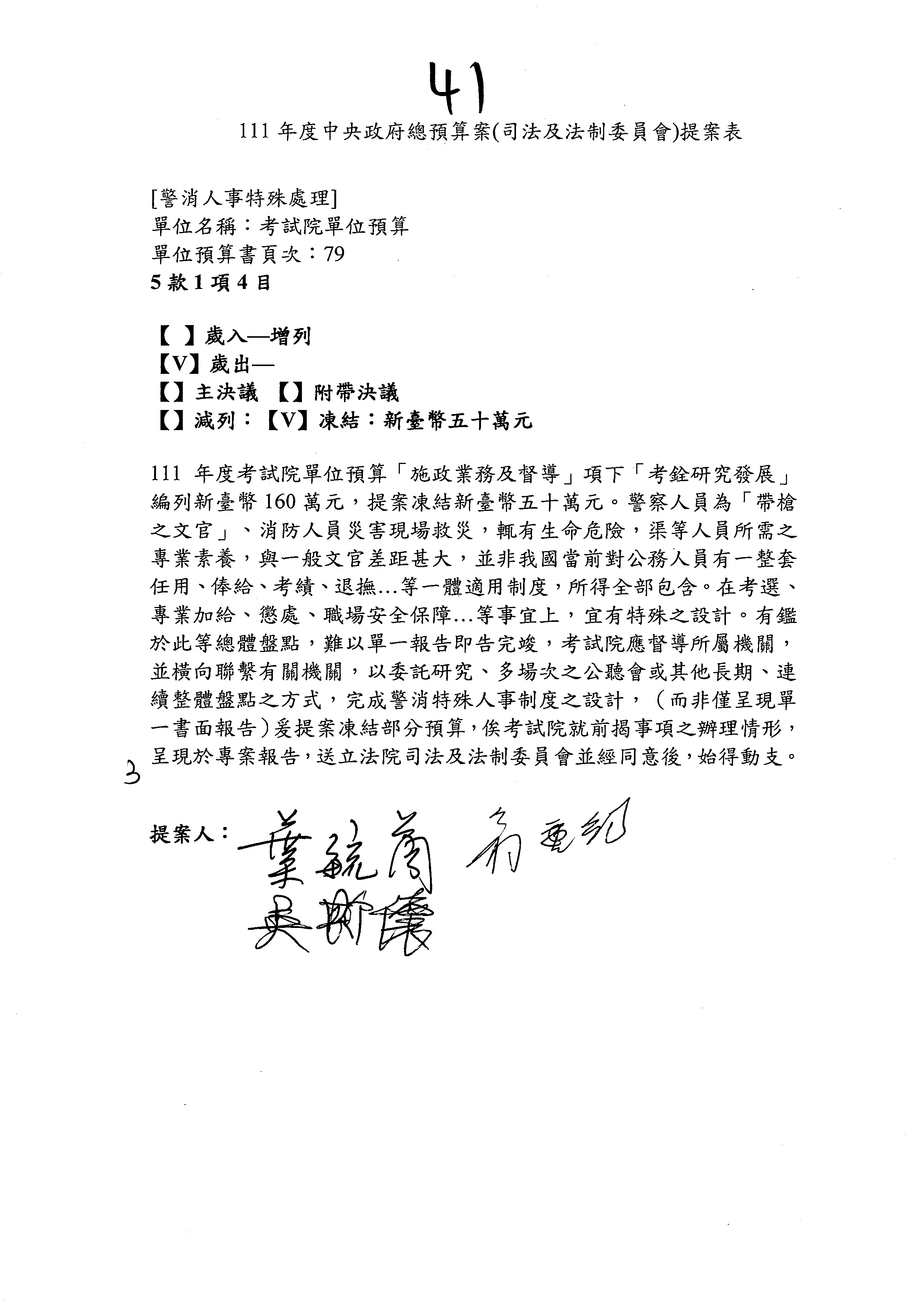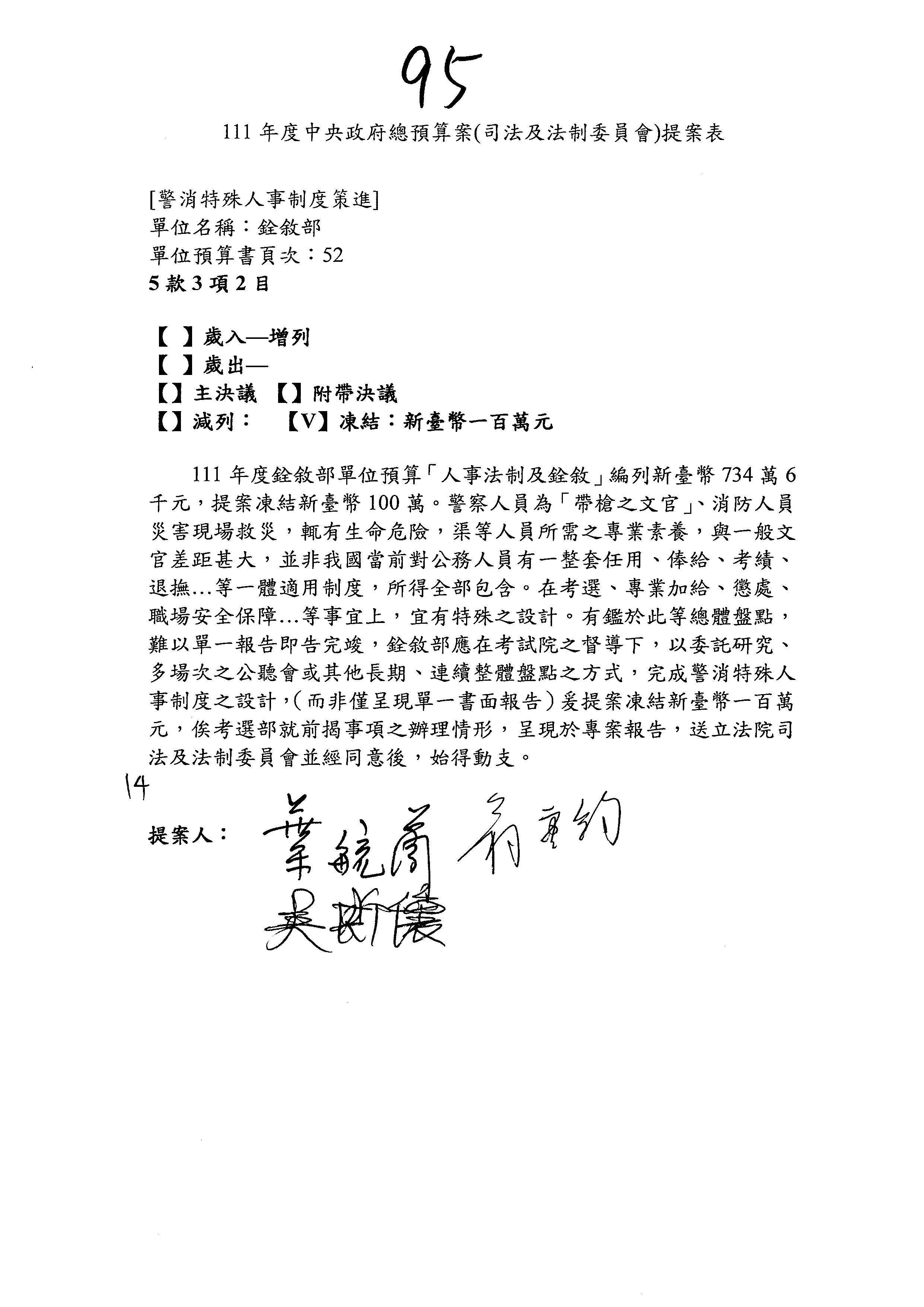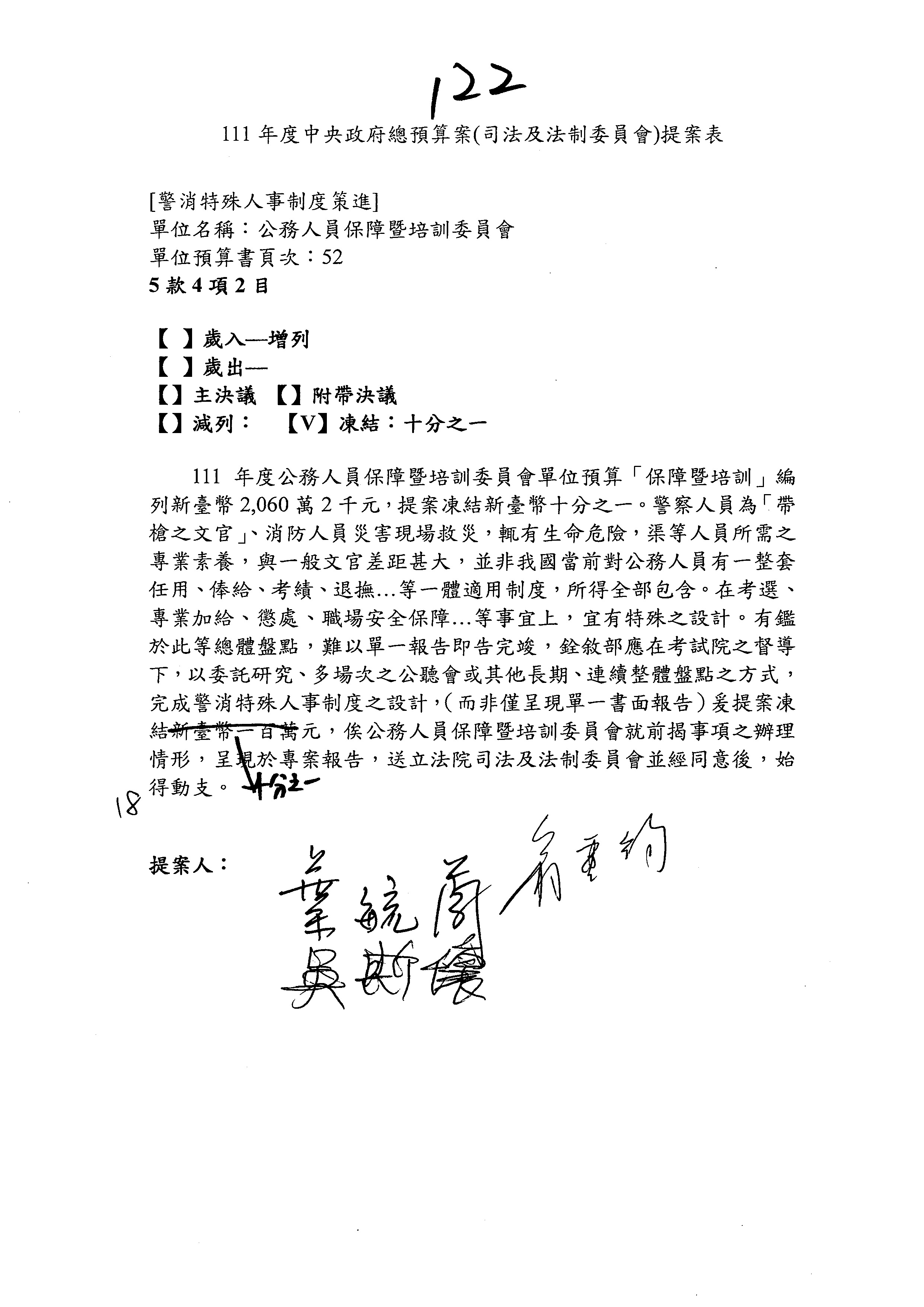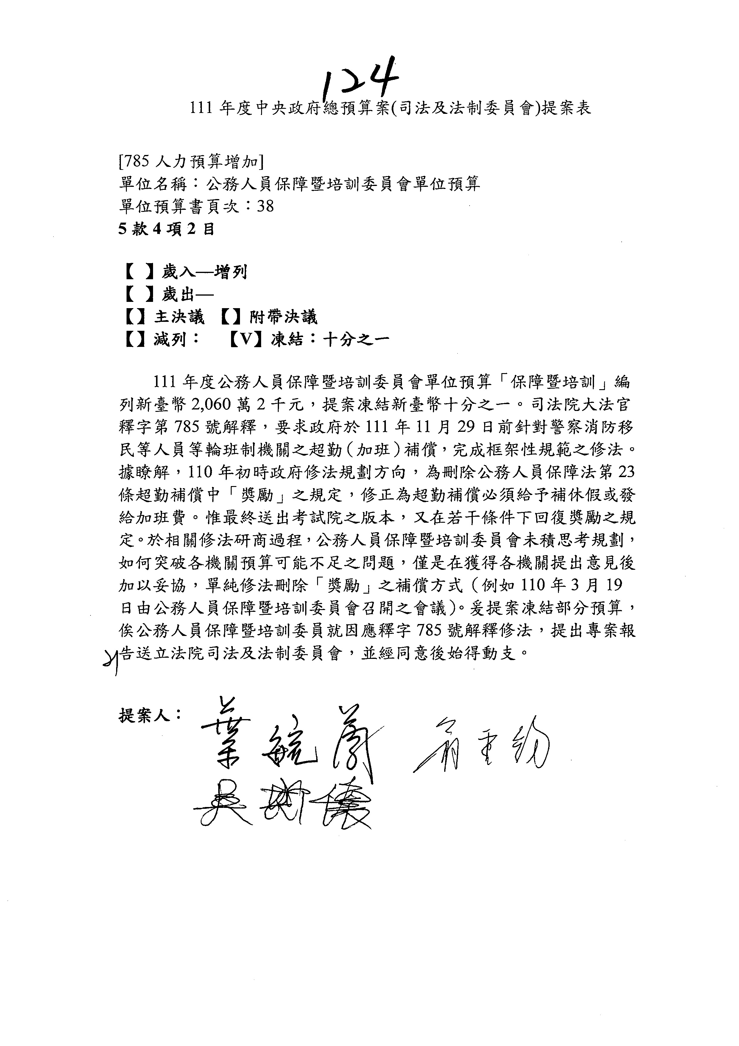 葉委員毓蘭:第124案雖然你們有來溝通,但是對我來講,我早上質詢時特別提過,因為這是警消的陳痾,所以如果不多凍一點,你們對警消這邊要有一點嚇阻力量,不要以後又恢復成30小時換1支嘉獎,千萬不要讓他們有獎勵的任何可能,凍50萬元我就接受,然後提書面報告。