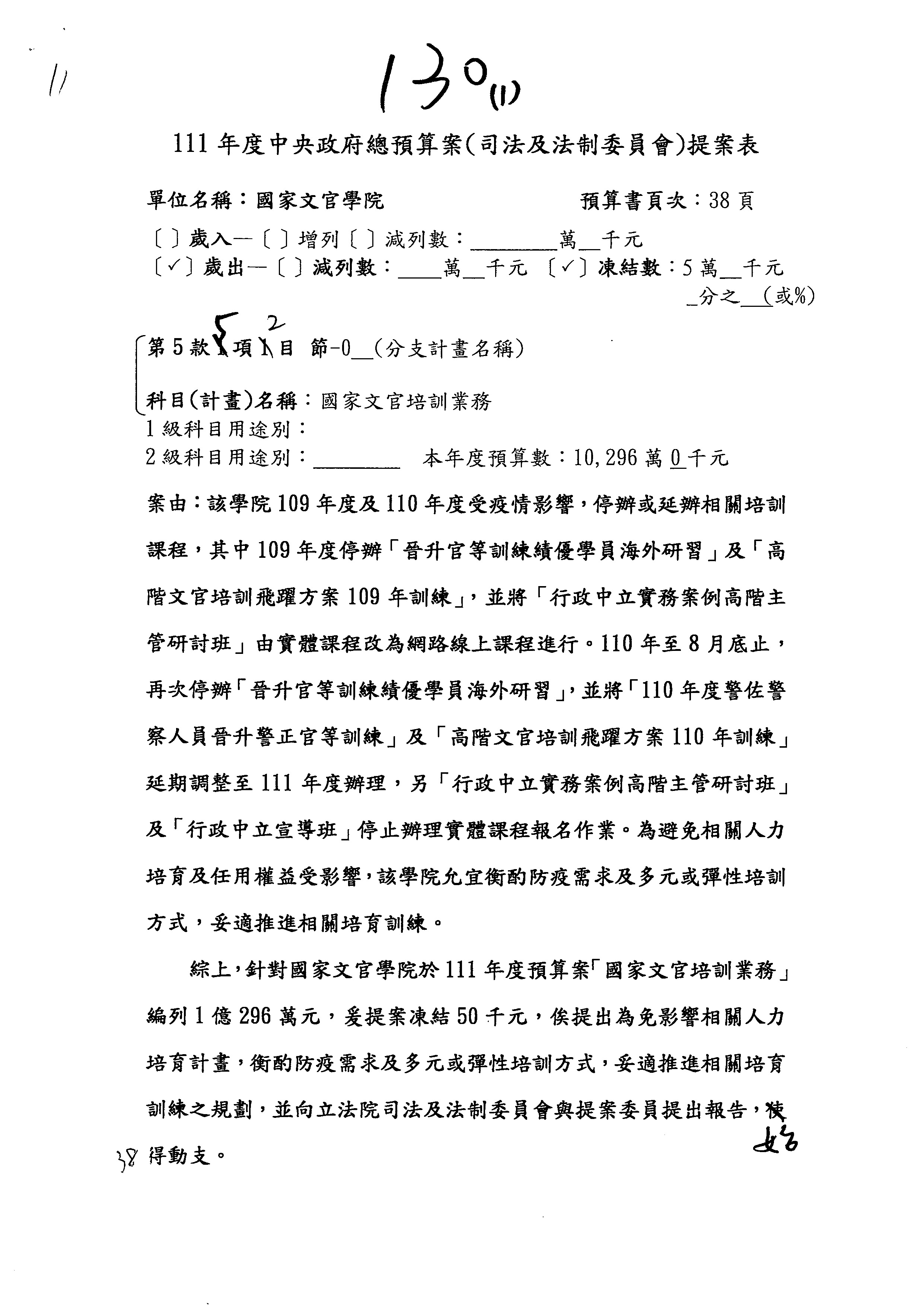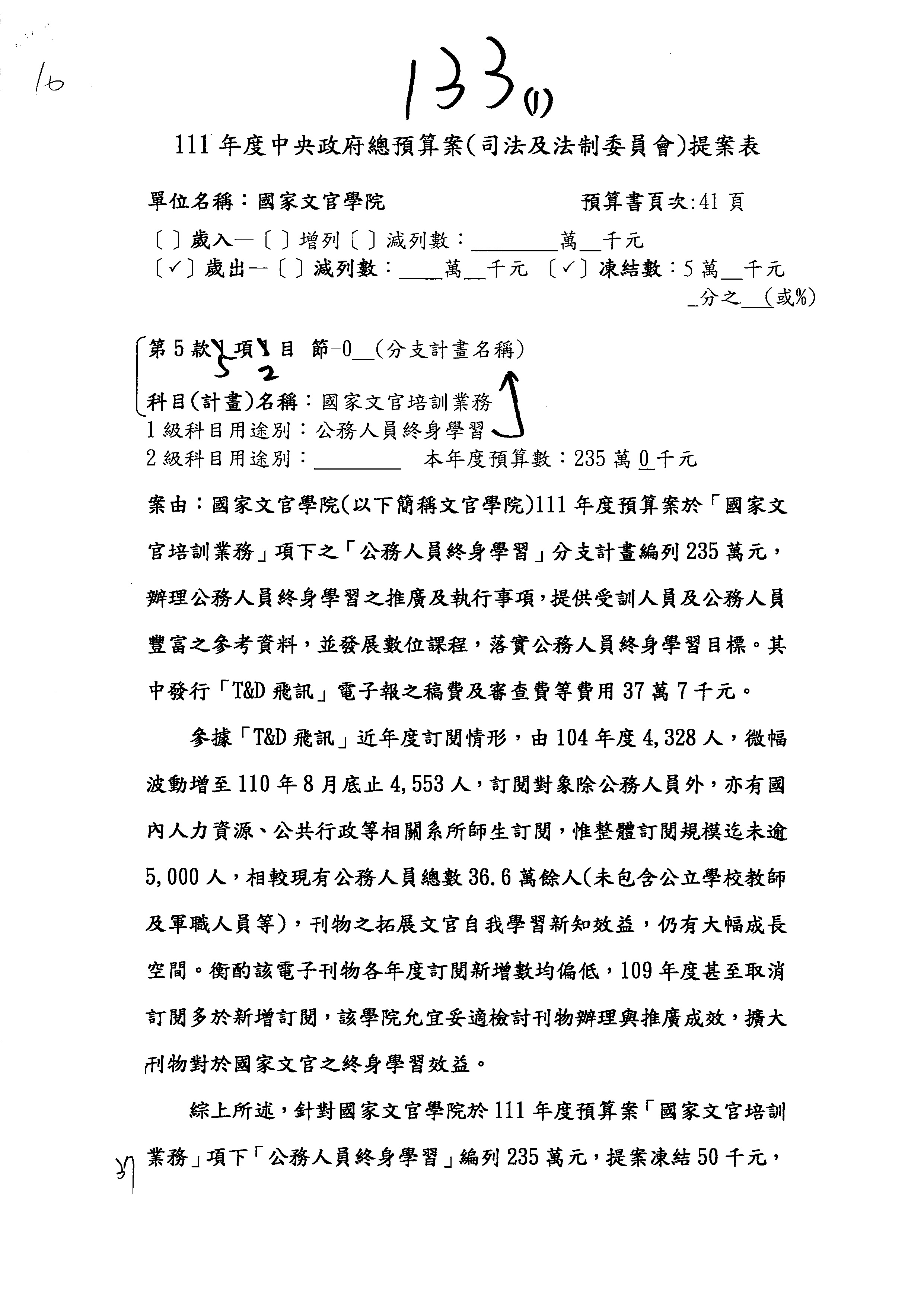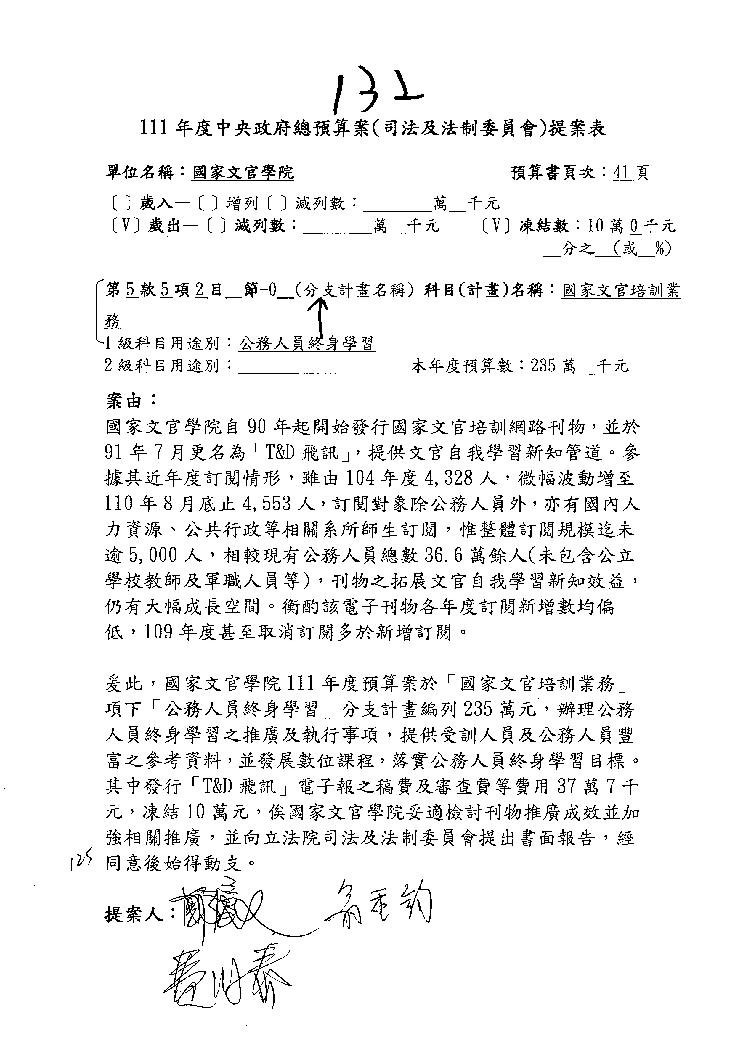 郝主任委員培芝:我們也是建議第132案、第133案併案處理,都是對於我們國家文官學院電子刊物「T&D飛訊」,性質是完全一樣的,所以希望兩案併案凍結5萬元,提書面報告後解凍。