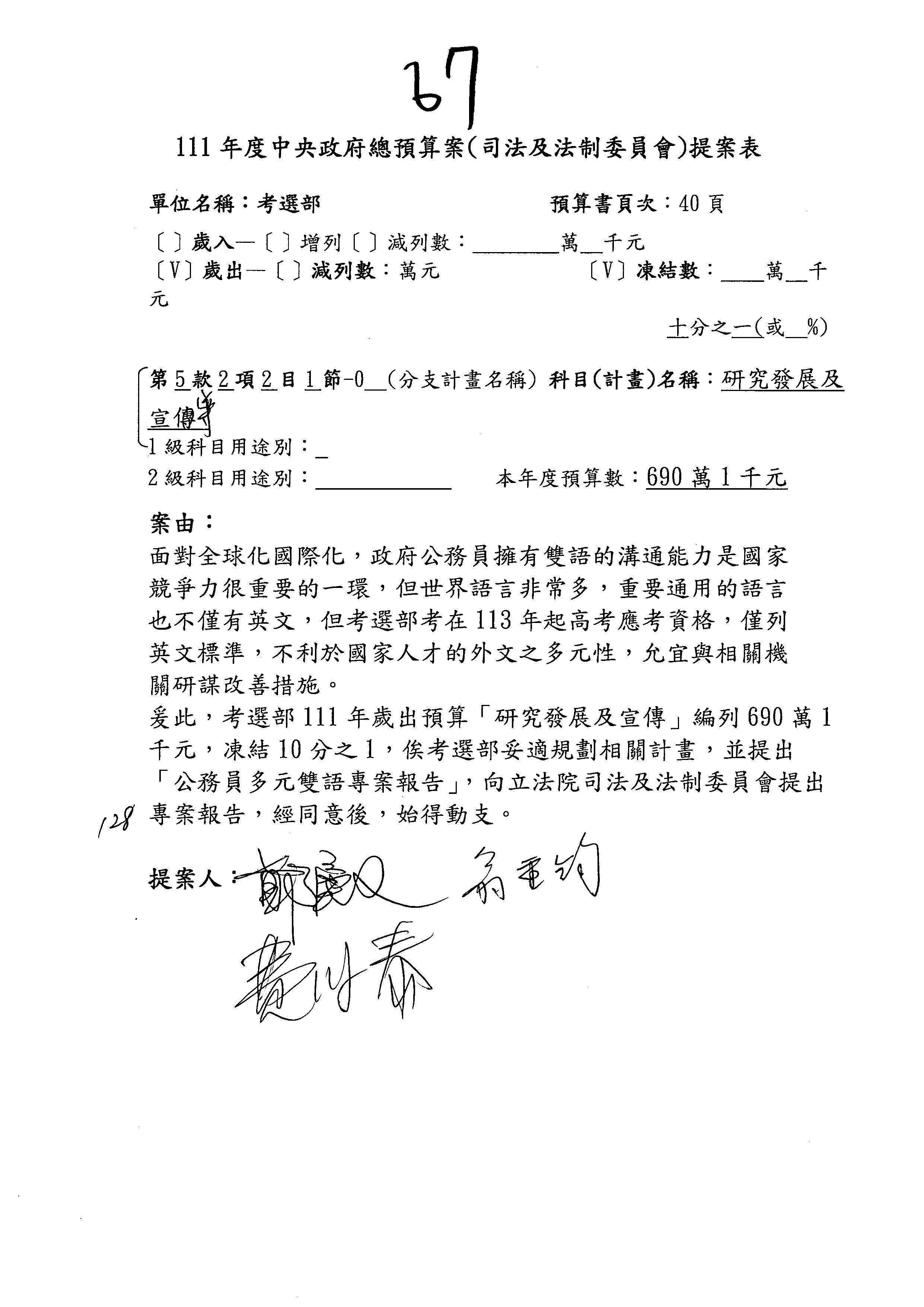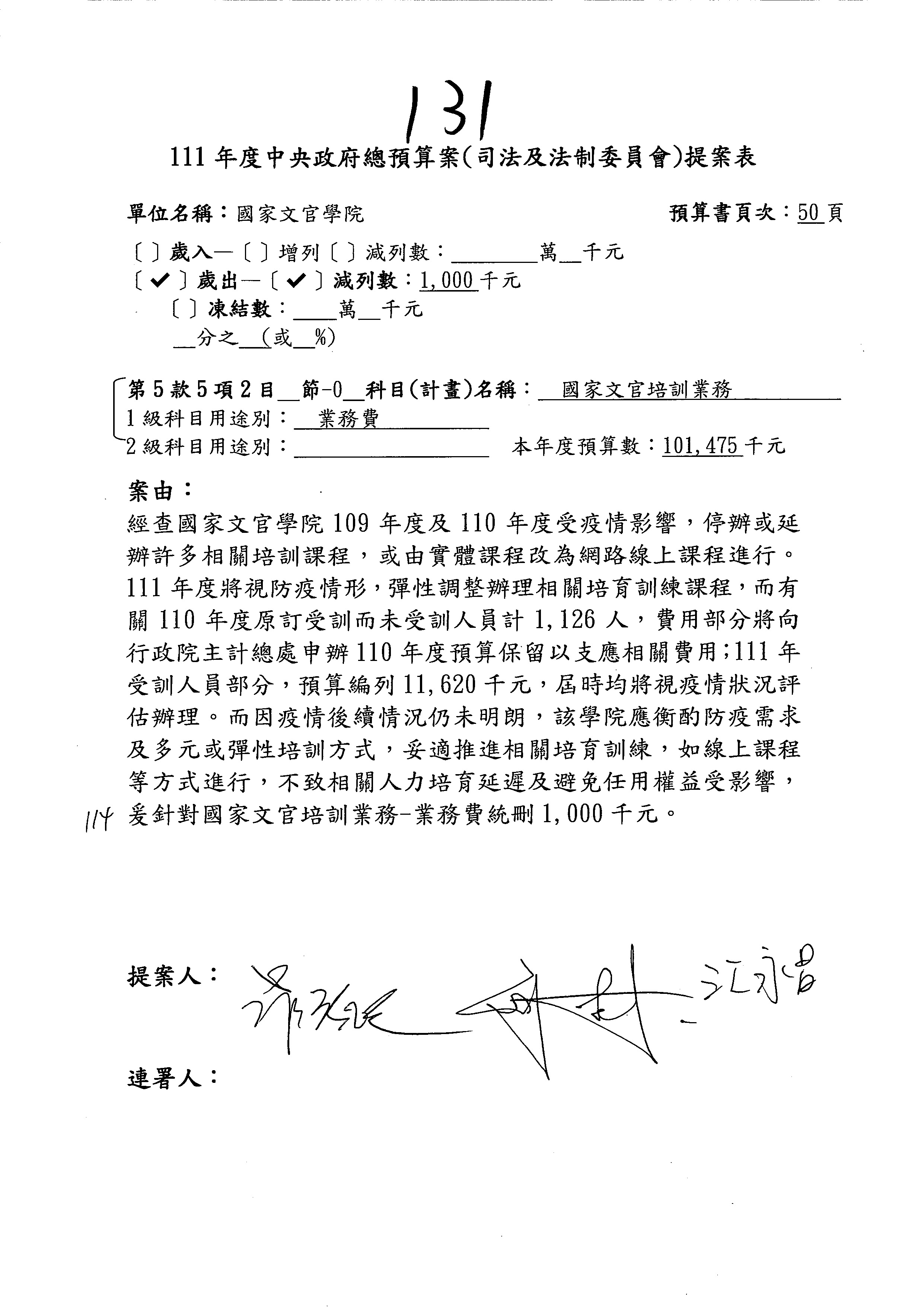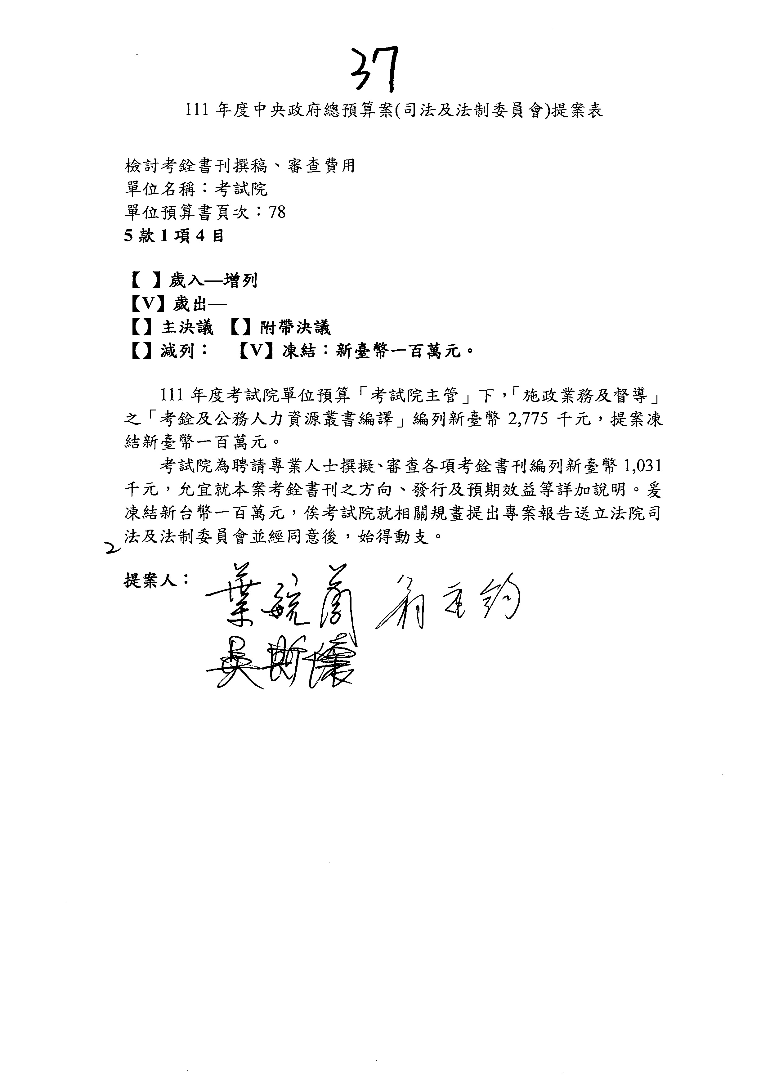 郝主任委員培芝:我們也是建議第132案、第133案併案處理,都是對於我們國家文官學院電子刊物「T&D飛訊」,性質是完全一樣的,所以希望兩案併案凍結5萬元,提書面報告後解凍。