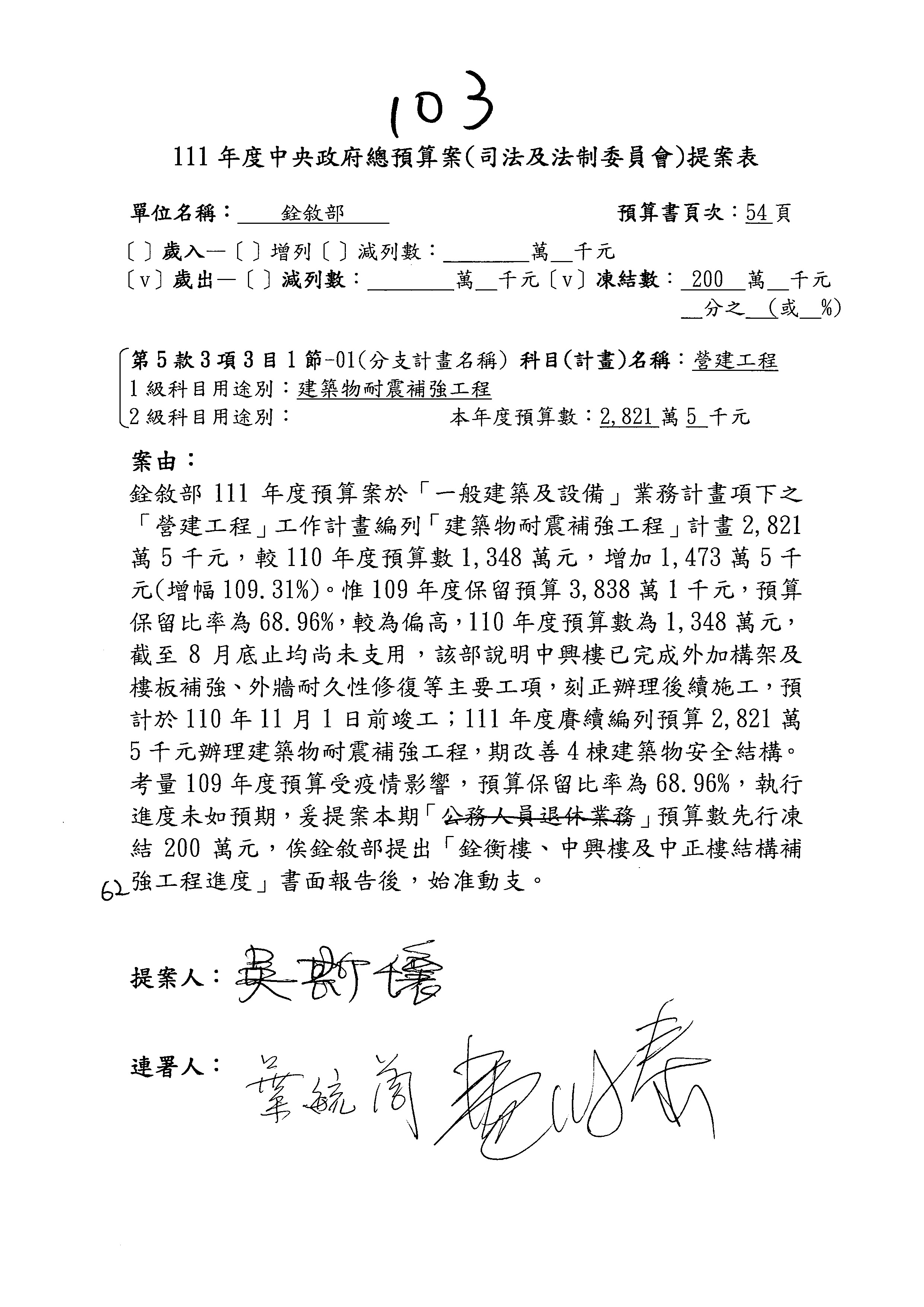 葉委員毓蘭:剛剛吳斯懷委員離開之前也先跟部長溝通過,這兩個案子凍結數?