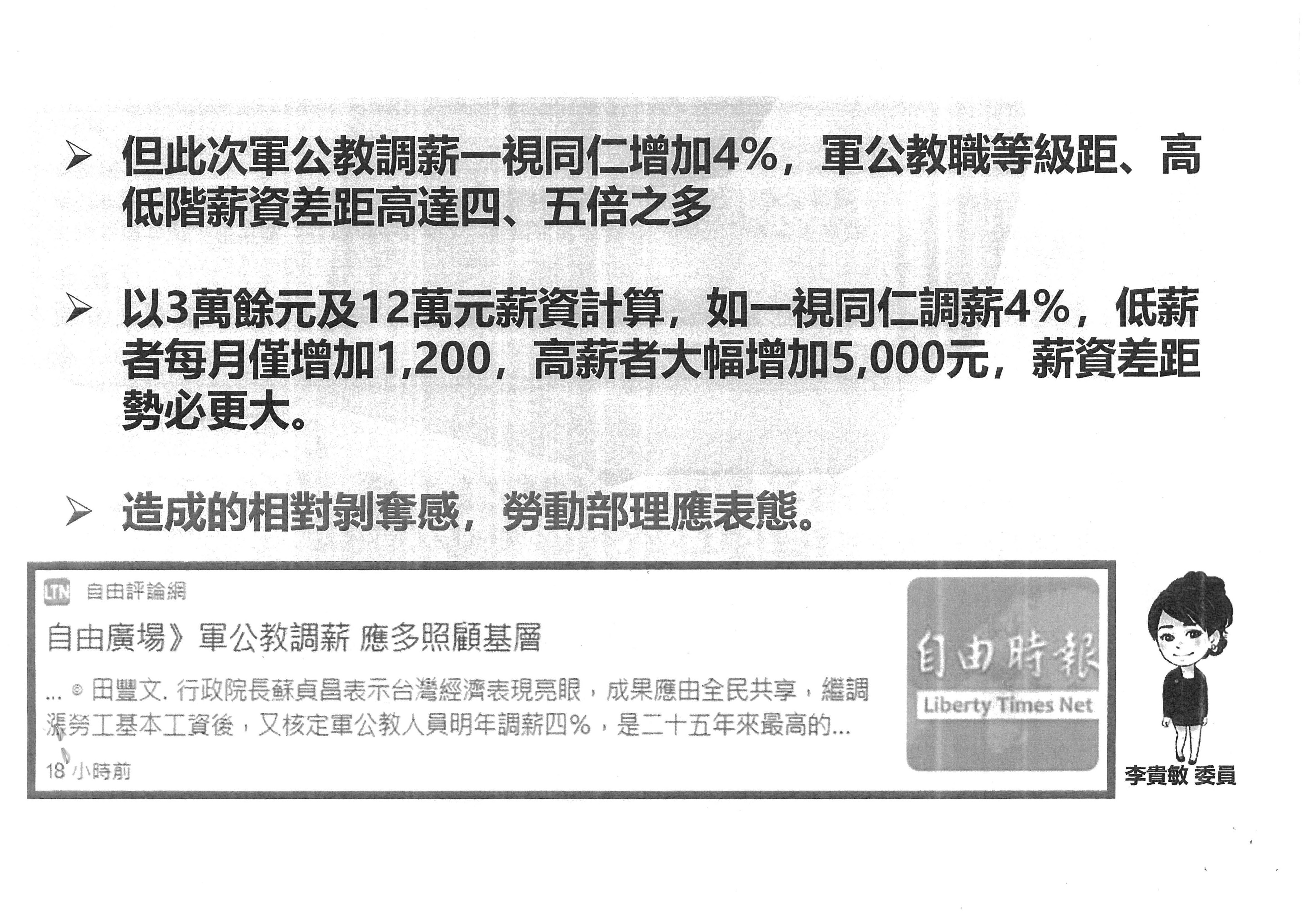 一、有鑑於明(111)年度勞工基本薪資及軍公教薪資均已確定調漲,行政院蘇貞昌院長亦多次強調,軍公教調薪是為國家經濟發展果實應由全民共享;依據行政院主計總處預估今年實質經濟成長率5.88%,財政部公布1至9月份稅收實徵金額達2兆2,380億餘元,較去年同期增加22%,顯然並無政府財政困難窘困情形;然已退休(伍)之公教軍警消人員於年金改革期間,配合政府共體時艱,溯及往刪減退休(伍)給付,所得替代率連續調降10年,但重要民生物資不斷上漲,致影響該等實質退休所得,況大法官釋憲亦說明針對退休金設定固定所得替代率,此與公教軍年改日後僅「得」調整規定有所衝突。爰請銓敘部、教育部、國防部儘速召開審議小組會議,提出「已退休公務人員、公立學校教師及軍人退休(伍)給付調整方案」專案報告。