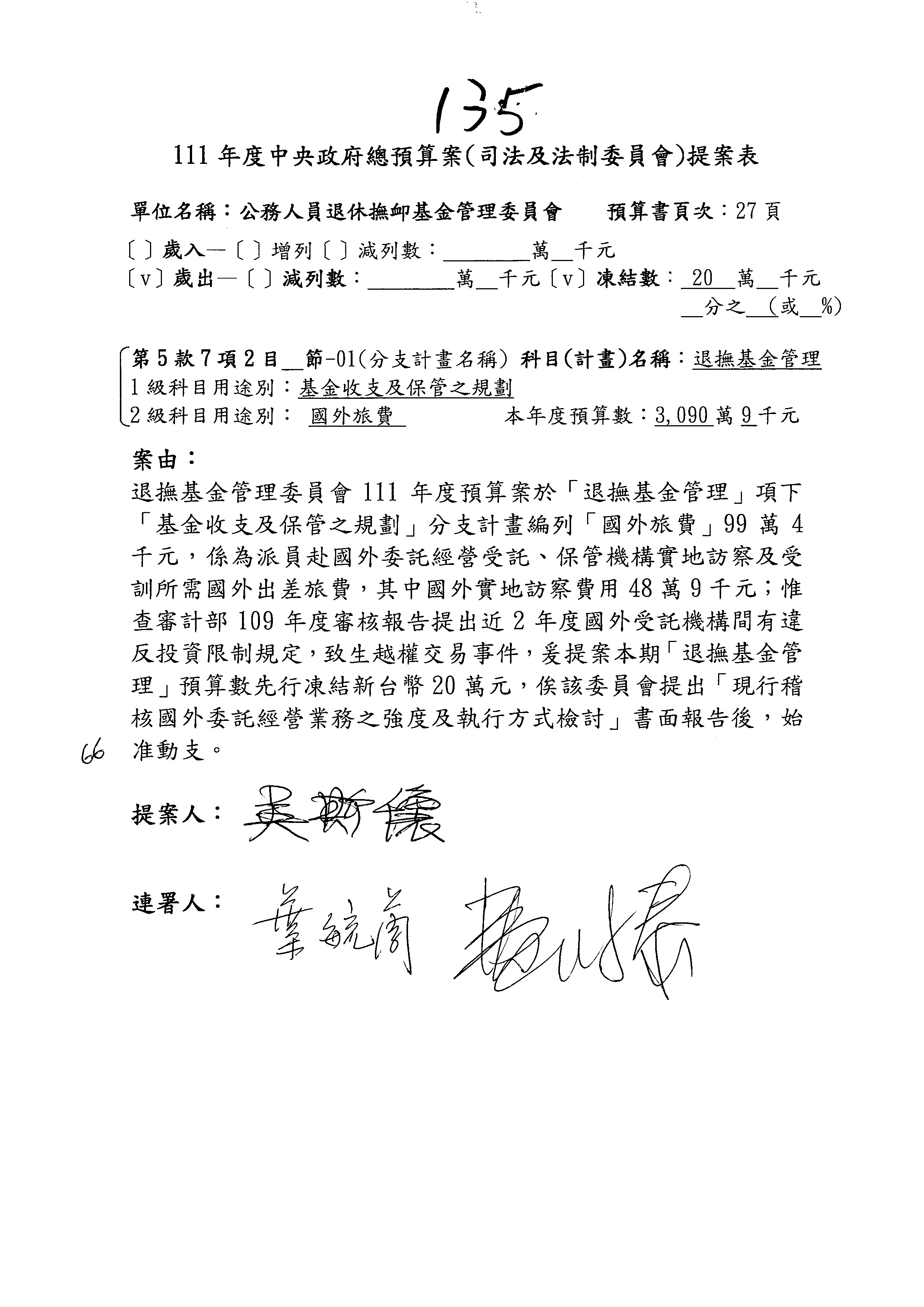 主席:第134案改主決議;第135案、第136案併案凍結20萬元,交書面報告。