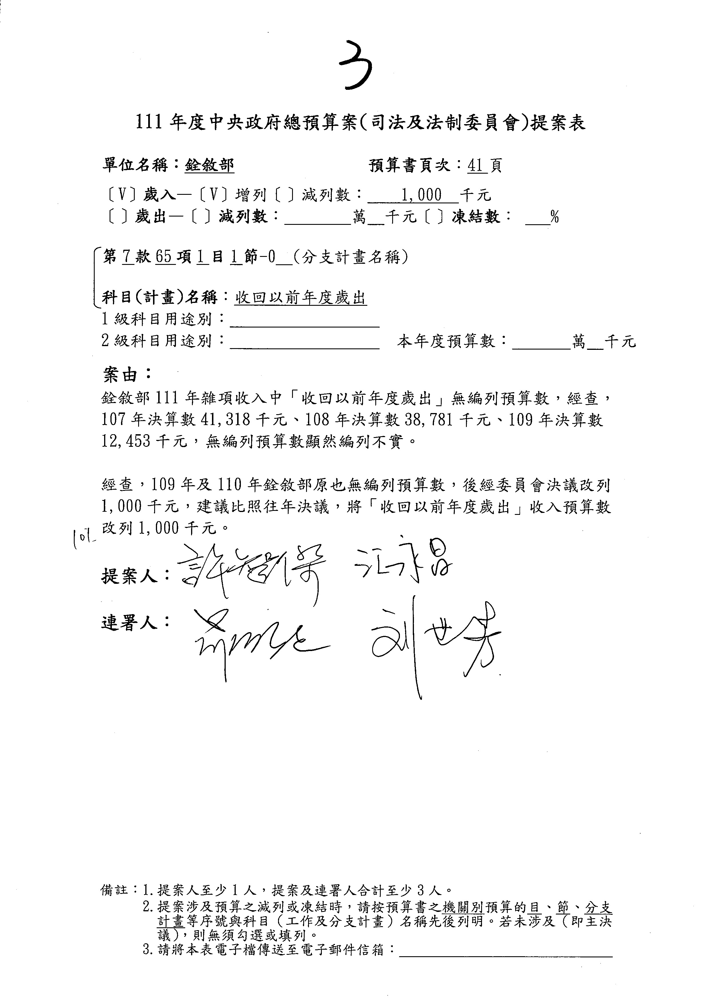 其次報告本會收支預算案,有關110年度預算執行情形,截至今年9月30日為止,歲入部分預算無編列數,累計實收新臺幣1,000元;歲出部分,歲出預算4,675萬7,000元,累計支出3,385萬1,000元。有關111年度預算編列情形,歲入部分無編列數,歲出部分編列4,691萬6,000元,較今年度的4,675萬7,000元增列15萬9,000元,其中一般行政4,271萬元,第一預備金則為10萬元。