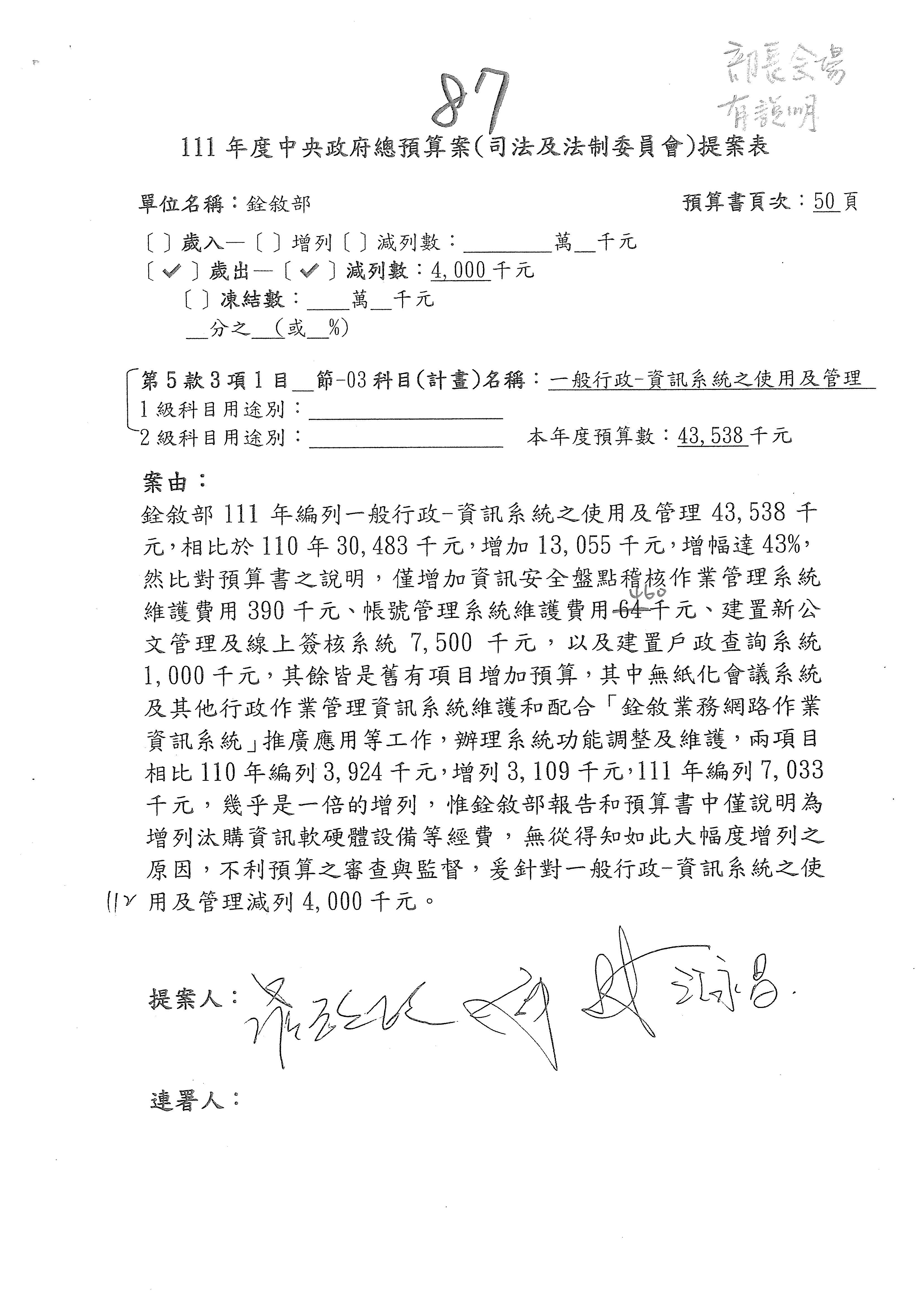 主席:我們會採取綜合詢答然後再逐案處理的方式進行。首先說明,我們開會通知單有載明,委員針對討論事項的預算提案均請於今日上午11時前提出,逾期不予受理,特別再次提醒大家。