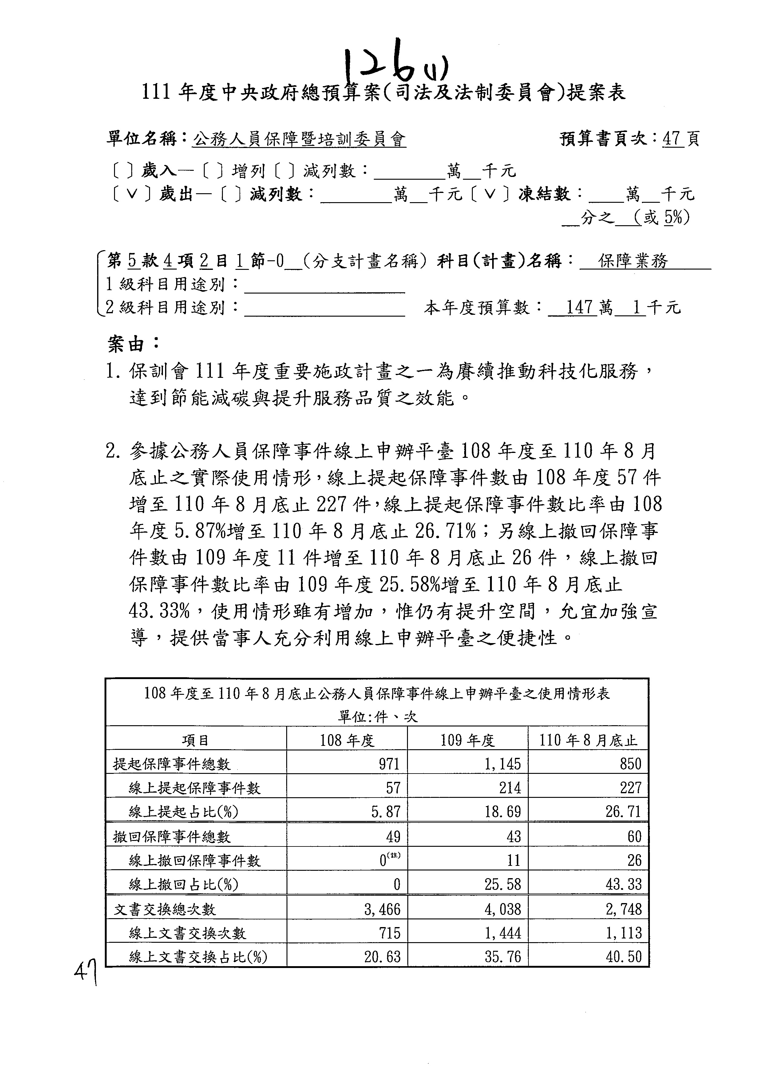 江委員永昌:我不同意保訓會主委的講法,你總案件才增加一點點,主要是線上提起的比率不會增加太多,110年8月底850件分之227,比率只有26%而已,你剛才說總件數會增加一些,現在問題是比率怎麼提升。