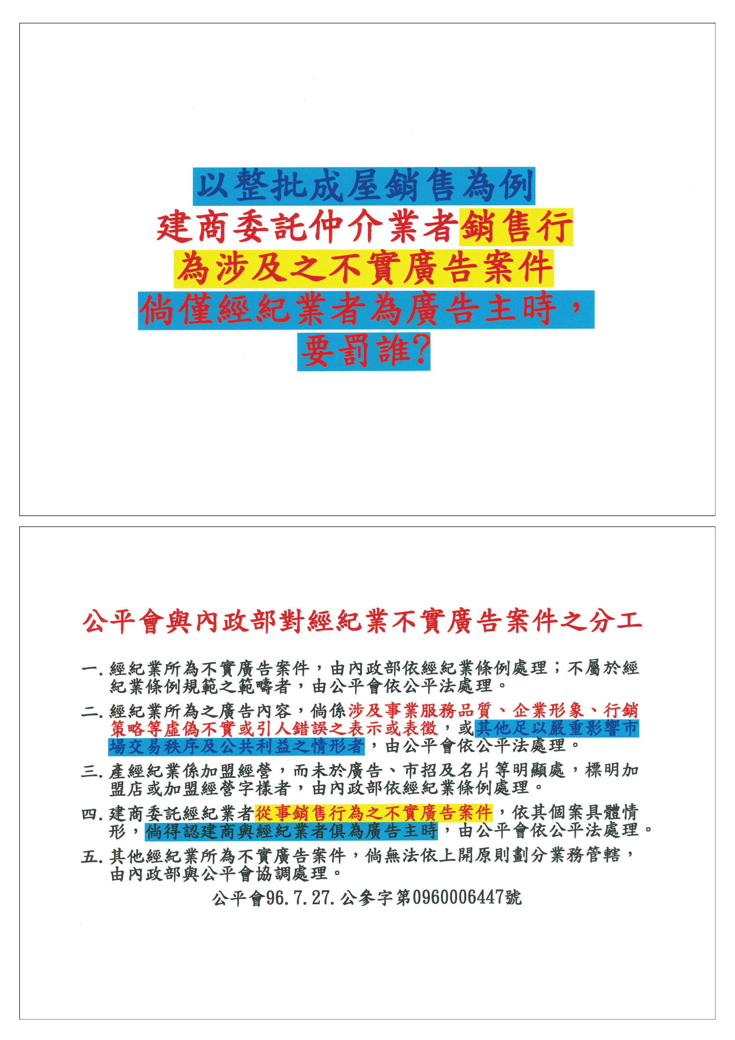 第二個部分,在我提的意見裡面,我要提的是代銷業、仲介業、不動產開發業之間不實廣告的部分,過去曾經因為有不動產經紀業管理條例的制定而產生所謂的分工,但是這樣的分工做法,包括第四點提到從事不實廣告的廣告主如果只有經紀業的時候,就回到以不動產經紀業管理條例去處罰,而不動產經紀業管理條例的處罰最高只有30萬元、從6萬元起跳;如果從公平法加以處罰,當然就從5萬元到2,500萬元。這部分的設計,如果是開發商委託經紀業,然後經紀業自己去做廣告,難道開發商不受益嗎?從法理上,代理人所為的行為及於本人發生效力,就這部分,經紀業做了廣告,公平會可能要去看開發商與經紀業之間有沒有意思的連結等等,依消保法去做一些規範。