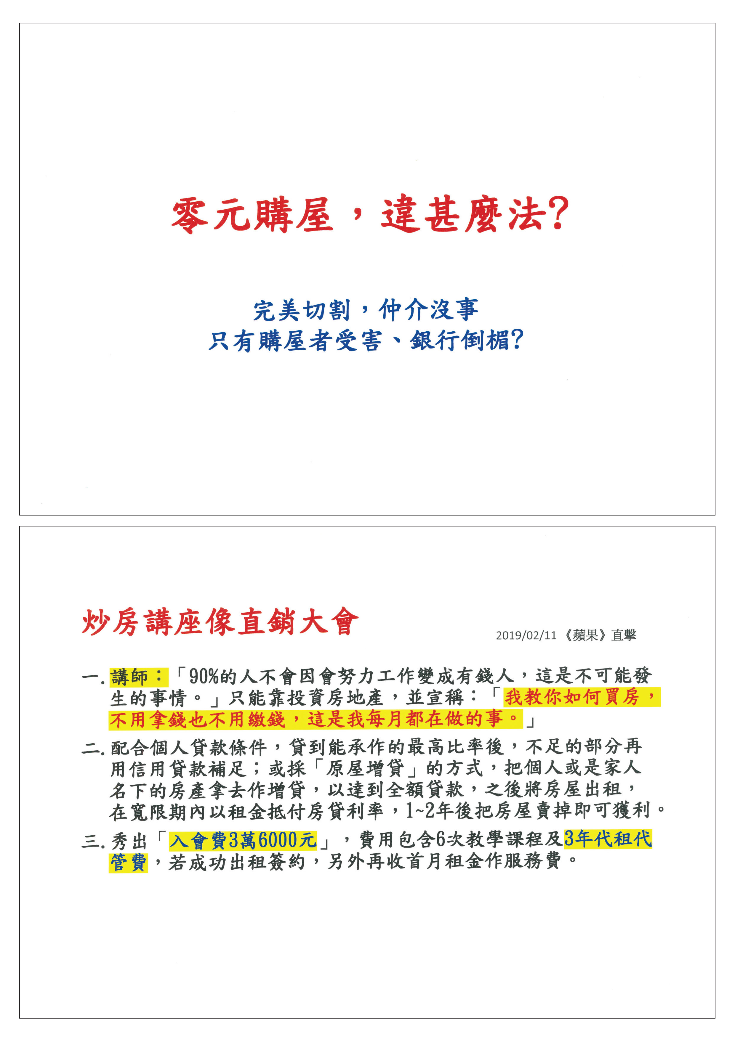 還有一個議題也是跟異業結合有關係。剛剛講紅單、代銷、仲介跟投資客等等結合,但是像零元購屋這件事情是誰跟誰在結合?這個會不會破壞整體交易秩序?我覺得從公平會的角度也應該要進一步理解。因為它每一個階段都合法,就是委託仲介合法、委託地政士合法,最終貸款也合法,但是它是用假契約,規定應該要把這三個串接起來,我覺得都是不合法的,所以這個部分影響到交易秩序。也就是我們從這幾個例子來看,現在的交易的型態、異業的聯合、結合等等,從公平會來講,我覺得這些現狀以後還會不斷再翻新,期許新的委員能夠針對這些議題,對所謂交易秩序維持公平以及消費者的保護再更加精進。