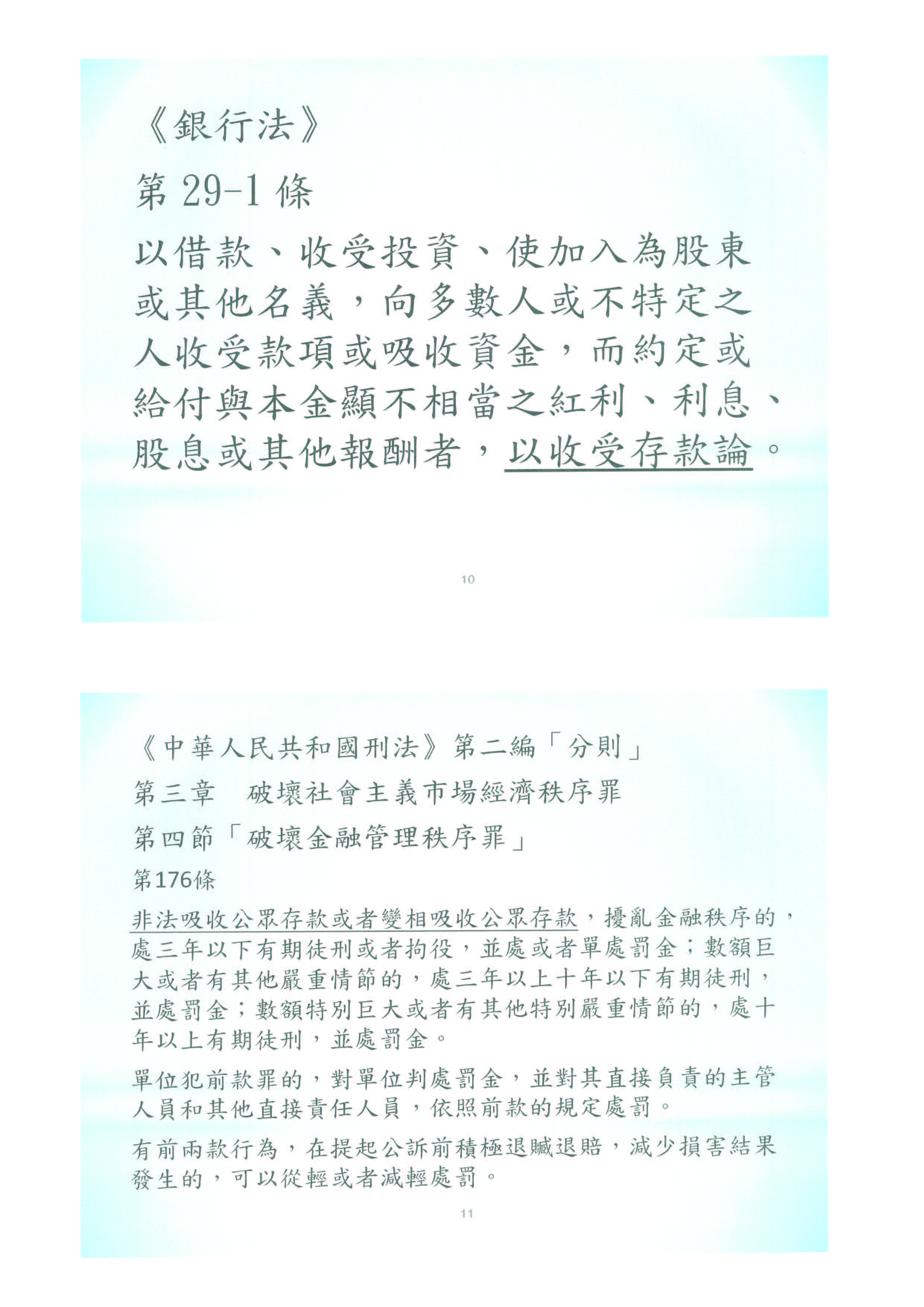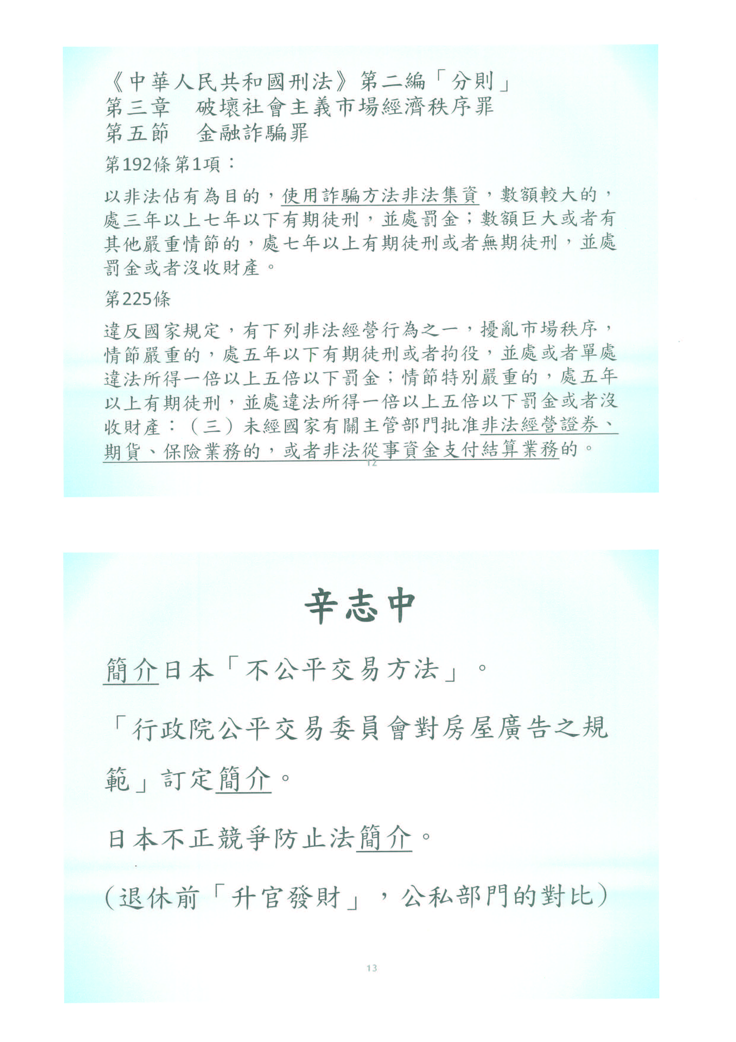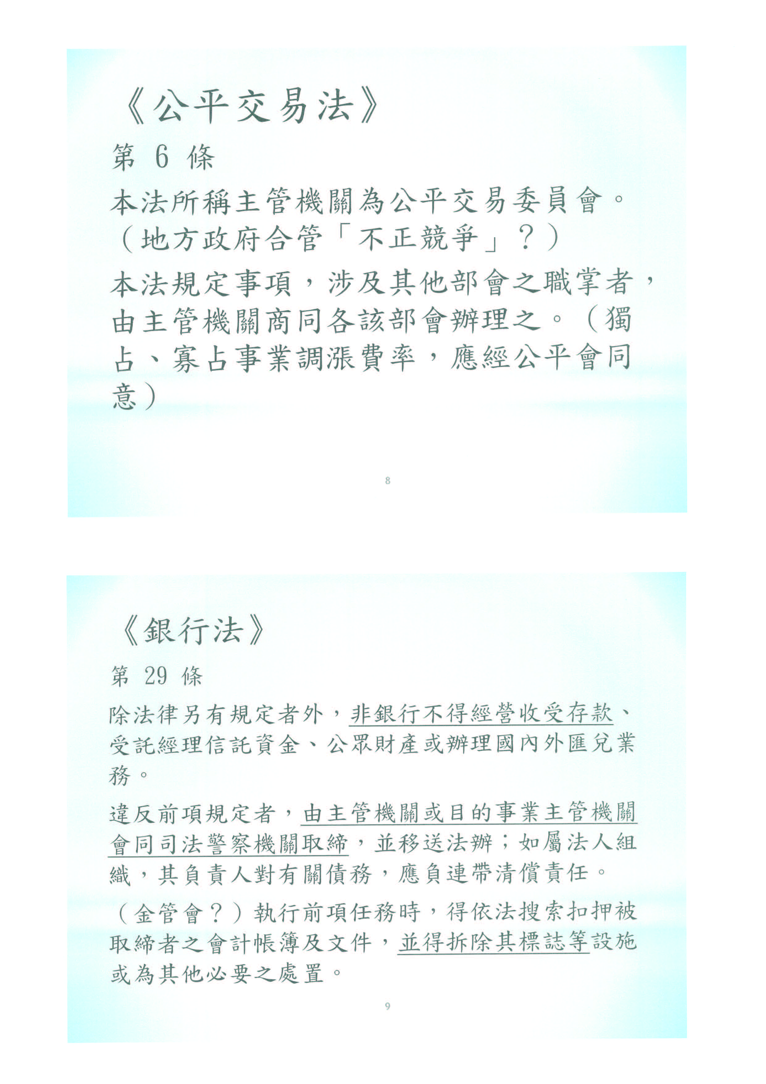 關於公平交易法,我會建議本來公平交易委員會是中央機關,有關公平交易法「不正競爭」的方面,可不可以由地方政府也來監管及主管?這對剛剛林教授所關心的消費者保護有正面的功能。再來就是委員所關心的費率問題,因為管制的機關時常被被管制的產業綁架,所以費率是不是應該要經過公平交易法的同意?再來,我也提到我國的老鼠會用銀行法來加以管理,基本上是一種錯誤的立法,應該規定在基礎的刑法裡面才對,不管是投資的詐欺還是收受存款都要學習我們看不起的那個地區,寫在刑法裡面比較對。