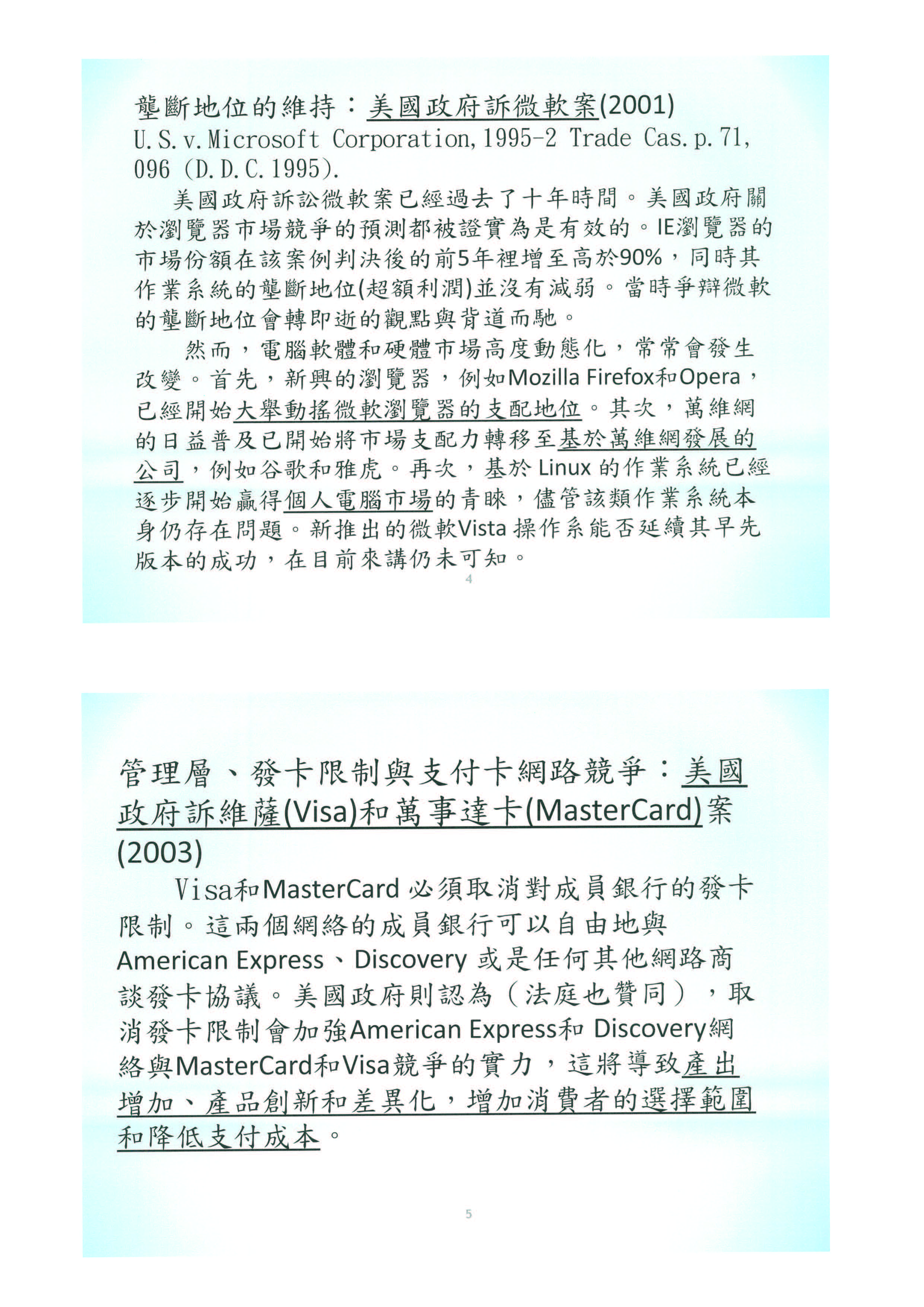 黃國鐘律師:主席、我們很尊敬的賴召集委員、各位學者專家、各位兄弟姐妹,各位鄉親父老。今天很榮幸能夠奉派和受邀來公平交易委員會的委員提名公聽會。如果是「公交委」,就是管一千二百八十塊錢的;如果是「公正委」,那是在法院;「公取委」是在日本的公正取引委員會。20世紀有一個最天大的案子就是拆解美國電話電報公司變成地方區域電話公司、長途電話公司以及電話器材公司,那時候AT&T是資本主義世界最鉅大的公司,時間很快地跳20年,到美國政府告微軟公司,在判決前的五年,微軟壟斷地位的市占率仍然高達90%,可是隨著電腦科技軟體和硬體的動態化開始動搖微軟的獨占地位。在這20年的判決之中,還有萬事達卡跟Visa卡片對發卡銀行的限制,它希望說不要跟American Express或者Discovery打交道,這些都被法院認為是違法的。