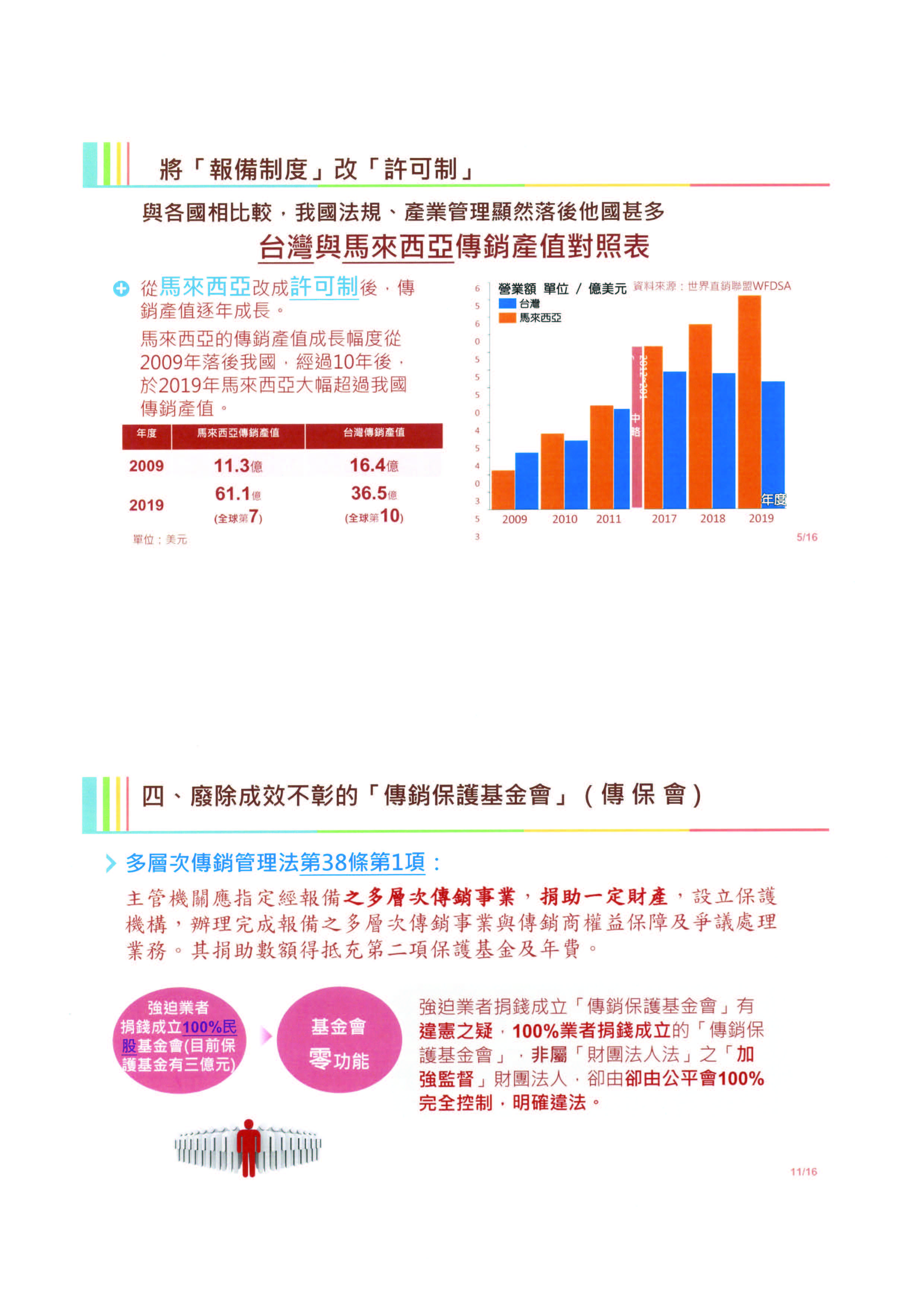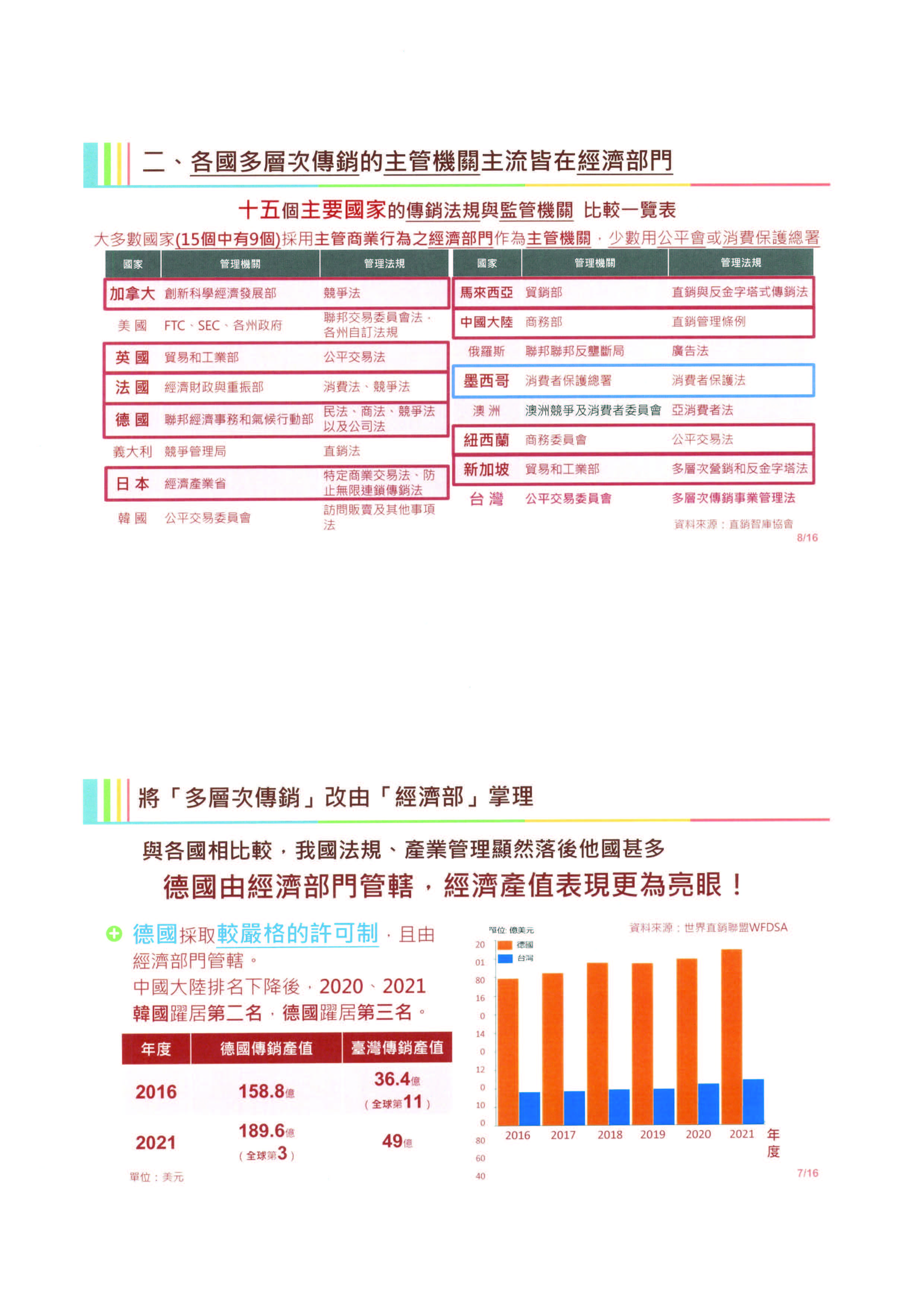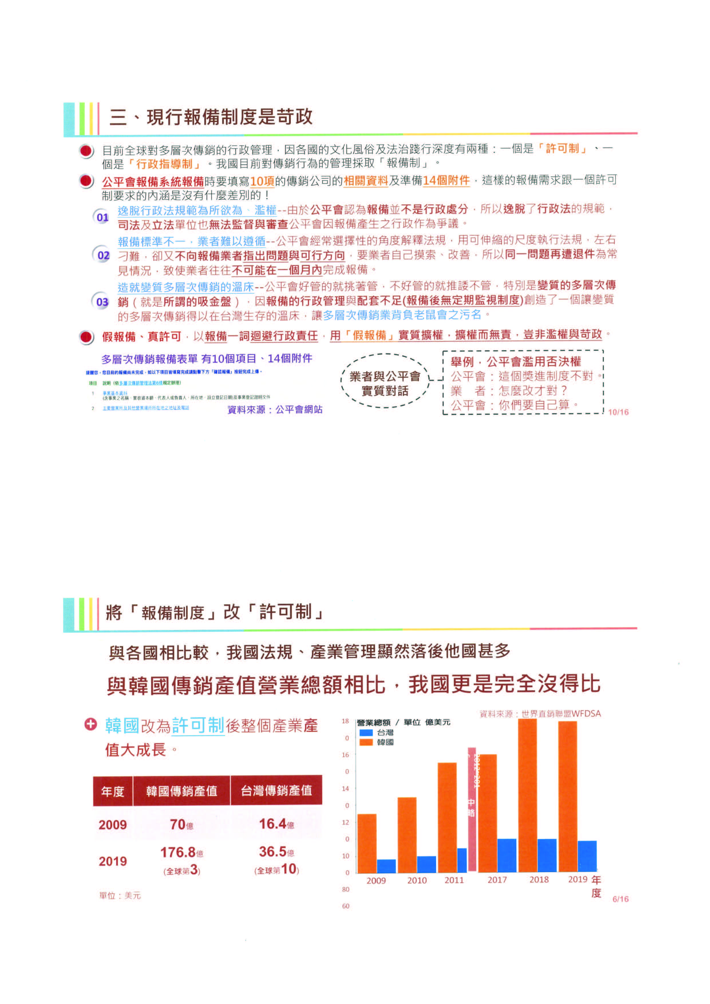 最後,有關公平交易委員會在多層次傳銷管理法的挑戰,臺灣在去年總共有347家多層次傳銷事業,有360萬位的傳銷商,也就是臺灣幾乎每8人就有1人在做傳銷,可見得它是一個相當龐大的產業,總金額上億元,但很不幸地,公平會時常以「報備不等於合法」造成傳銷業污名化,要如何將傳銷繼續發展,讓已經在臺灣發展40年的傳銷業未來能繼續走下去是很重要的;臺灣平均每個月有1.5件的老鼠會事件出現,到底現行法有哪裡規範不足。從他國的成功方程式可以發現,監管機關、法規、工會及業者自治都要互相配合,有15個主要國家都由經濟部門作為主管機關,因為經濟部門才能夠興利,公平會目前只能做到除弊而已,未來要怎麼做好?我們建議將報備改成許可,因為韓國改成許可之後,從2009年的產值只有70億元,到2019年就達到176億元,相較於臺灣,只從16億元進步到36億元,雖然兩國的人口數不同,但對照人口數的發展,我們的表現有需要繼續加強的地方;馬來西亞改成許可制之後就變得相當好。最後看到傳保會的功能不彰,也就是沒有盡到保護的功能,在多層次傳銷的部分,我們希望未來3位委員針對多層次傳銷的議題,可不可以認真考慮將多層次傳銷主管機關交由經濟部,也廢除功效不彰的傳保會,強化功能讓業者自治?最後不管是到經濟部或是公平會繼續掌管,我們建議將多層次傳銷現行的報備制改為許可制。