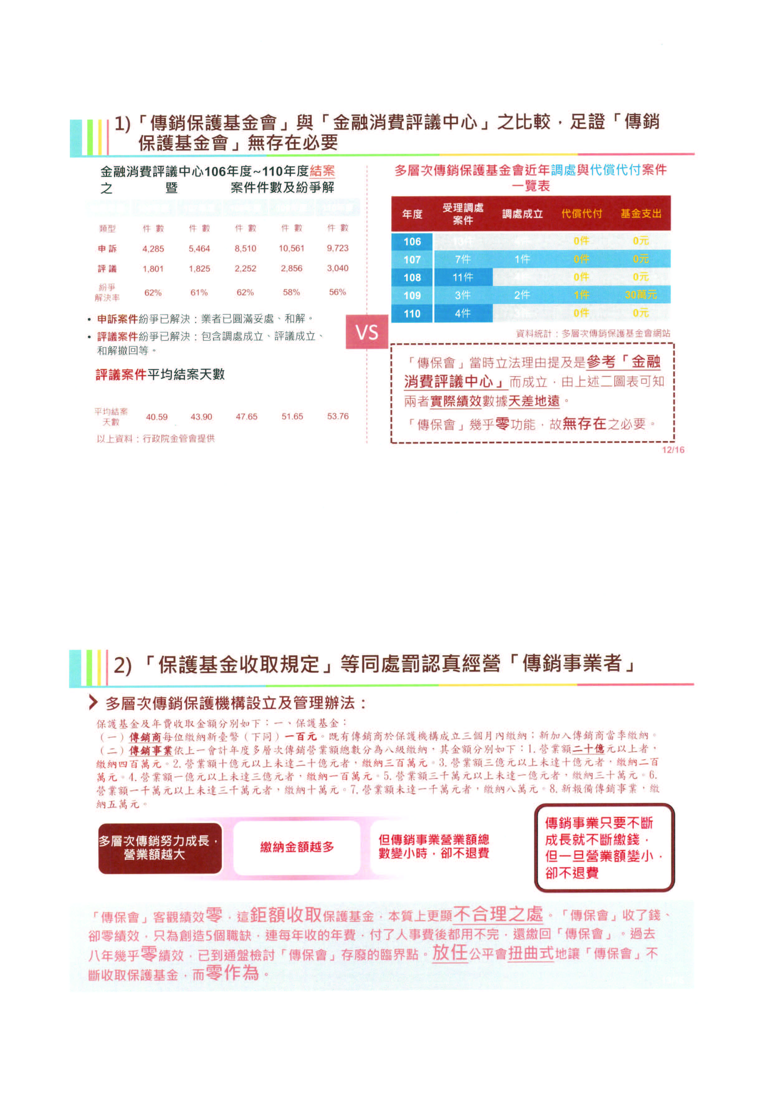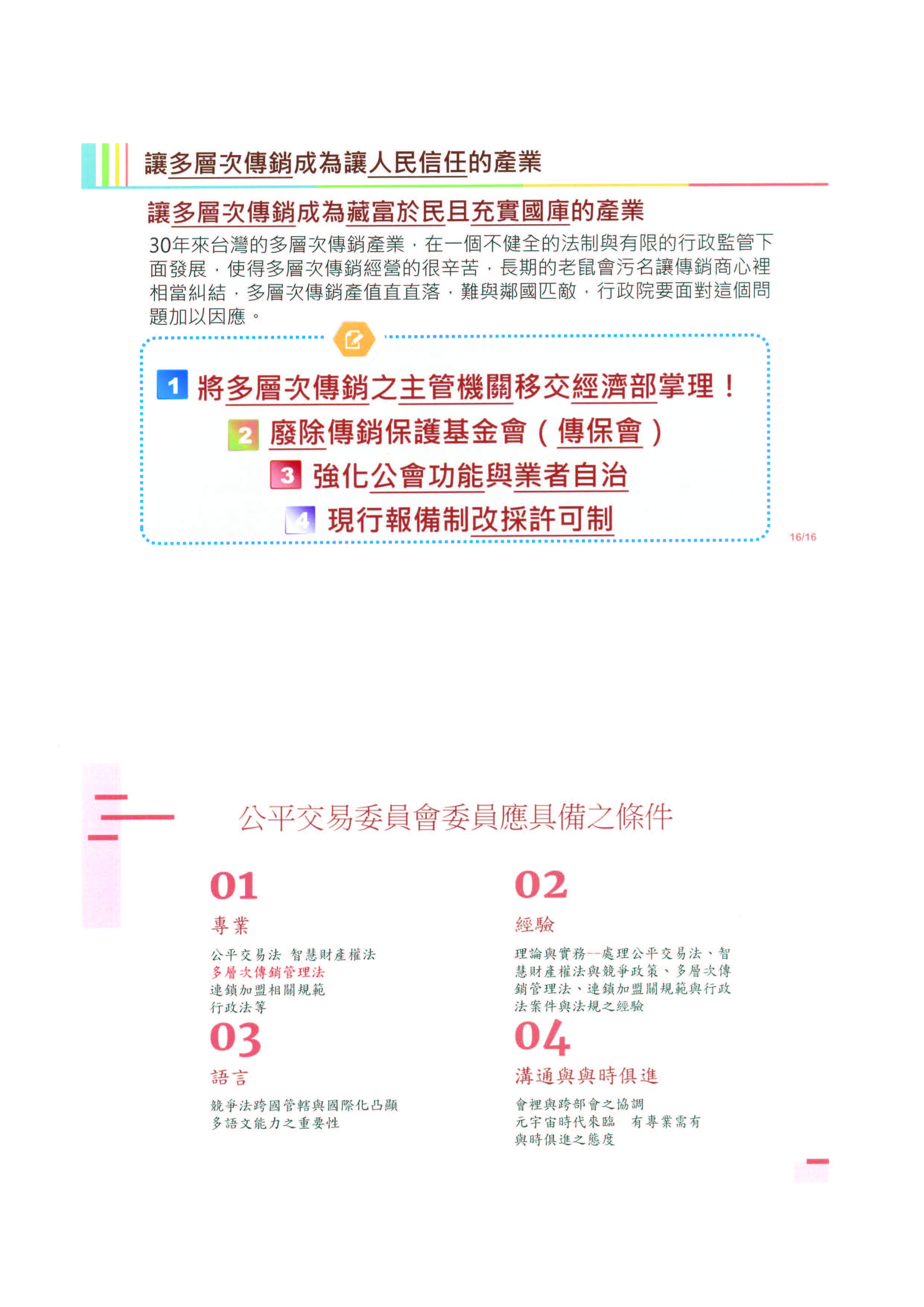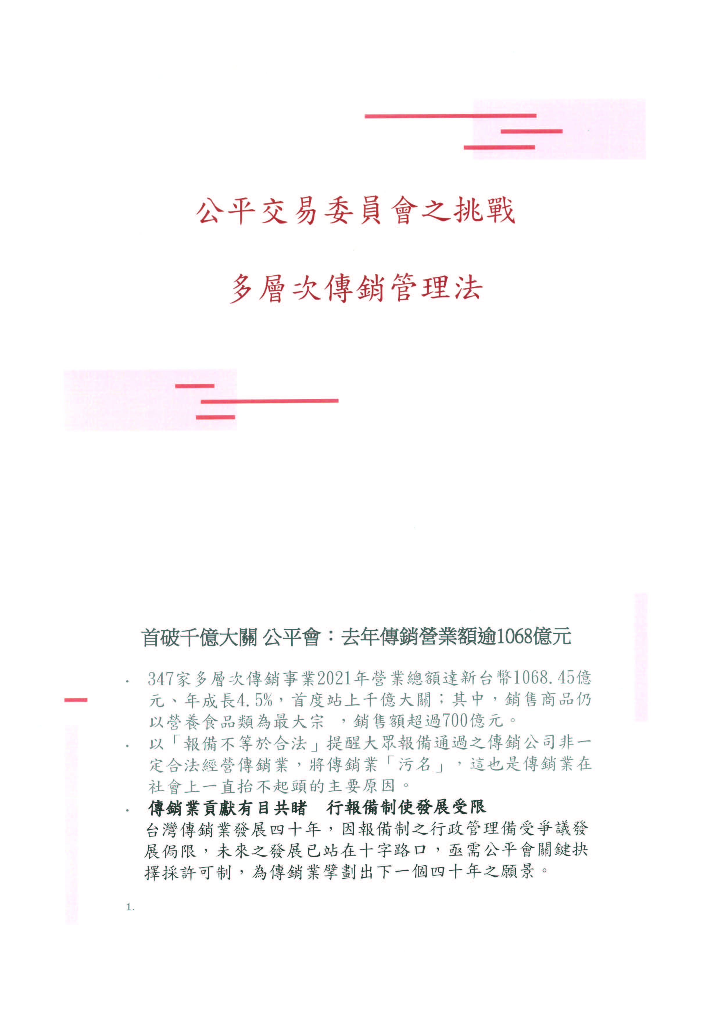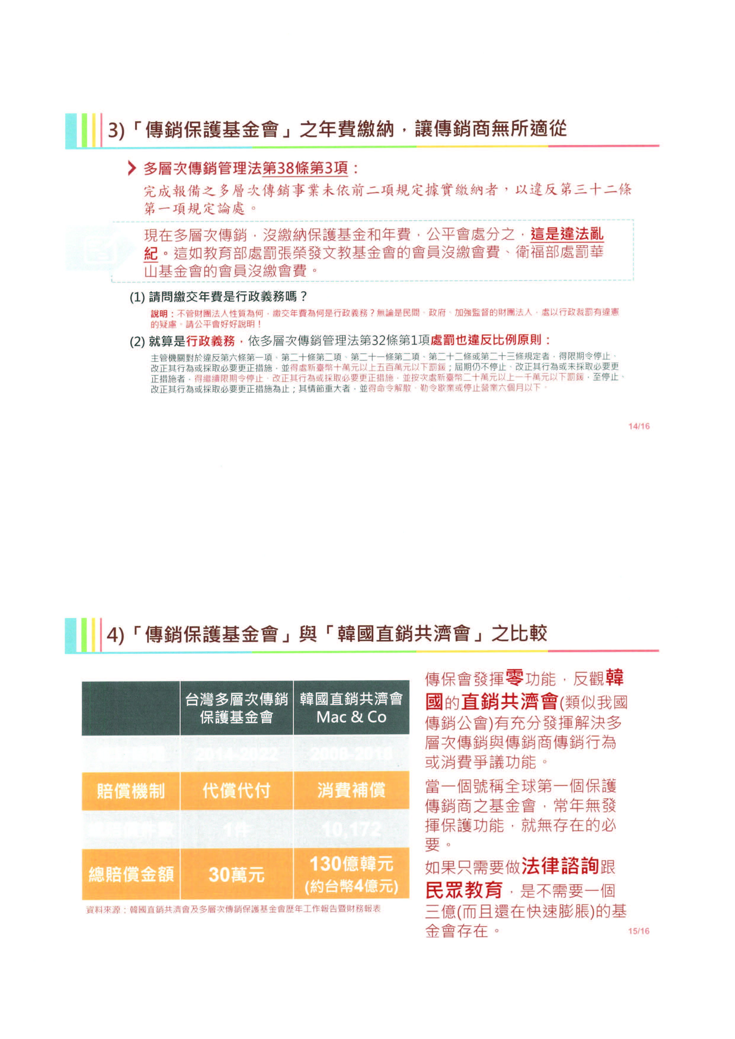 最後,有關公平交易委員會在多層次傳銷管理法的挑戰,臺灣在去年總共有347家多層次傳銷事業,有360萬位的傳銷商,也就是臺灣幾乎每8人就有1人在做傳銷,可見得它是一個相當龐大的產業,總金額上億元,但很不幸地,公平會時常以「報備不等於合法」造成傳銷業污名化,要如何將傳銷繼續發展,讓已經在臺灣發展40年的傳銷業未來能繼續走下去是很重要的;臺灣平均每個月有1.5件的老鼠會事件出現,到底現行法有哪裡規範不足。從他國的成功方程式可以發現,監管機關、法規、工會及業者自治都要互相配合,有15個主要國家都由經濟部門作為主管機關,因為經濟部門才能夠興利,公平會目前只能做到除弊而已,未來要怎麼做好?我們建議將報備改成許可,因為韓國改成許可之後,從2009年的產值只有70億元,到2019年就達到176億元,相較於臺灣,只從16億元進步到36億元,雖然兩國的人口數不同,但對照人口數的發展,我們的表現有需要繼續加強的地方;馬來西亞改成許可制之後就變得相當好。最後看到傳保會的功能不彰,也就是沒有盡到保護的功能,在多層次傳銷的部分,我們希望未來3位委員針對多層次傳銷的議題,可不可以認真考慮將多層次傳銷主管機關交由經濟部,也廢除功效不彰的傳保會,強化功能讓業者自治?最後不管是到經濟部或是公平會繼續掌管,我們建議將多層次傳銷現行的報備制改為許可制。