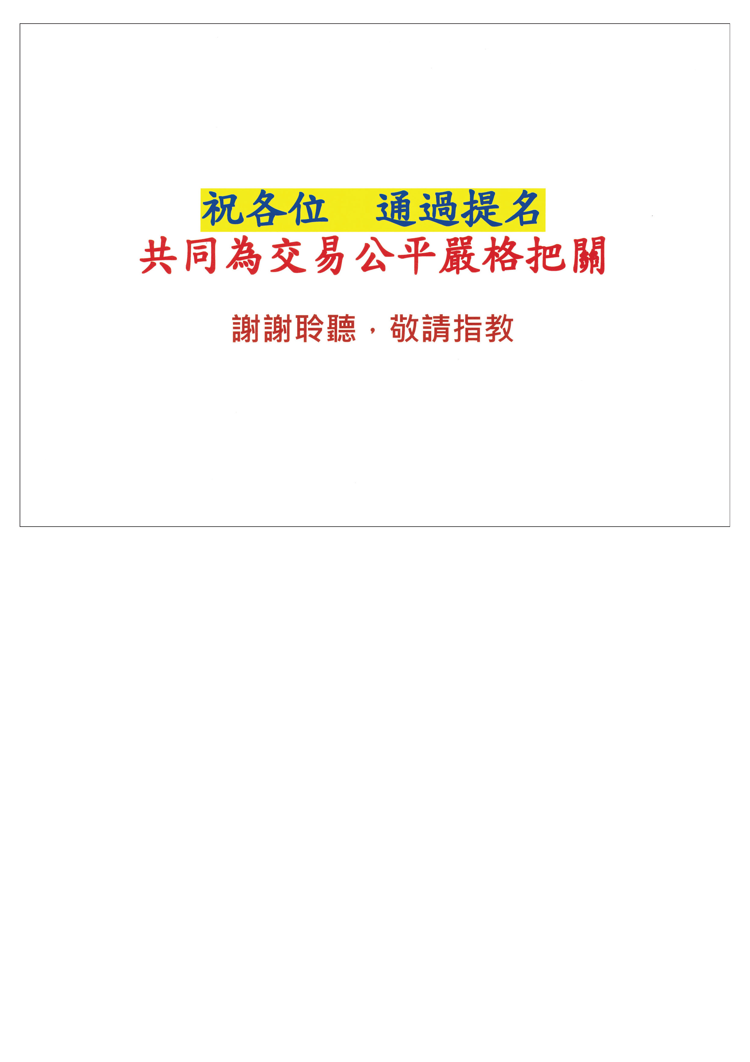 最後,我想要對3位被提名人分別提出一些我的看法。辛先生特別提到藉由召開座談會、公平會及公協會的訪問時間,來促成政府與民間之間的交流,對於這一點,我非常樂觀其成,也很感謝辛先生的提議。當然,未來的處分到底要如何具體化、明確化,也要請辛先生繼續為我們服務,為大家提供幫助。