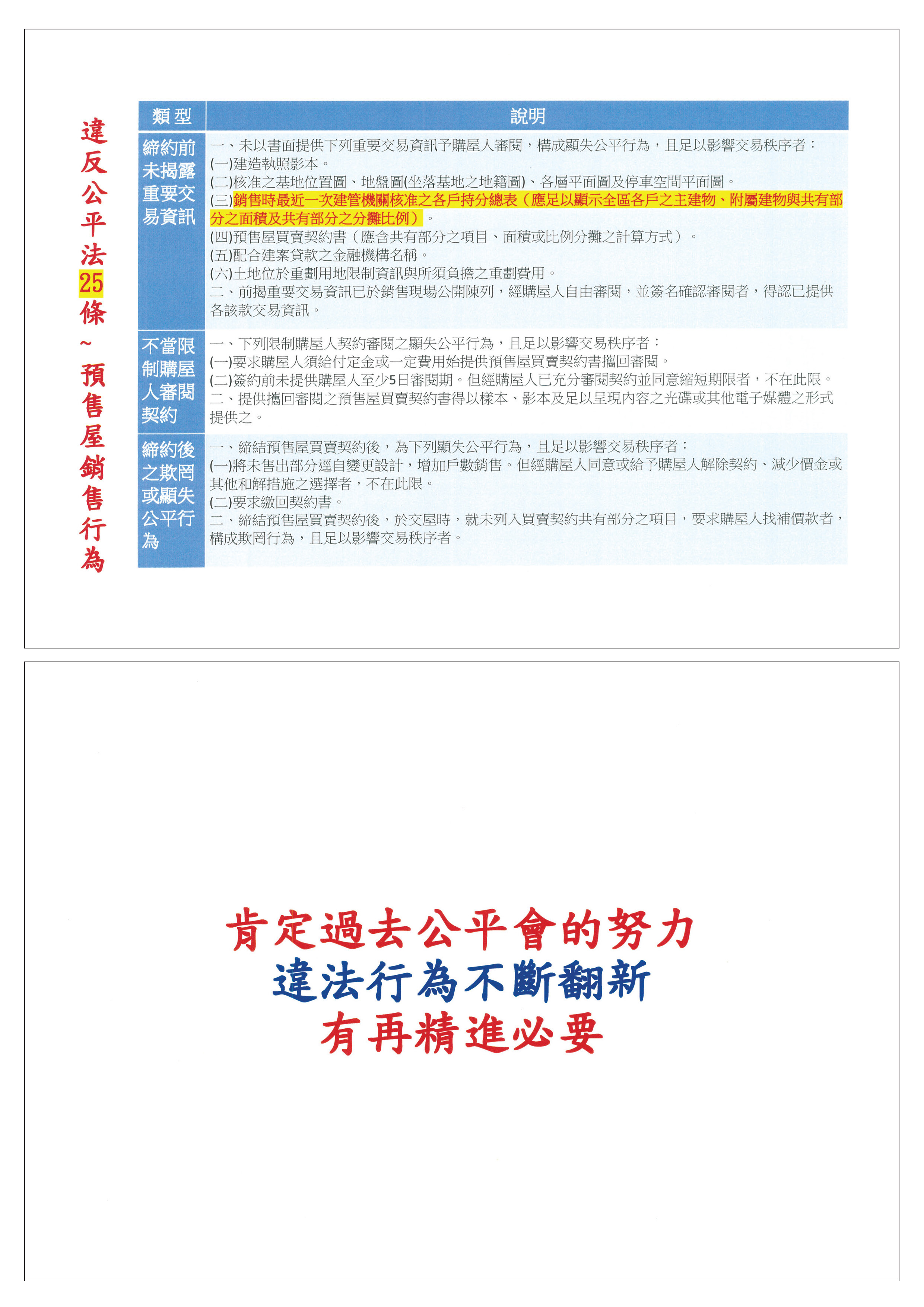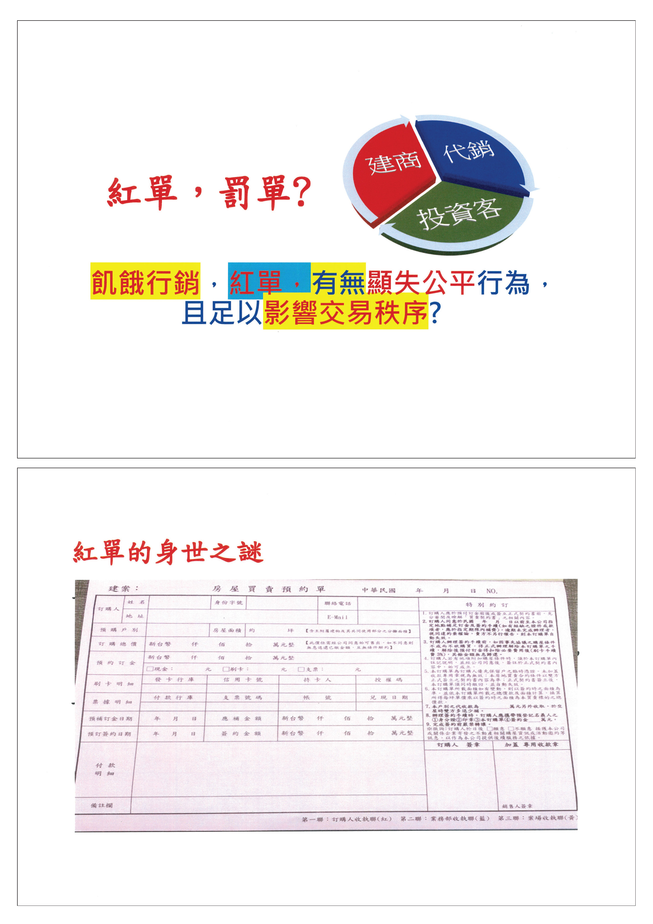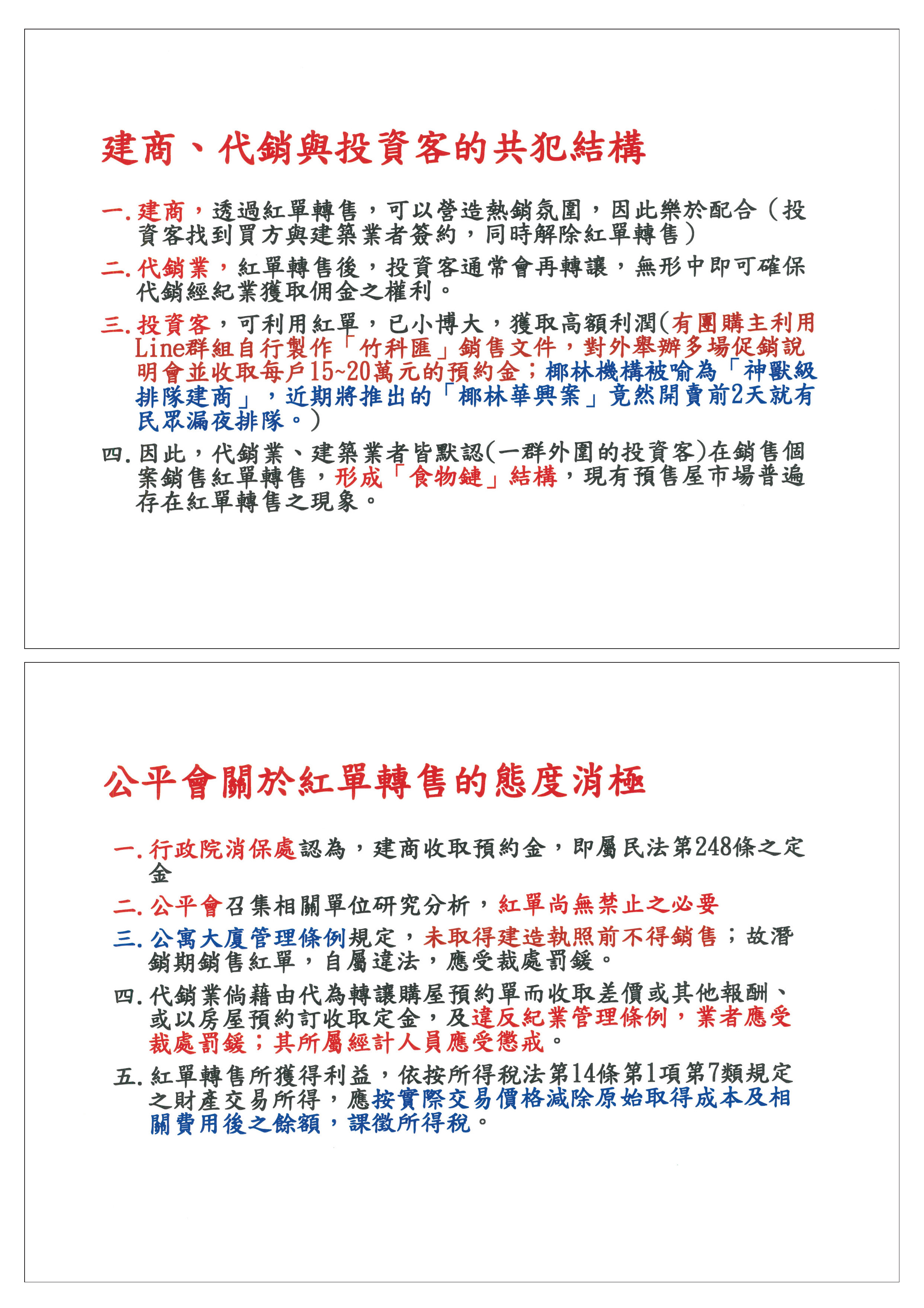 再來,我們現在一直在談居住正義,公平會在這一塊的角色扮演上,當然好像也有陪伴去做一些聯查等等,其實都很努力、很辛苦。我今天提的第二個議題就是紅單的部分,其實代銷、仲介、投資客、建商基本上就是一個所謂的共犯結構、異業連結。雖然現在實價登錄有對紅單的部分做一些規範,但是我們要問,這些所謂的飢餓行銷、紅單的轉售有沒有破壞交易秩序?有沒有去影響所謂顯失公平的行為?我覺得公平會應該做一些這方面的精進、再努力。
