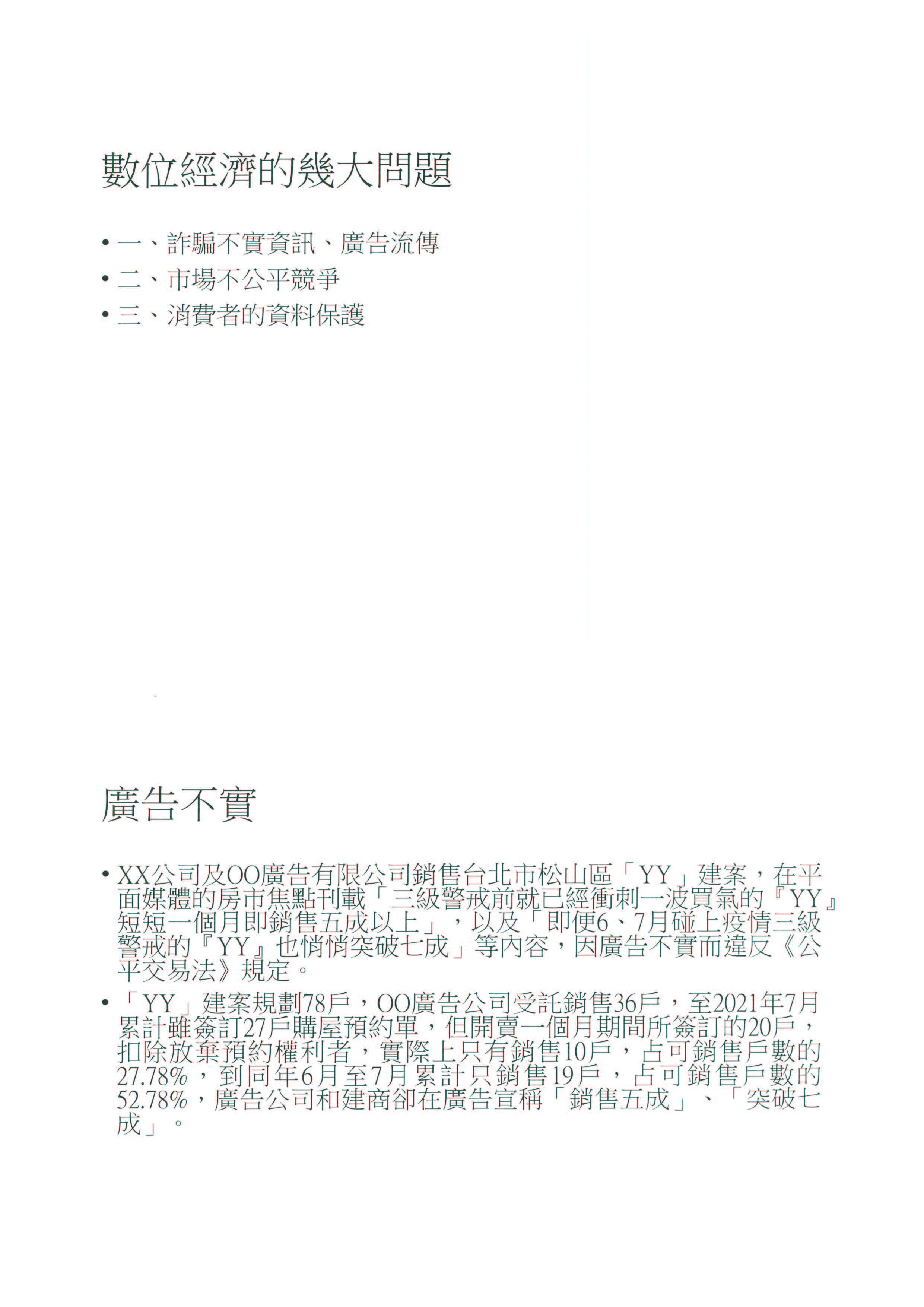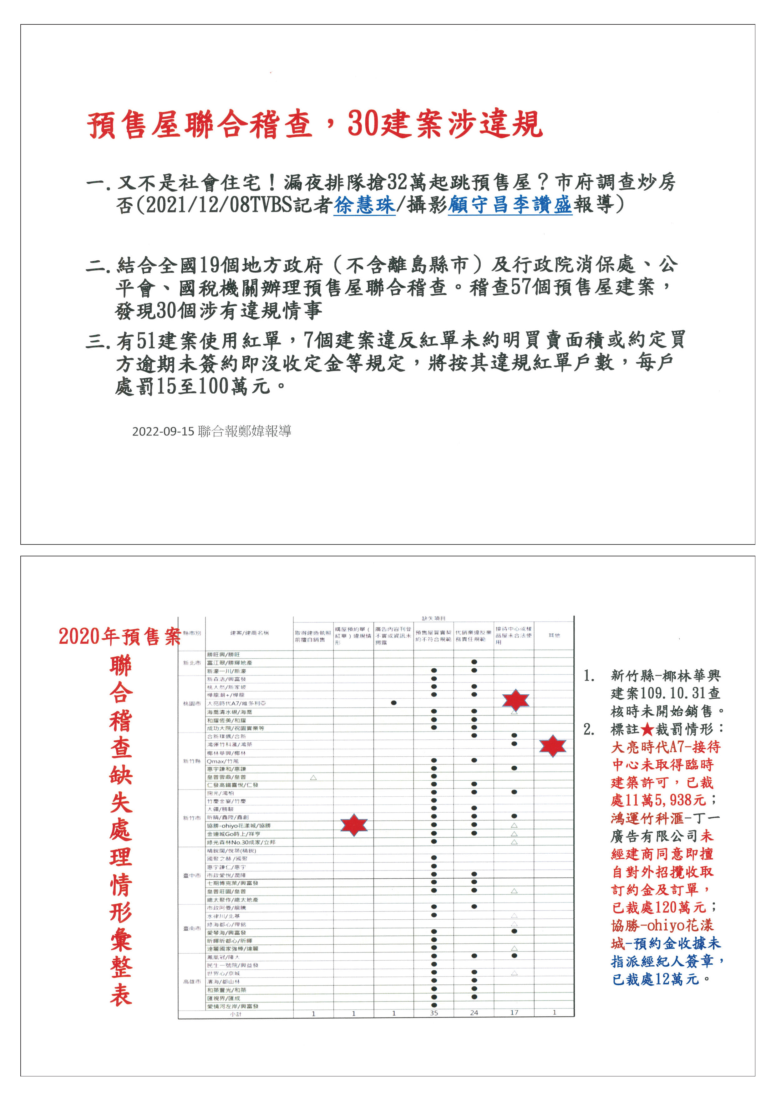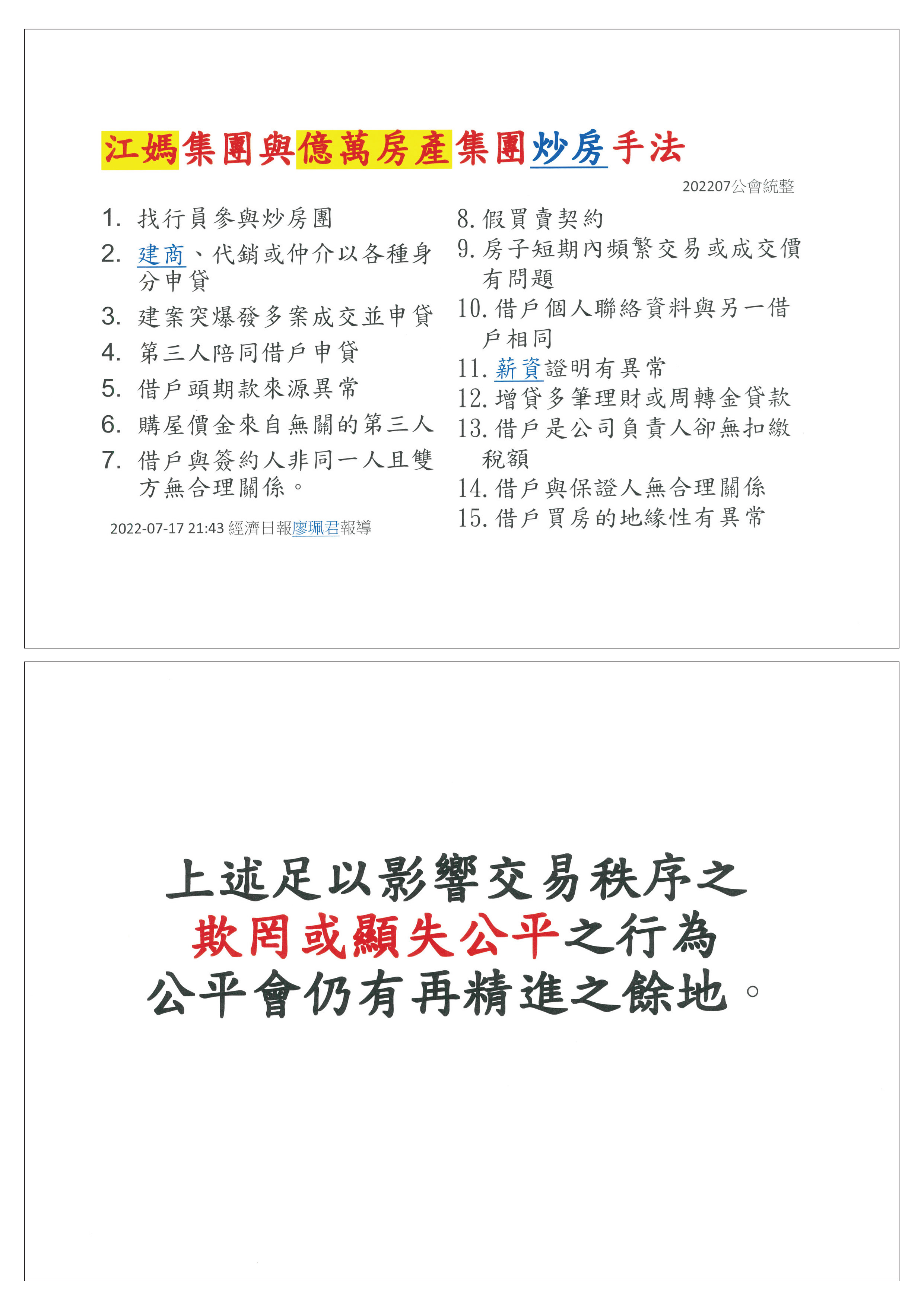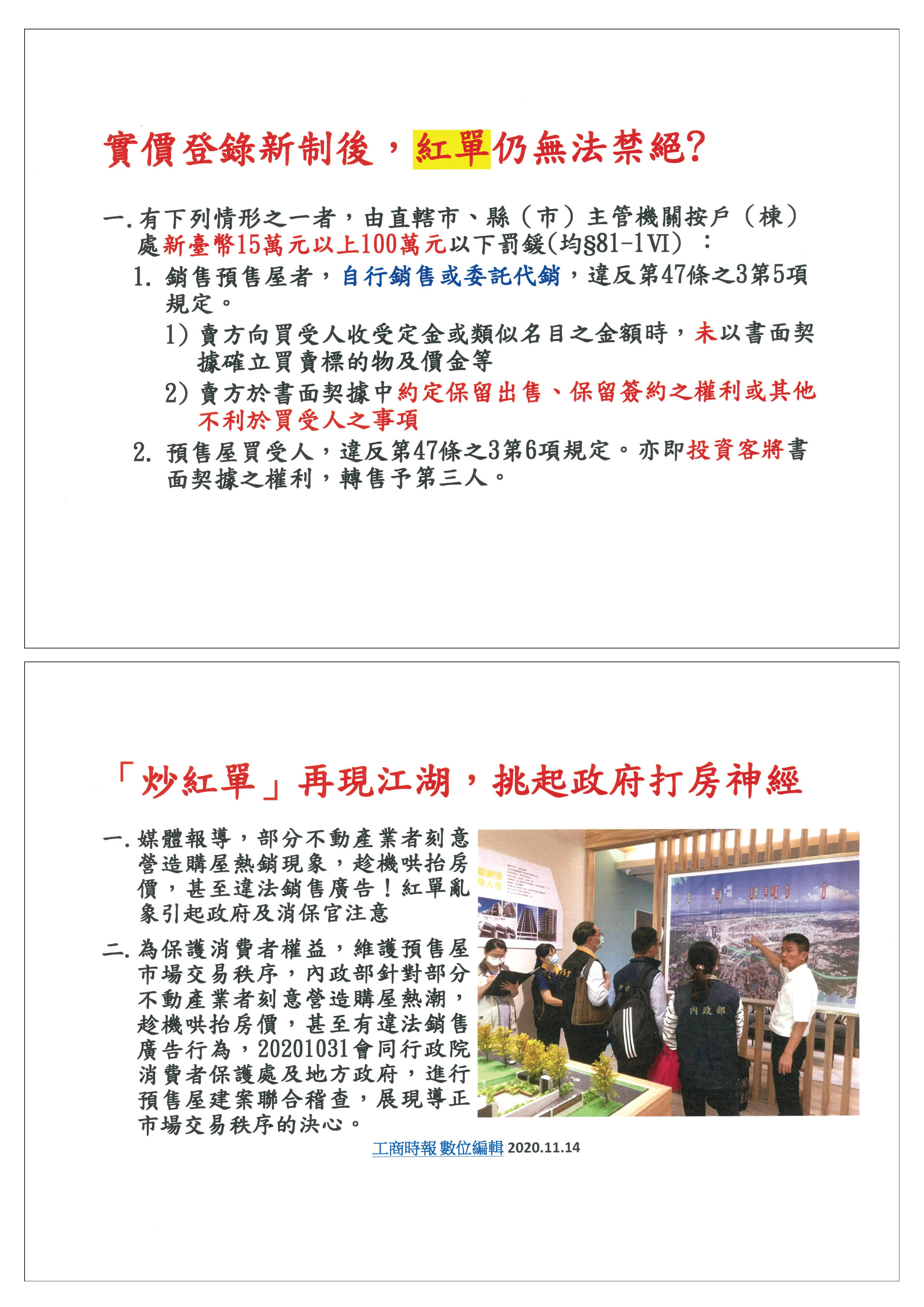 再來,我們現在一直在談居住正義,公平會在這一塊的角色扮演上,當然好像也有陪伴去做一些聯查等等,其實都很努力、很辛苦。我今天提的第二個議題就是紅單的部分,其實代銷、仲介、投資客、建商基本上就是一個所謂的共犯結構、異業連結。雖然現在實價登錄有對紅單的部分做一些規範,但是我們要問,這些所謂的飢餓行銷、紅單的轉售有沒有破壞交易秩序?有沒有去影響所謂顯失公平的行為?我覺得公平會應該做一些這方面的精進、再努力。